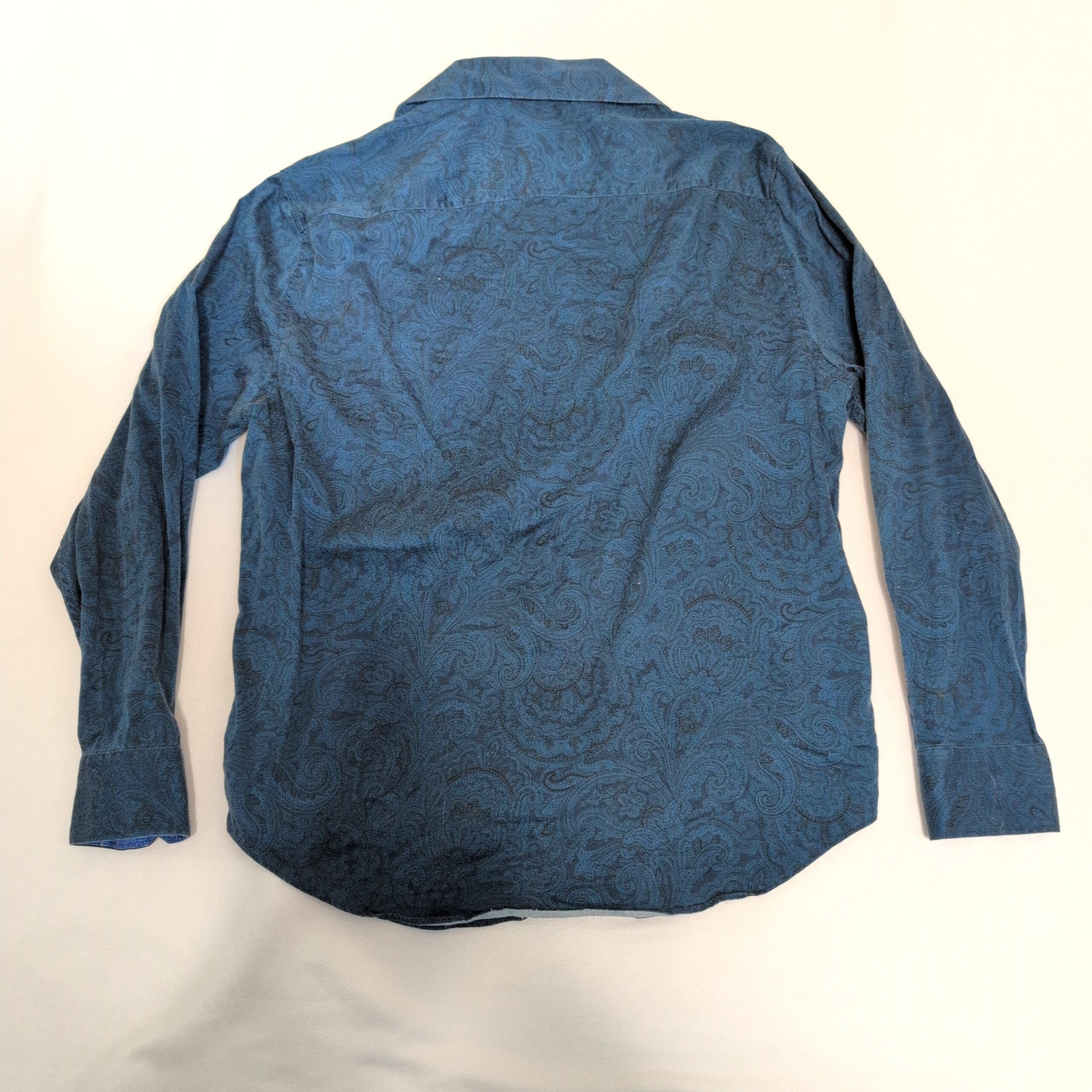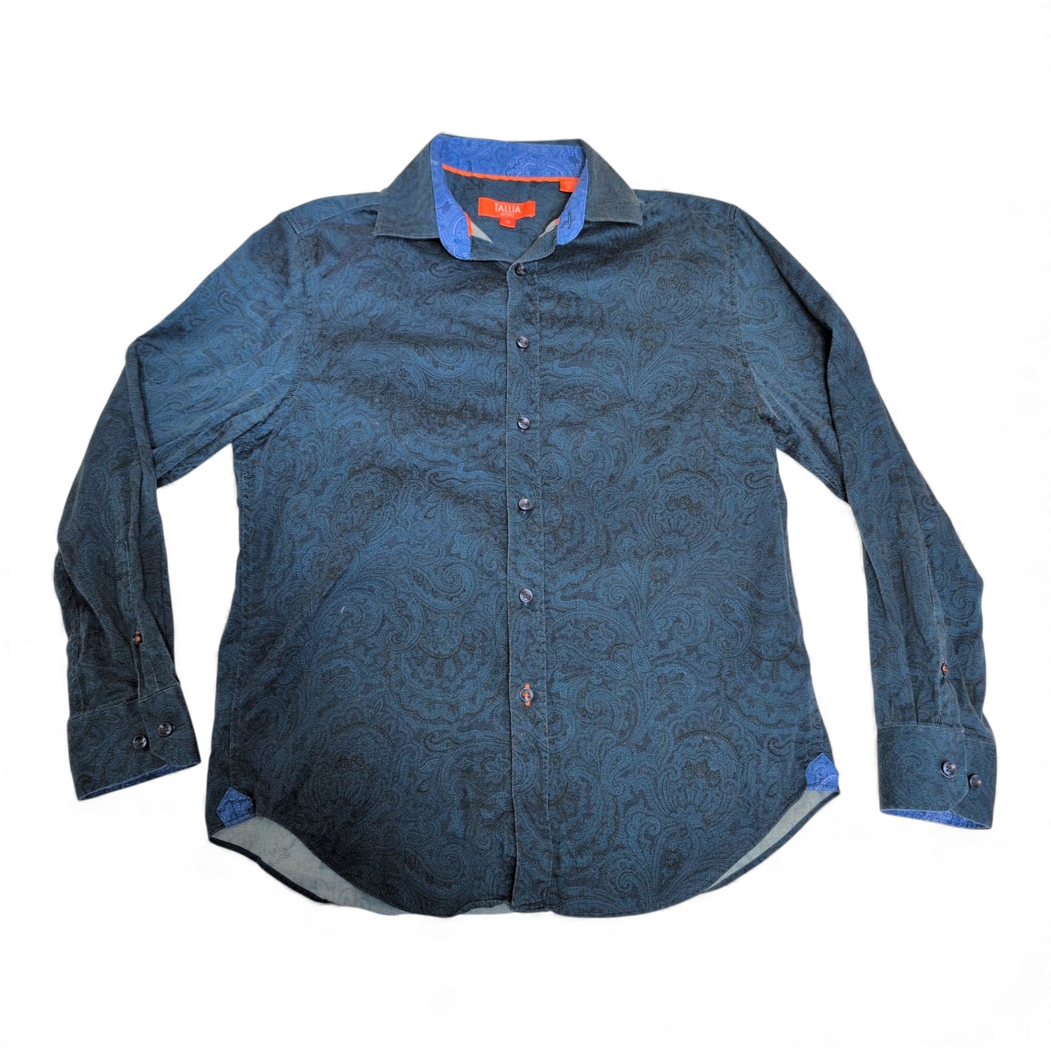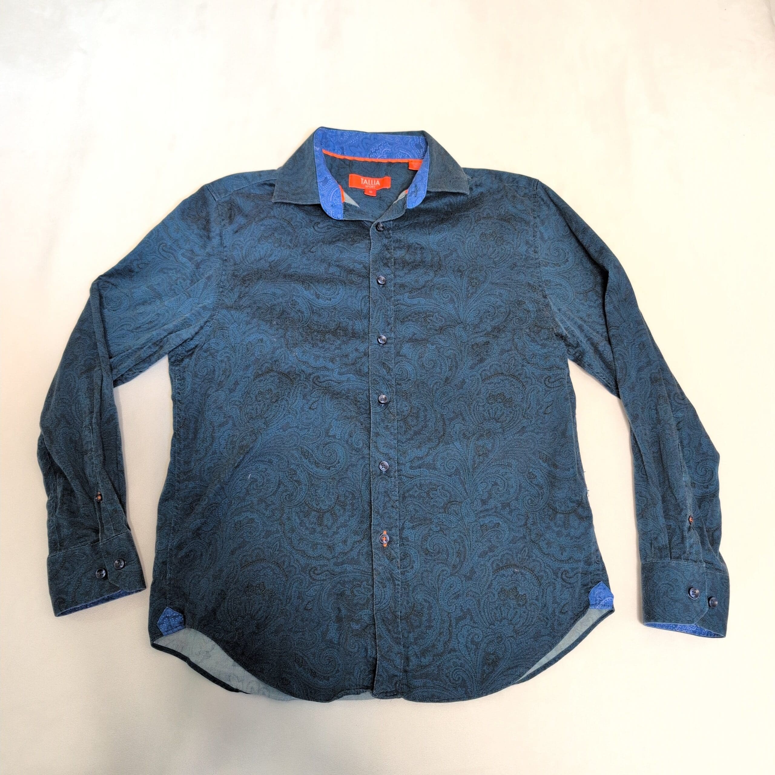 Tallia Sport men’s long-sleeve button-down in blue with an all-over tonal paisley pattern. Size M (standard). Features a spread collar with contrasting inner collar detail, full button front, button cuffs, and a curved hem — versatile for smart-casual or office wear. Gently used with light signs of wear; no noticeable stains, holes, or major flaws observed. See photos for details.