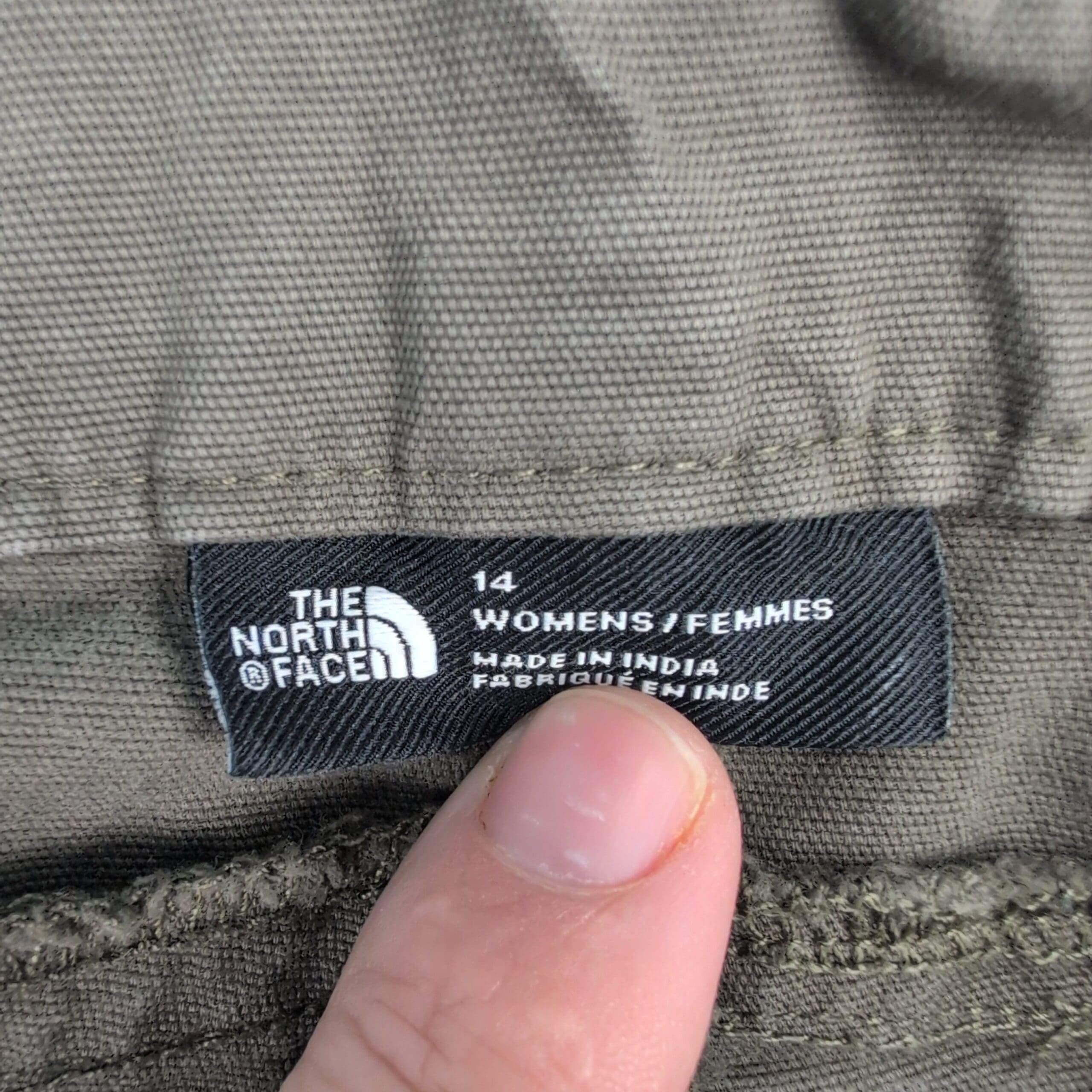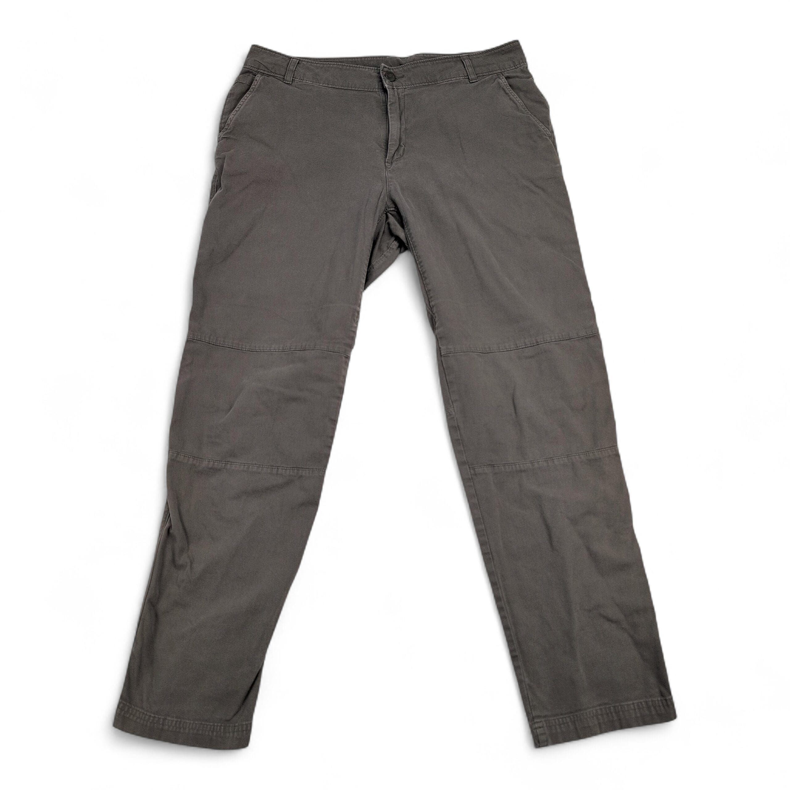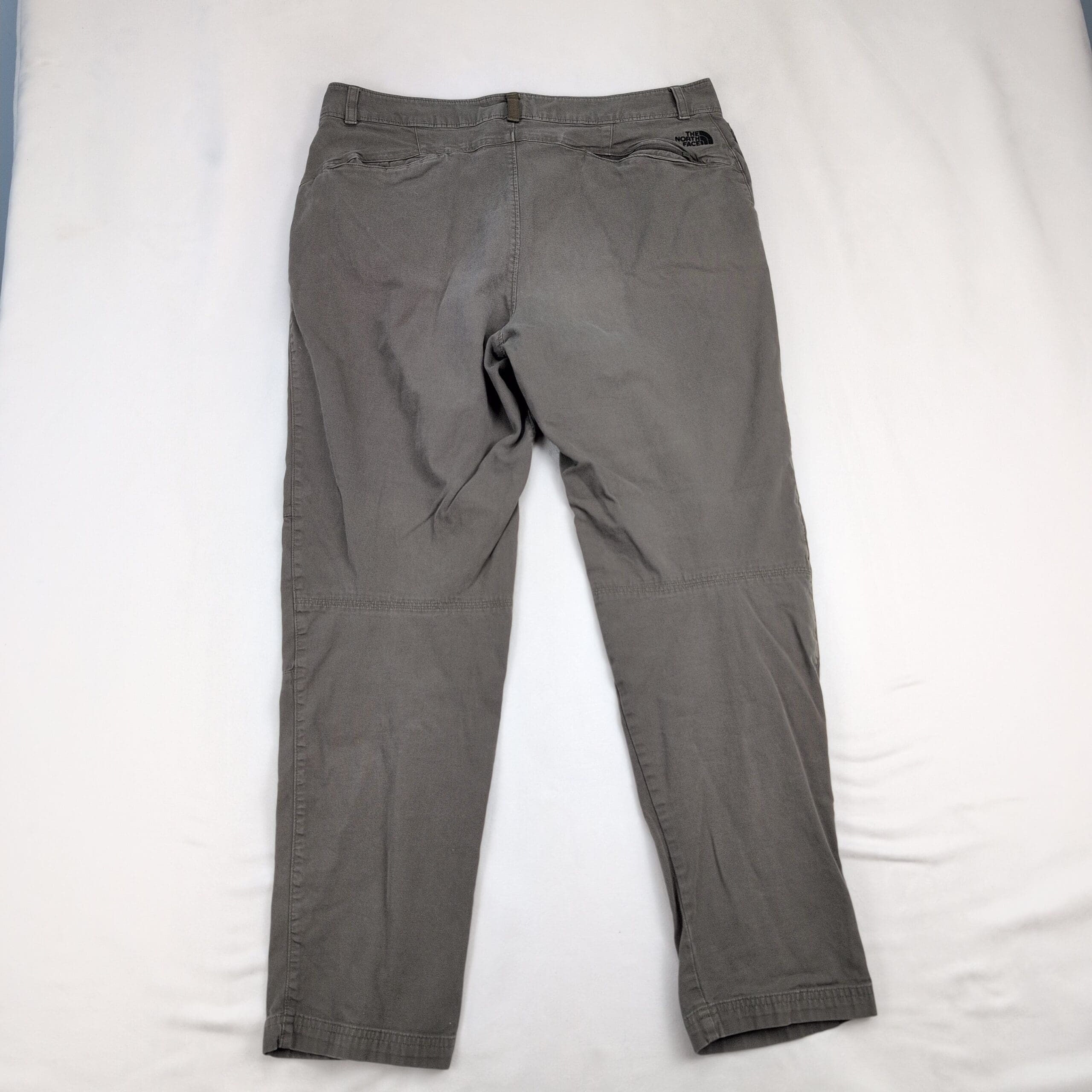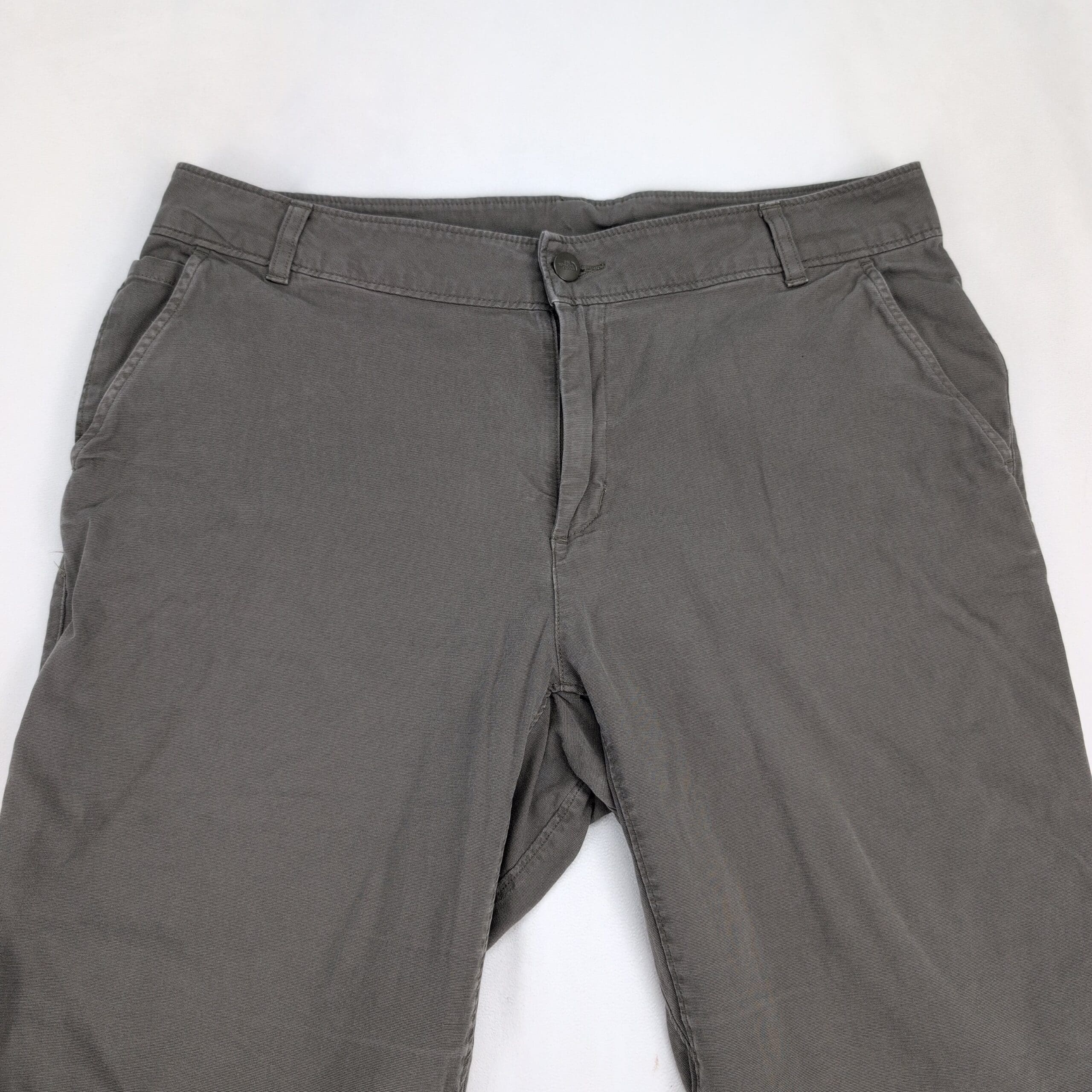 The North Face women’s trousers — Size 14 (Plus). Classic gray straight-leg hiking pants with articulated knee panels, belt loops, button & zip fly, and front hand pockets. Durable woven construction offers comfortable movement for outdoor activities or everyday wear. Excellent used condition with slight fading consistent with normal wear; no major rips, tears, stains, or other flaws visible. See photos for color and condition details.