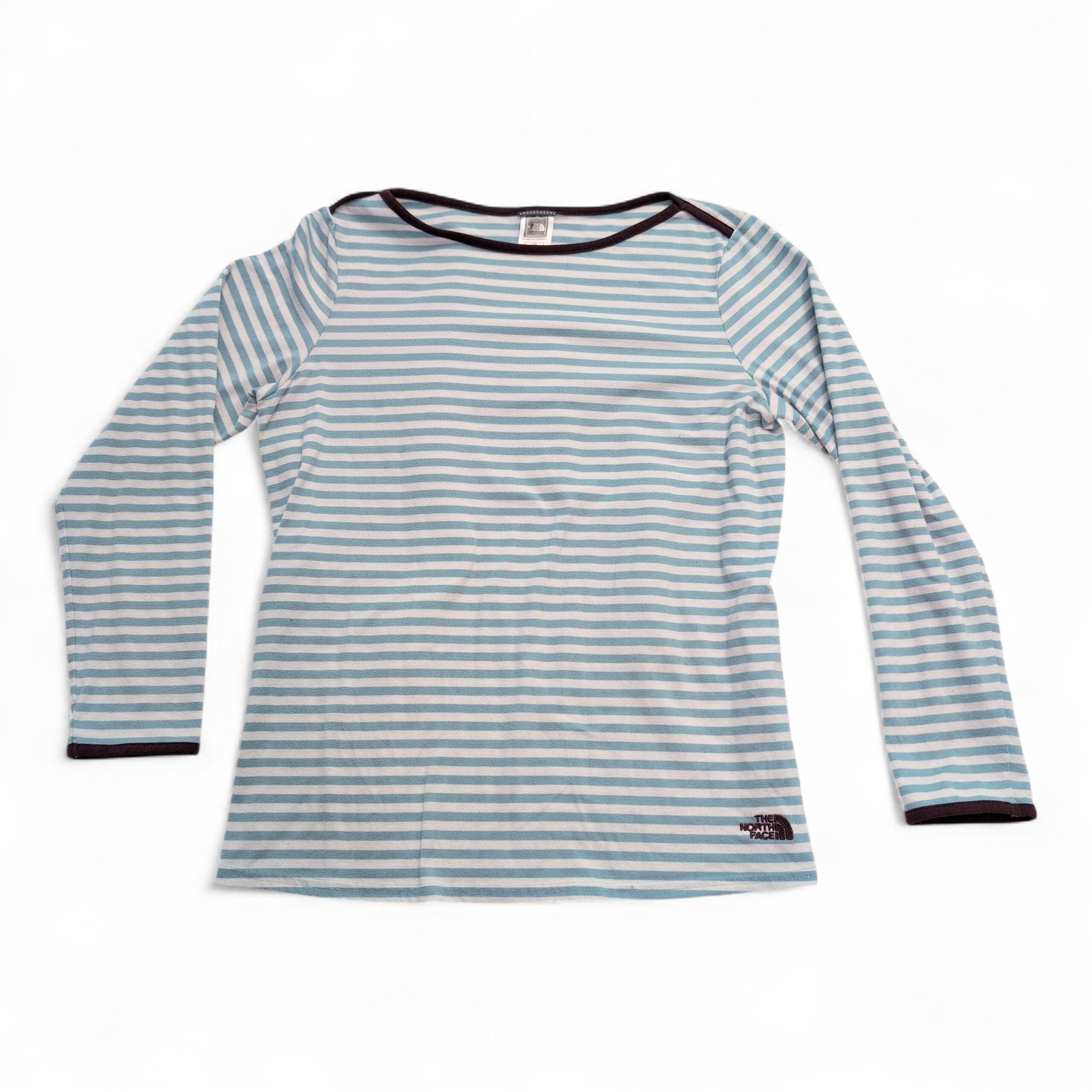 Light blue and white striped long-sleeve tee from The North Face. Lightweight VaporWick moisture-wicking fabric keeps you comfortable during activities; features contrast dark trim at the neckline and cuffs and a small logo at the hem. Size L (standard). Gently used — free of major rips, tears, stains, or flaws, though typical light wear may be present.