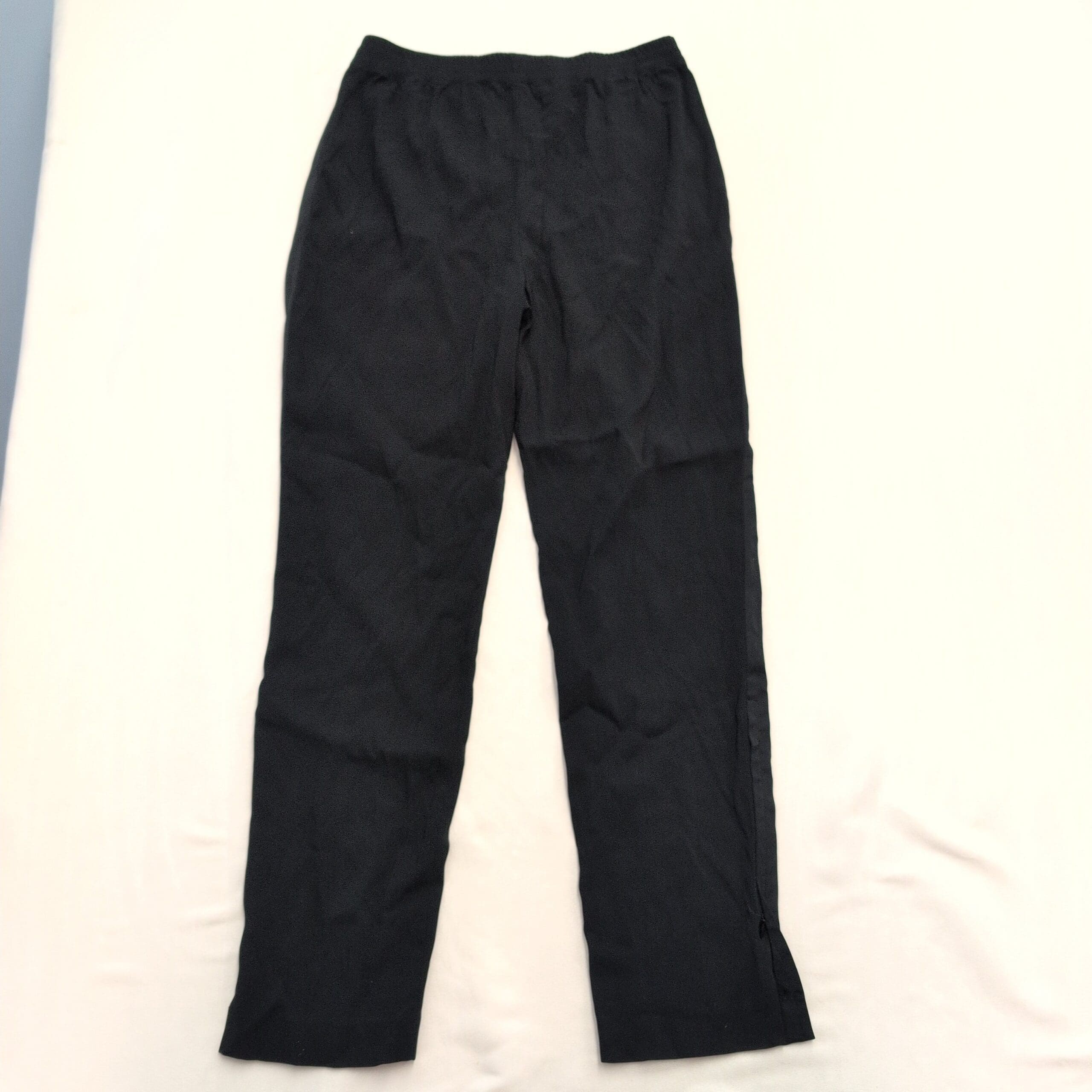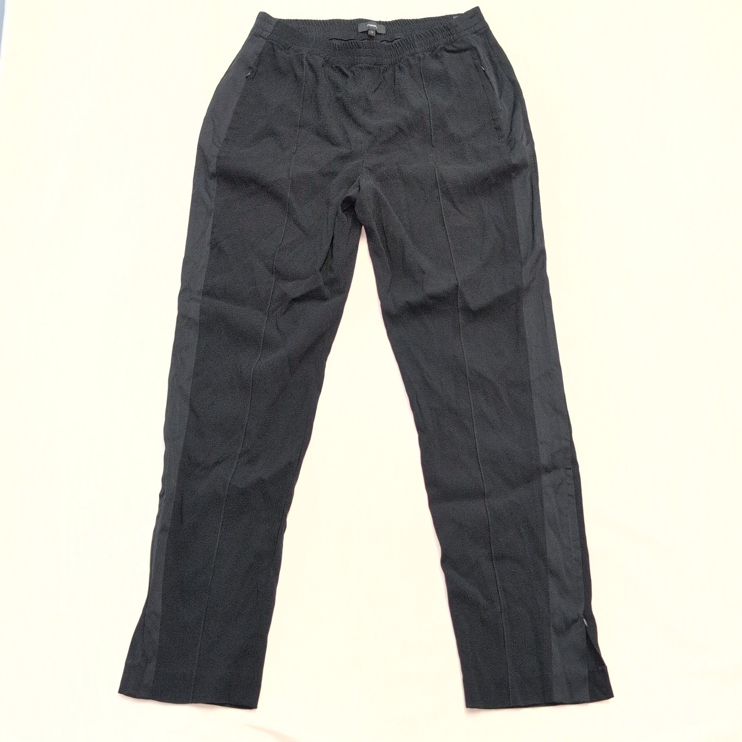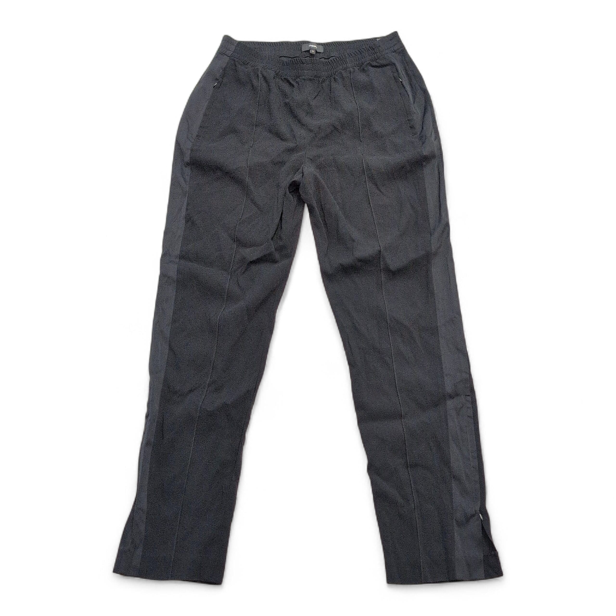Theory women’s black pants, size 10. Textured lightweight fabric with tonal tuxedo-style side stripe and stitched front creases for a polished, tailored look. Elasticized waistband with front pockets and a straight-to-tapered leg that features a small ankle slit. Excellent used condition — free of major rips, tears, stains, or flaws; typical light wear may be present. Quality notes: Viewpine C bergen. Originally MSRP $325.