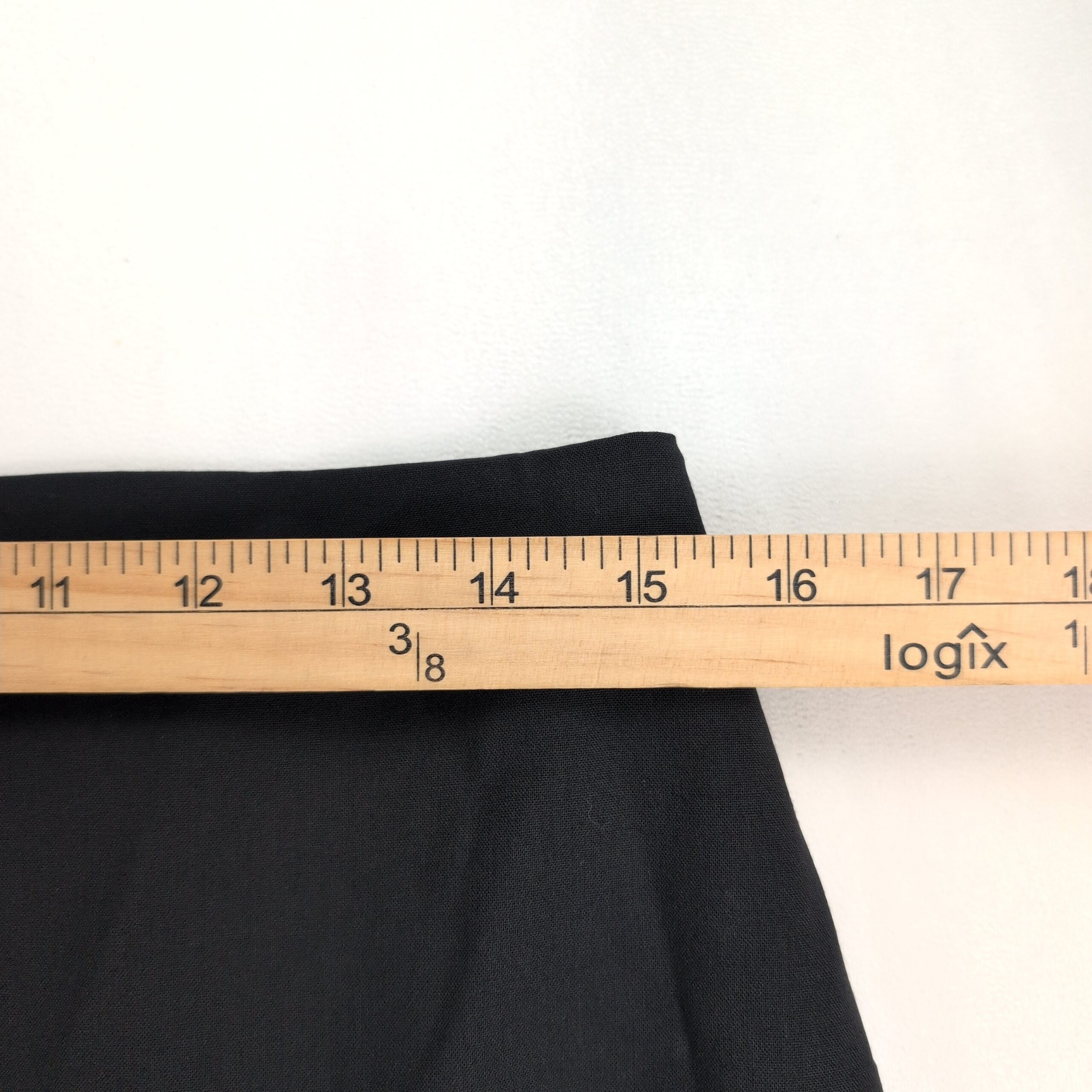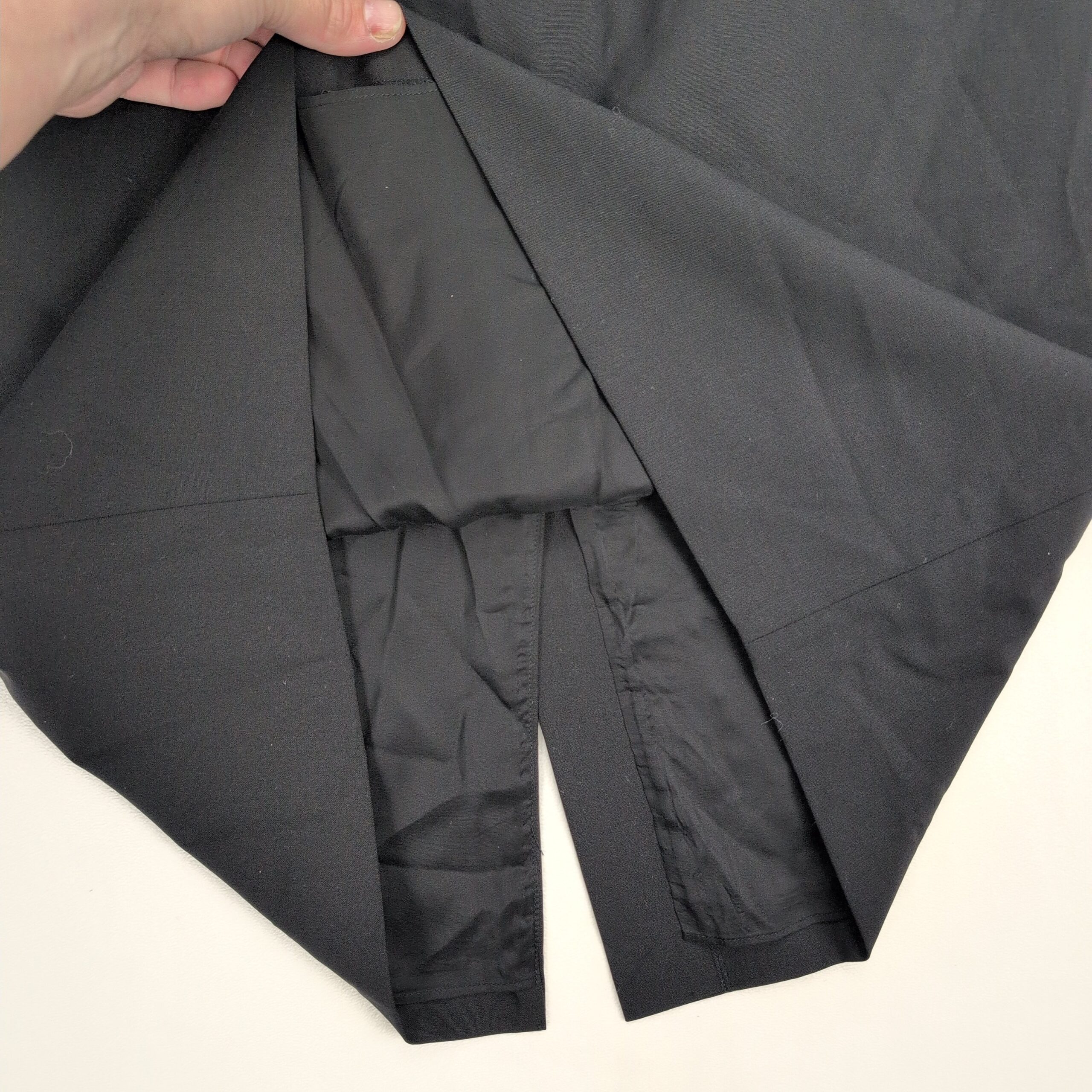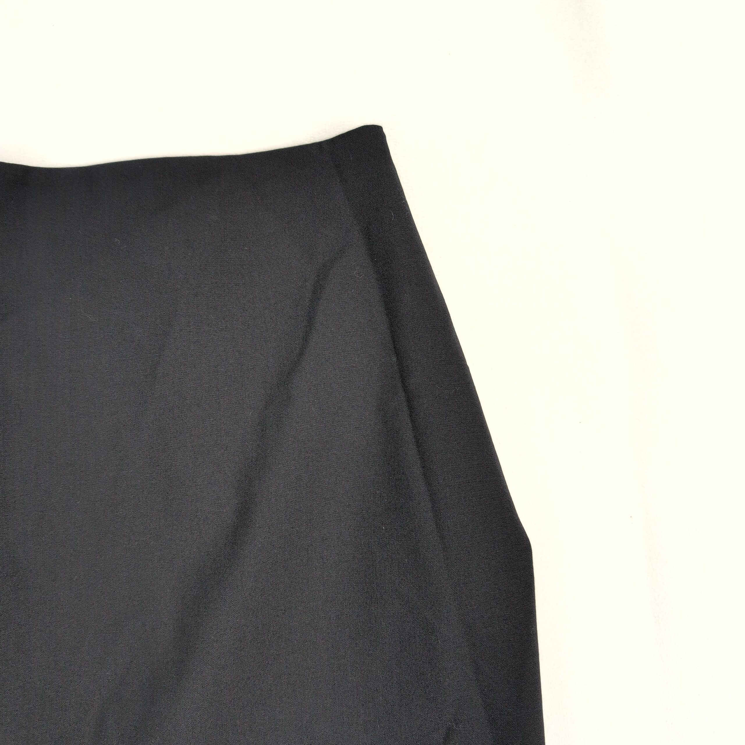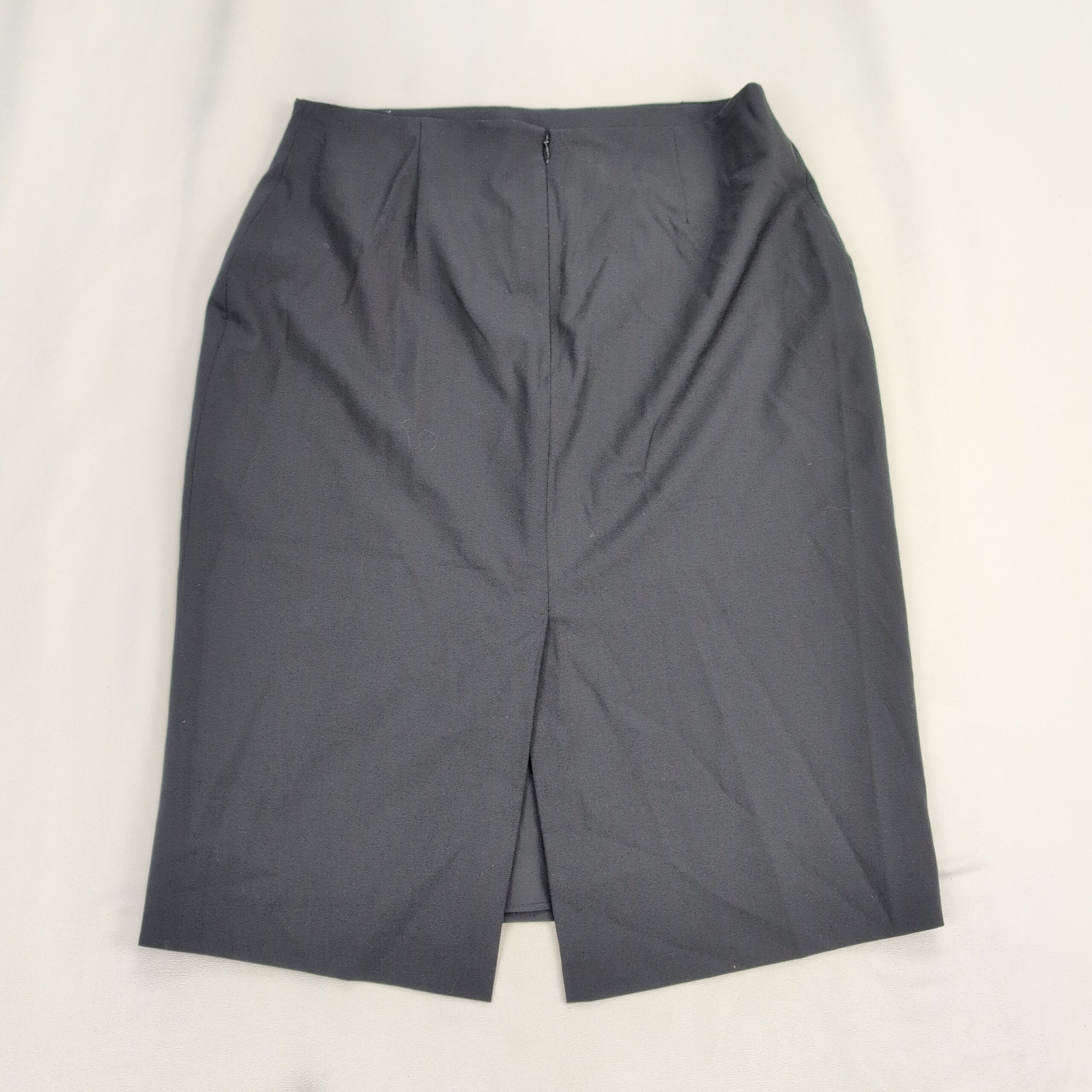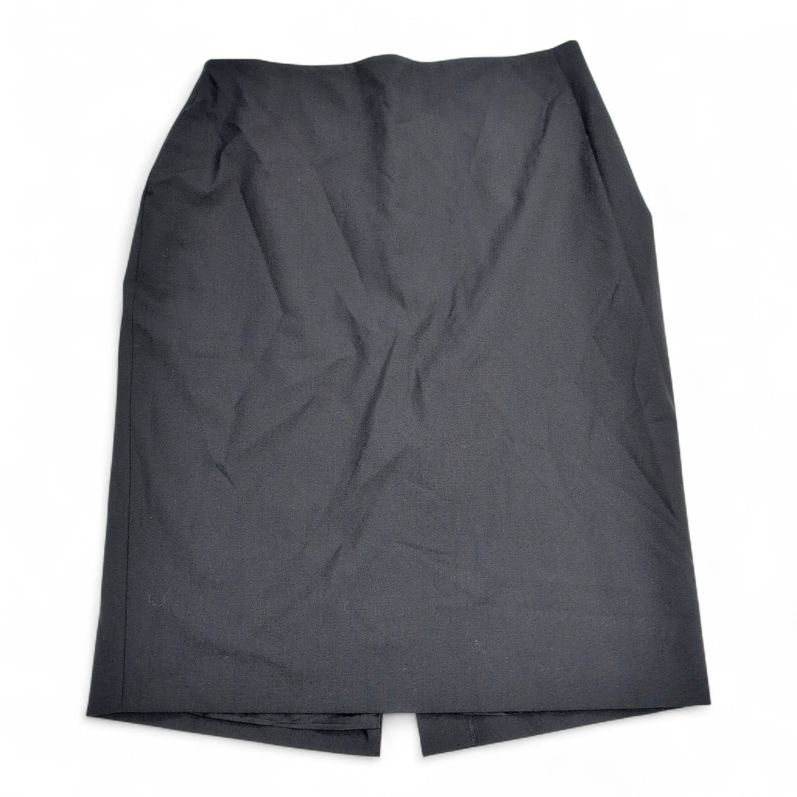 Theory wool-blend pencil midi skirt, Size 12 (standard). Deep black/charcoal shade with a tailored pencil silhouette and a rear vent for ease of movement — a polished option for work or refined casual looks. Fabric noted as a wool blend per quality notes.