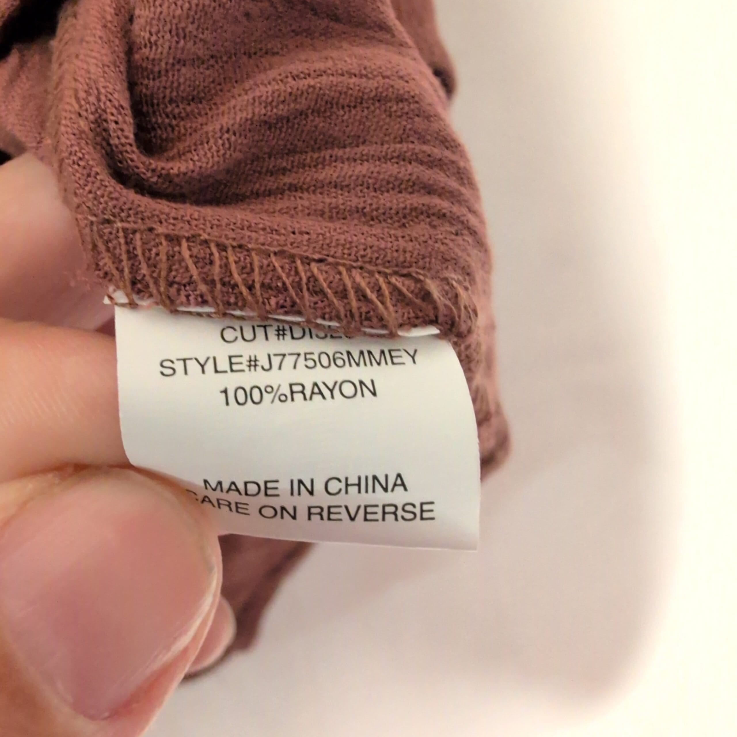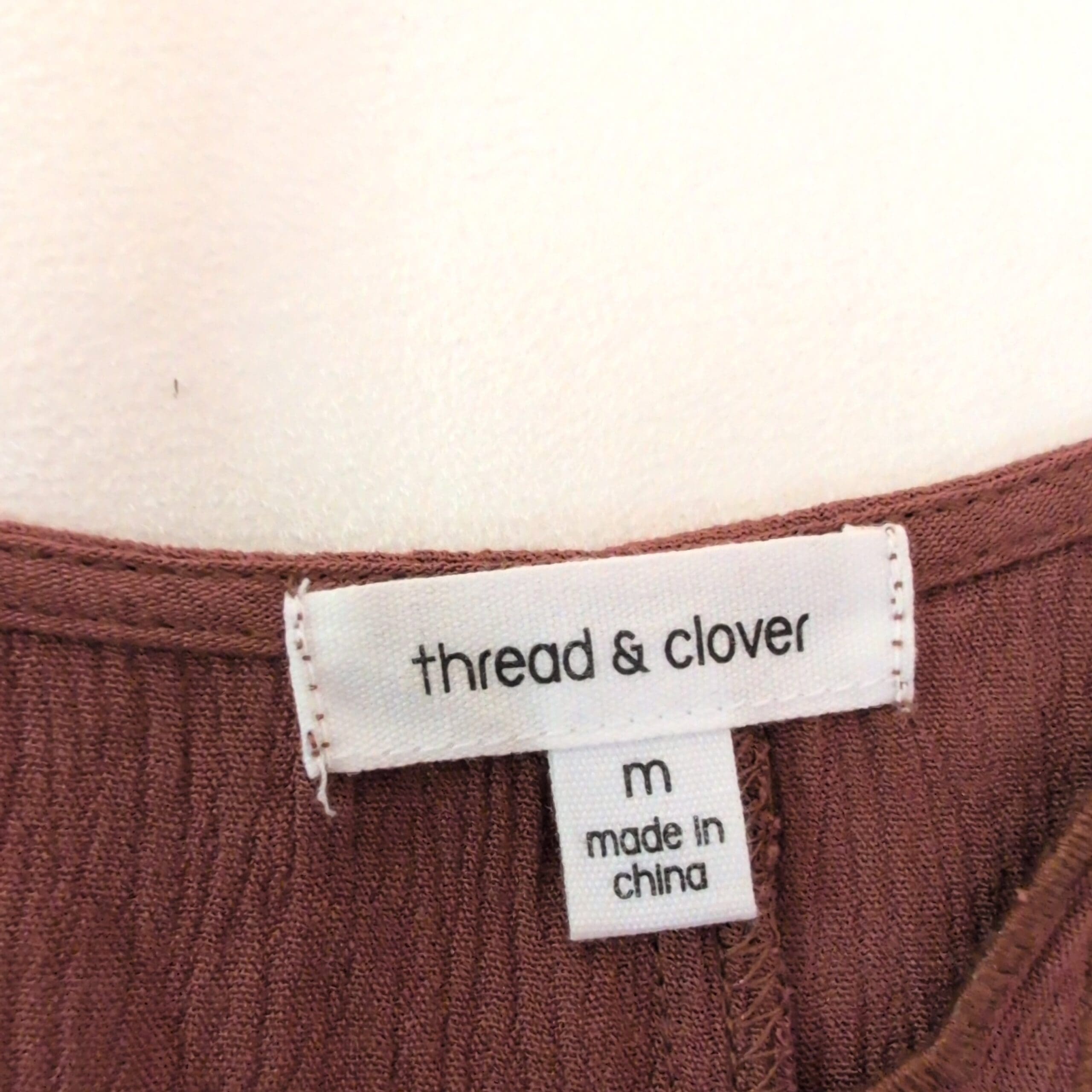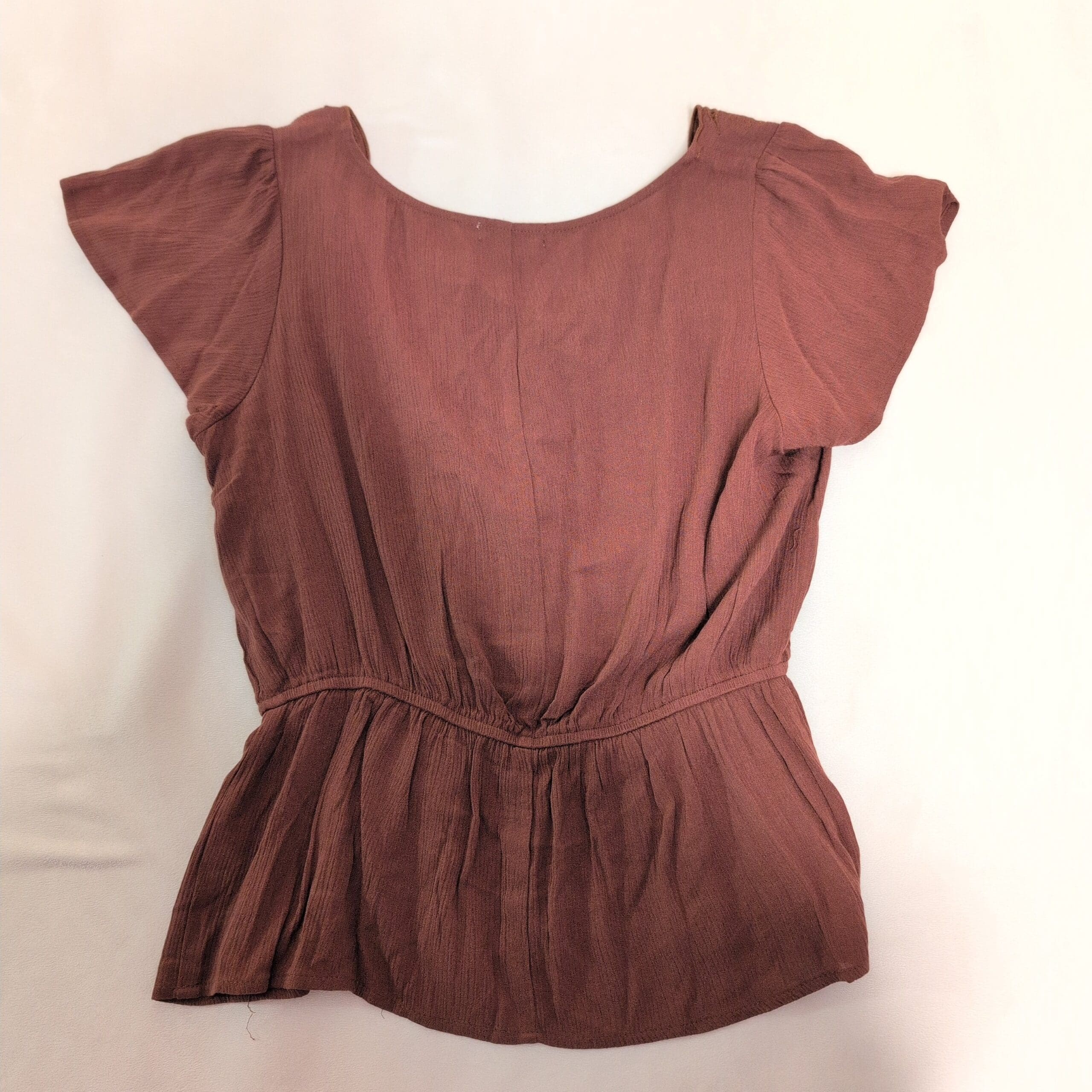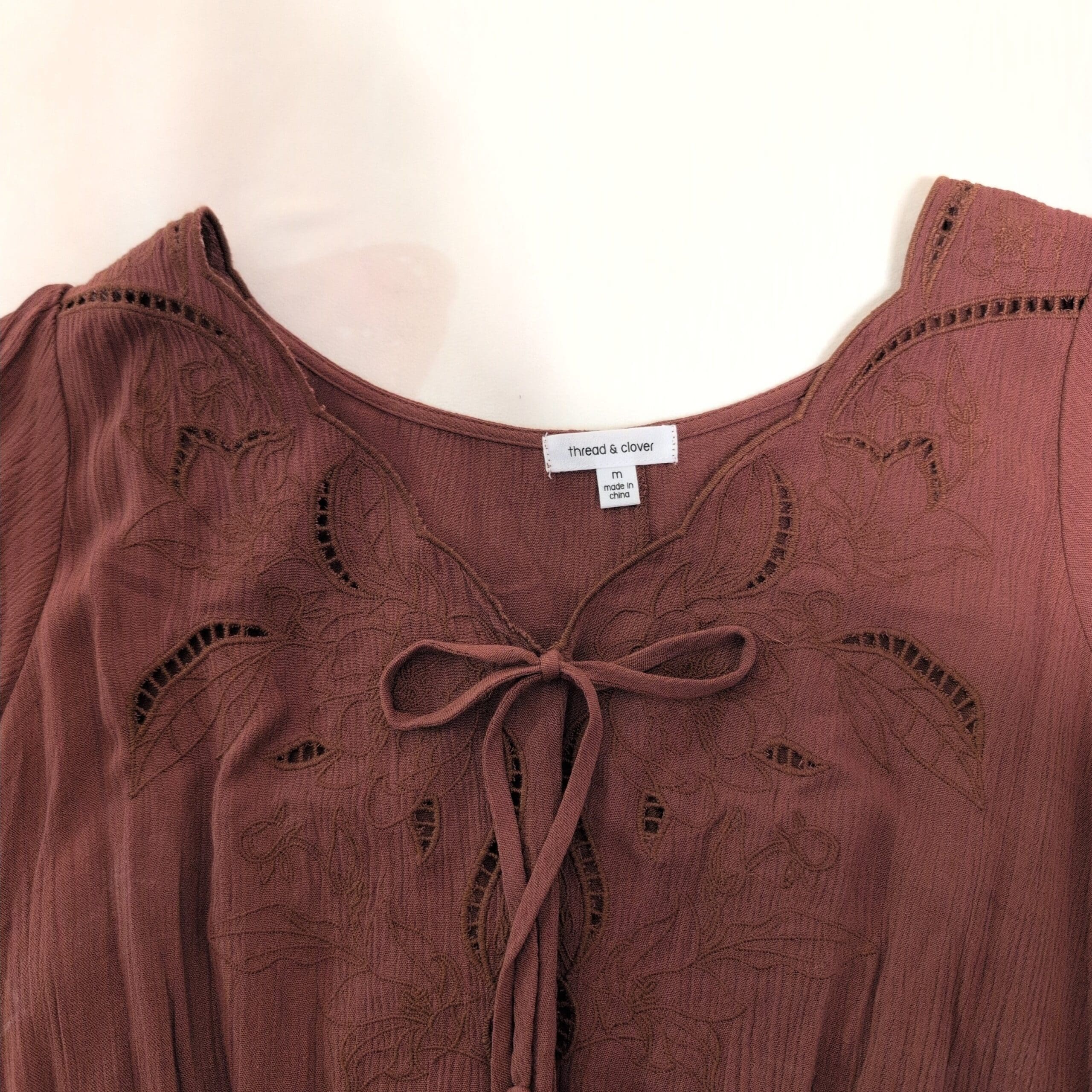 Lightweight brown Thread & Clover blouse in size M. Features delicate embroidered cutwork at the scoop neckline with a tie detail, flutter cap sleeves, and a gathered peplum waist for a flattering, feminine silhouette. Textured woven fabric drapes nicely with a slightly high-low hem — perfect for casual days or dressed-up evenings. Pre-owned — please review photos for condition and details.
