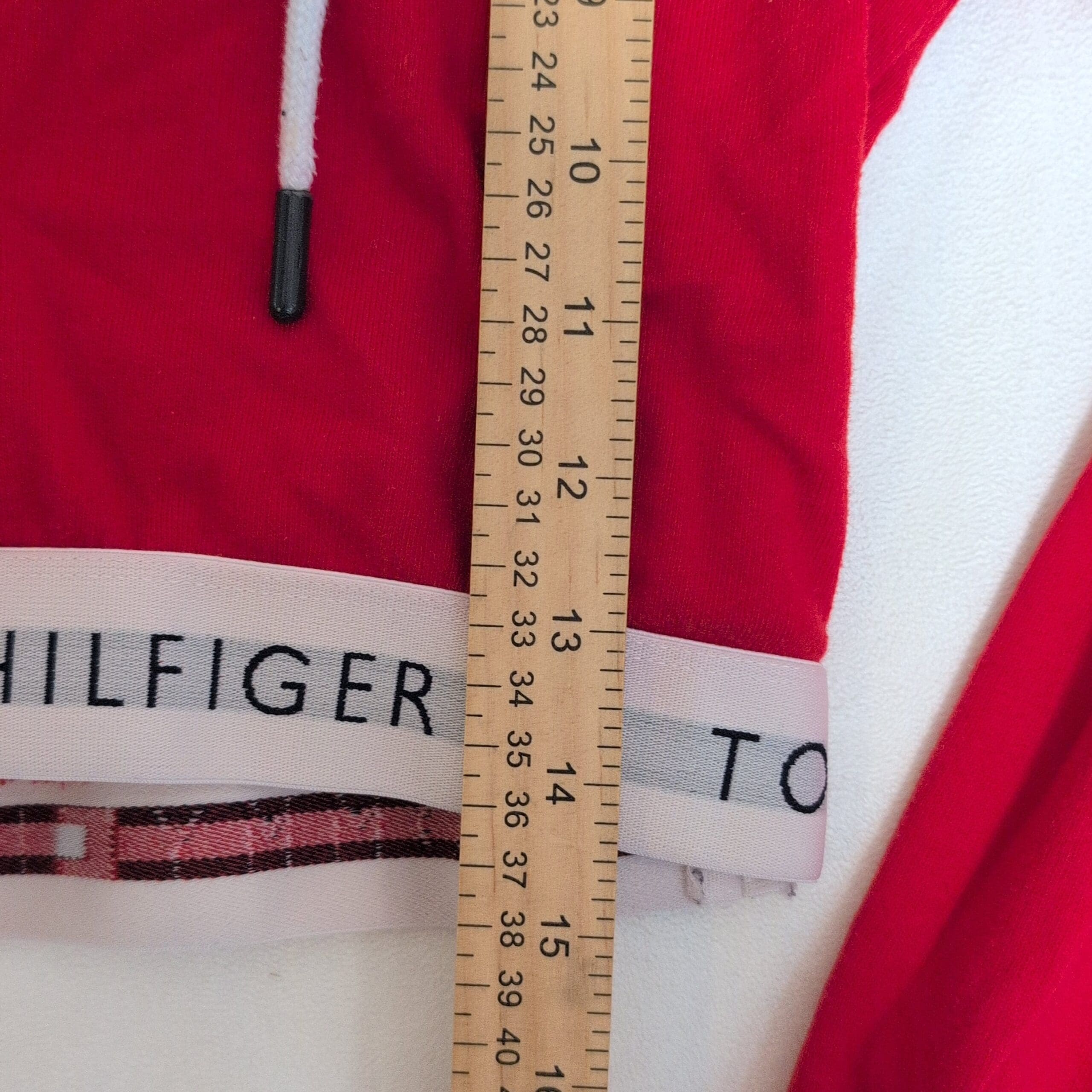 Tommy Hilfiger cropped hooded sweatshirt in vibrant red. Size S. Features a V-neck with contrasting black and white trim, adjustable drawstrings, long sleeves, and a branded elastic hem with TOMMY HILFIGER logo — sporty and great for layering or casual looks.