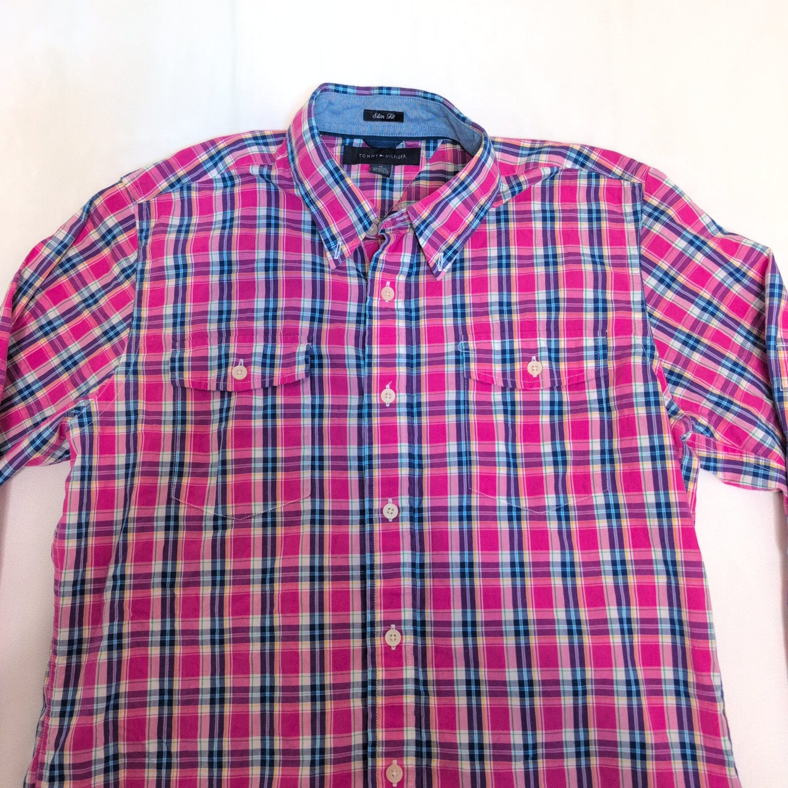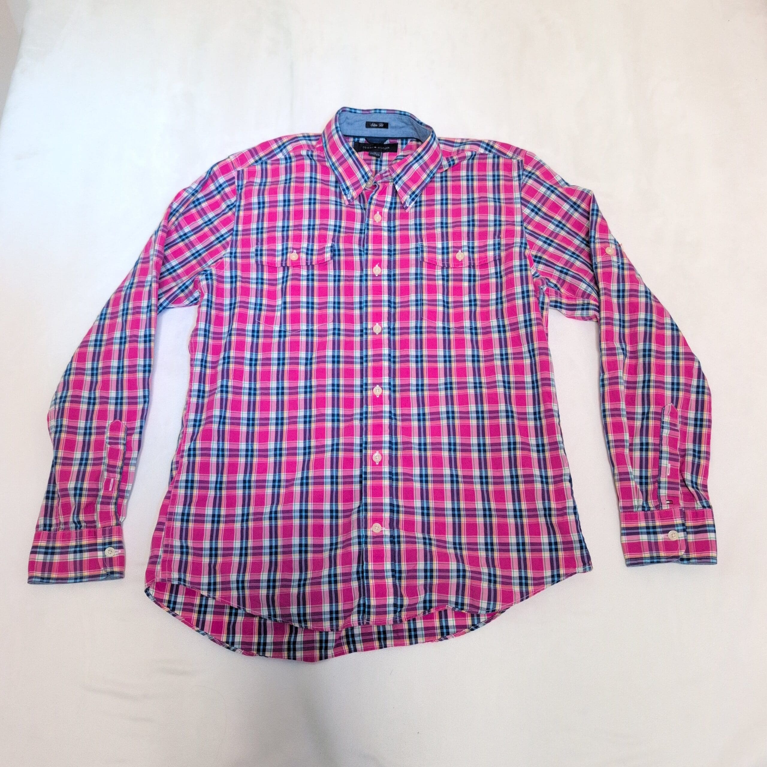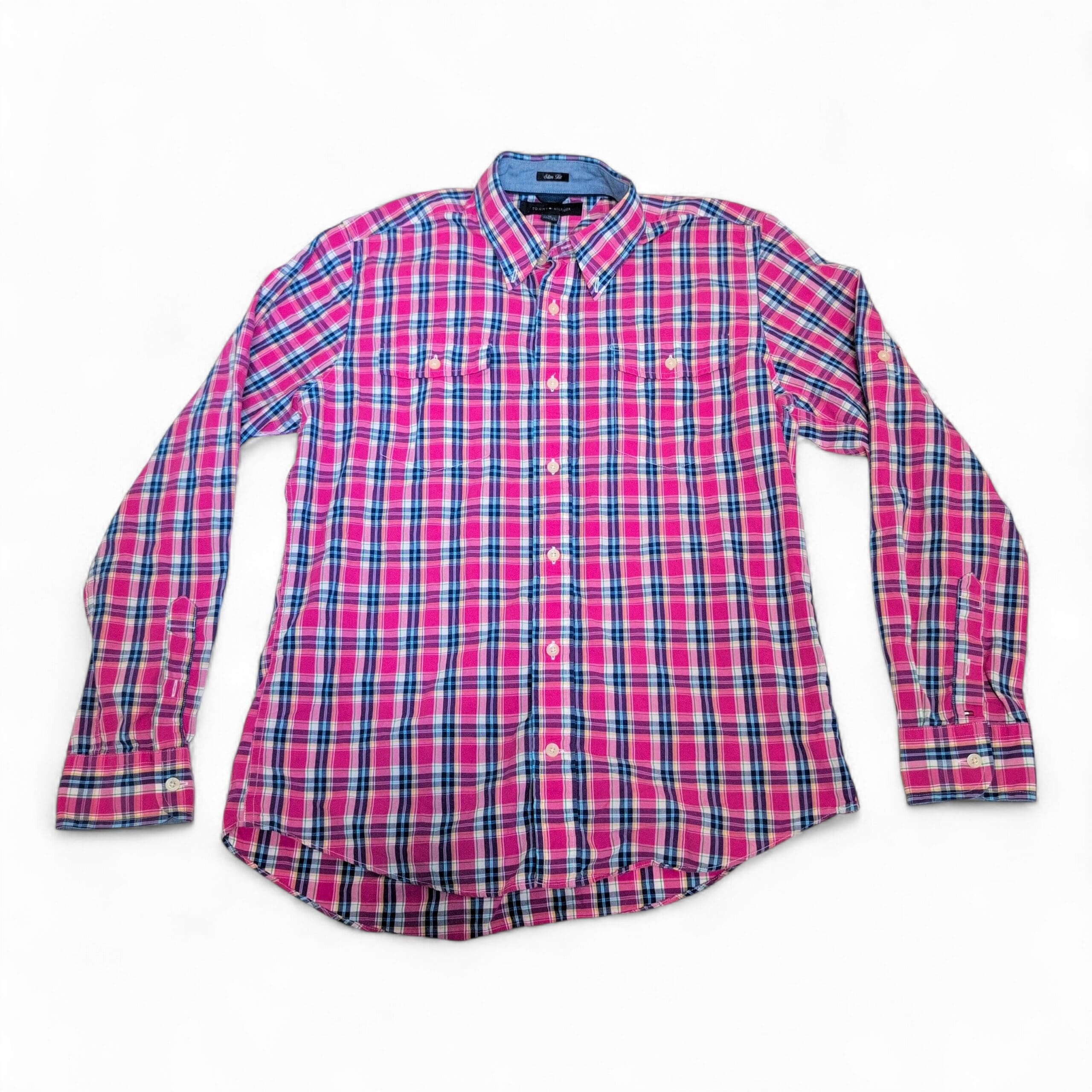 Tommy Hilfiger long-sleeve casual button-down in a vibrant pink plaid. Features a button-down collar, full button front, dual chest pockets, and button cuffs — a versatile piece for casual or smart-casual looks. Colorway combines pink with navy, white, and teal accents. Size M (standard). Please review photos for pattern and color details.
