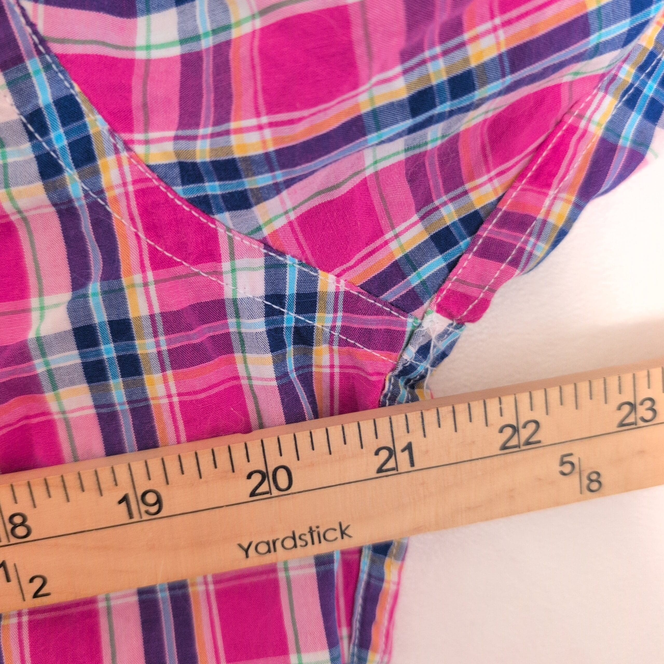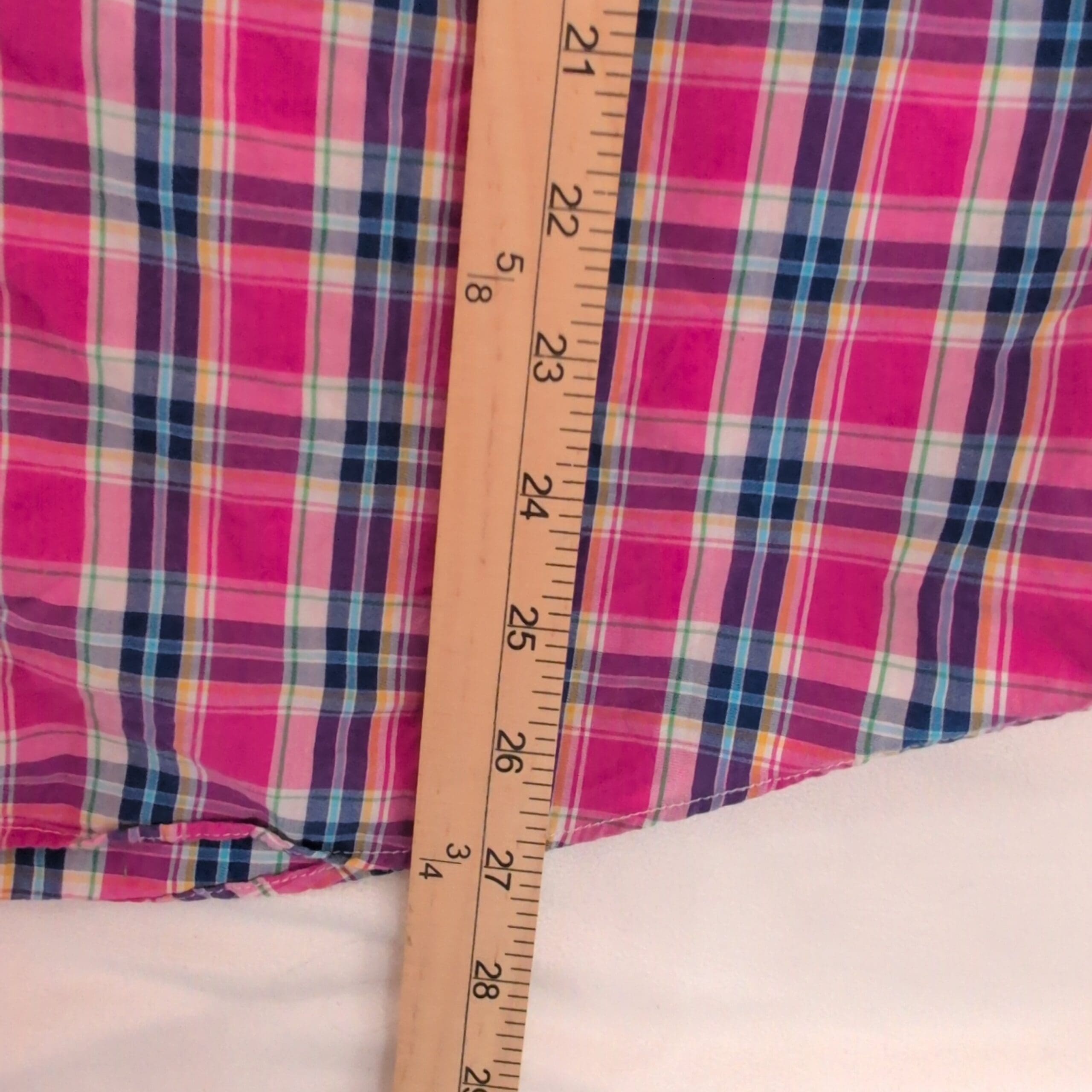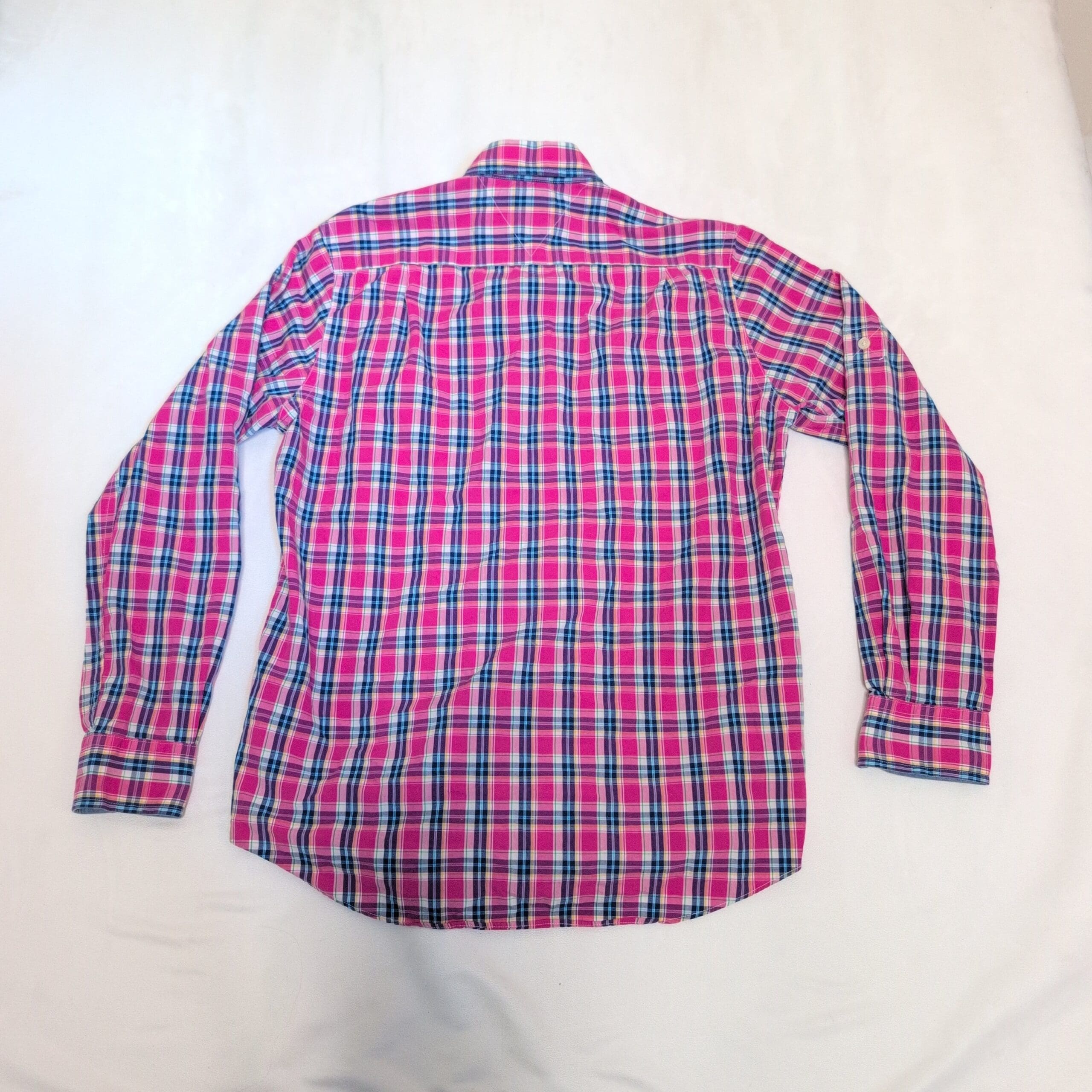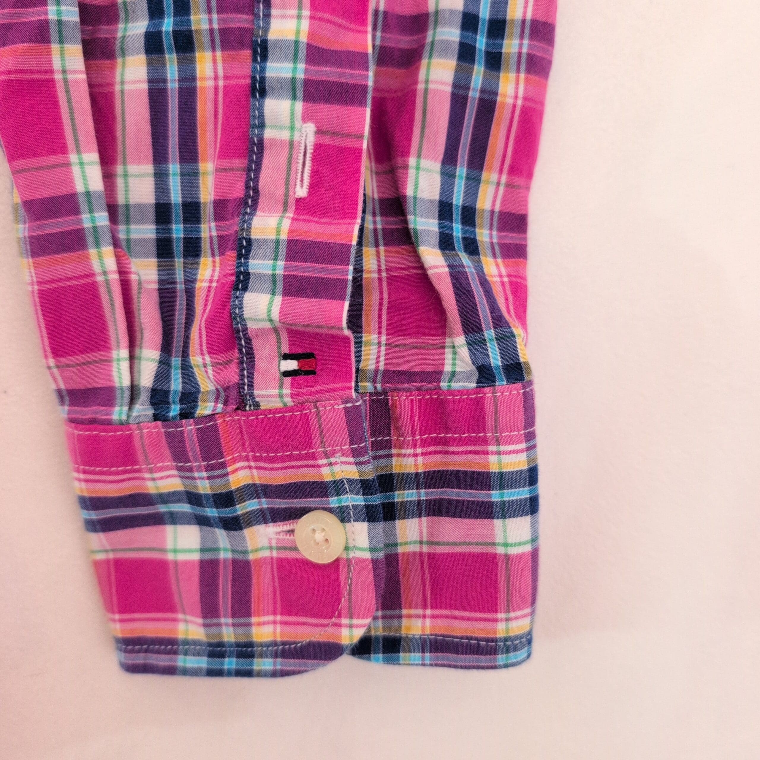 Tommy Hilfiger long-sleeve casual button-down in a vibrant pink plaid. Features a button-down collar, full button front, dual chest pockets, and button cuffs — a versatile piece for casual or smart-casual looks. Colorway combines pink with navy, white, and teal accents. Size M (standard). Please review photos for pattern and color details.