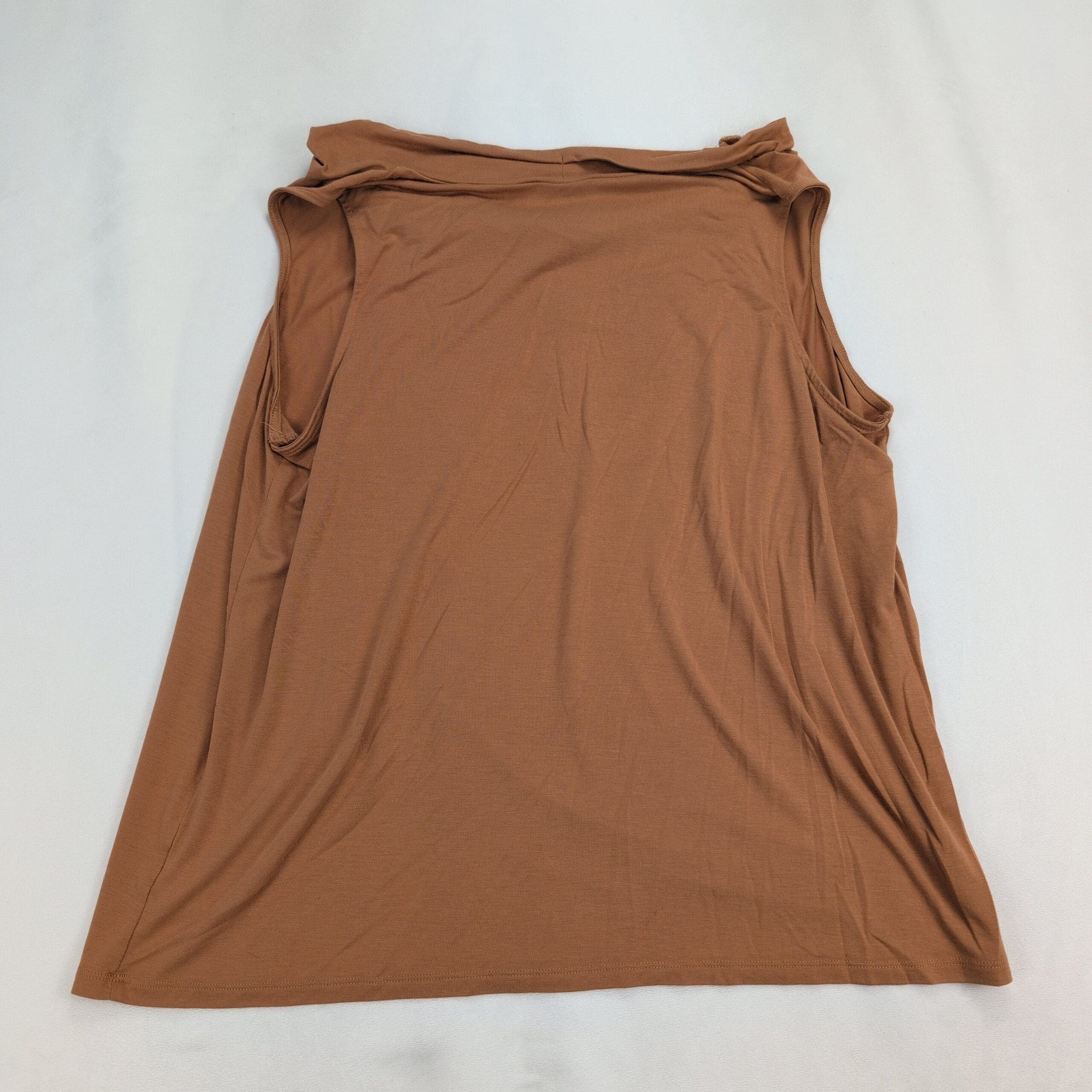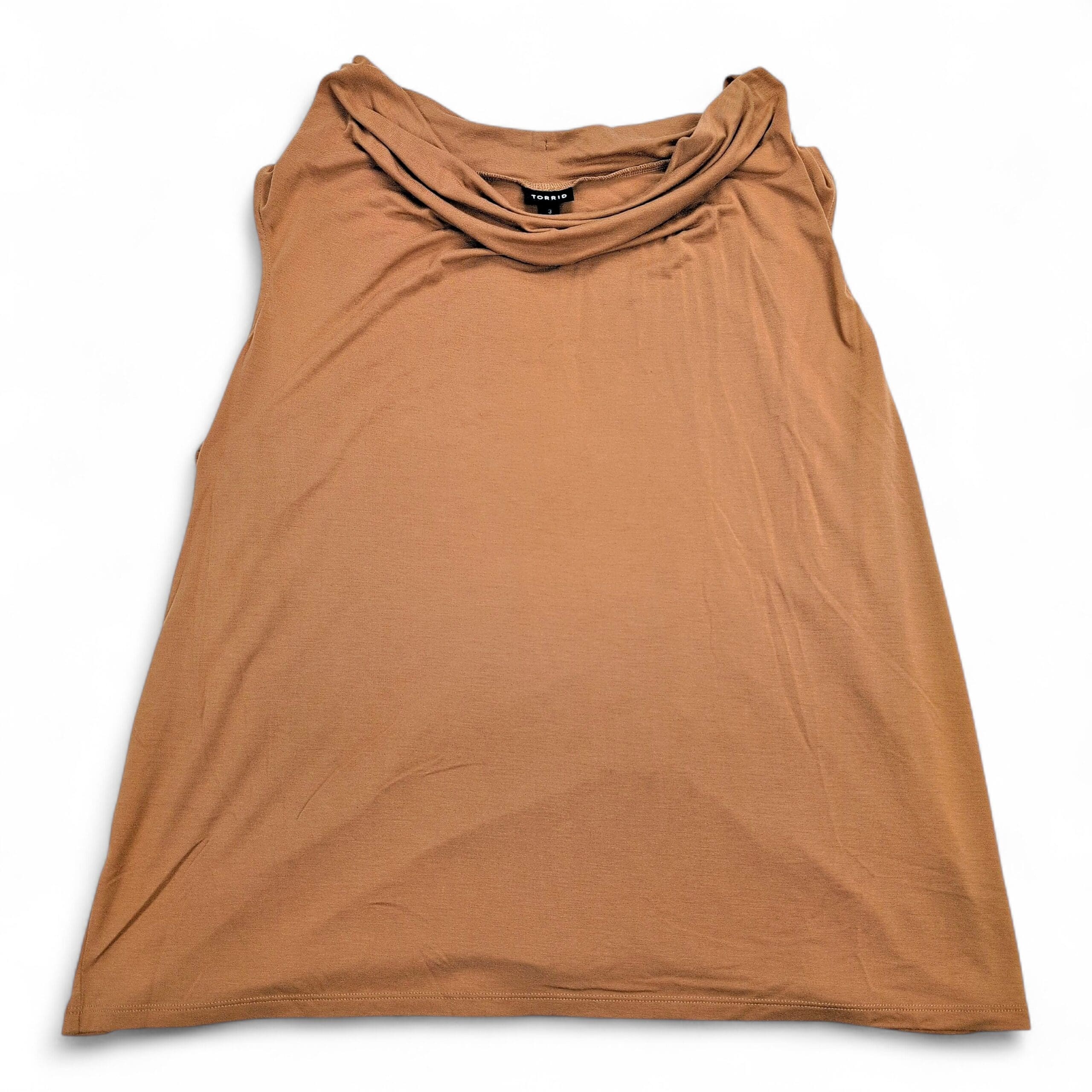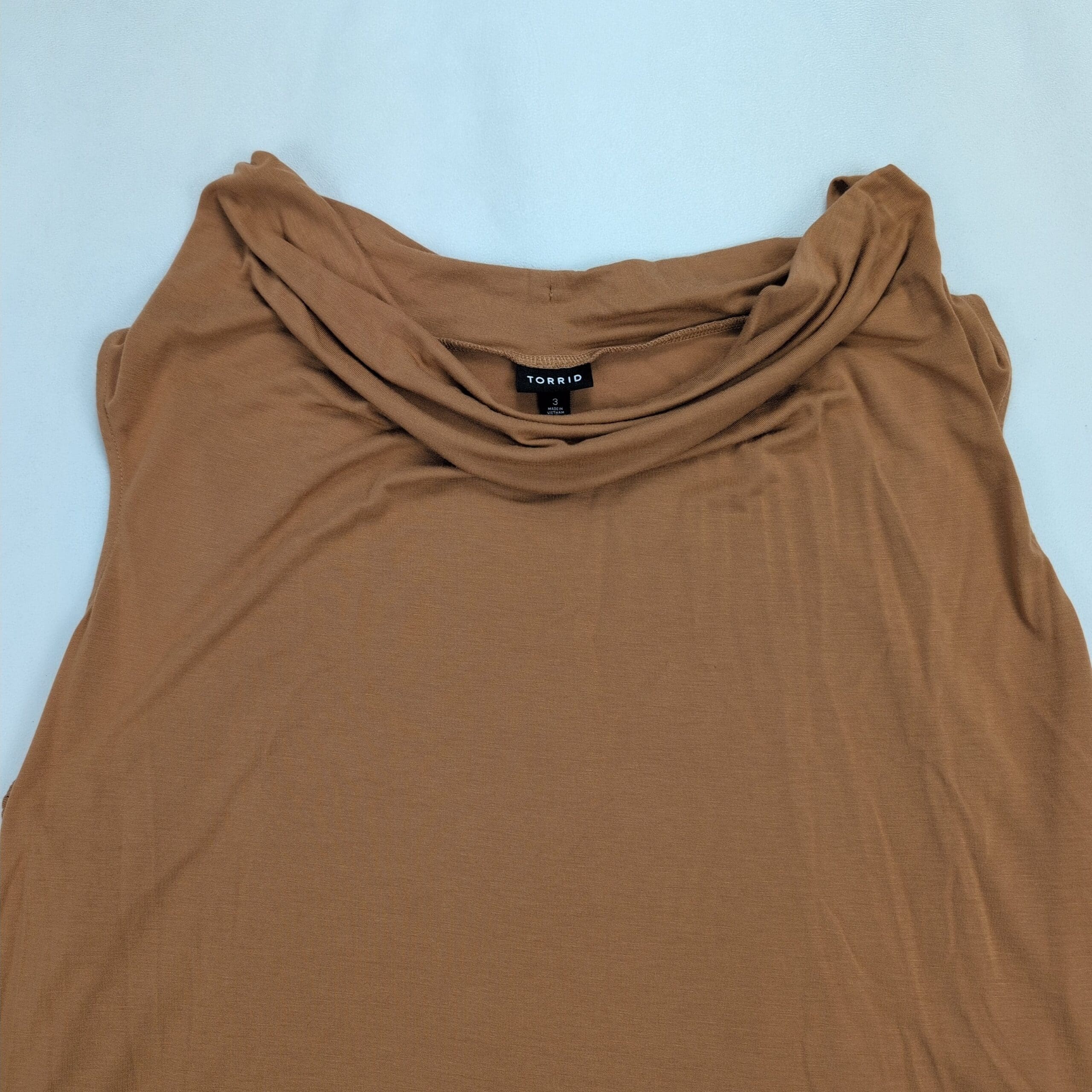 Torrid sleeveless tank in size 3X with a drapey cowl neckline — a versatile plus-size staple. Color appears warm brown/caramel. Clean lines and a relaxed fit make this ideal for layering under jackets or wearing on its own for casual looks. Tag reads Torrid; size 3X.