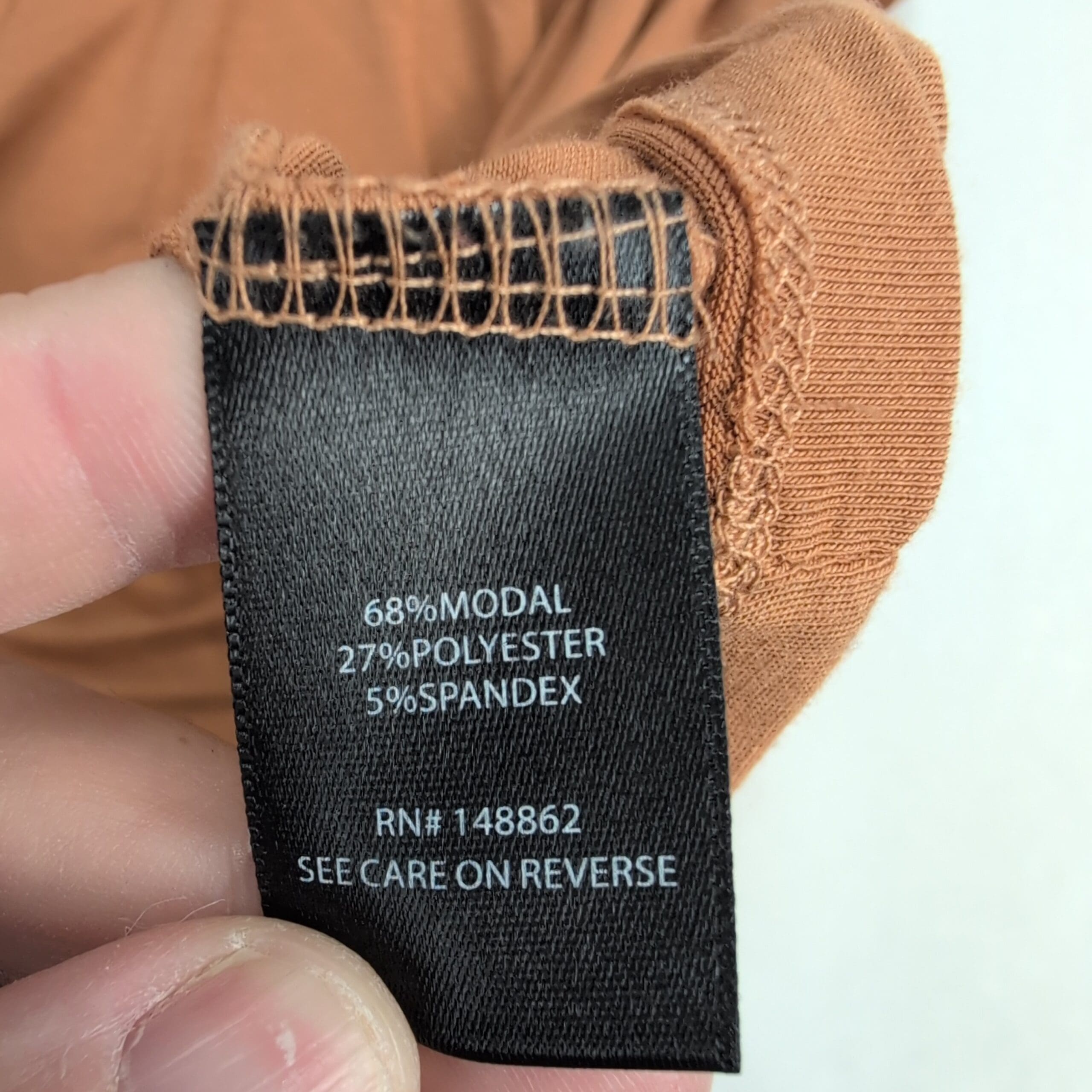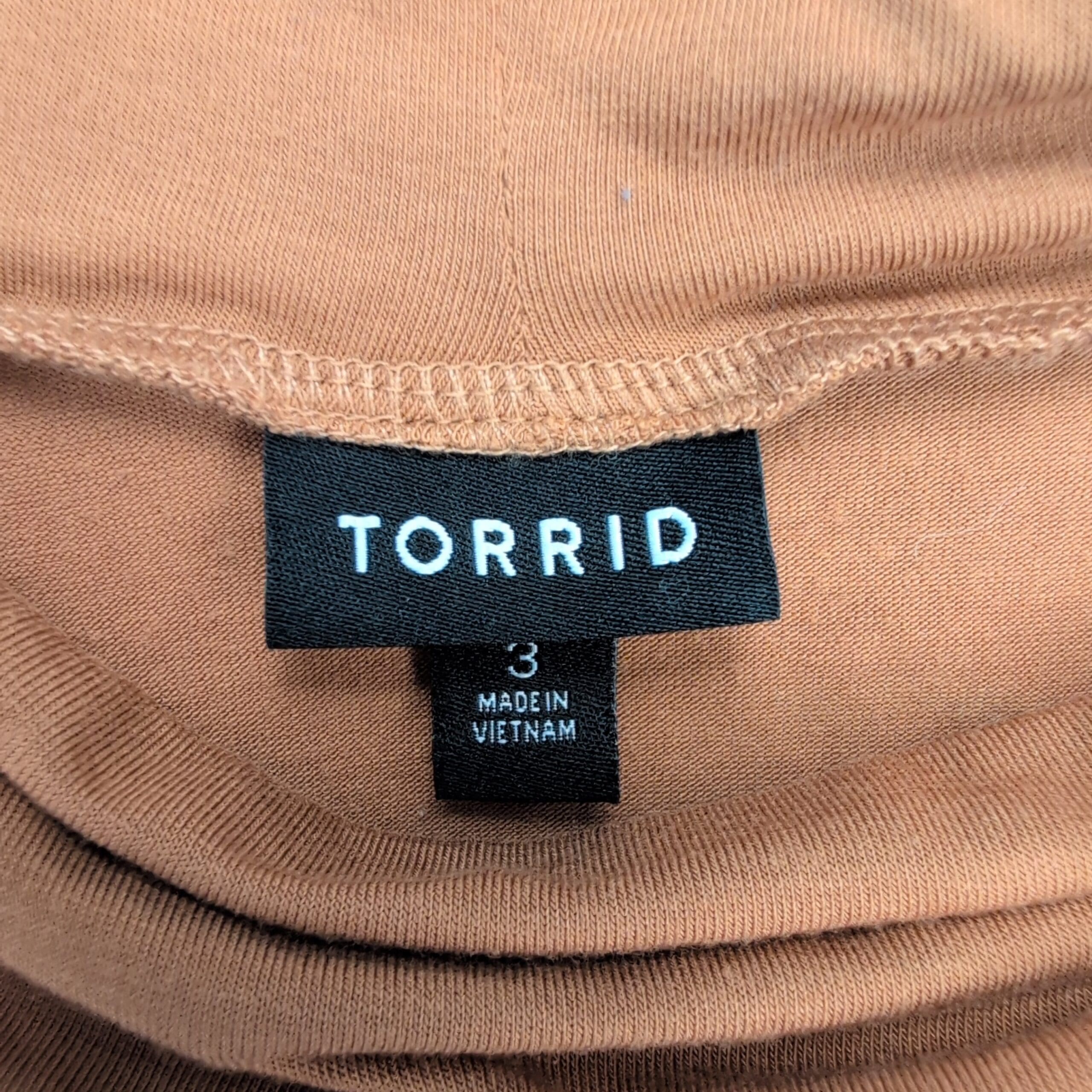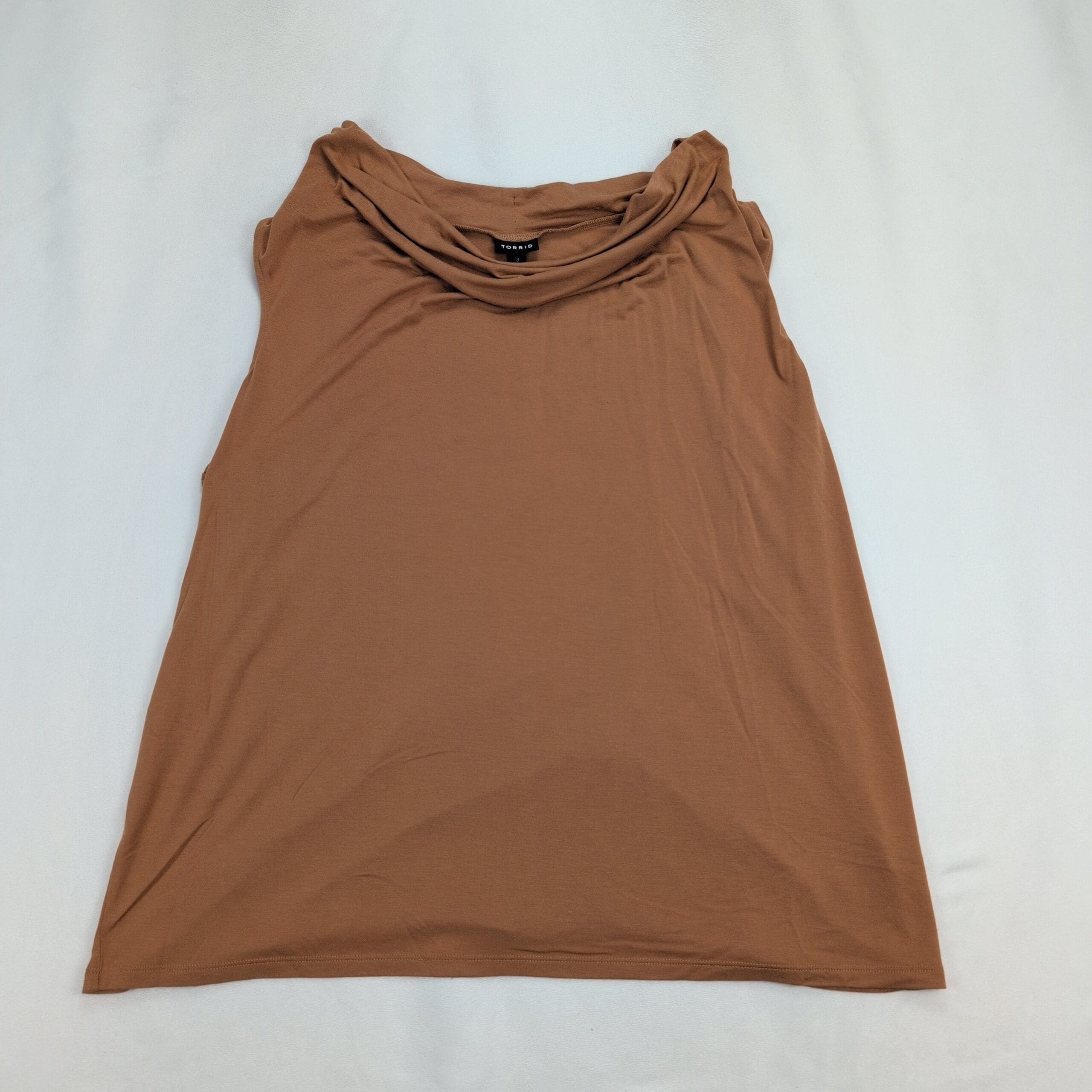 Torrid sleeveless tank in size 3X with a drapey cowl neckline — a versatile plus-size staple. Color appears warm brown/caramel. Clean lines and a relaxed fit make this ideal for layering under jackets or wearing on its own for casual looks. Tag reads Torrid; size 3X.