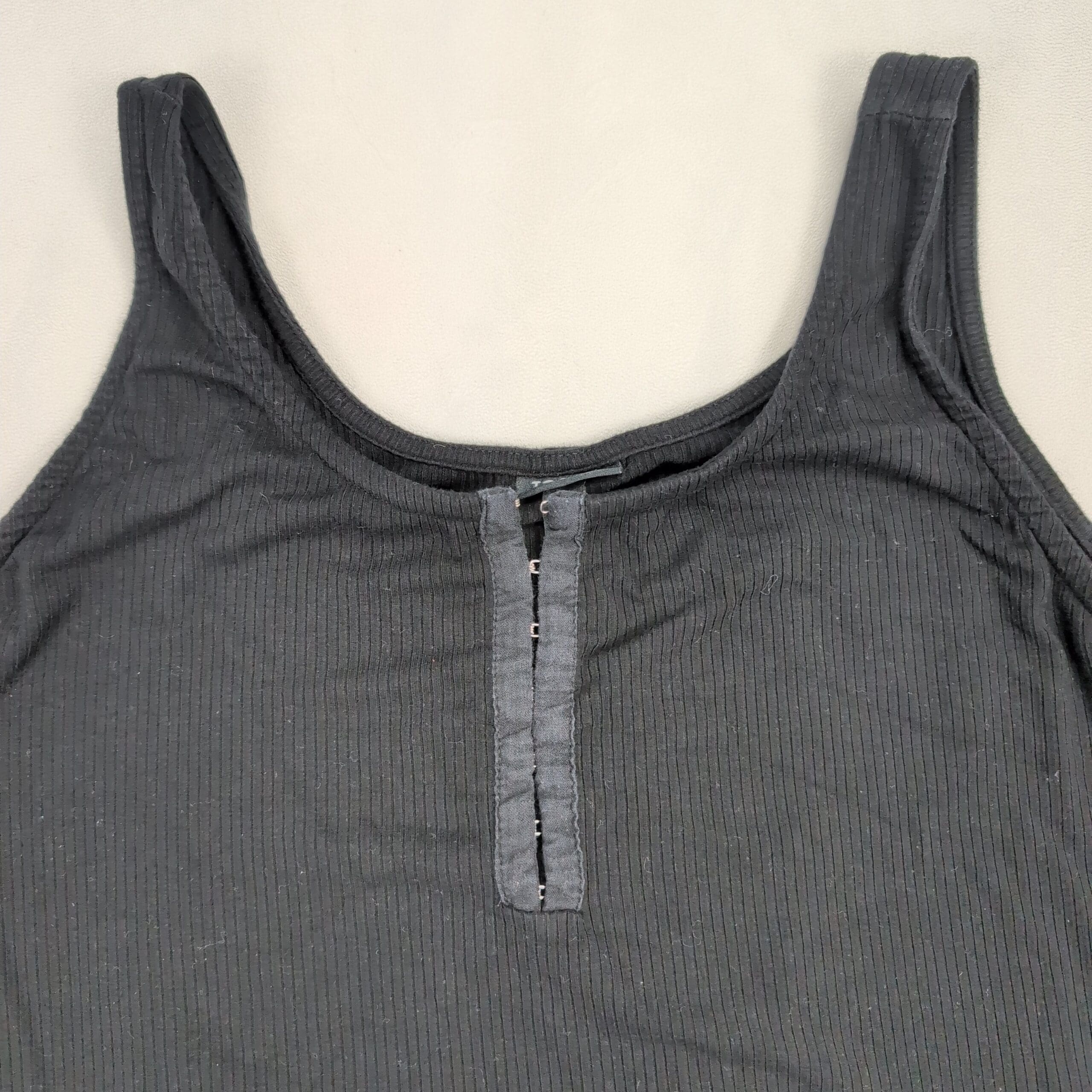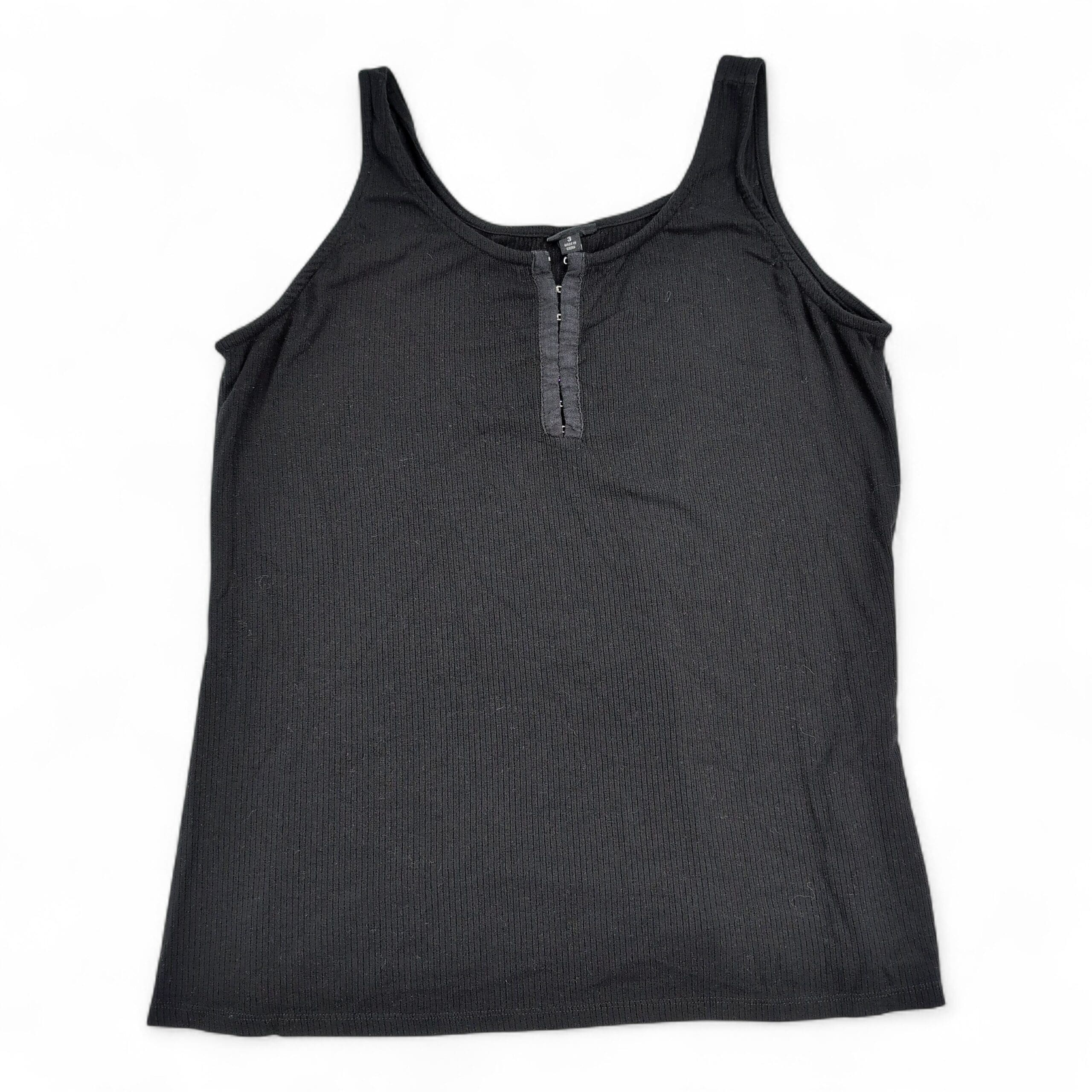 Torrid black ribbed henley-style tank top in size 3X (plus). Sleeveless with a scoop neckline and a snap-front placket — great for layering or wearing on its own for a casual, everyday look. Subtle rib texture provides a flattering, streamlined fit.