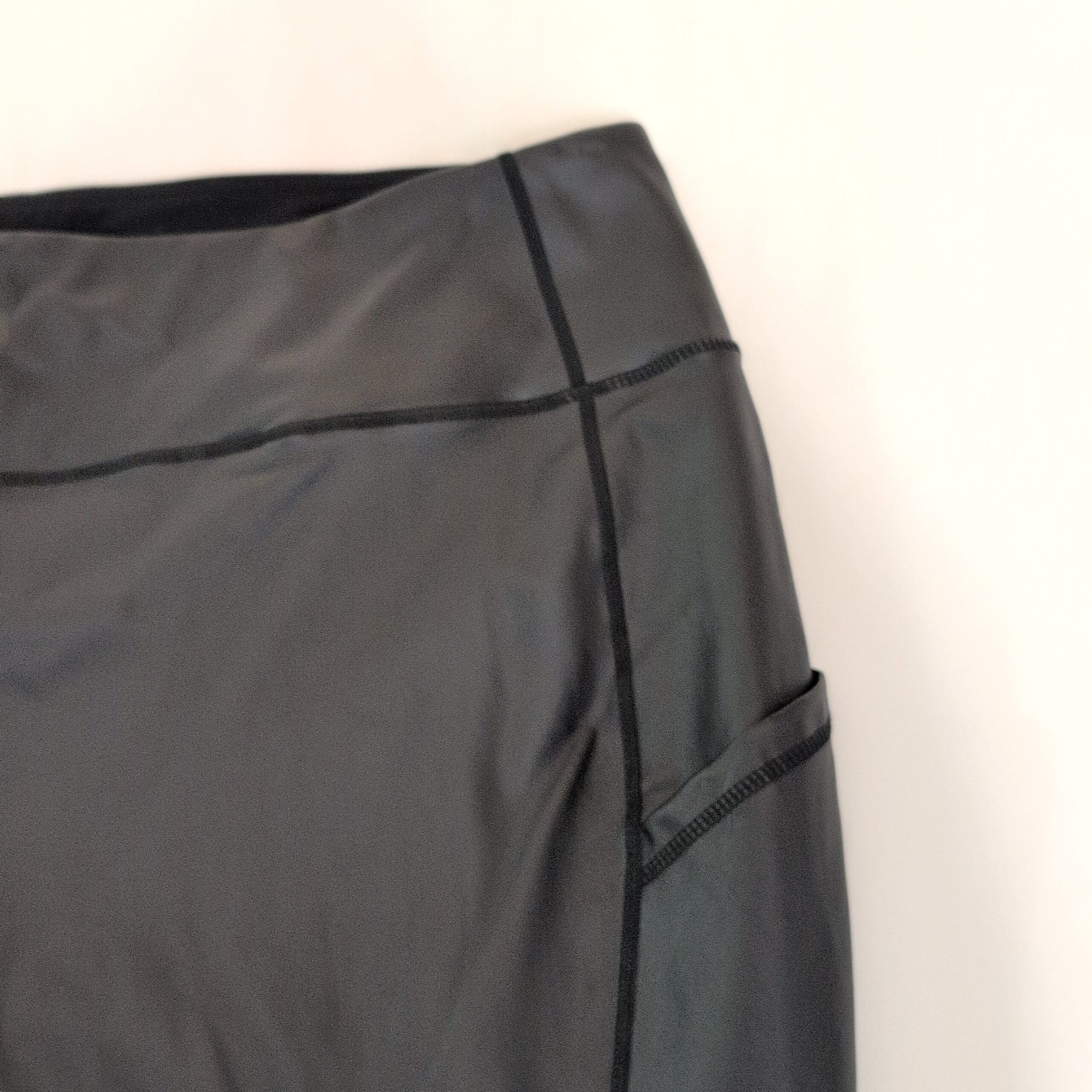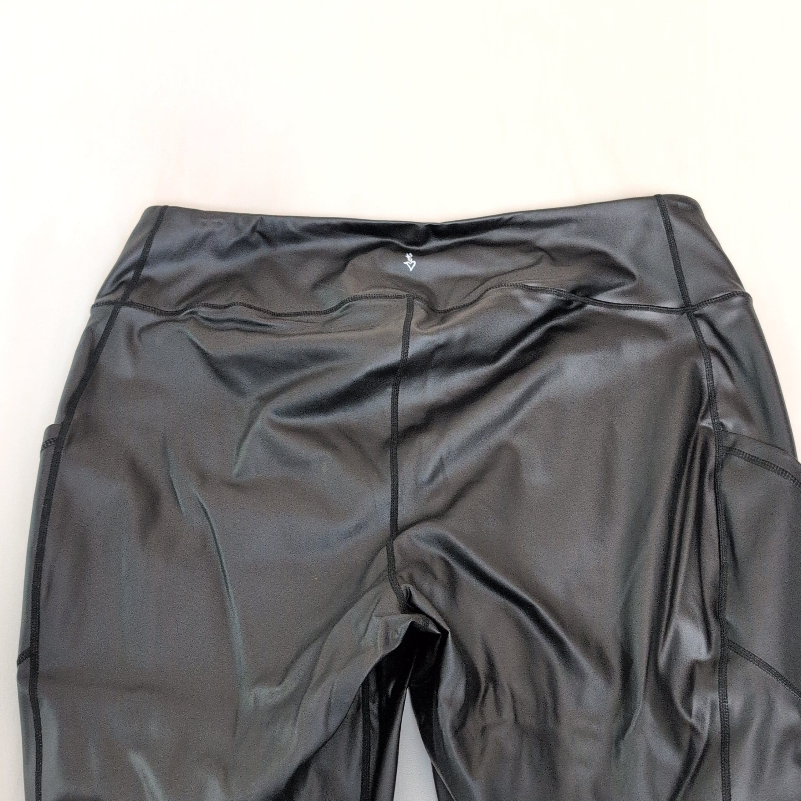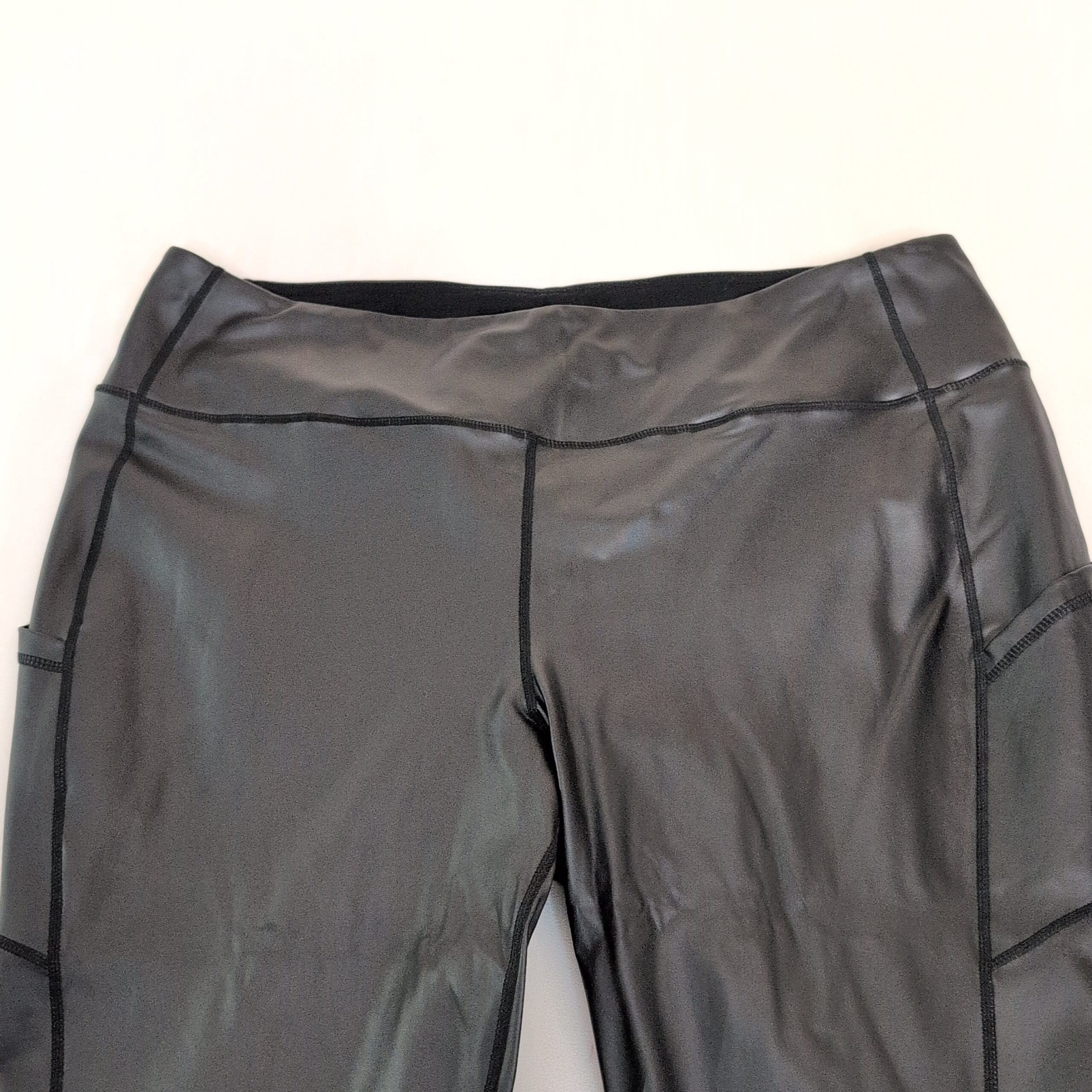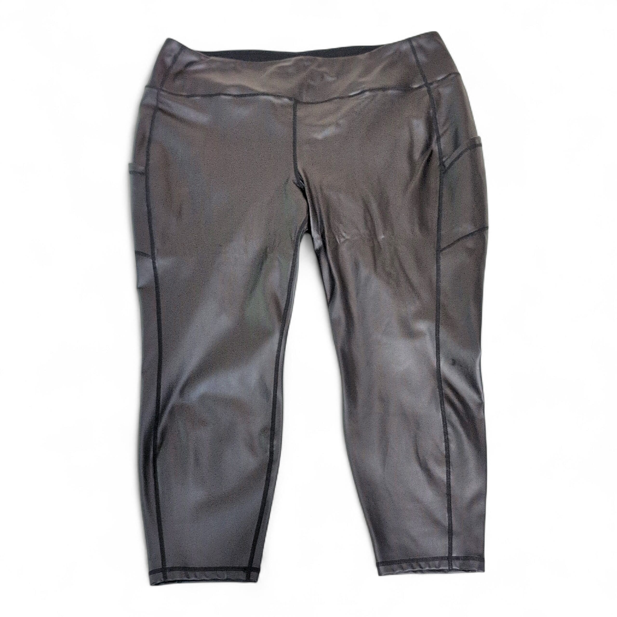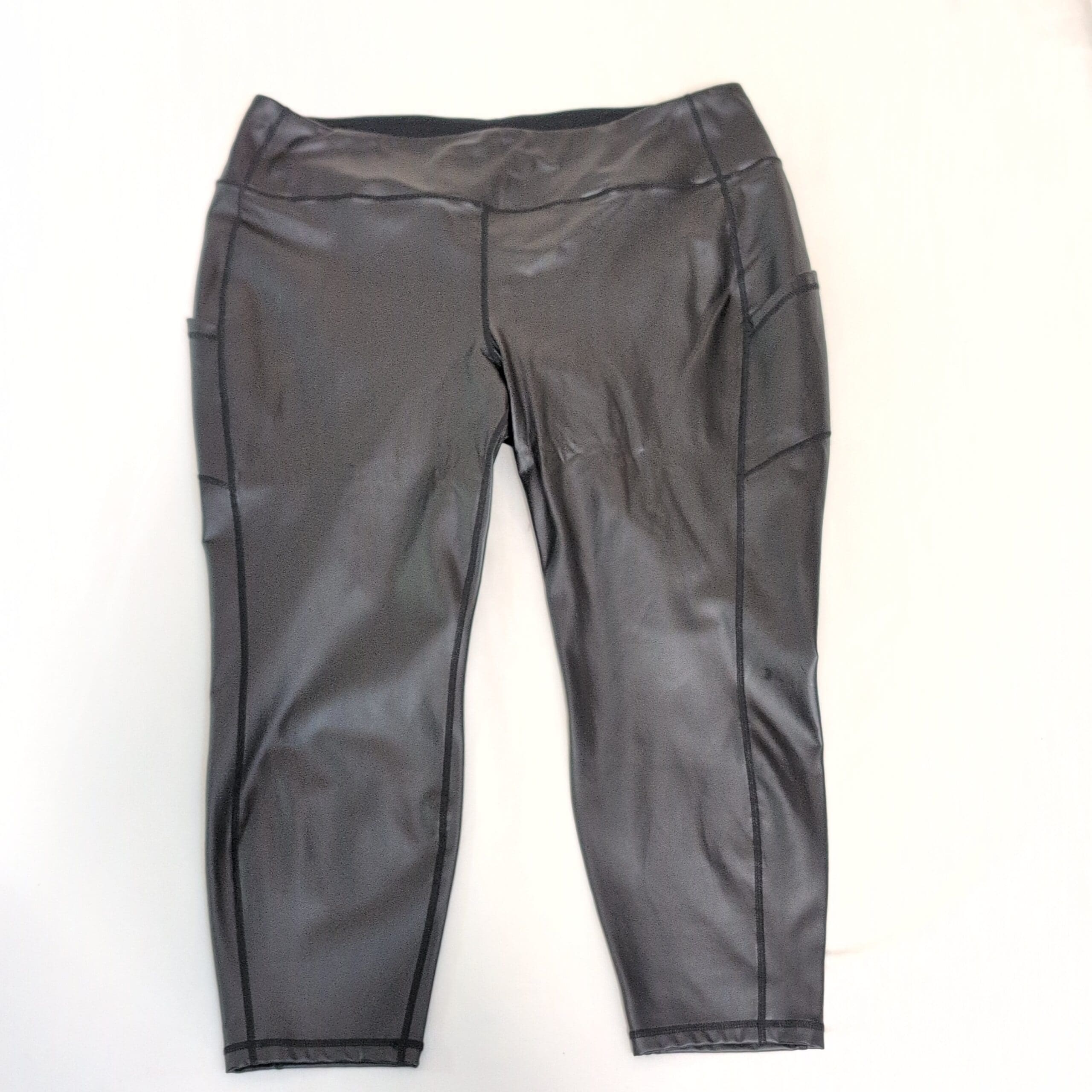 Black faux leather leggings by Torrid in size 4X. Smooth faux-leather exterior with stitched panel seams and a wide elastic waistband for comfortable wear. Features visible side panel pockets and tapered ankle cuffs—great for dressing up or pairing with a casual tee. Gently used and free of major rips, tears, or stains; normal light wear consistent with prior use. See photos for condition and details.