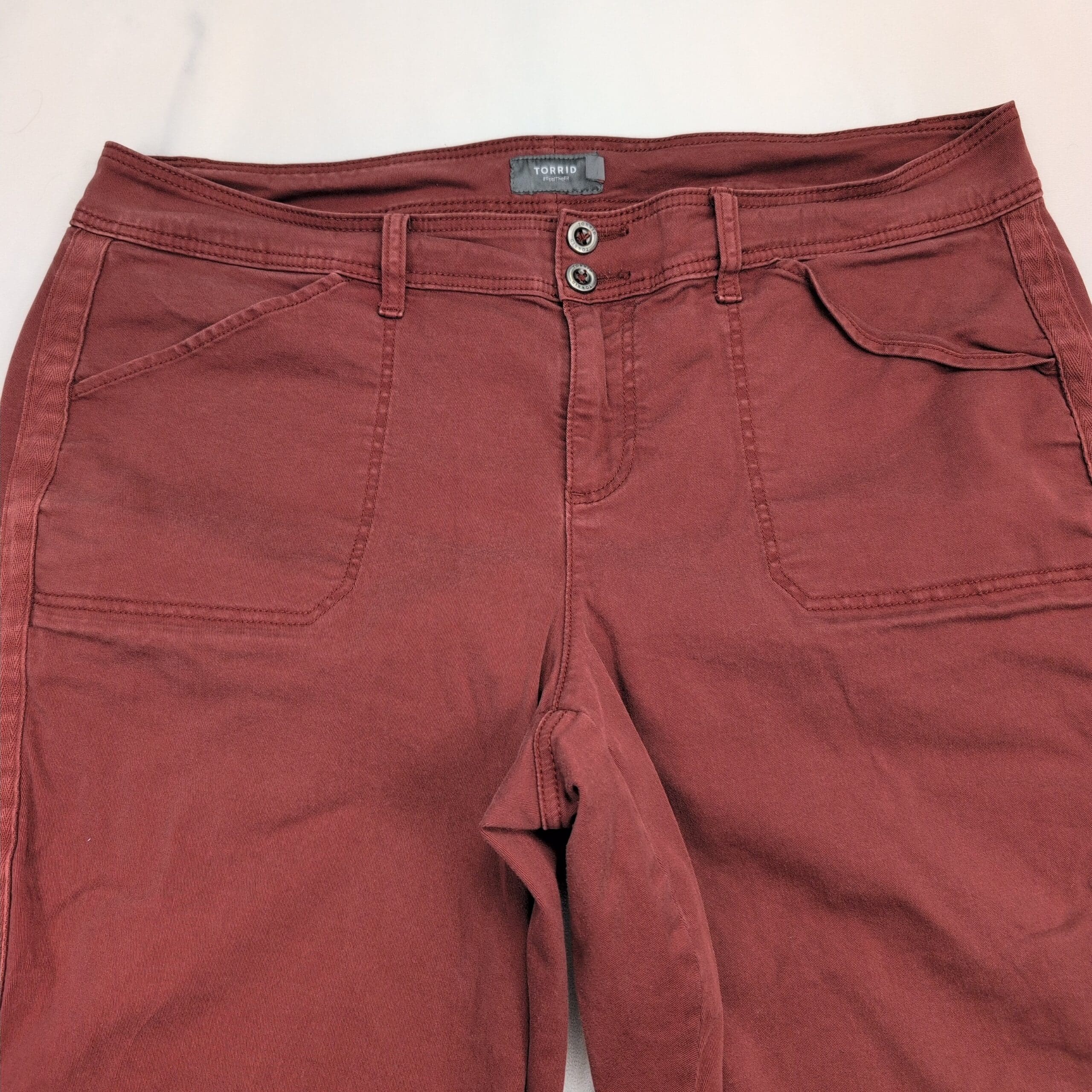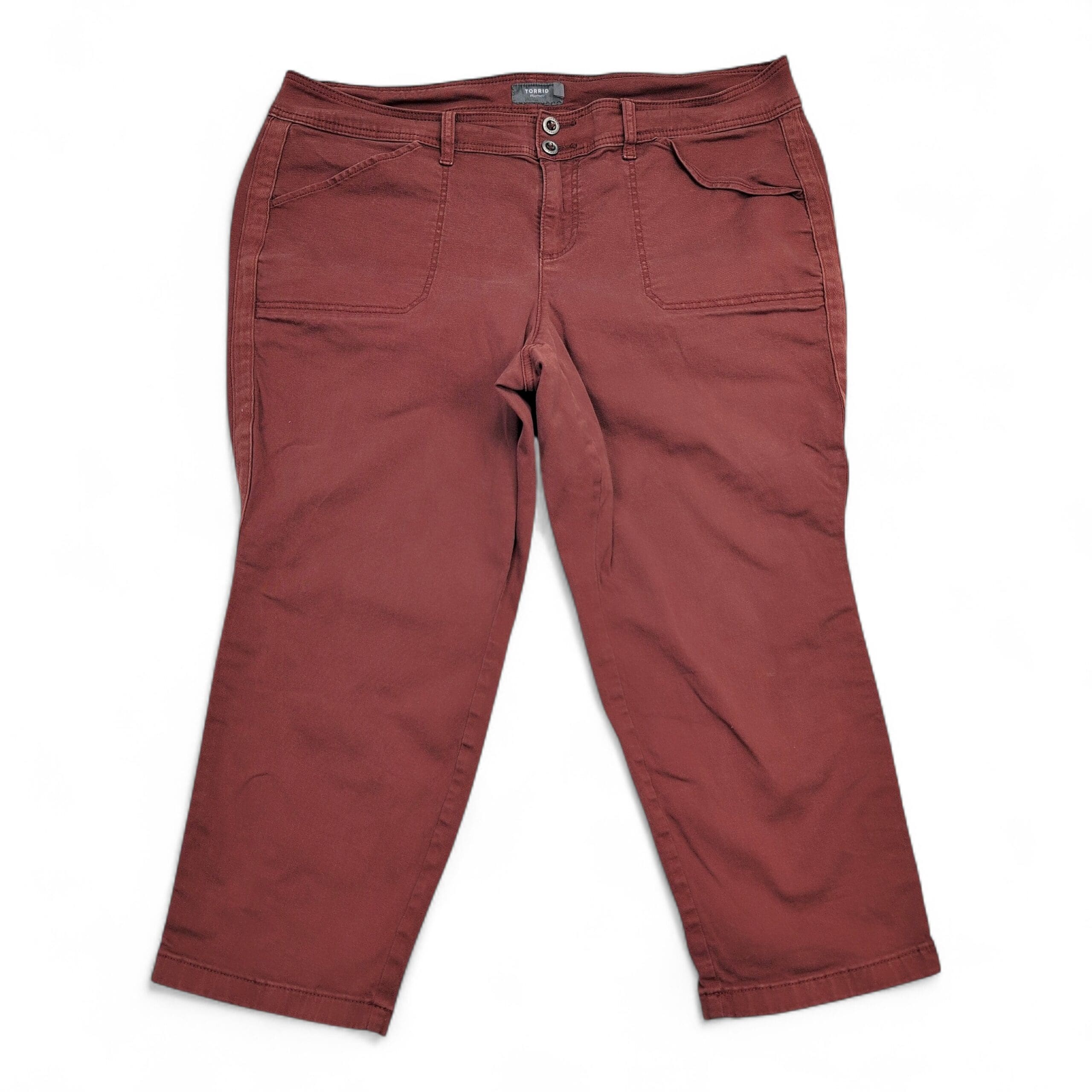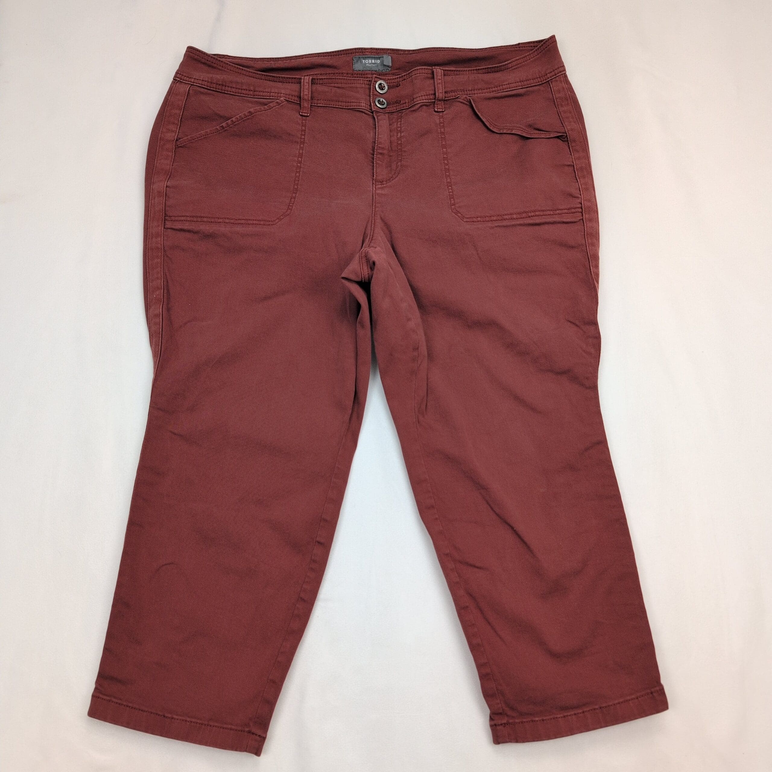 Excellent used Torrid women’s jeans in size 22 (plus). Rust/maroon cropped straight-leg style with double-button waist and zip fly. Features large front patch pockets and a clean, casual silhouette—great for everyday wear. Condition: excellent used condition with no rips, tears, or odors; there are some faint surface marks that should come out with a wash. No measurements provided—please message if you need specific dimensions.