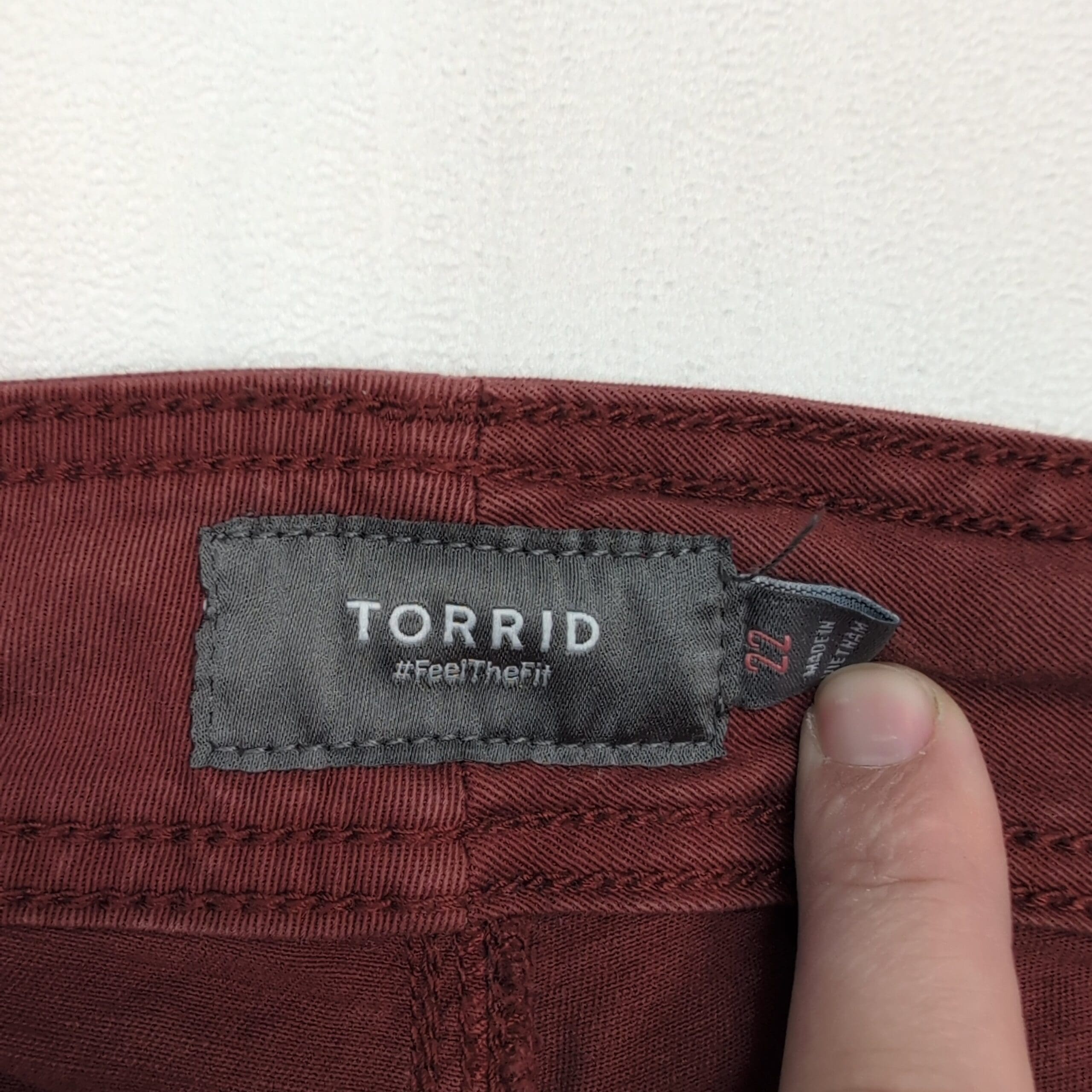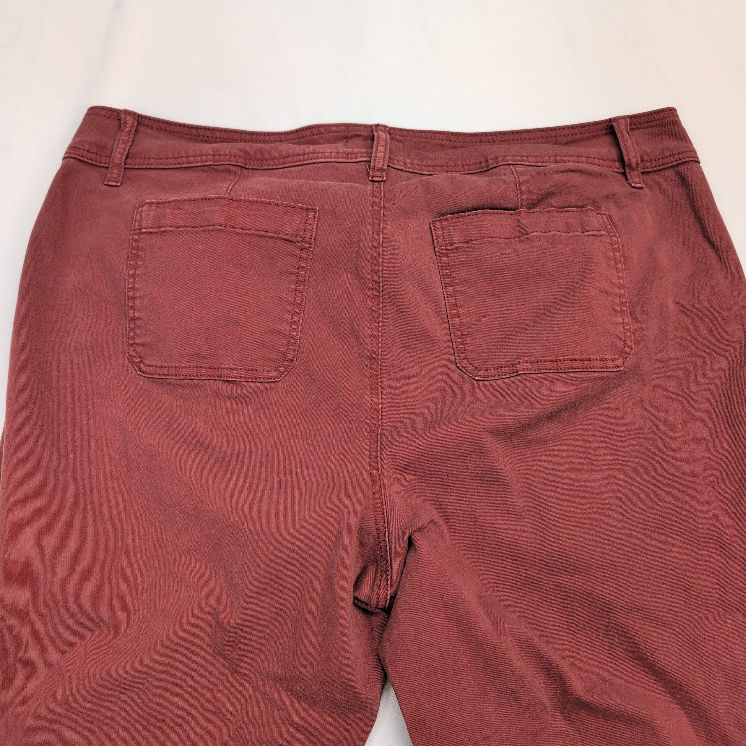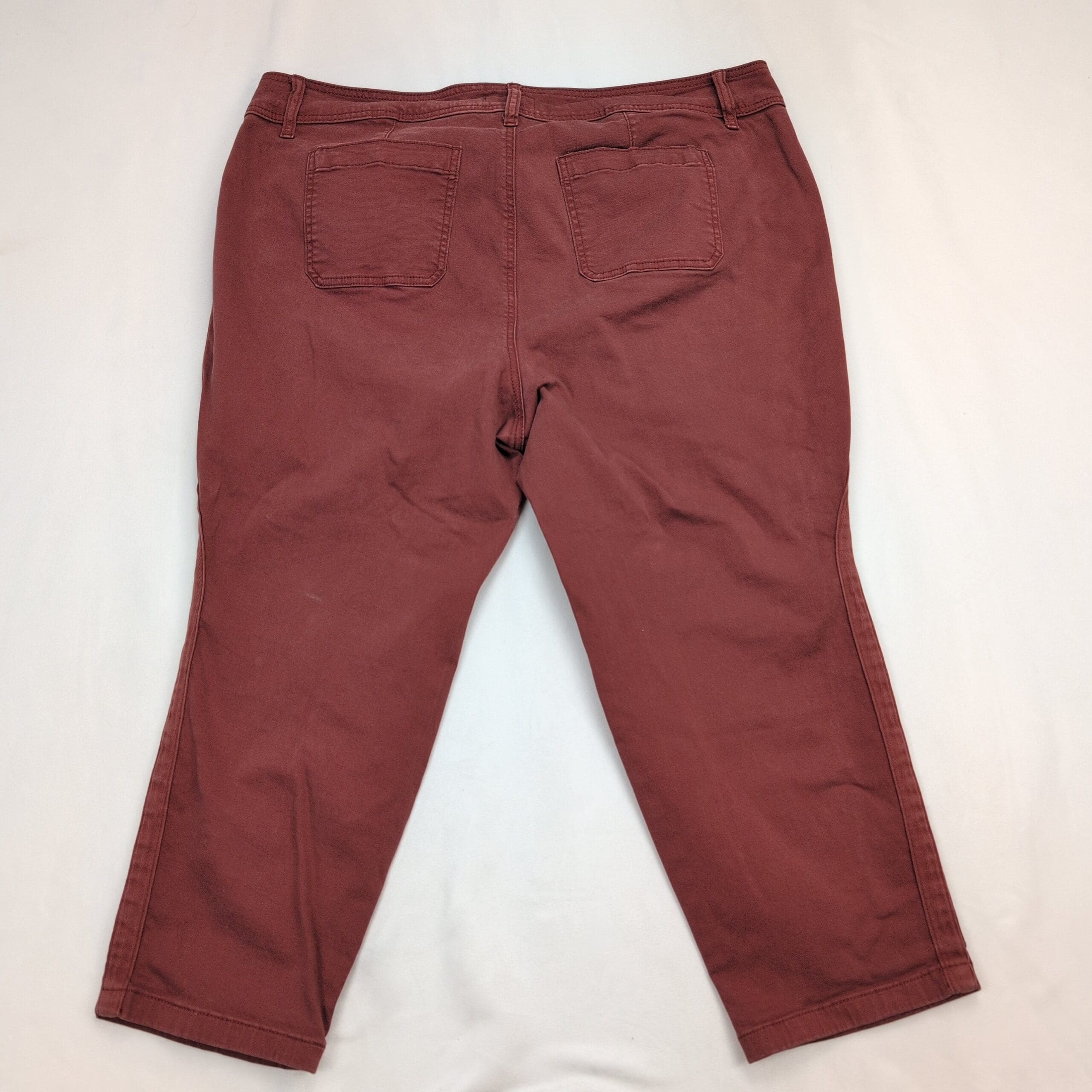 Excellent used Torrid women’s jeans in size 22 (plus). Rust/maroon cropped straight-leg style with double-button waist and zip fly. Features large front patch pockets and a clean, casual silhouette—great for everyday wear. Condition: excellent used condition with no rips, tears, or odors; there are some faint surface marks that should come out with a wash. No measurements provided—please message if you need specific dimensions.