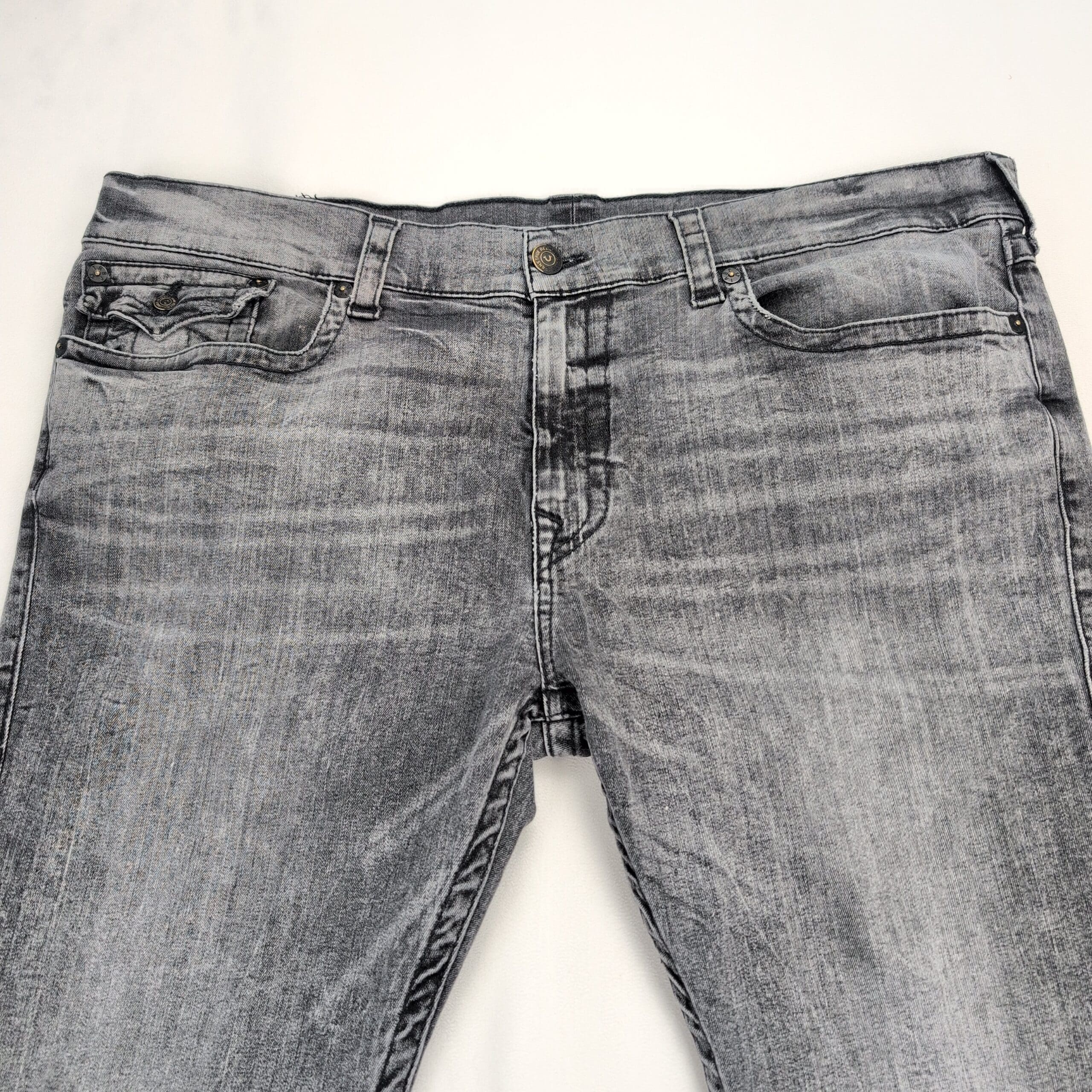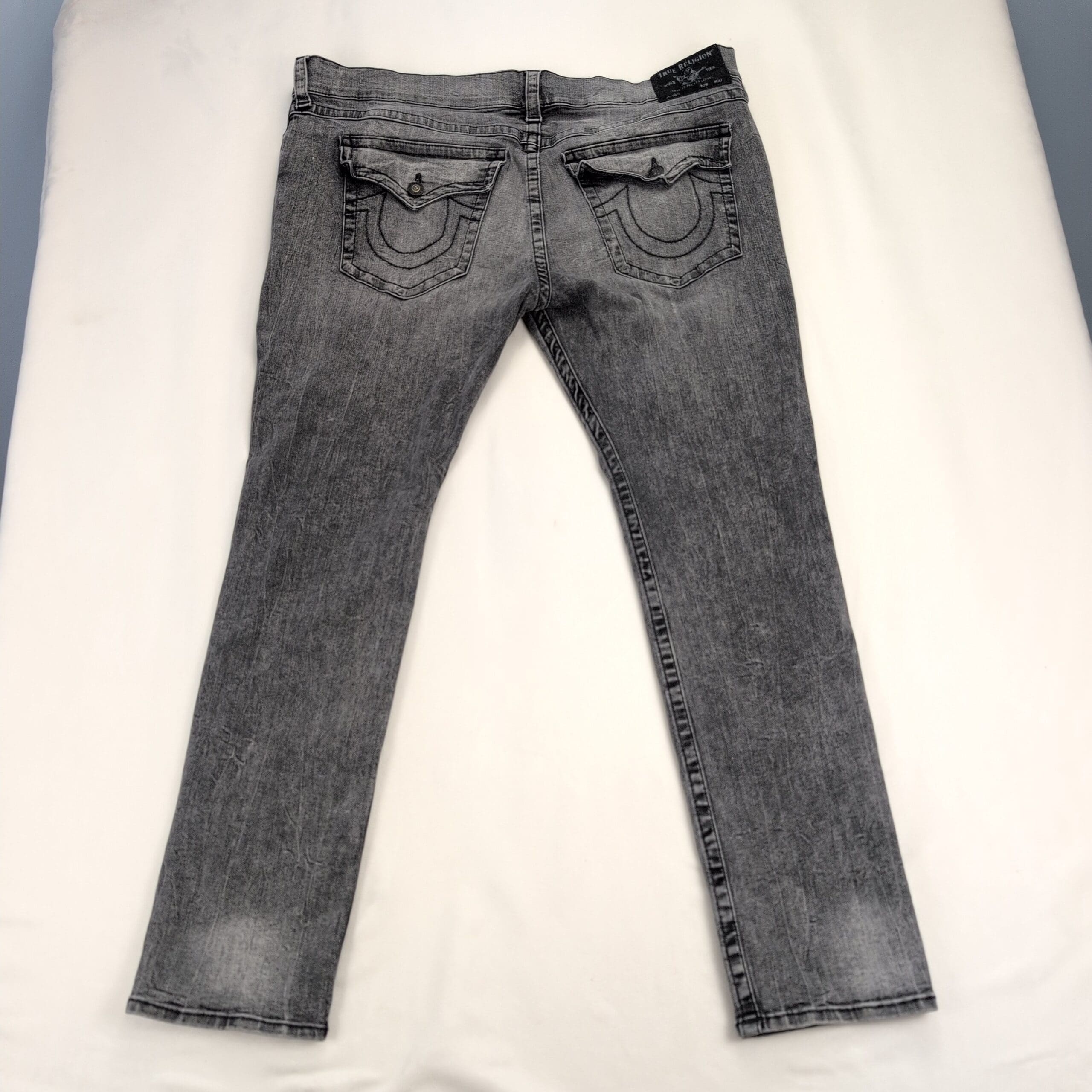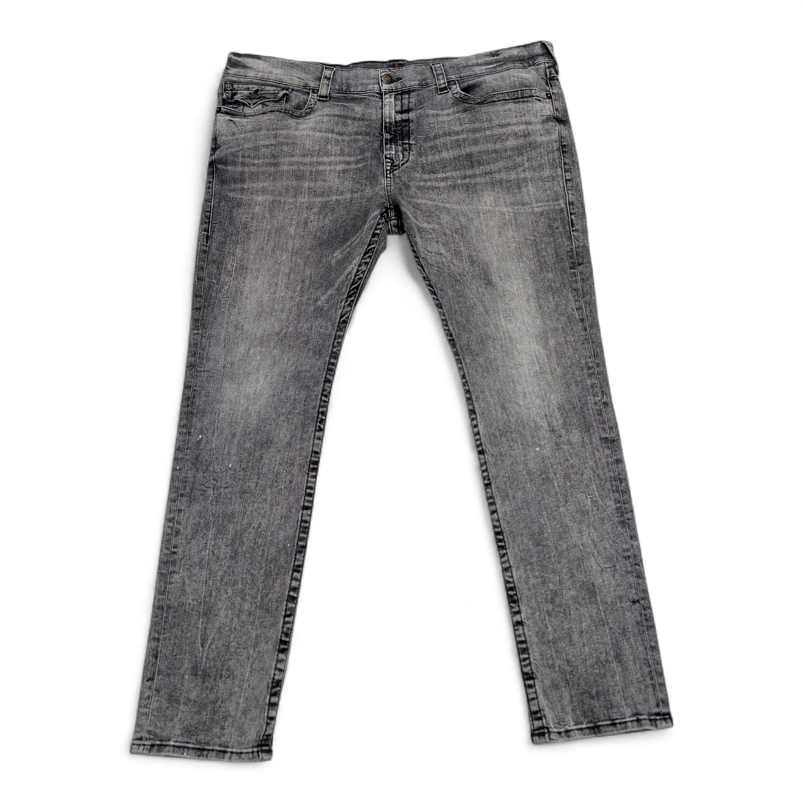 True Religion Rocco Relaxed Skinny jeans in women’s 3X (plus). Gray/acid wash denim with a relaxed-skinny silhouette — fitted through the leg with a slightly relaxed top block for comfortable wear. Classic five-pocket styling and True Religion character in the wash. Excellent used condition with light, typical wear; no major rips, stains, or odors.