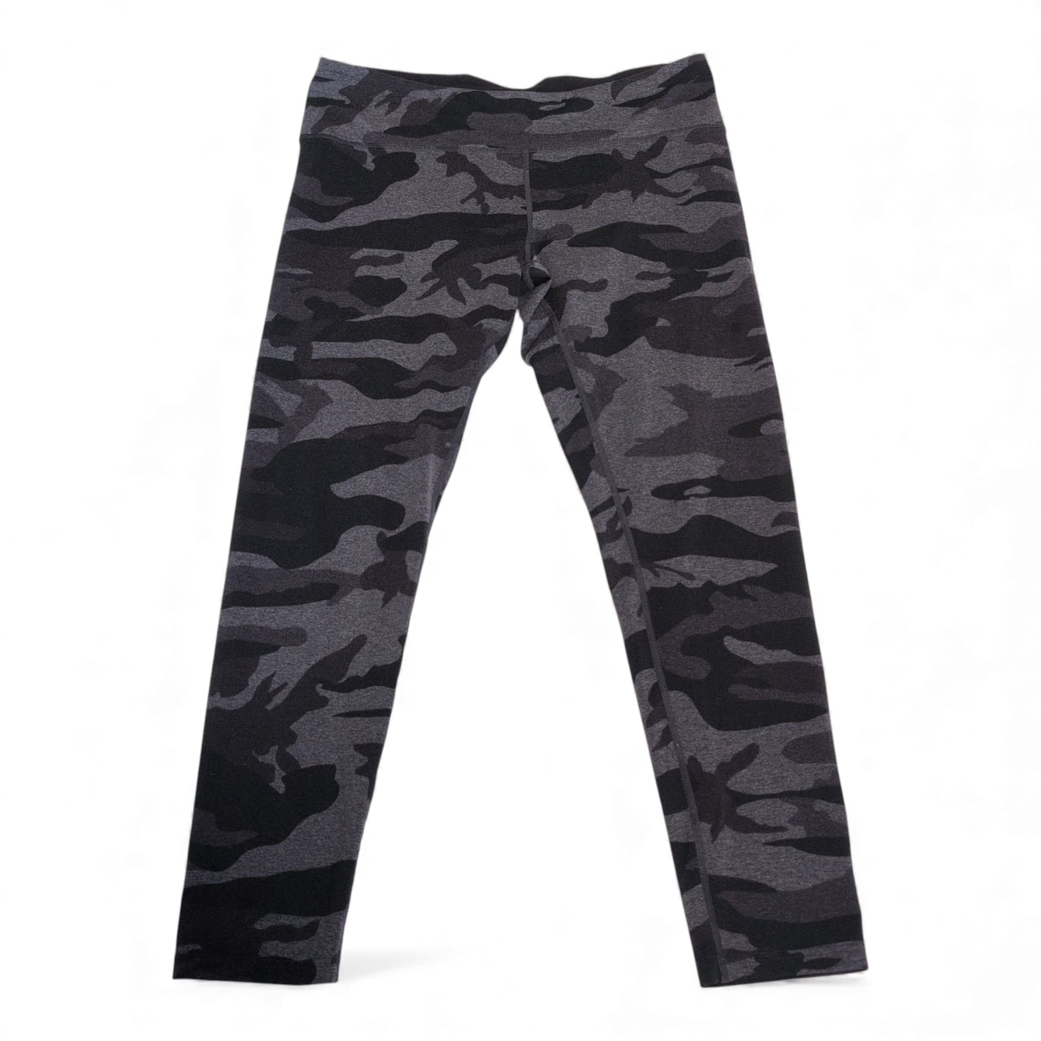 Tuff Athletics women’s full-length leggings in a black and charcoal camo print. Size XL (standard). Stretchy, smooth fabric with a wide comfortable waistband and a slim, streamlined silhouette—ideal for workouts, yoga, or everyday wear. No visible pockets; full inseam length shown in photos.
