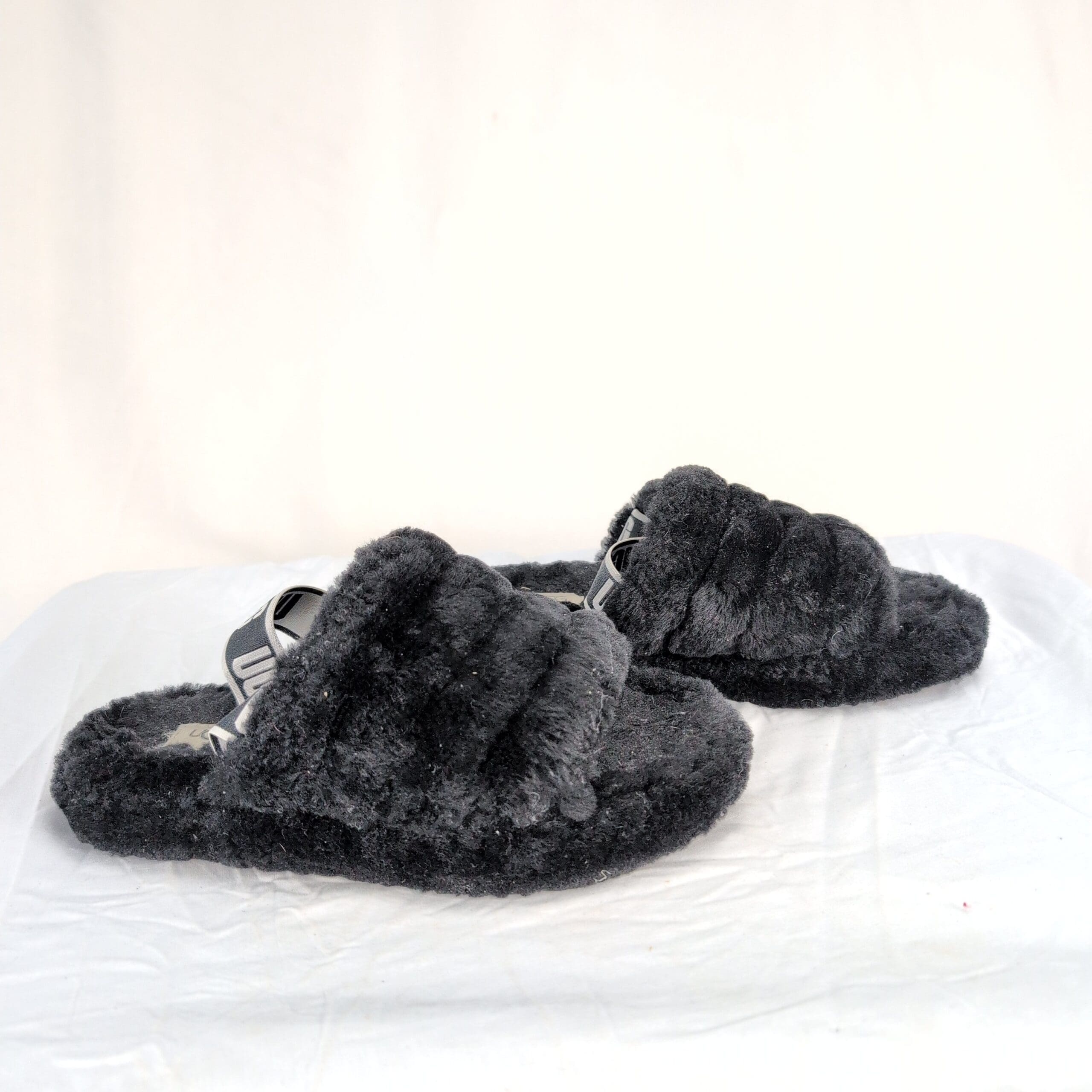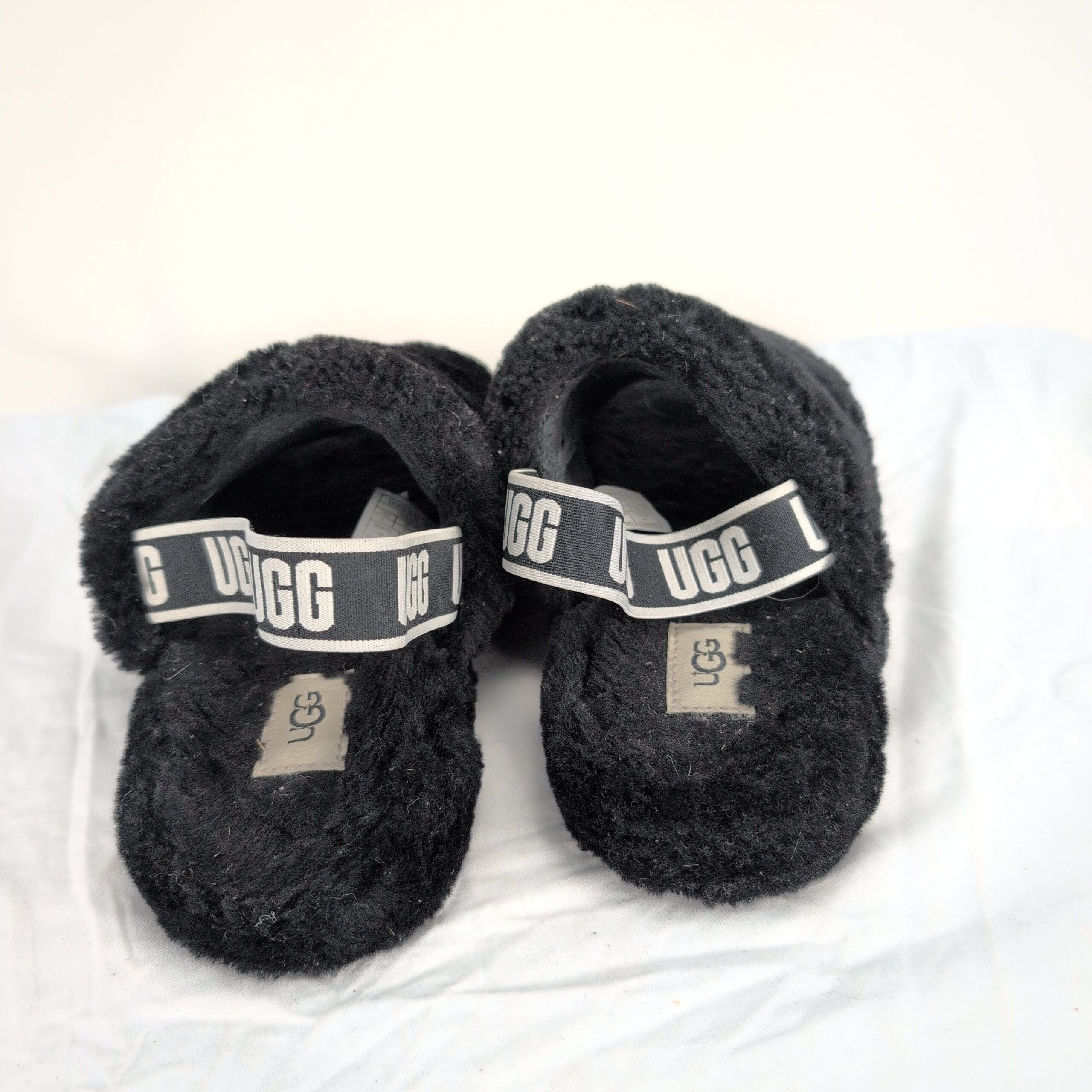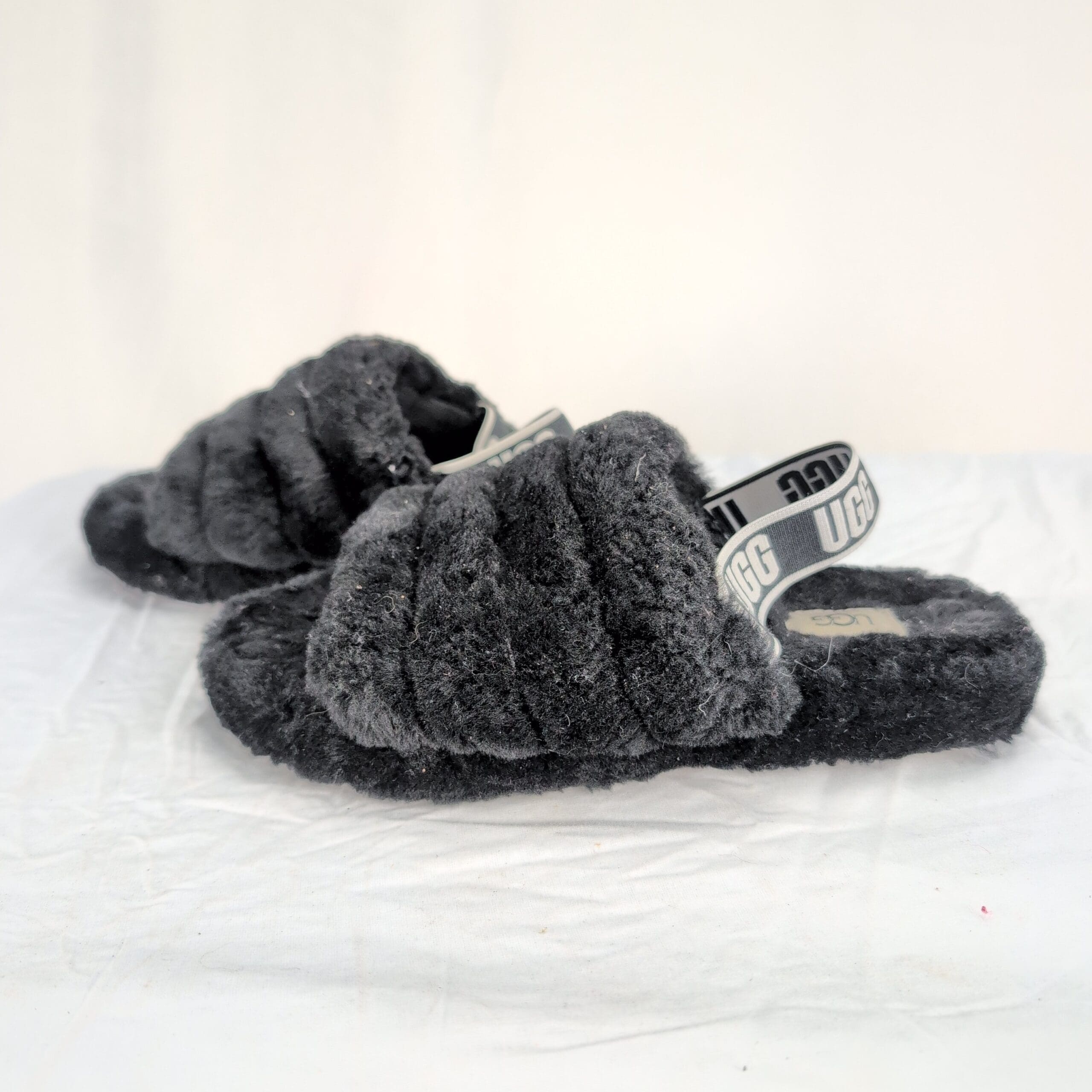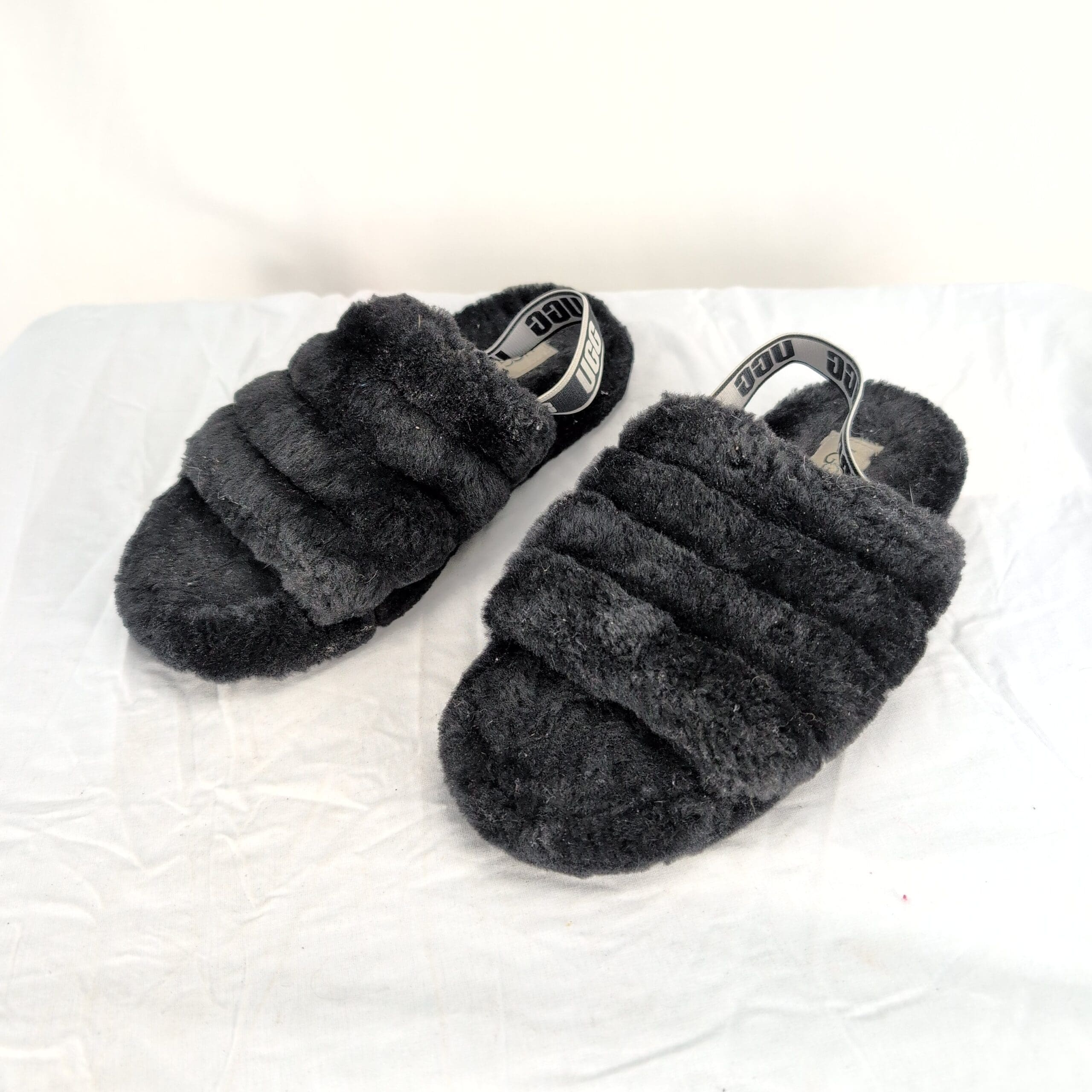 Black UGG kids fluffy slide slippers in size 4 (Big Girl). Plush, cushioned open-toe design with branded elastic UGG heel strap for easy on/off. Excellent used condition — free of major rips, tears, stains, or flaws. Light surface wear and minor piling/lint on the fur from normal use; soles show light wear consistent with gentle use. Cozy, stylish pick for indoor/outdoor wear.