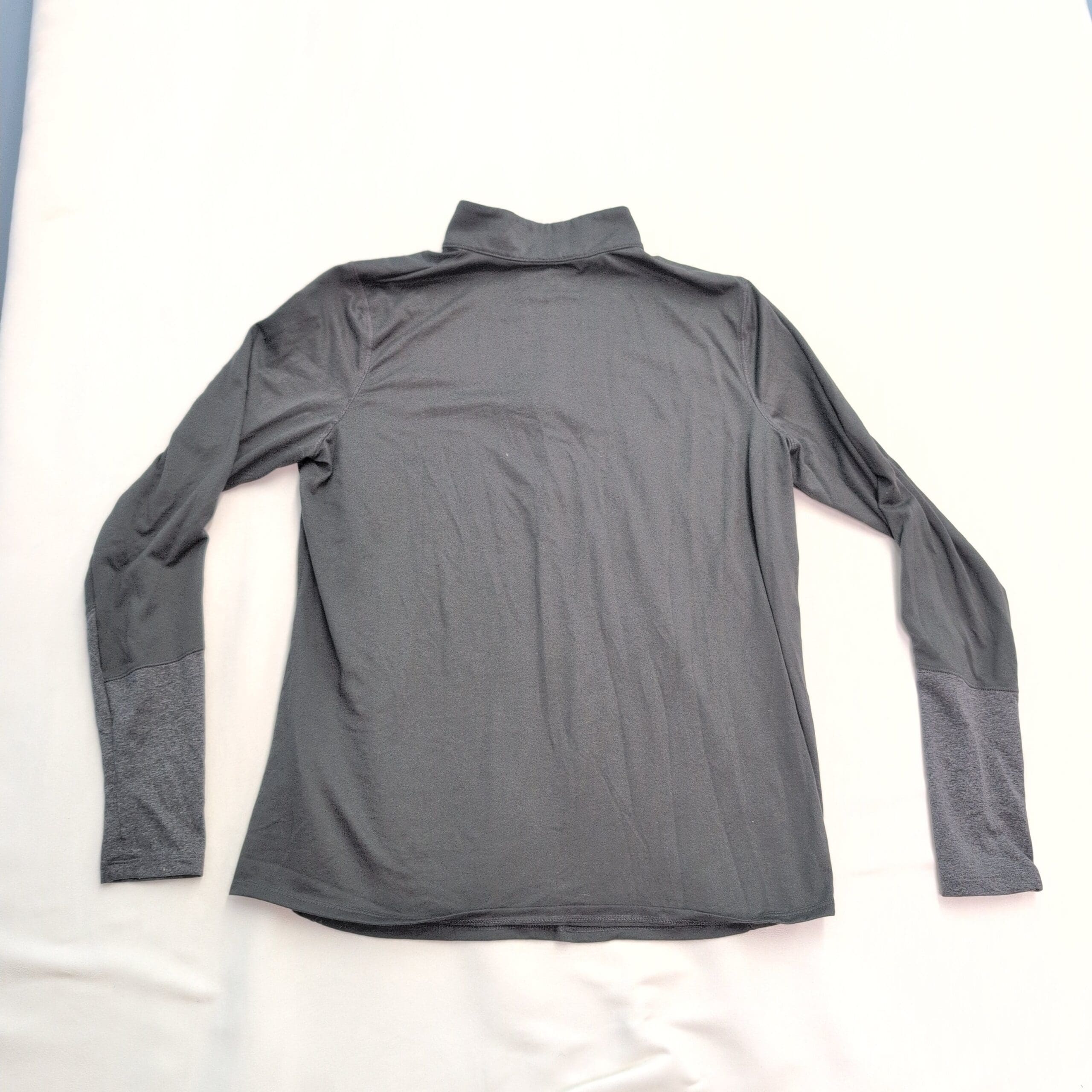 Under Armour women’s 1/4 zip long sleeve performance top in a muted gray-green (size XL). Features a stand collar with a quarter zipper, contrast heathered sleeve panels, and the Under Armour chest logo — great for workouts, layering, or casual wear. Lightweight, stretchy feel and athletic cut for comfortable movement. Condition: Gently used — free of major rips, tears, stains, or flaws; typical wear may be present.
