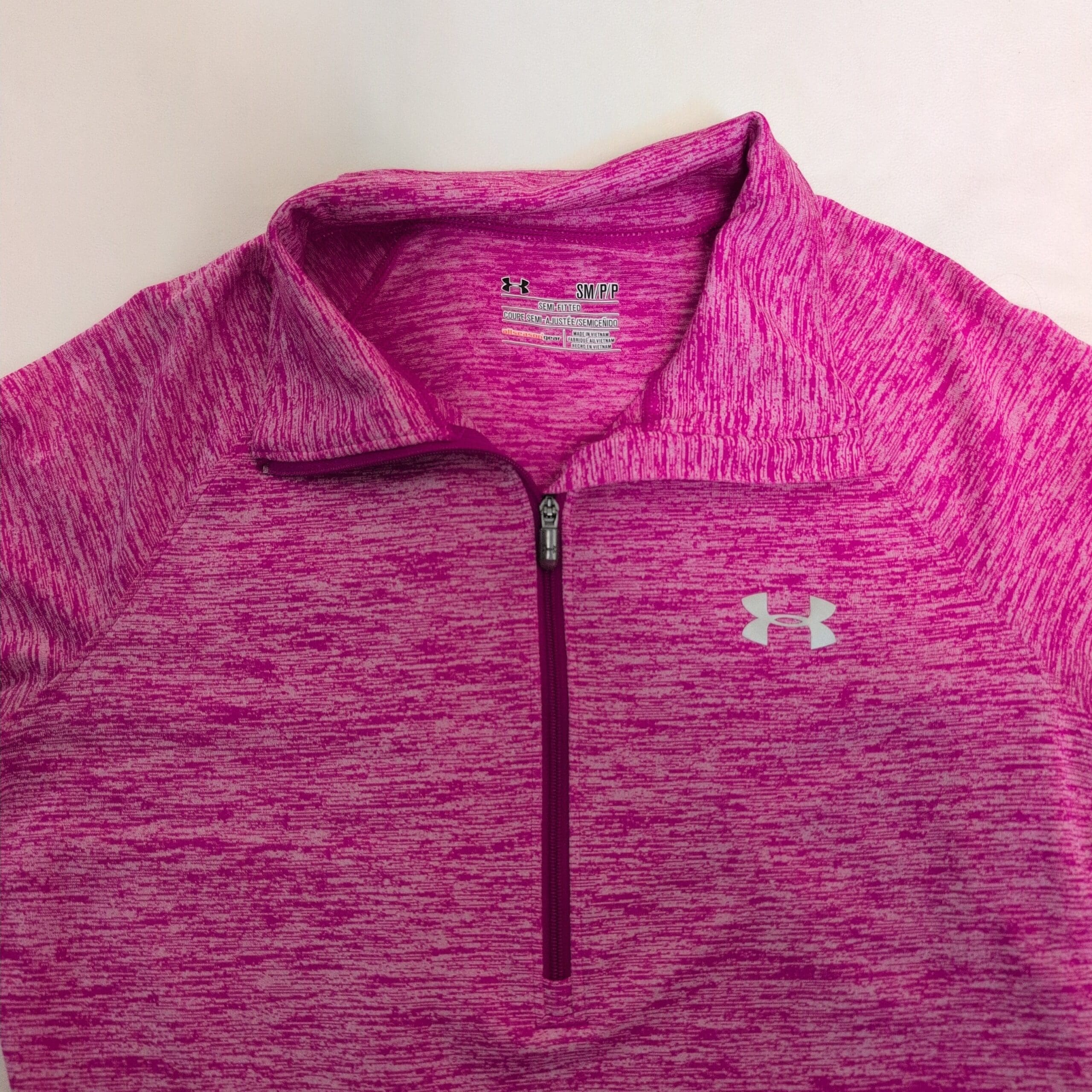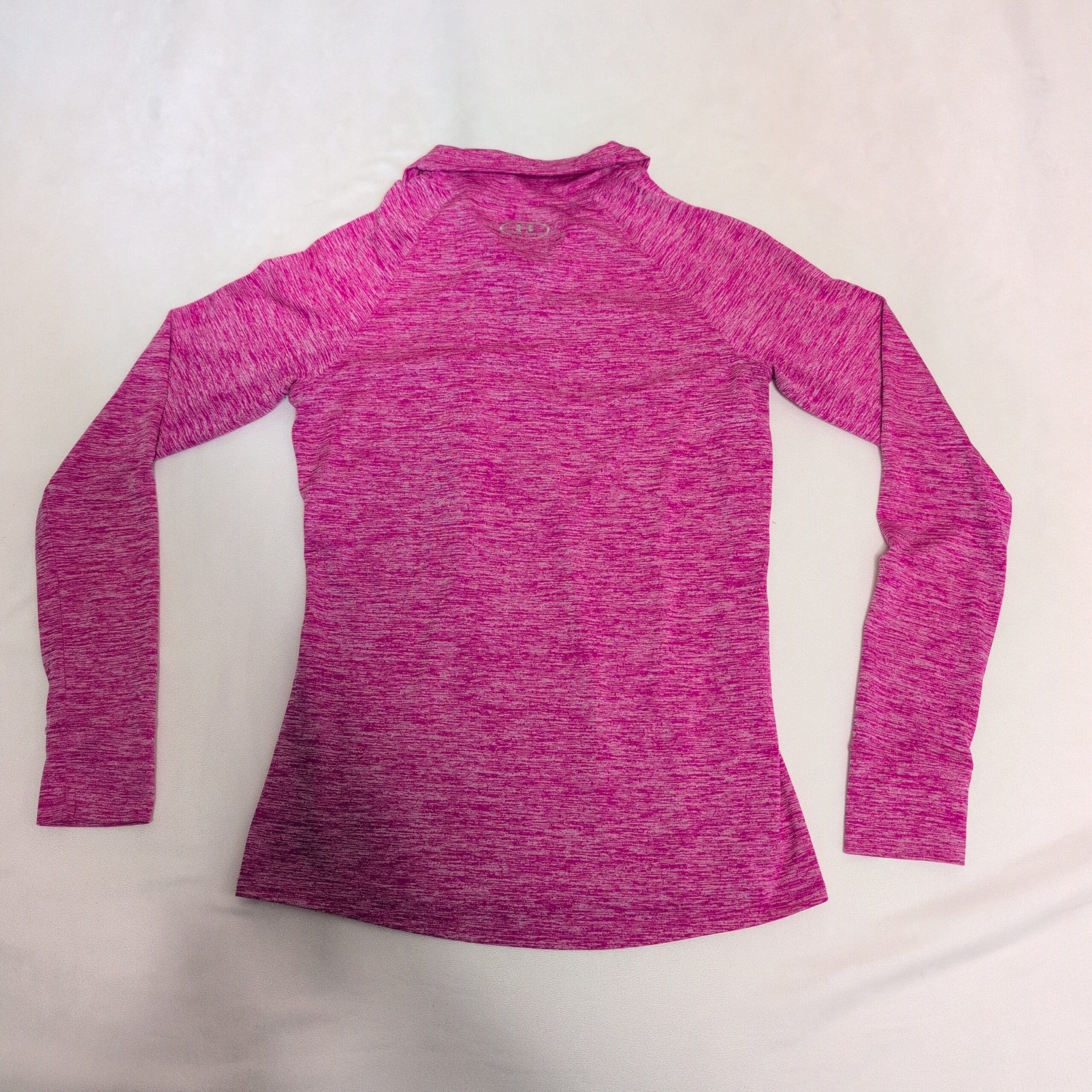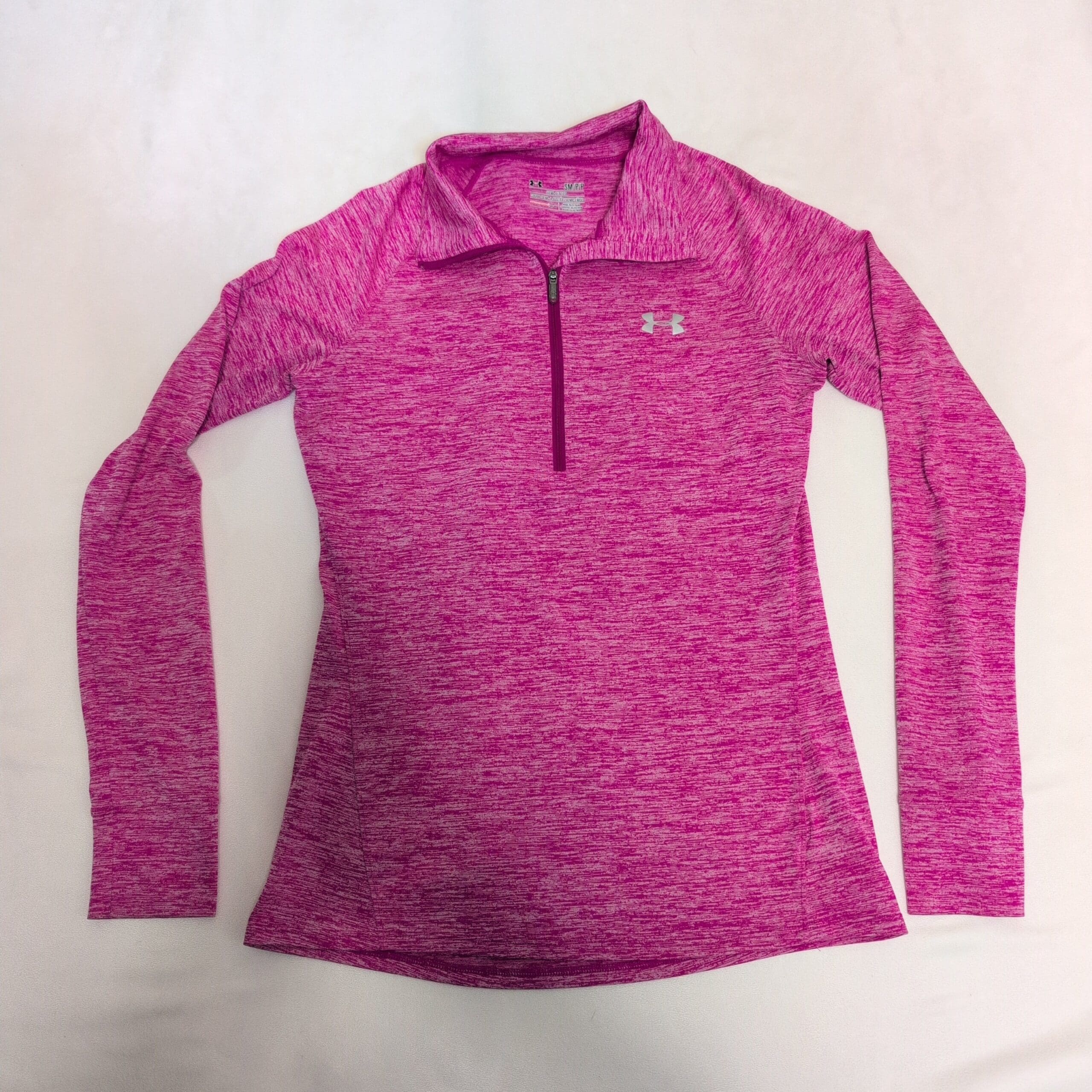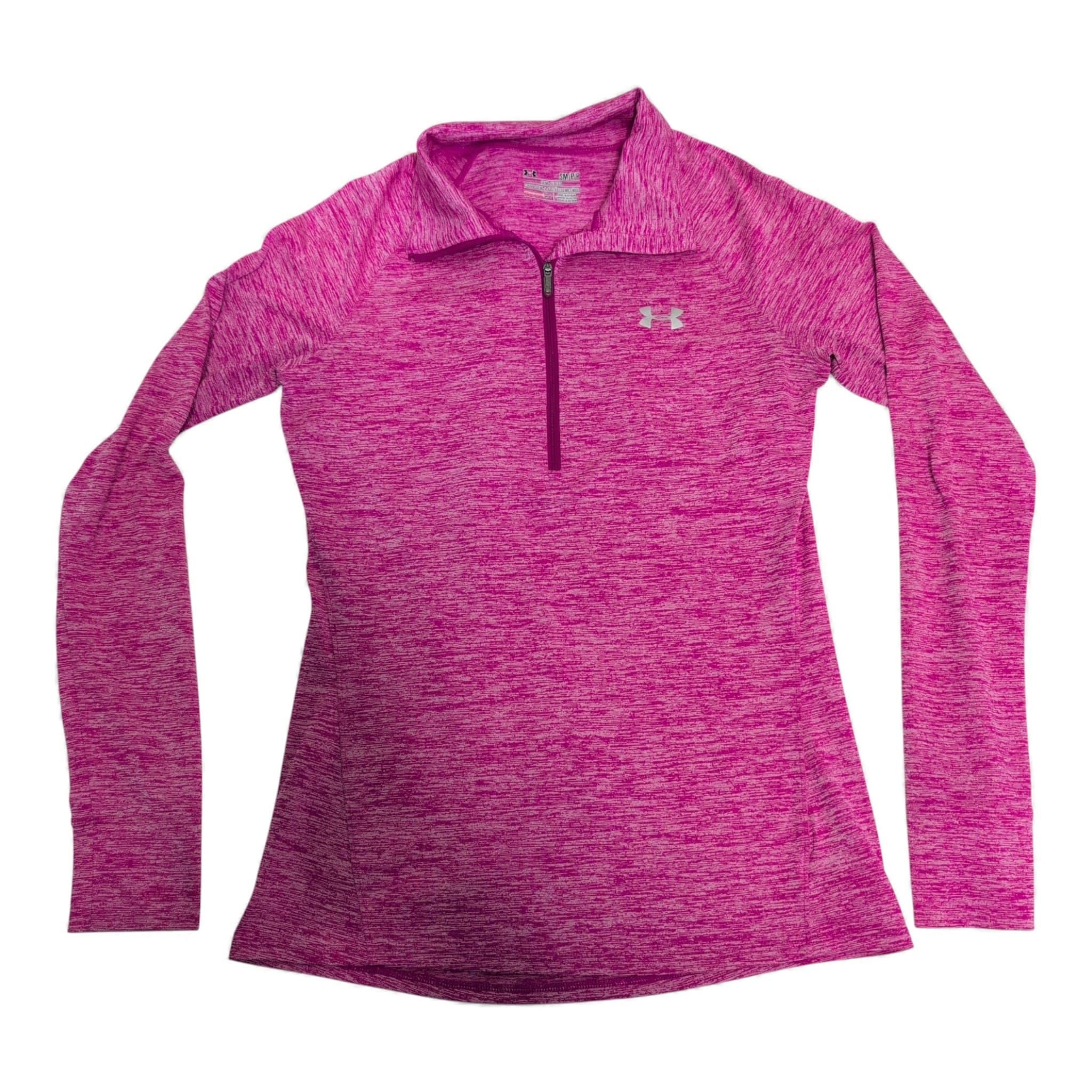 Under Armour women’s pink 1/4-zip performance pullover in size S. Lightweight, breathable fabric with a heathered knit appearance, featuring a stand collar with smooth quarter zipper, long sleeves, and a reflective UA logo at the chest. Slim athletic silhouette ideal for running, gym workouts, warm-ups, or everyday athleisure.