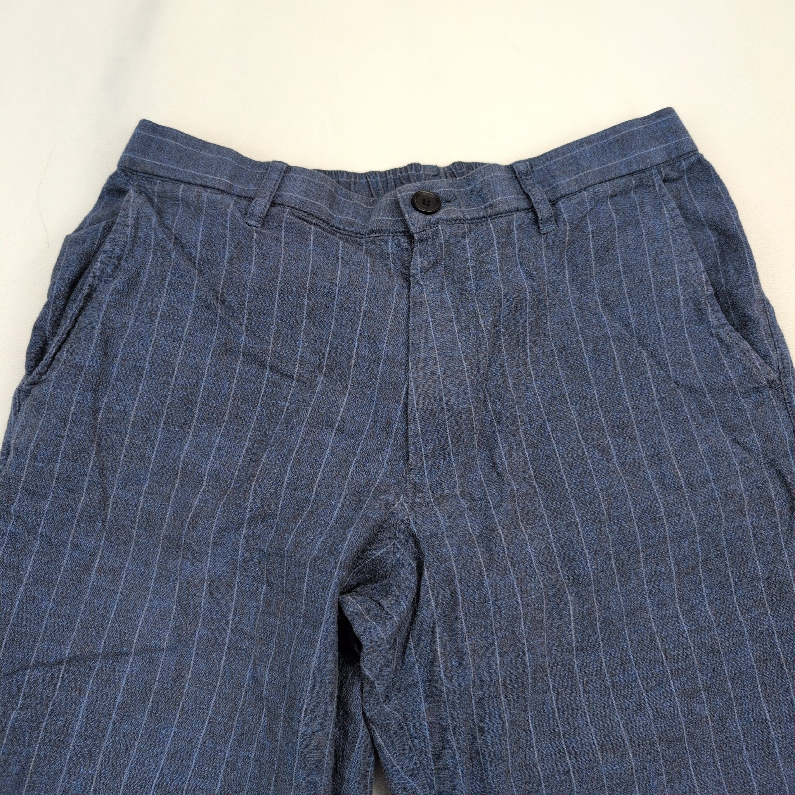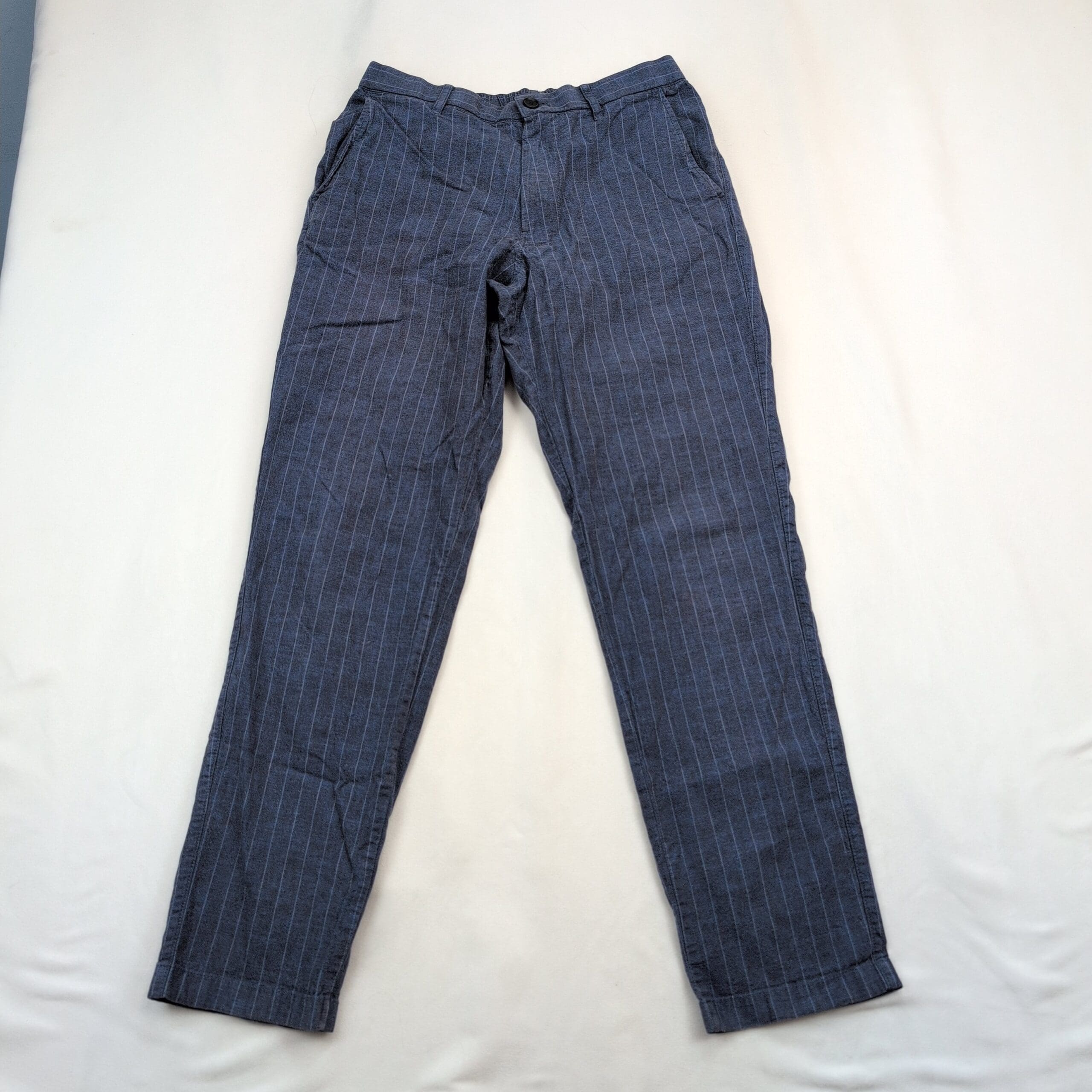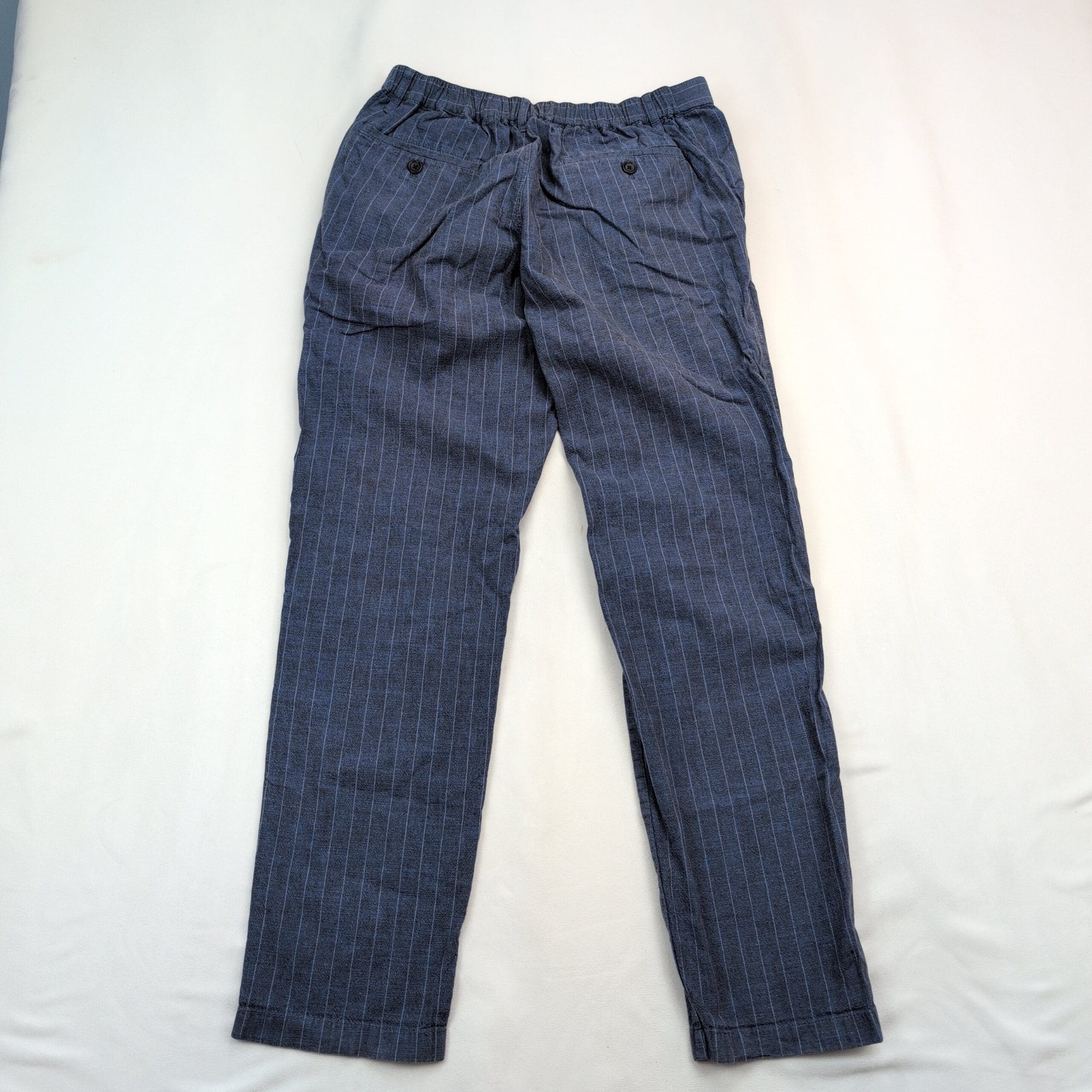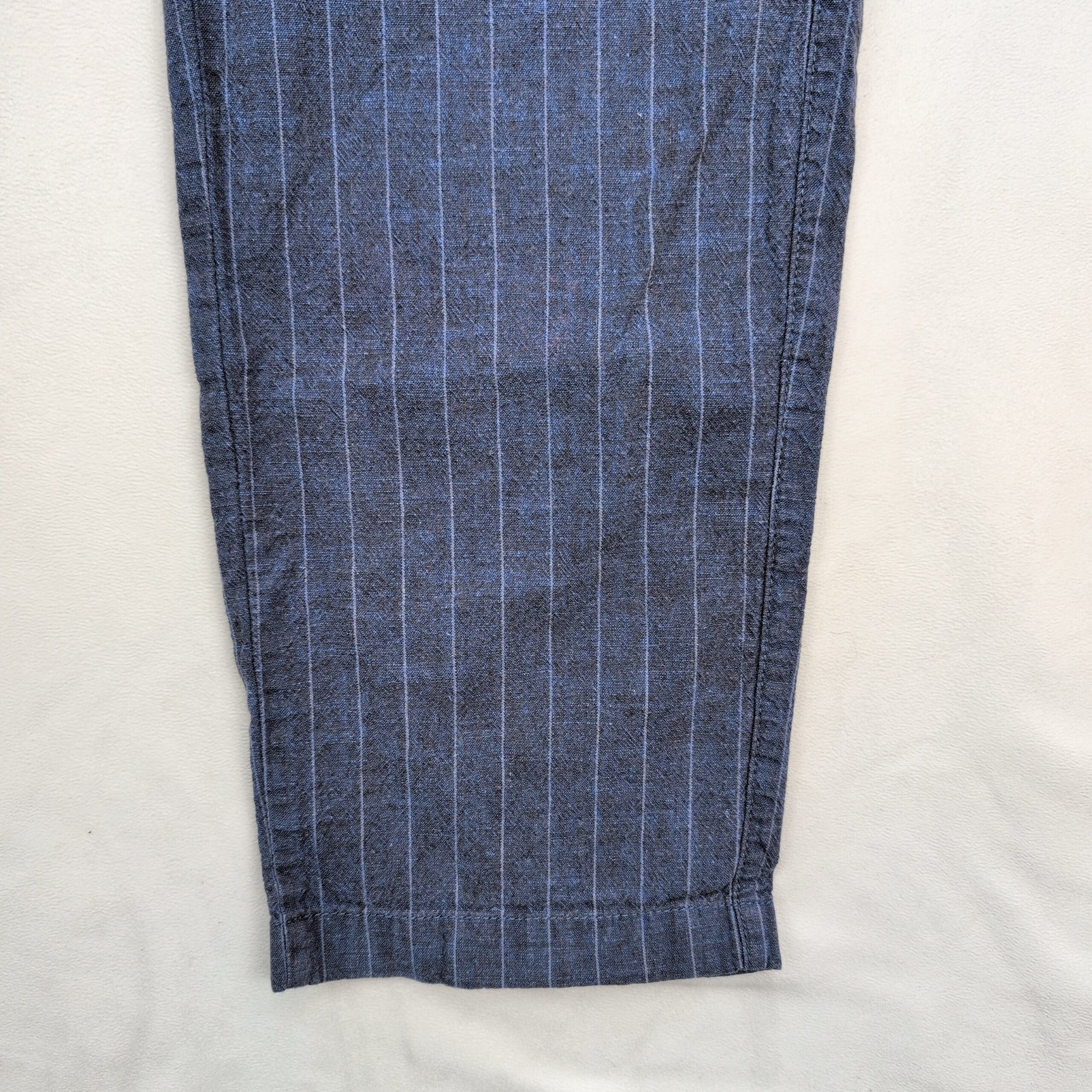 Uniqlo women’s pinstripe tapered pants in size S. Lightweight textured navy fabric with thin vertical white pinstripes — a versatile style that works for casual or office outfits. Features a flat front, zip fly with button closure, slanted front pockets, and a tapered leg for a streamlined silhouette. Condition: Excellent used condition — free of major rips, tears, or stains; may show typical light wear and storage wrinkles. No measurements provided; message with any measurement requests.