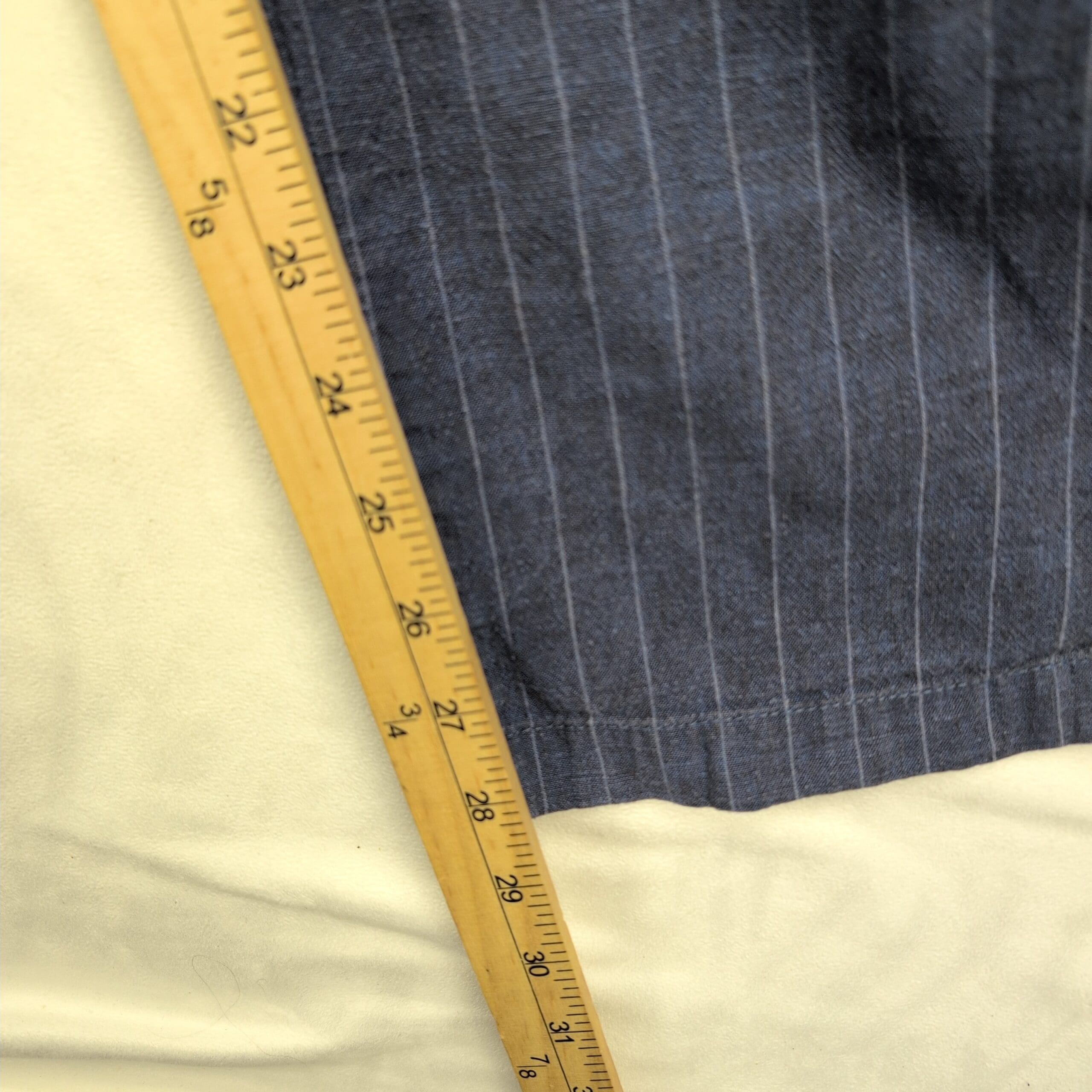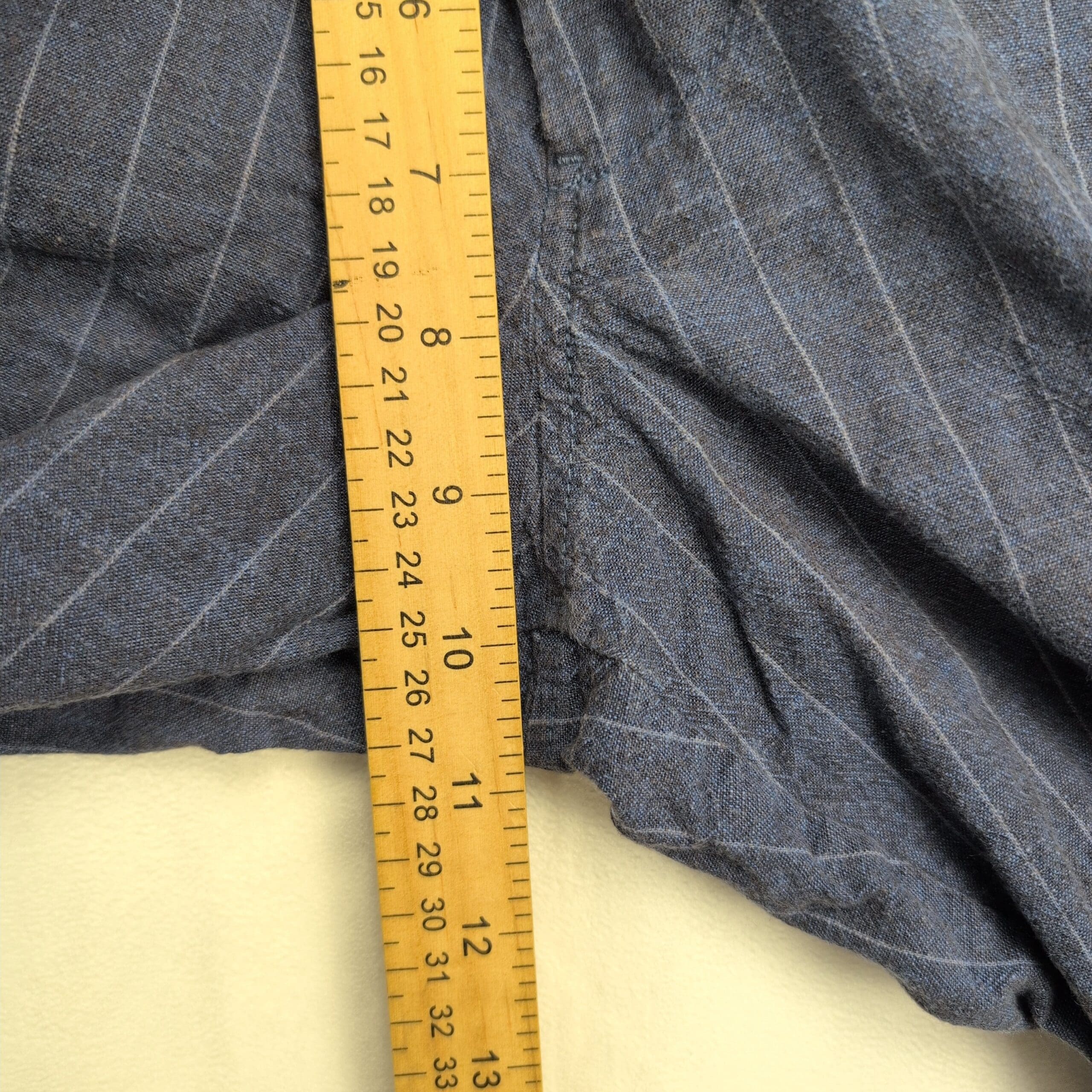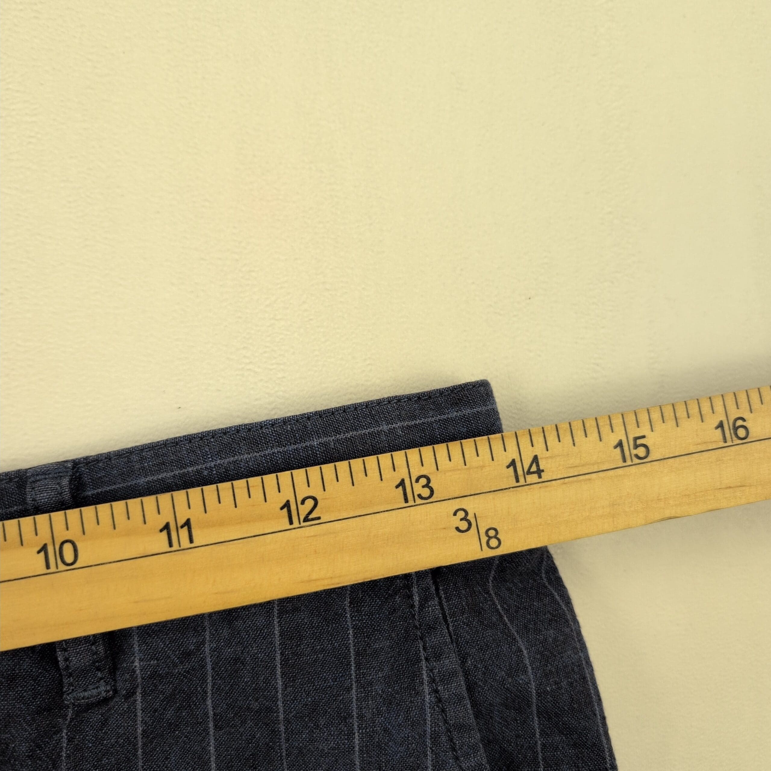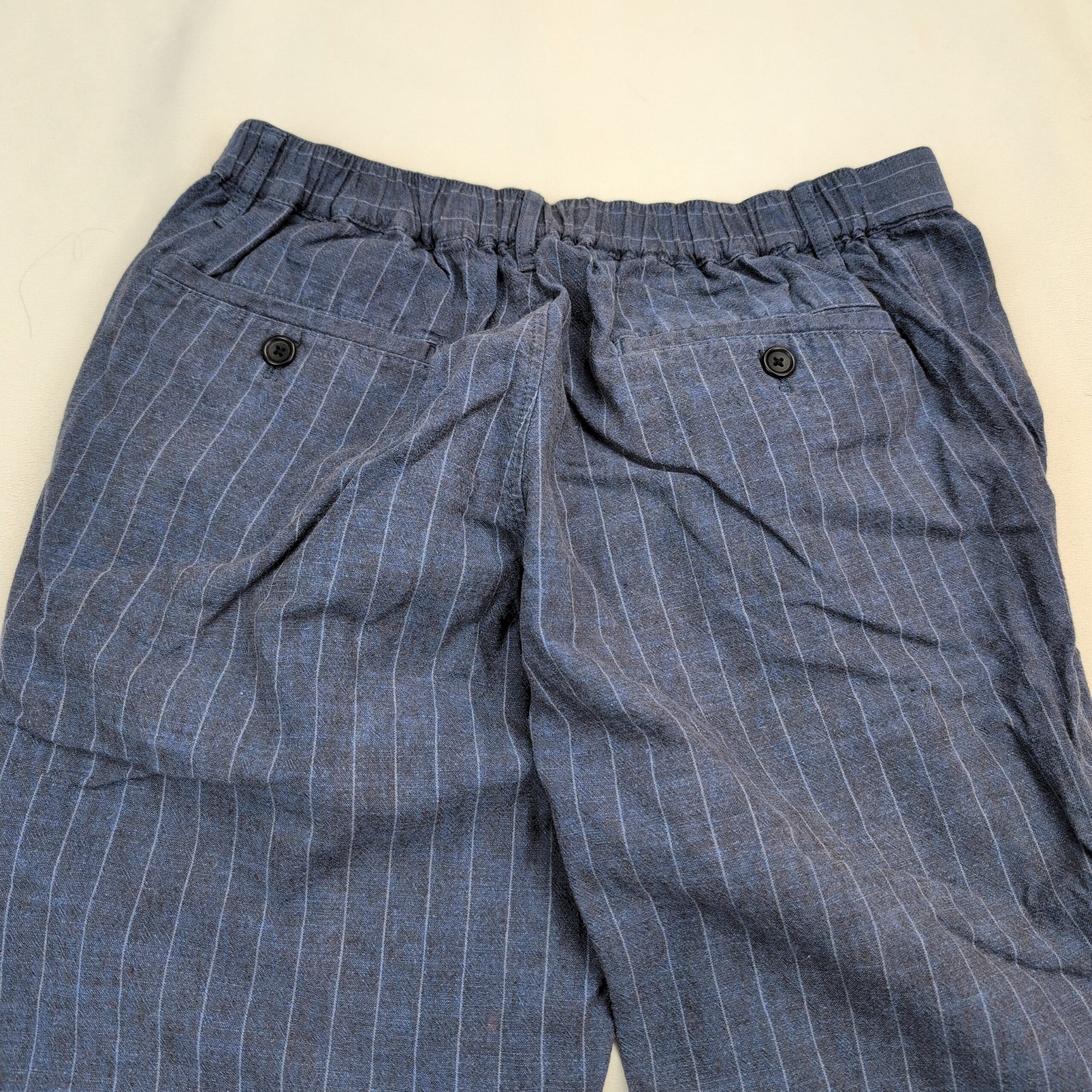 Uniqlo women’s pinstripe tapered pants in size S. Lightweight textured navy fabric with thin vertical white pinstripes — a versatile style that works for casual or office outfits. Features a flat front, zip fly with button closure, slanted front pockets, and a tapered leg for a streamlined silhouette. Condition: Excellent used condition — free of major rips, tears, or stains; may show typical light wear and storage wrinkles. No measurements provided; message with any measurement requests.
