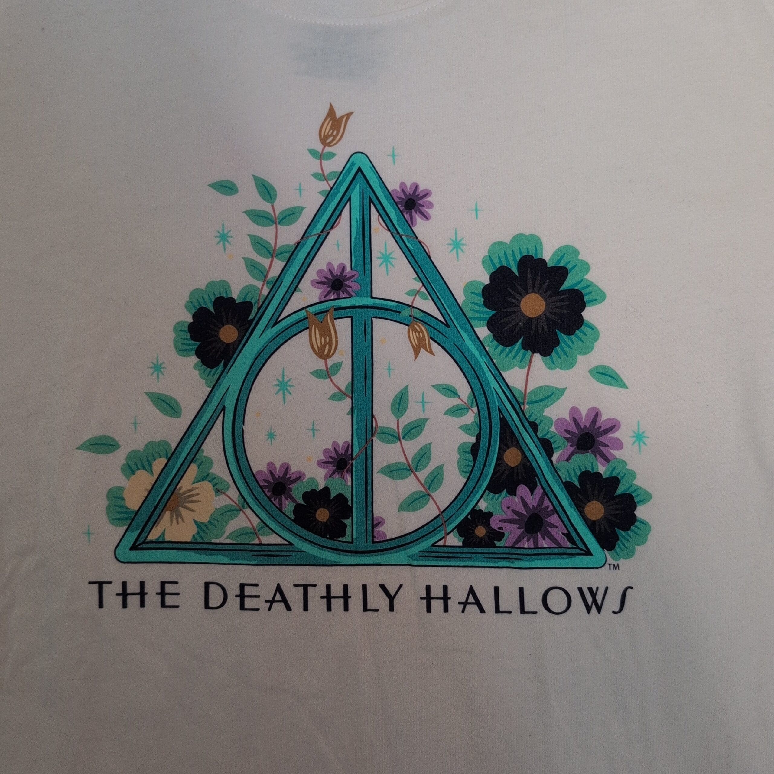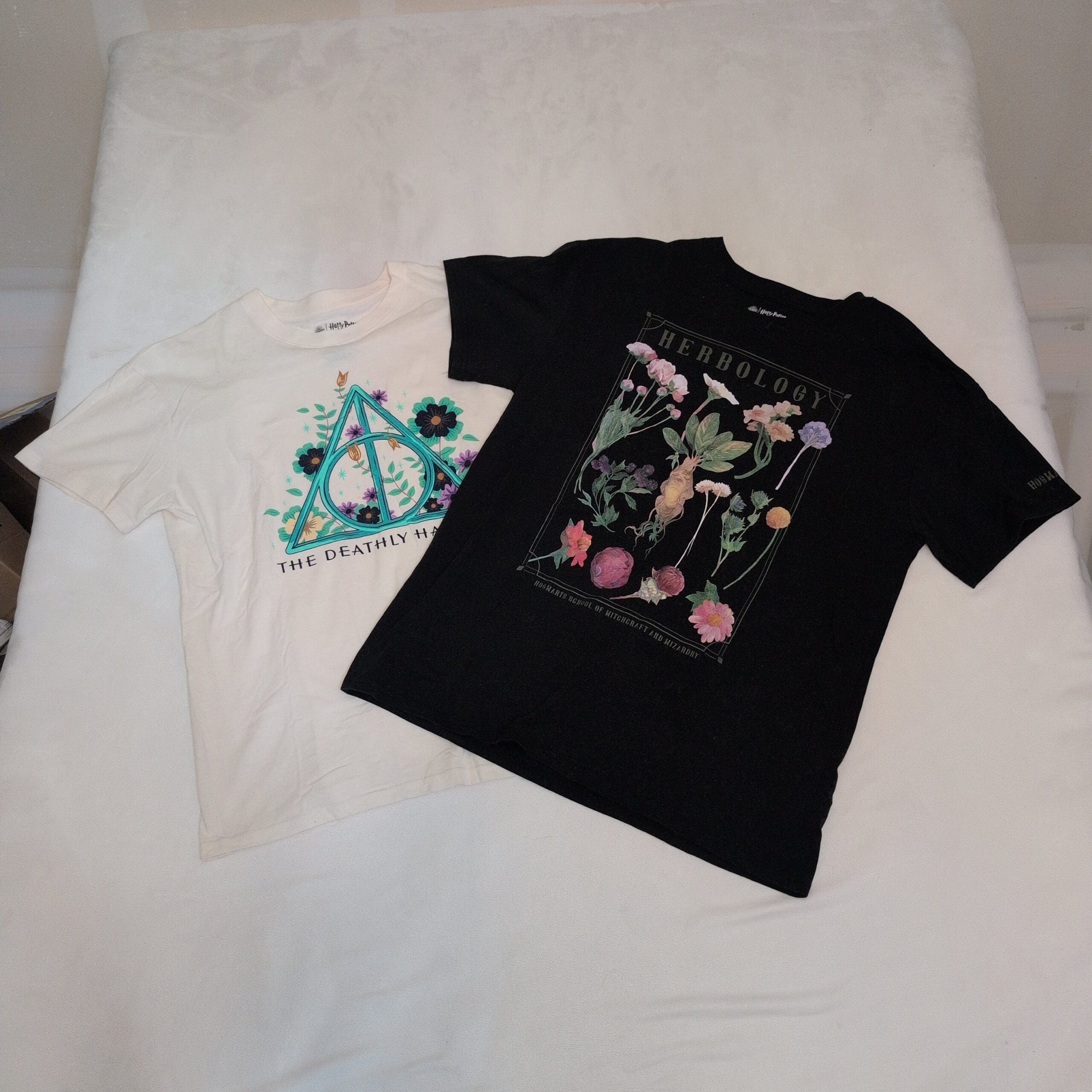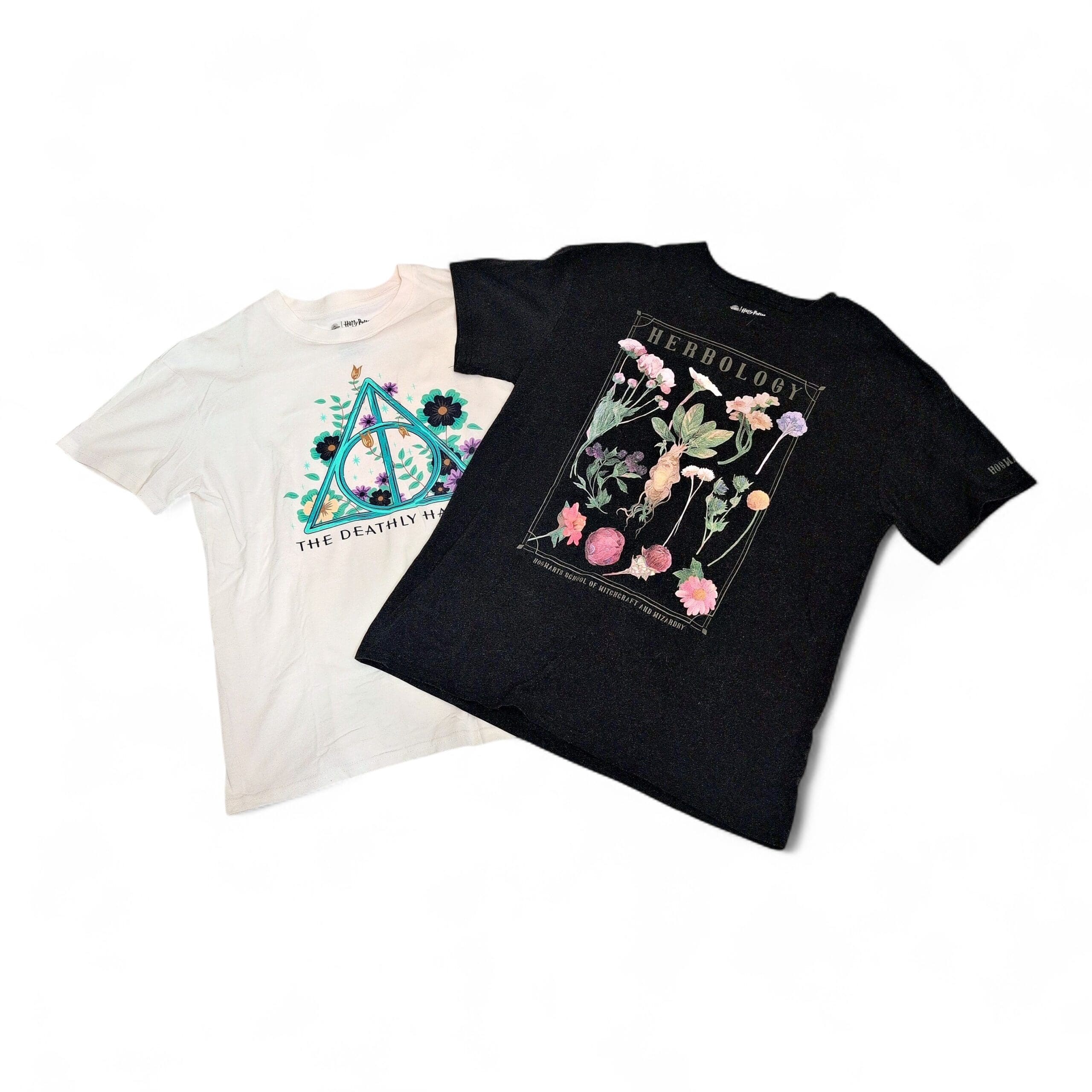 Pair of Universal Studios / Wizarding World women’s graphic tees — size L. Includes a white tee featuring a floral-accented Deathly Hallows symbol and a black tee with a colorful “Herbology” botanical print. Both shirts feature vibrant screen-printed graphics. Two tees sold together as a pair.