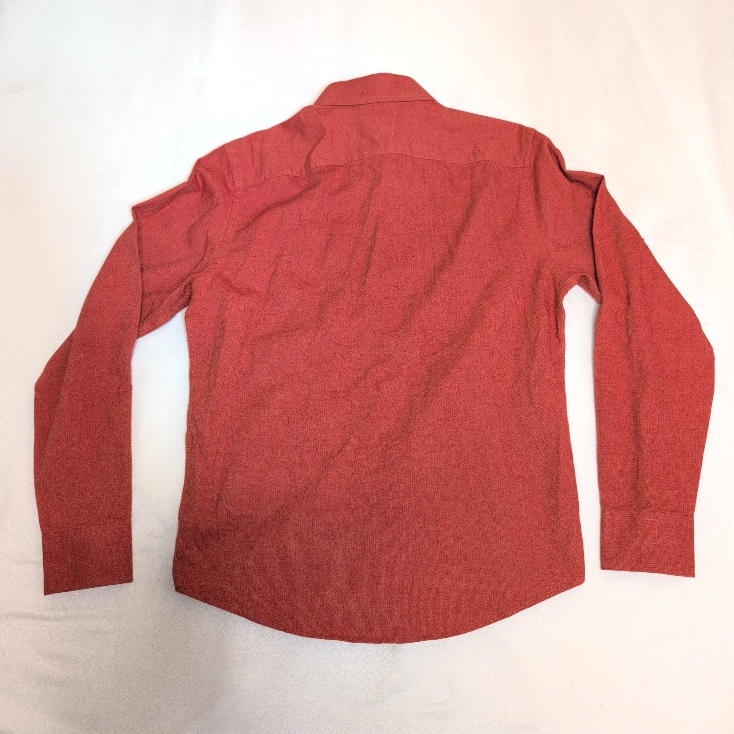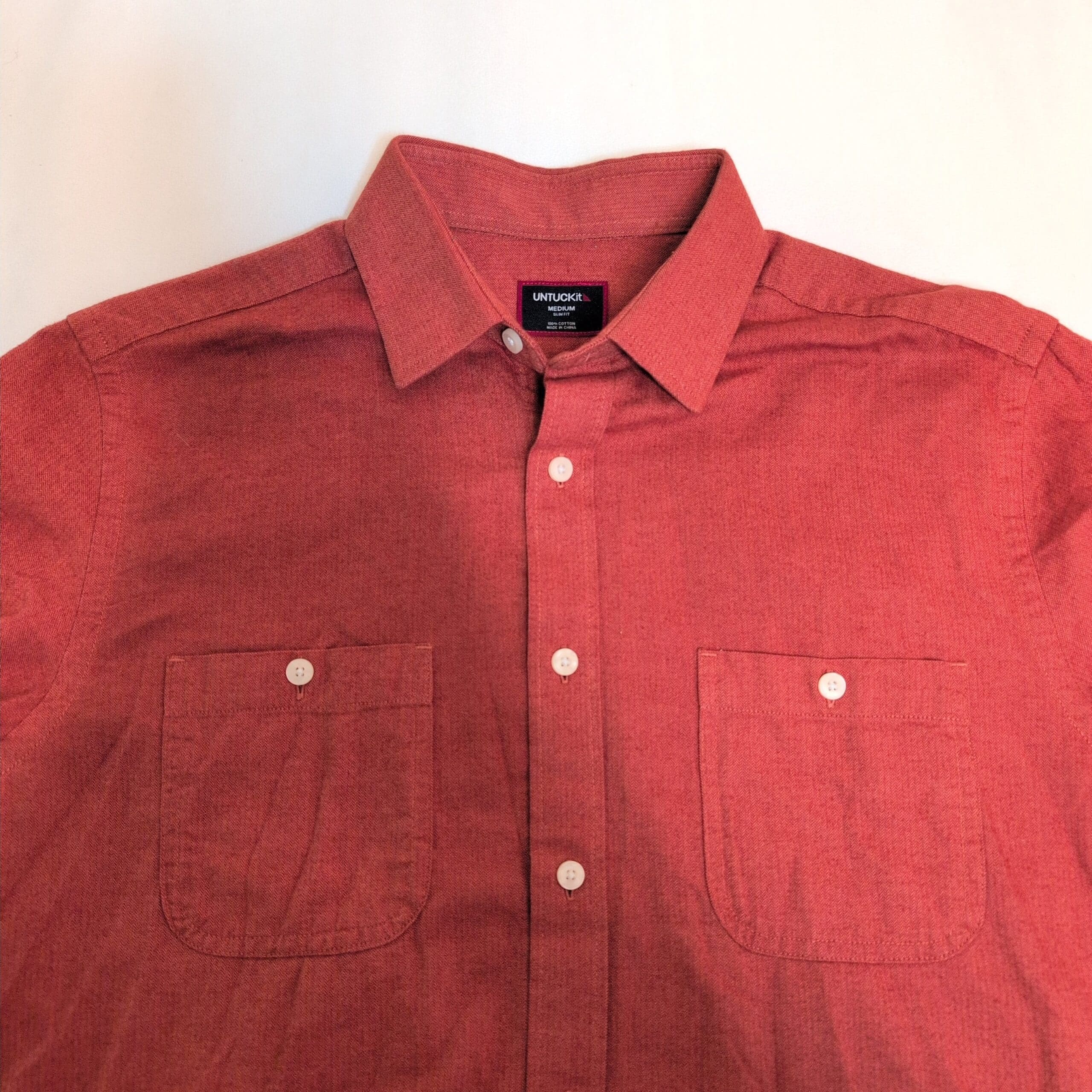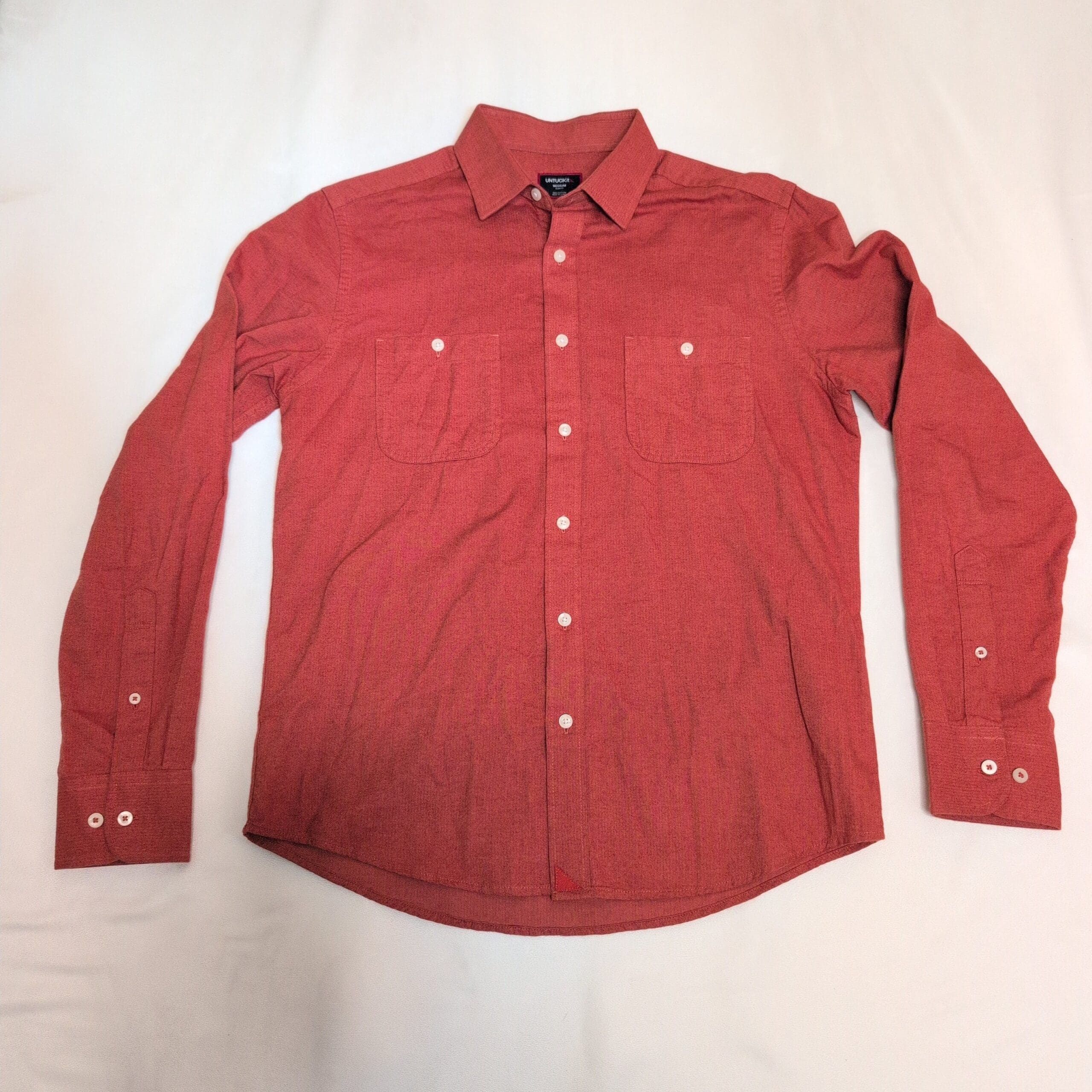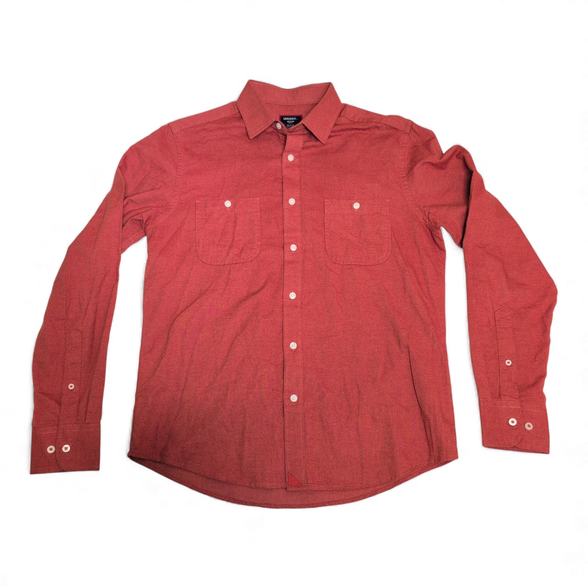 Untuckit men’s rust orange long-sleeve button-down shirt in size M. 100% cotton for breathable, everyday comfort. Features a classic spread collar, full button-front placket, dual chest pockets, and button cuffs — designed with Untuckit’s signature length and fit to be worn untucked. Versatile for casual or smart-casual wear; pairs well with jeans or chinos.