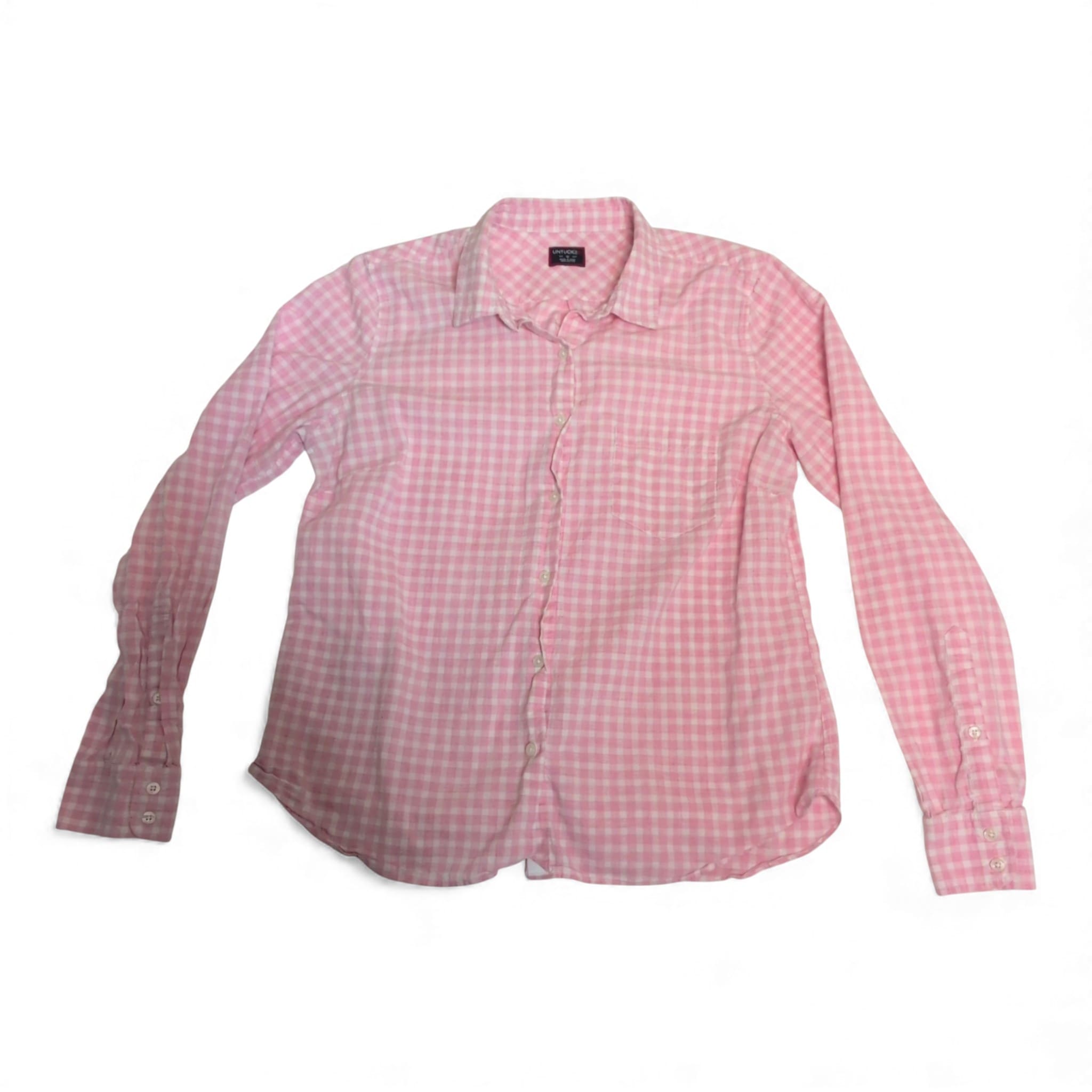 Untuckit women’s button-down shirt in a soft pink gingham check. Size 10 (standard) with long sleeves, classic collar, single chest pocket and a curved hem designed for wearing untucked. 100% cotton and in like-new condition with minimal signs of wear.