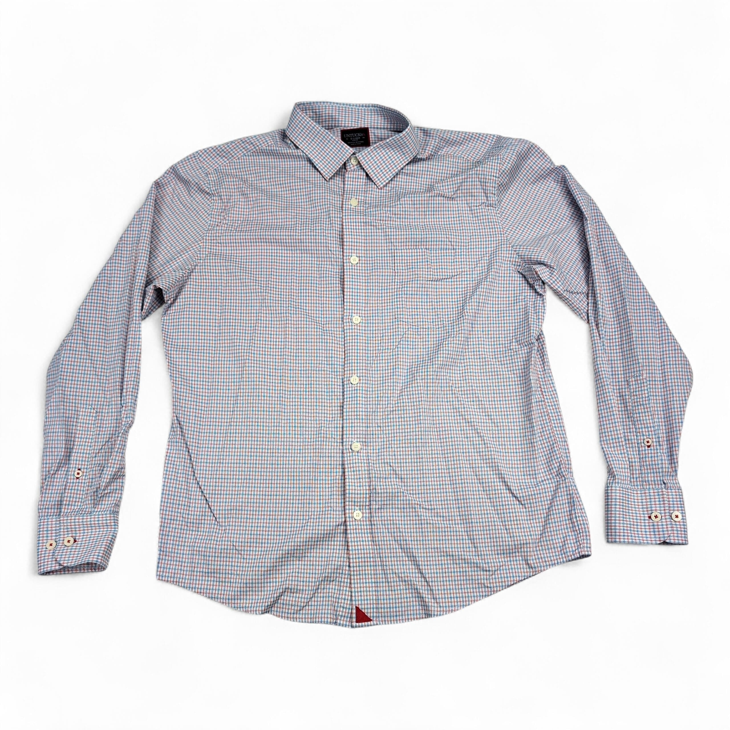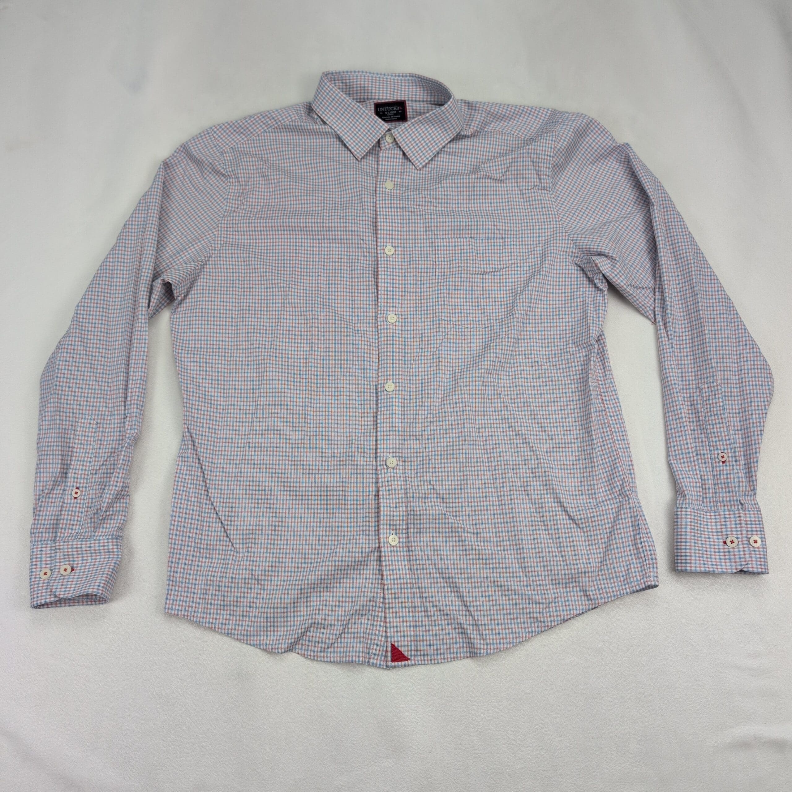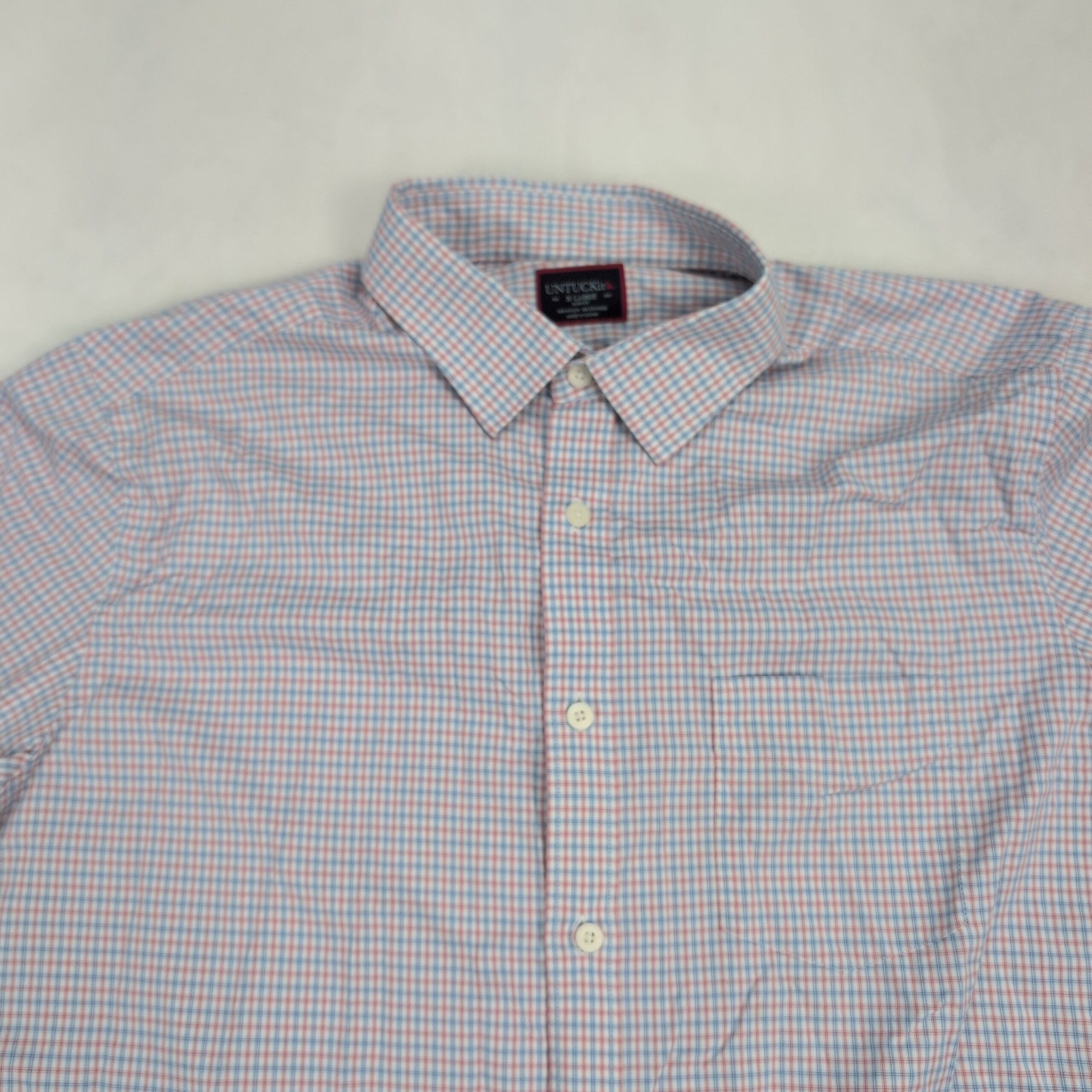 Men’s Untuckit slim fit long-sleeve button-front dress shirt in XL. Subtle pink and blue micro-check pattern for a clean, versatile business-casual look. Designed to be worn untucked with a tailored curved hem.