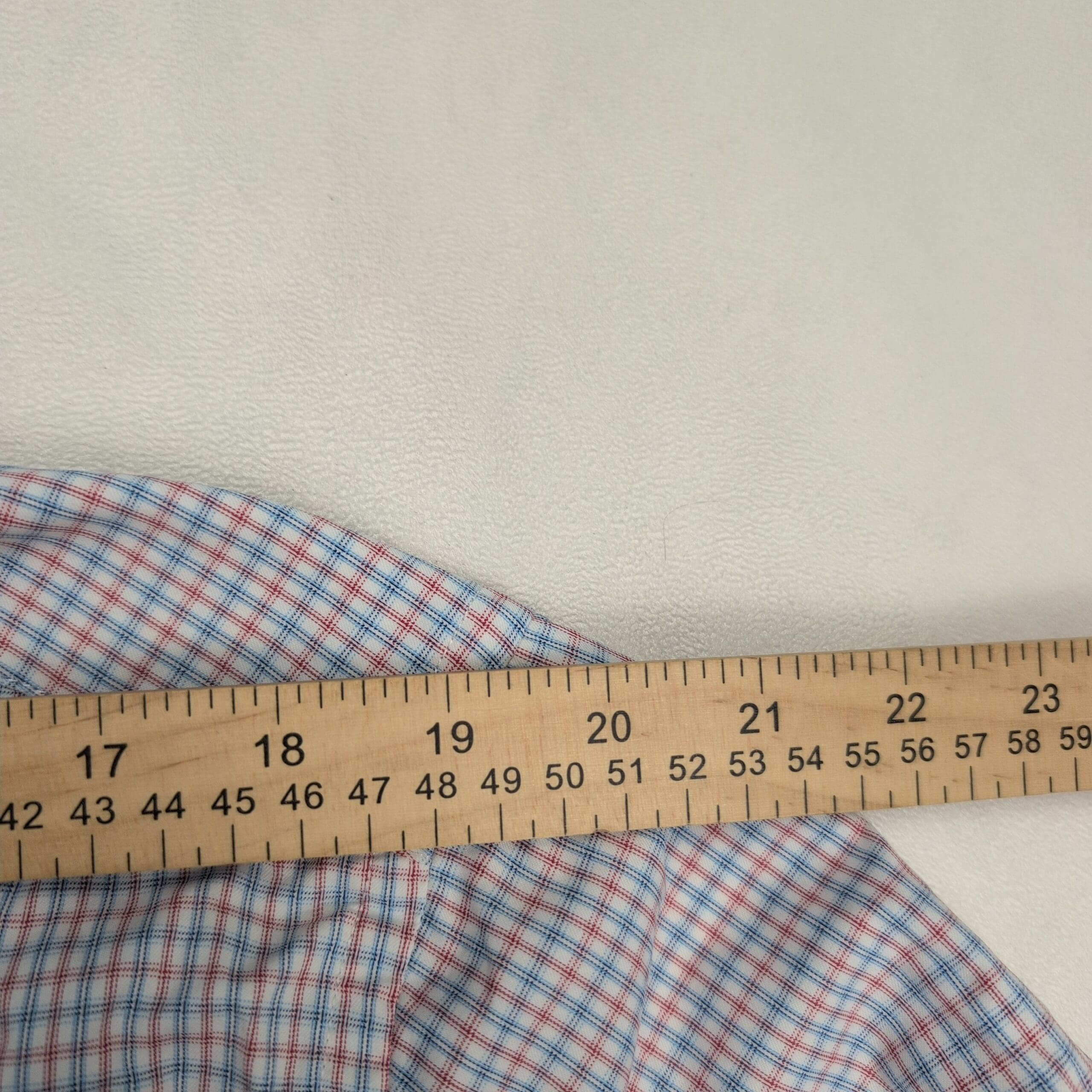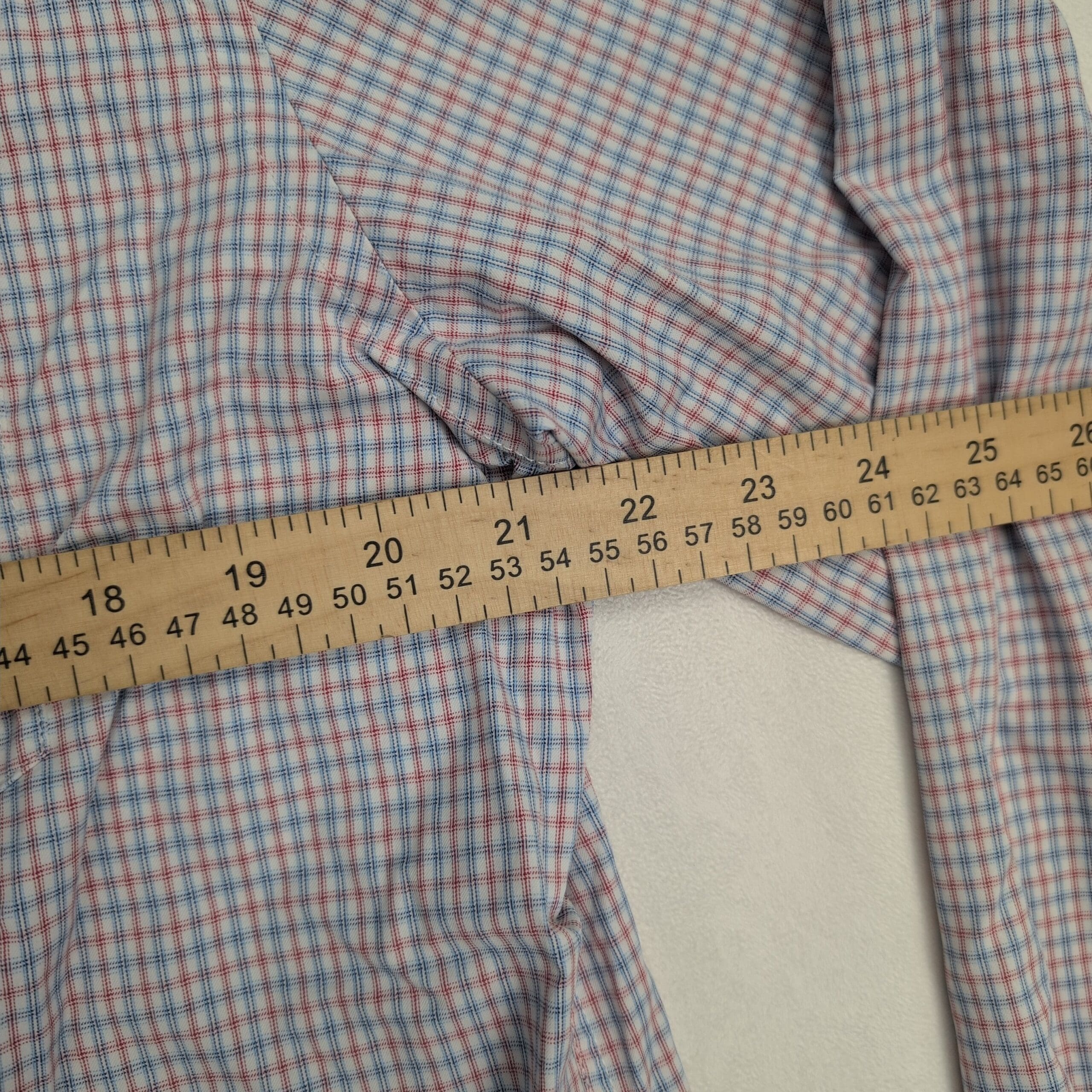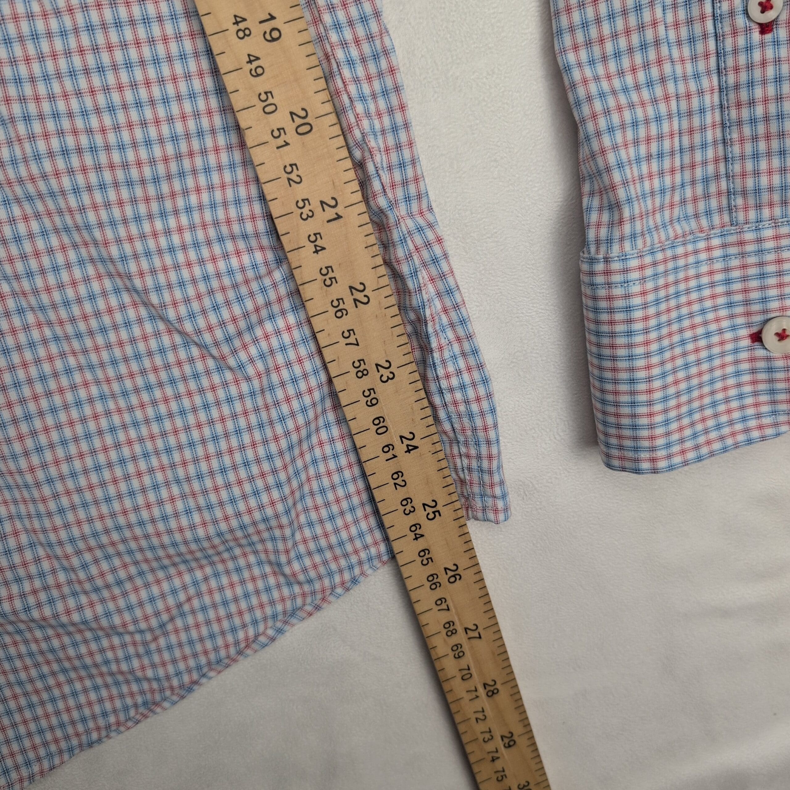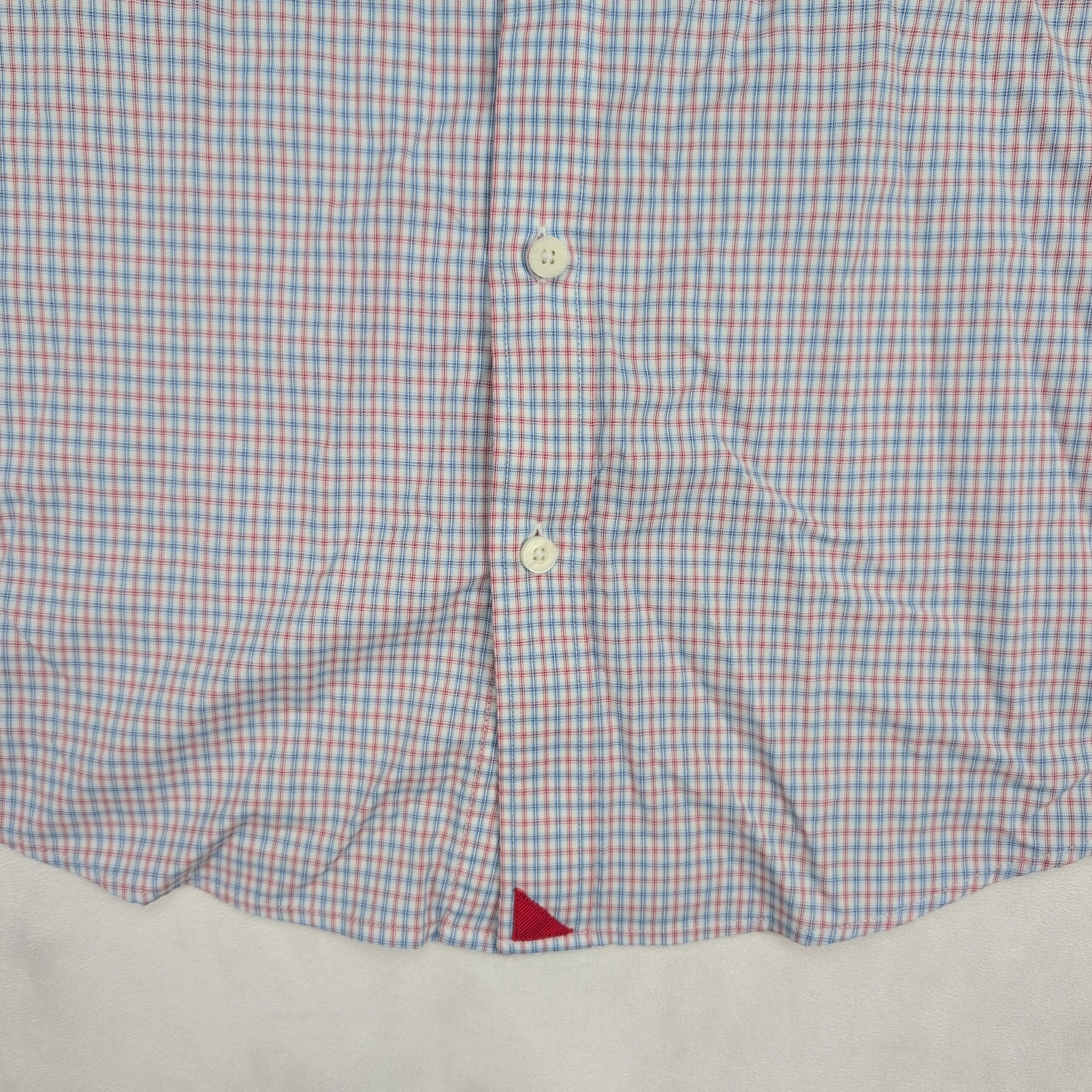 Men’s Untuckit slim fit long-sleeve button-front dress shirt in XL. Subtle pink and blue micro-check pattern for a clean, versatile business-casual look. Designed to be worn untucked with a tailored curved hem.