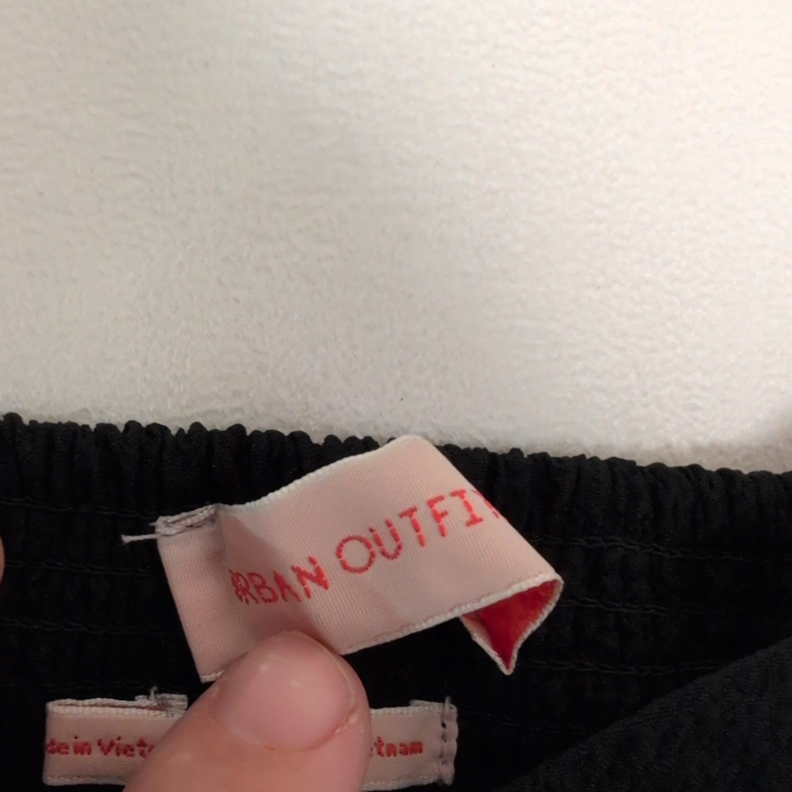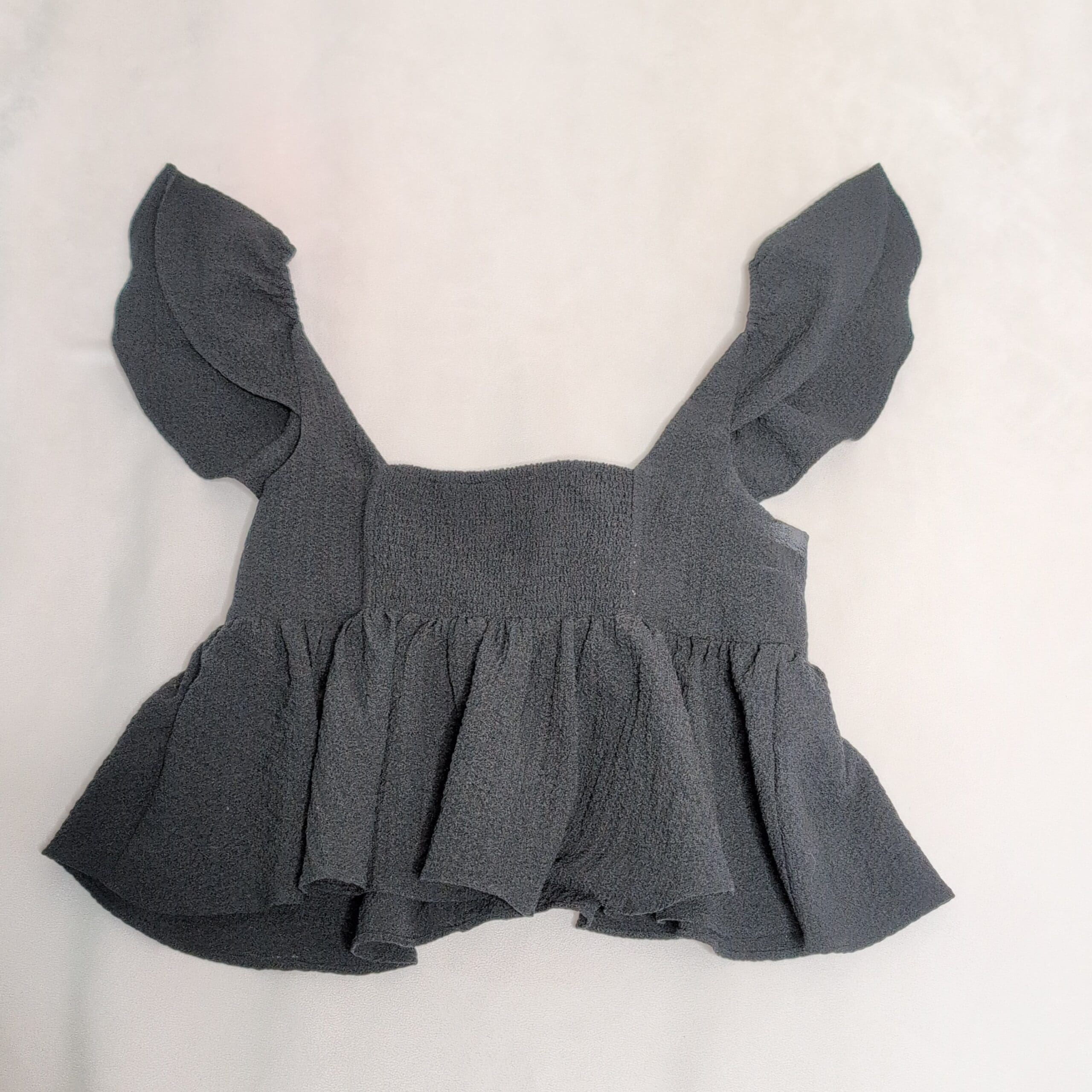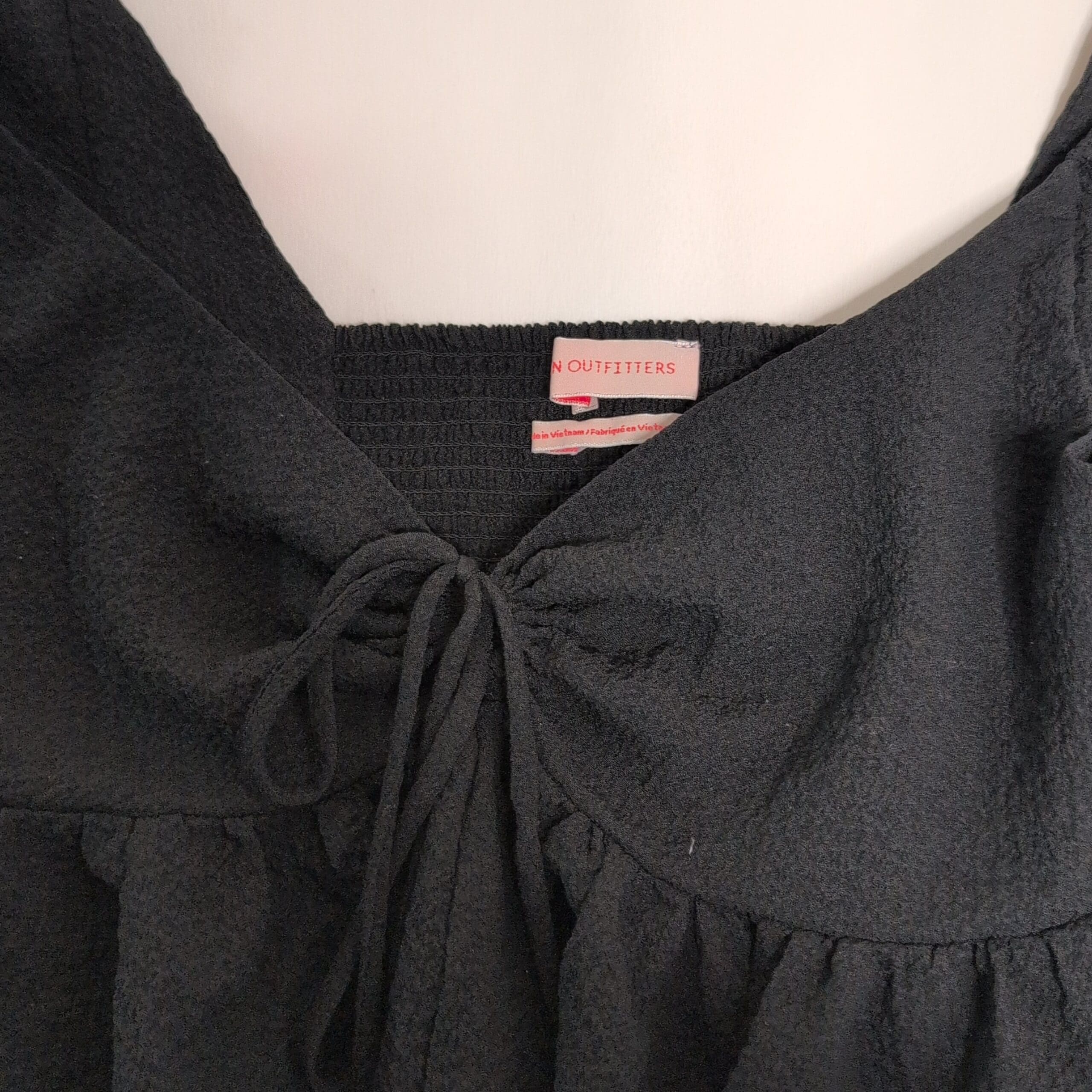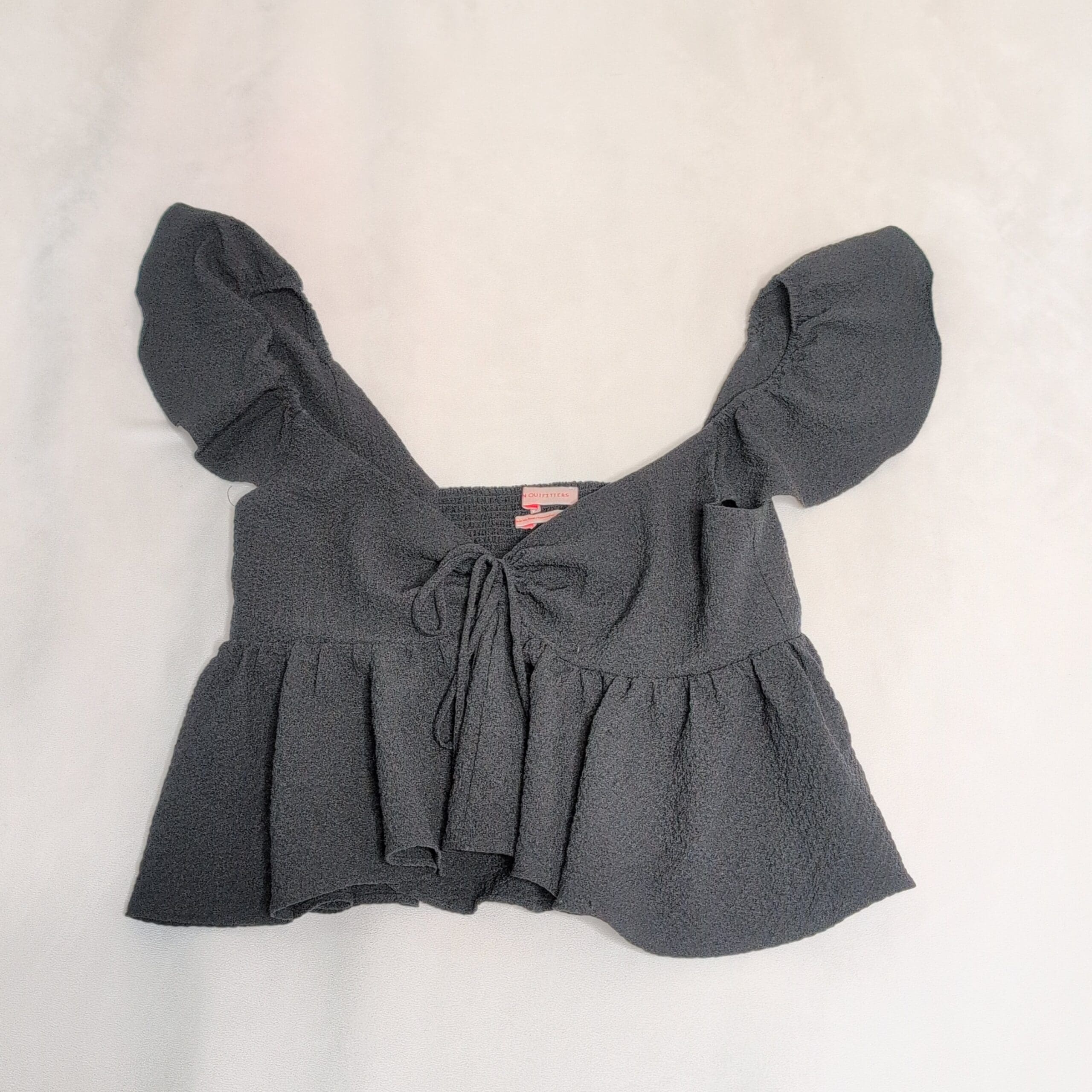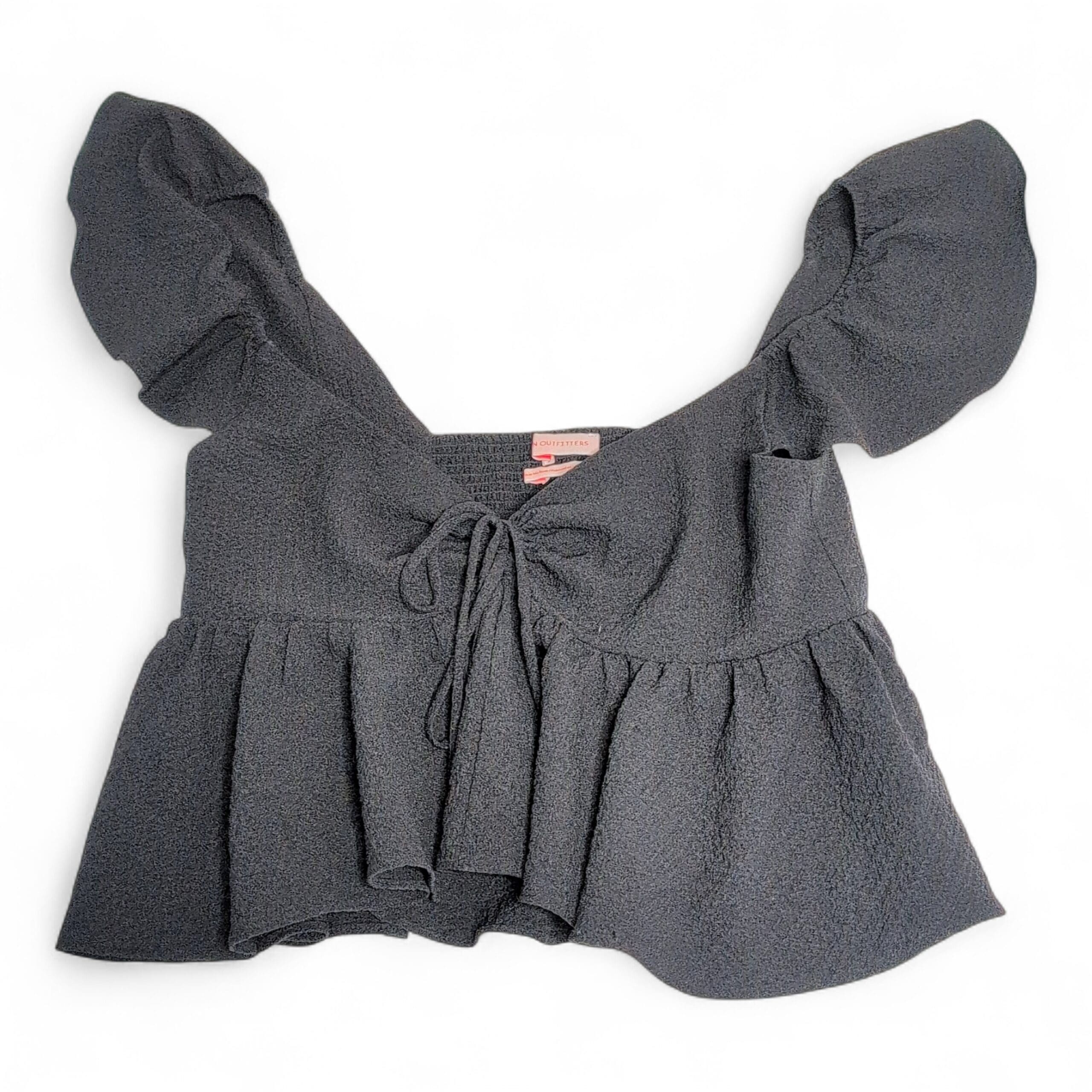 Black textured peplum blouse from Urban Outfitters in size M. Features puff short sleeves, a tie-front neckline, smocked back panel for stretch, and a flirty ruffled hem — cropped, feminine silhouette that pairs well with high-waist jeans or skirts. Gently used and free of major rips, tears, stains, or flaws; typical light wear may be present, so please review photos for details.