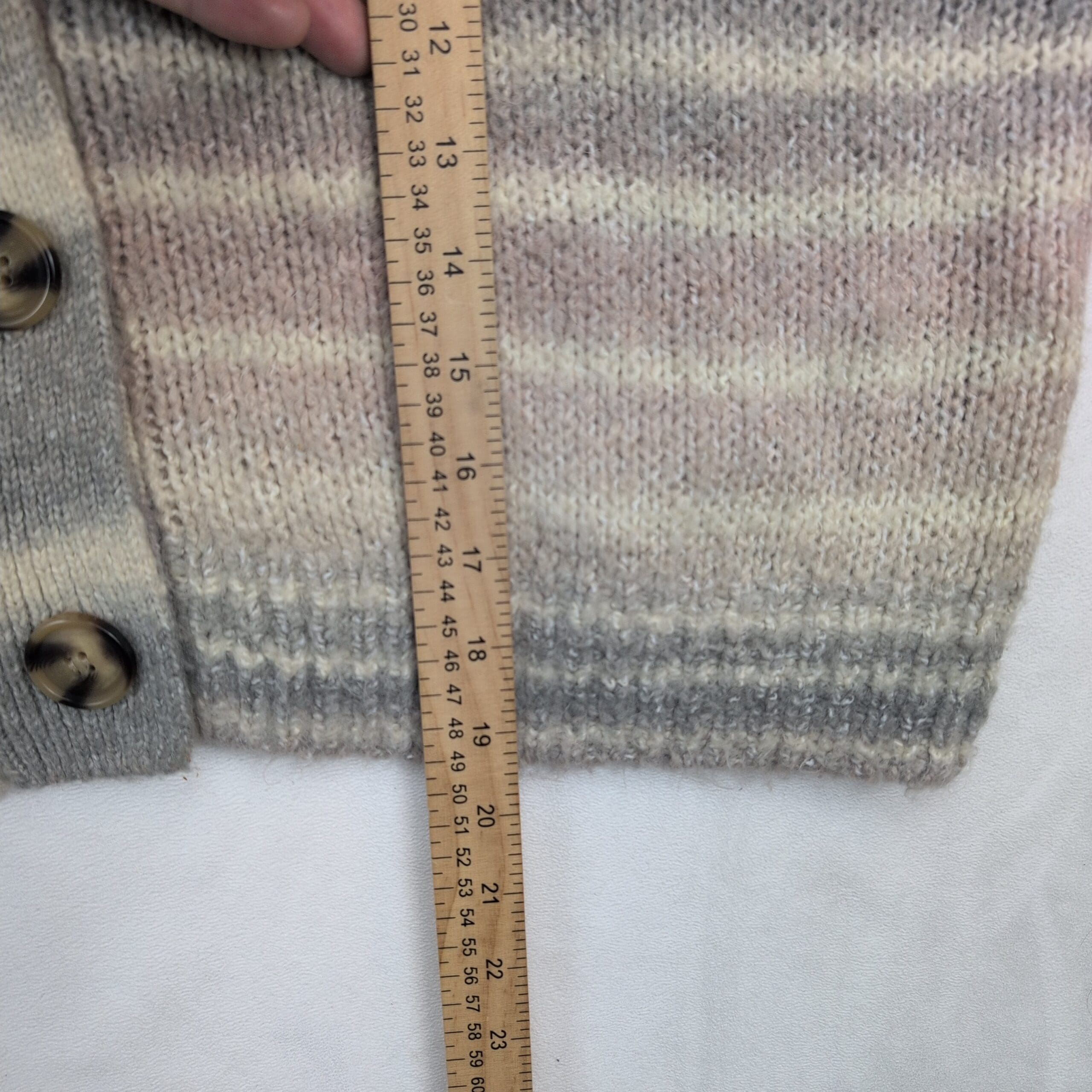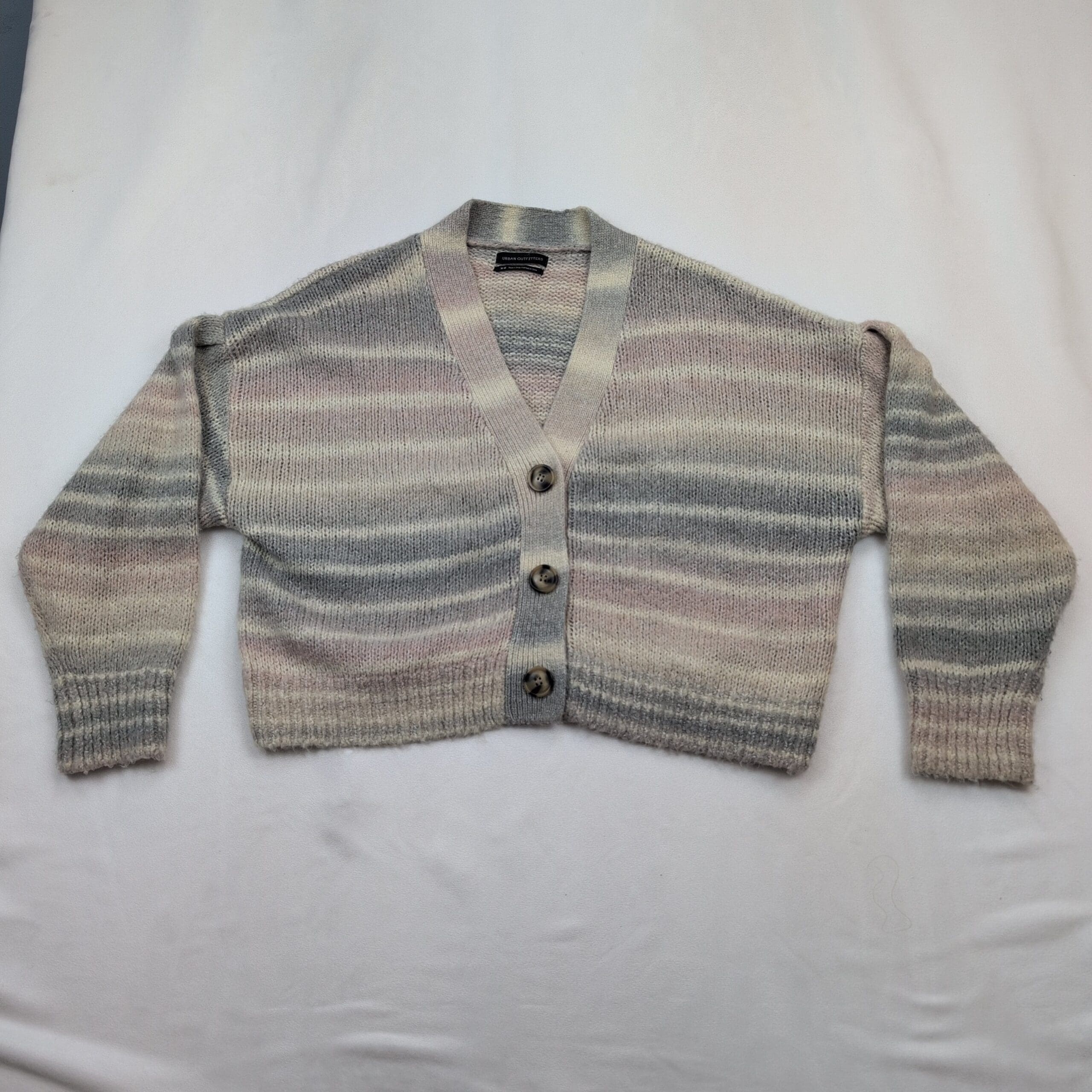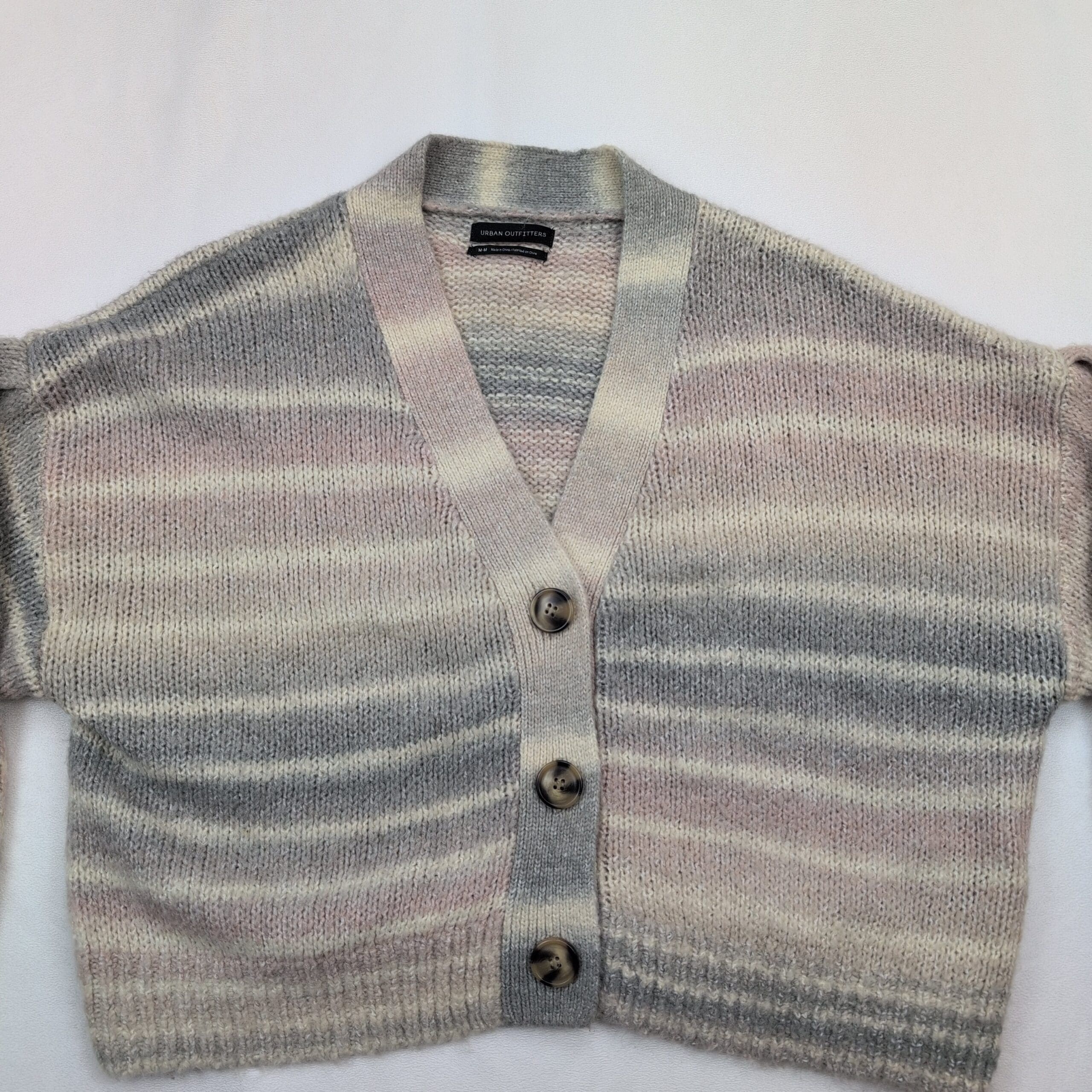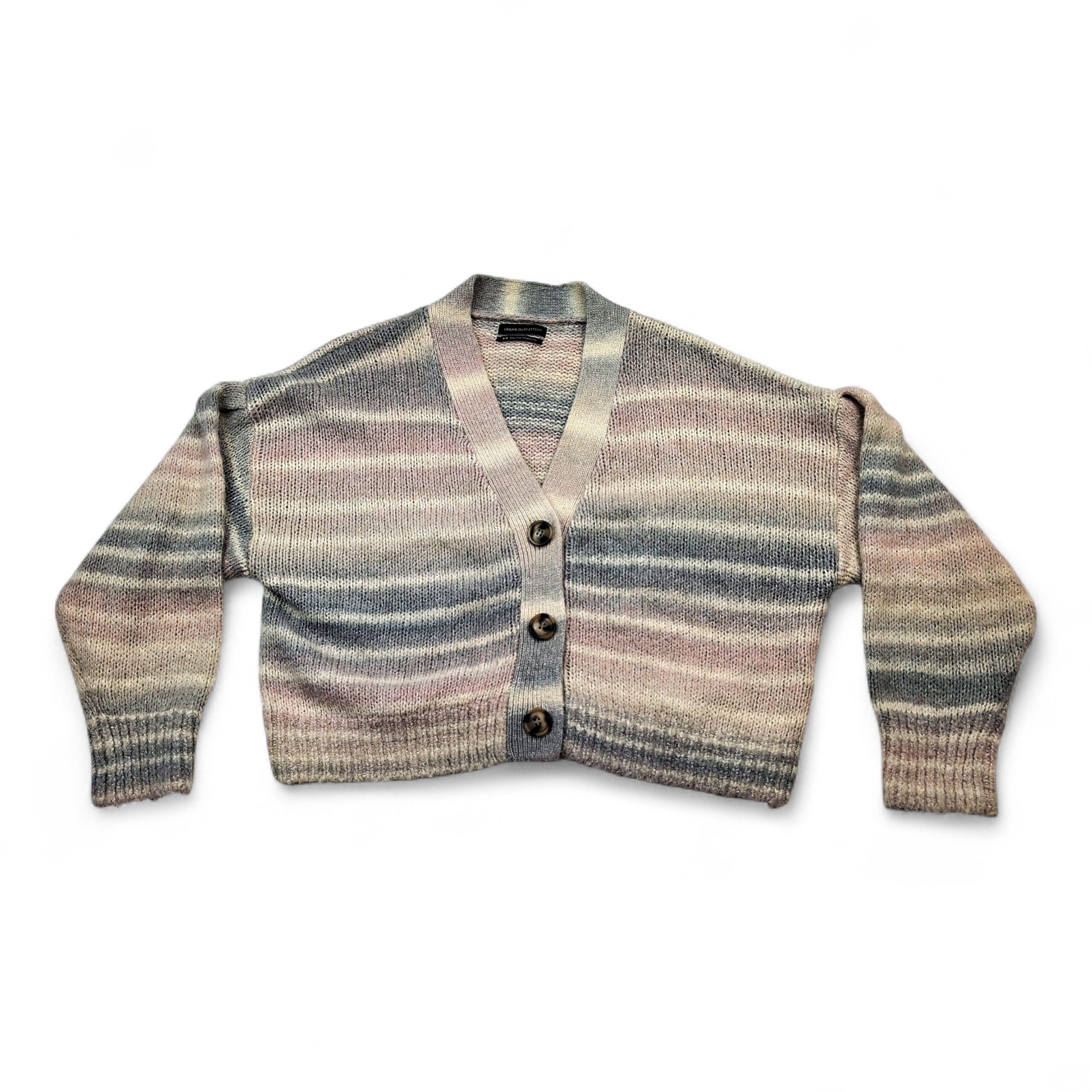 Urban Outfitters cropped button-front cardigan in size M. Soft pastel horizontal stripes in cream, blush and gray with subtle variegated knit. V-neck with three large buttons, ribbed cuffs and hem, and a boxy, slightly relaxed cropped silhouette—perfect for layering over tees or dresses.
