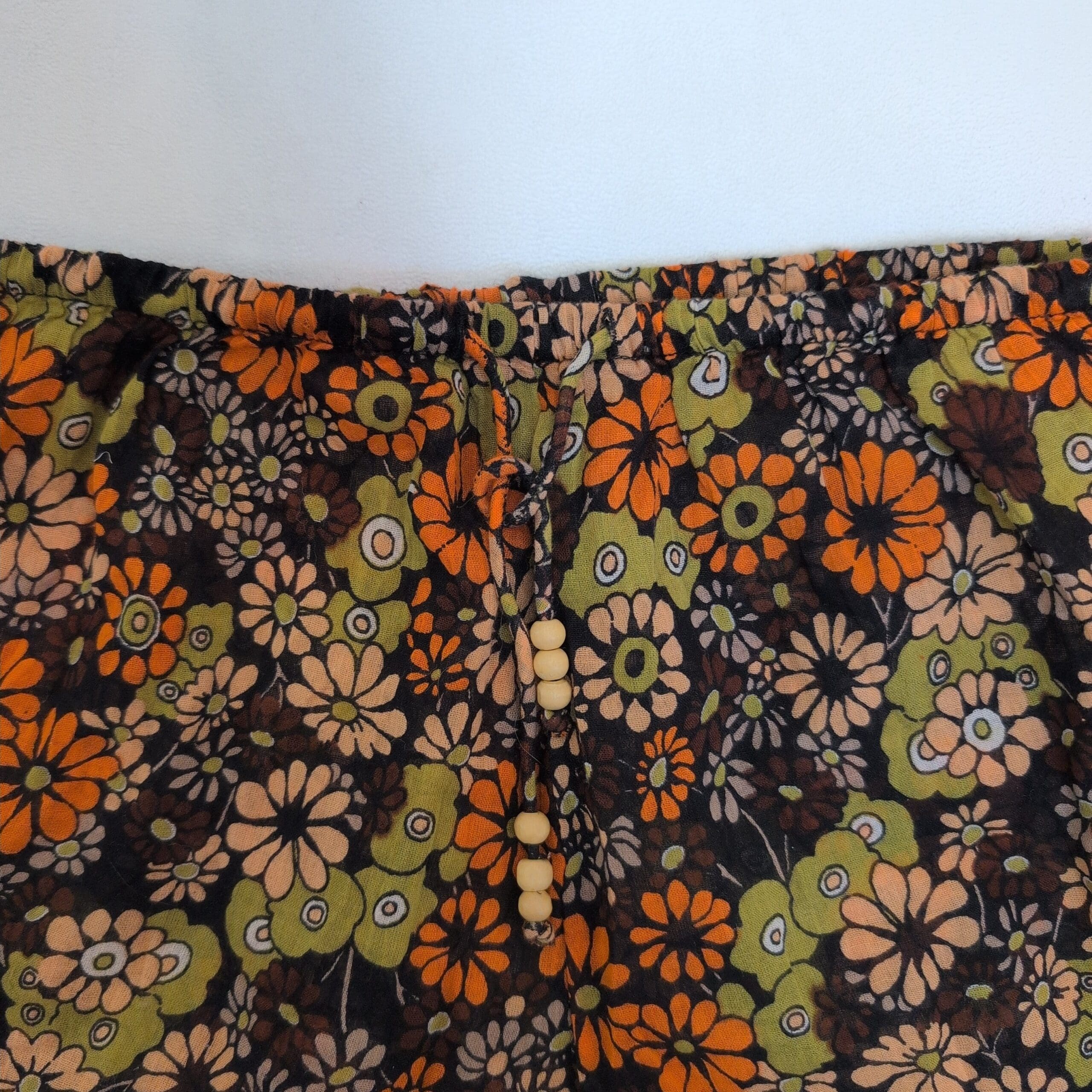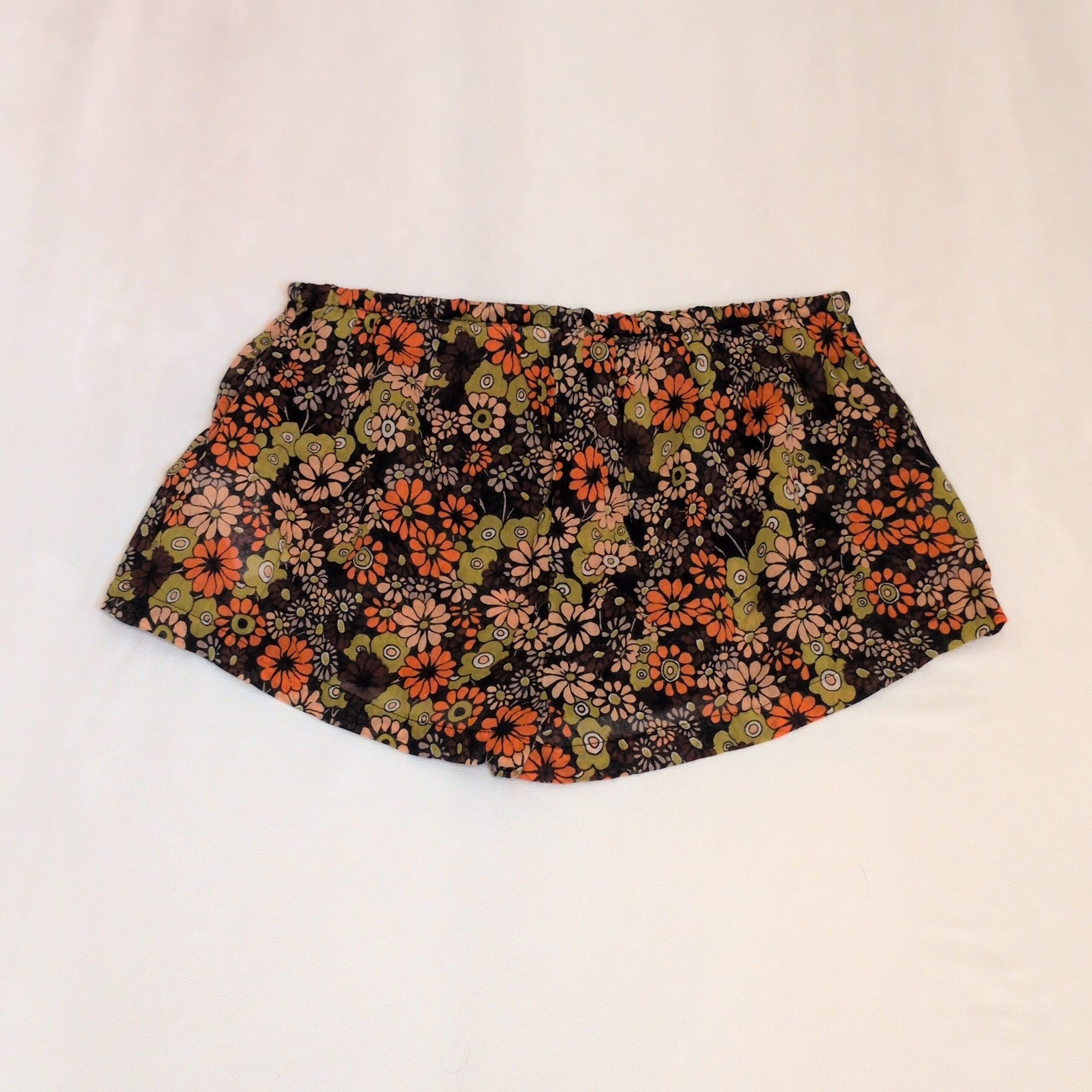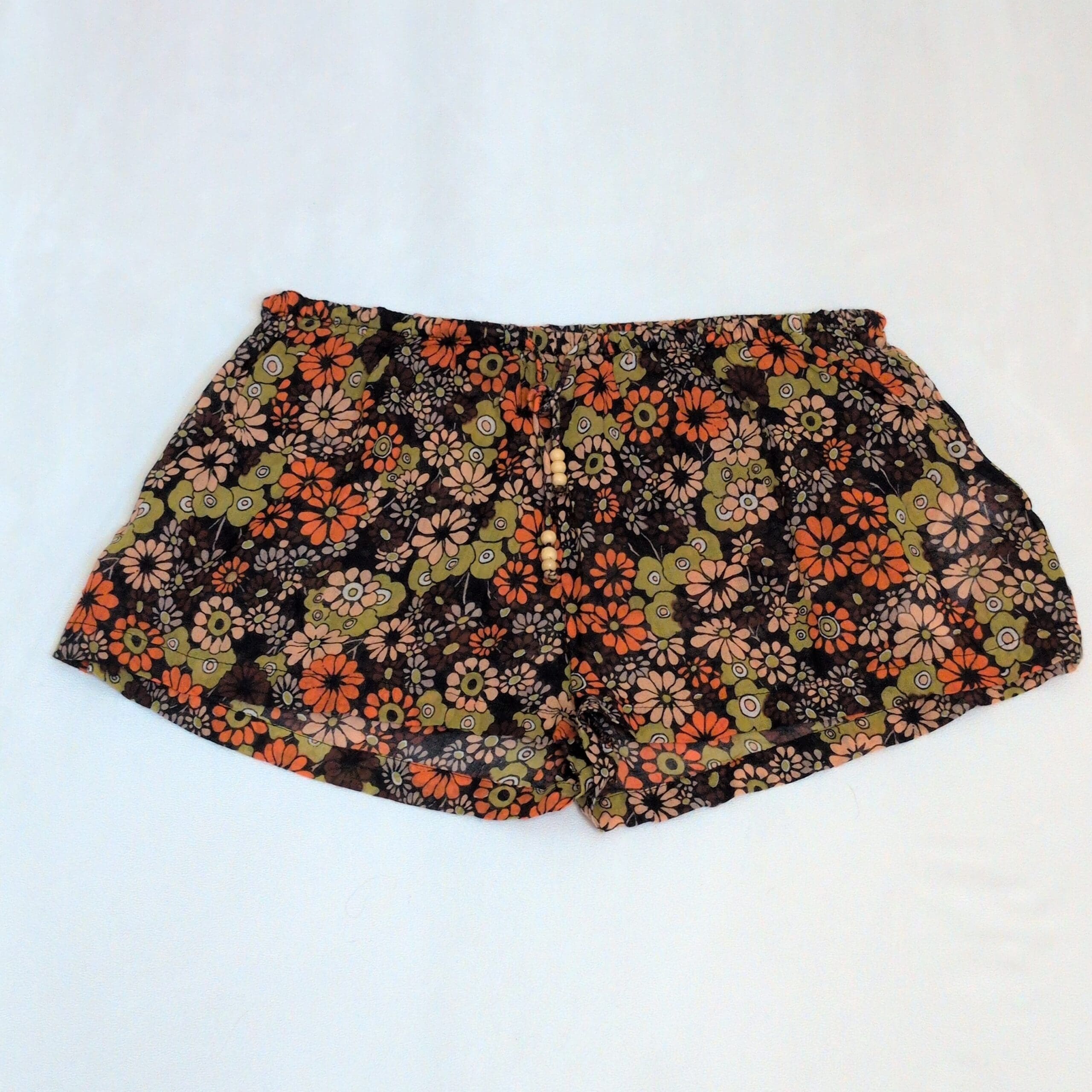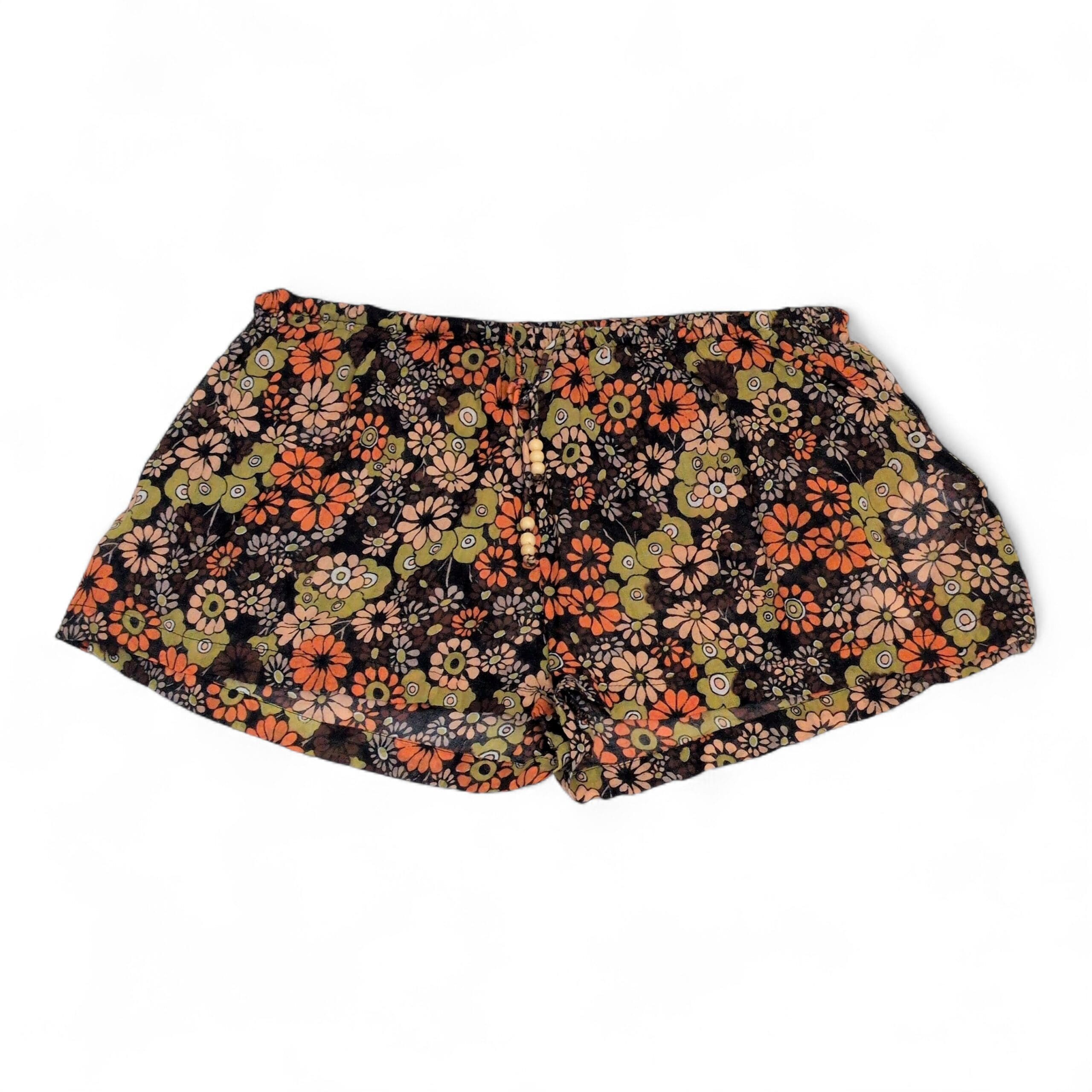 Urban Outfitters women’s pajama shorts in size S. Black background with a retro floral print in orange, olive, and blush tones. Lightweight and breezy with an elastic waistband and an adjustable drawstring finished with small wooden beads for a relaxed fit. Gently used and free of major rips, tears, stains, or flaws; typical light wear may be present.