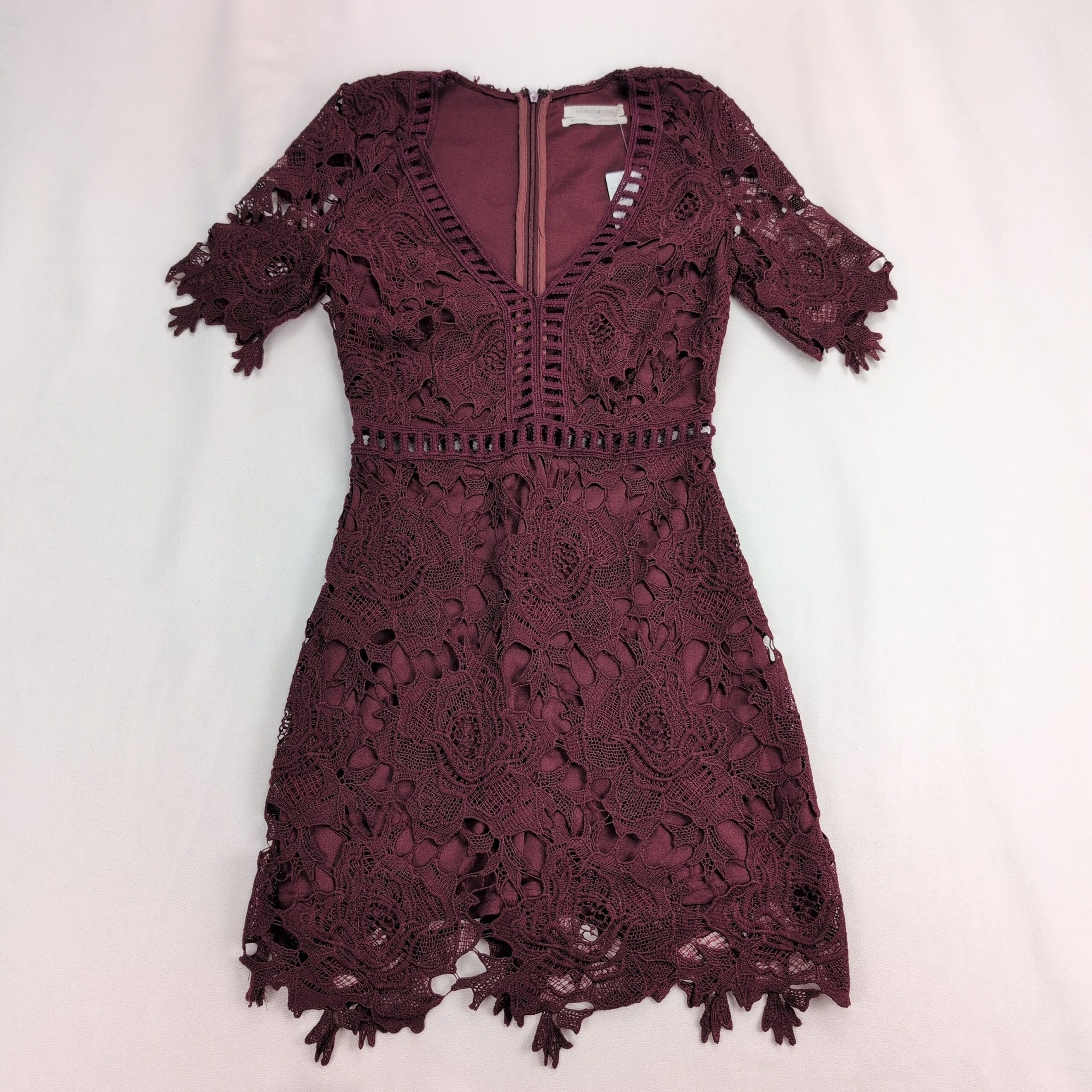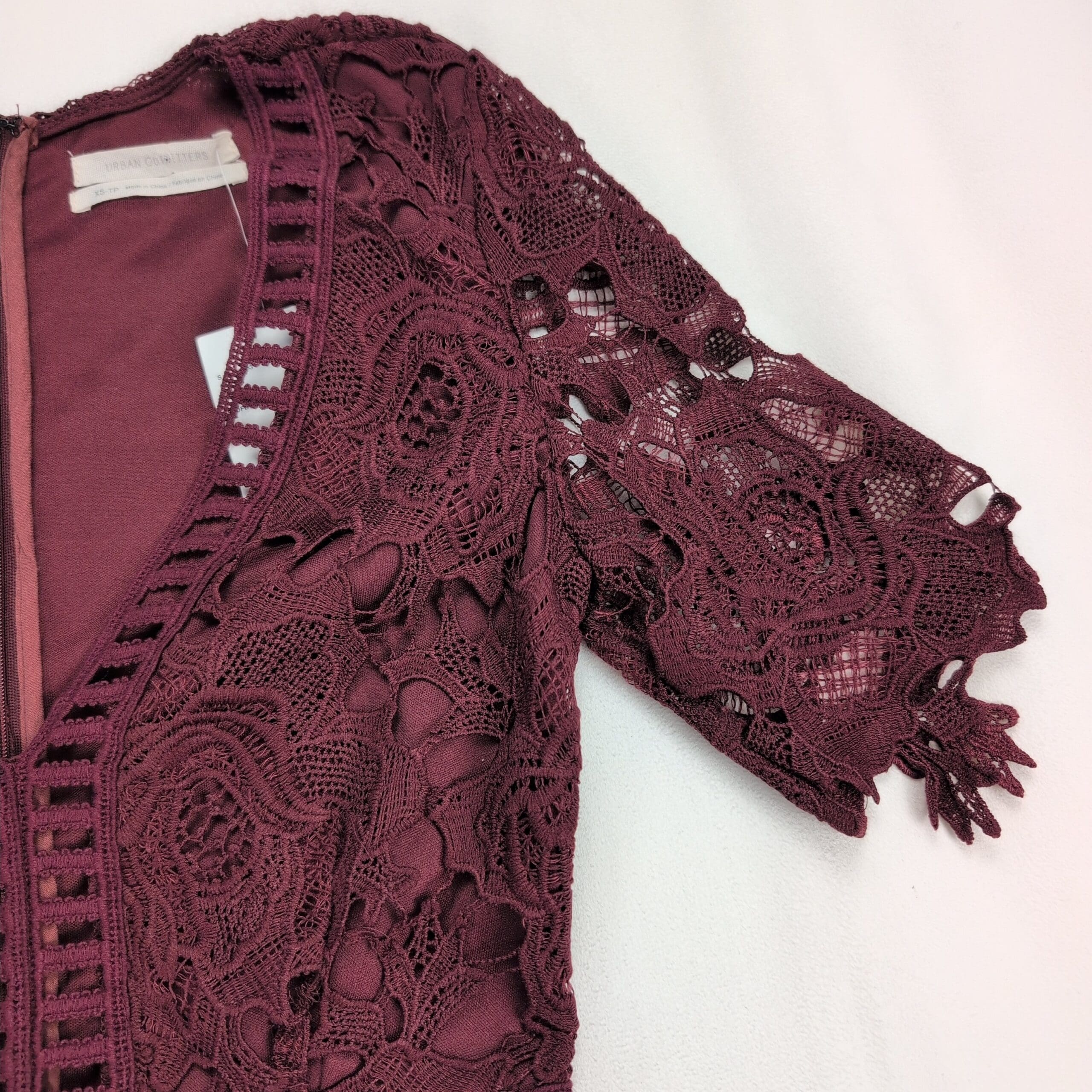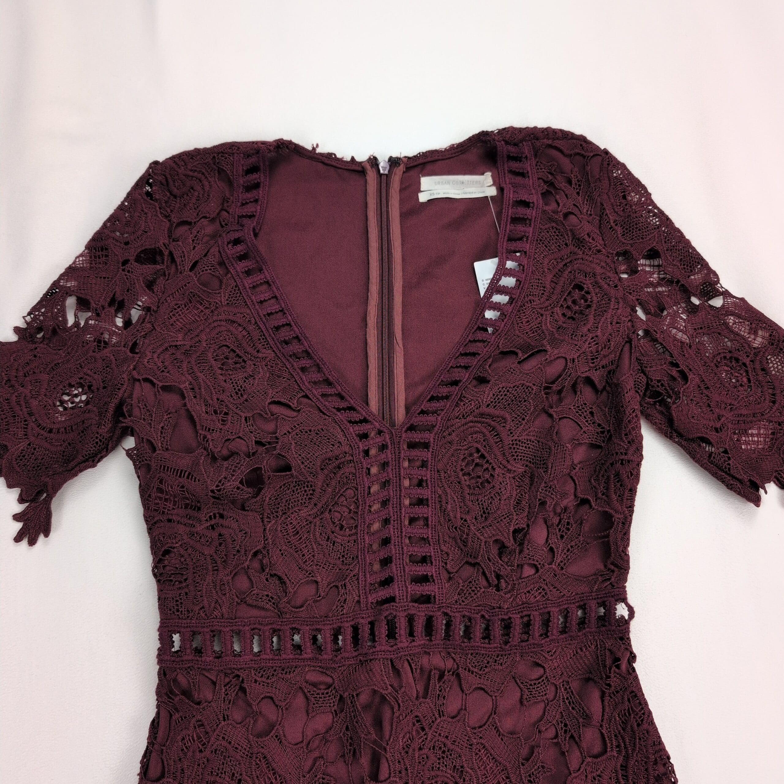 Urban Outfitters size XS lace fit-and-flare dress in deep burgundy. New with tags — never worn. Features an intricate floral lace overlay with matching lining, V-neckline, short scalloped sleeves, ladder lace waist detail, back zip closure, and scalloped scalloped hem for a feminine finish. Ideal for parties, date nights, or special occasions. Condition: New with tags. Original MSRP $89.