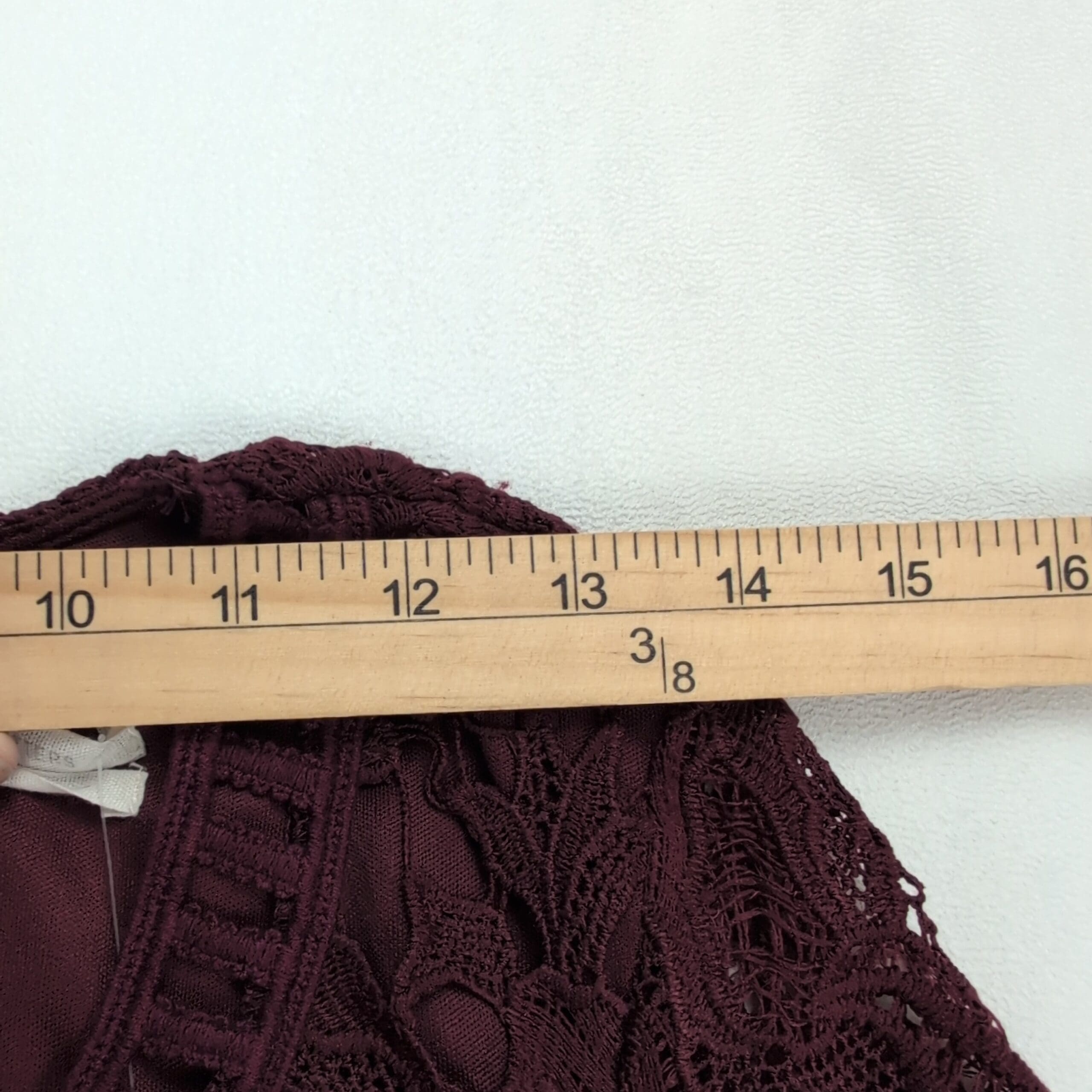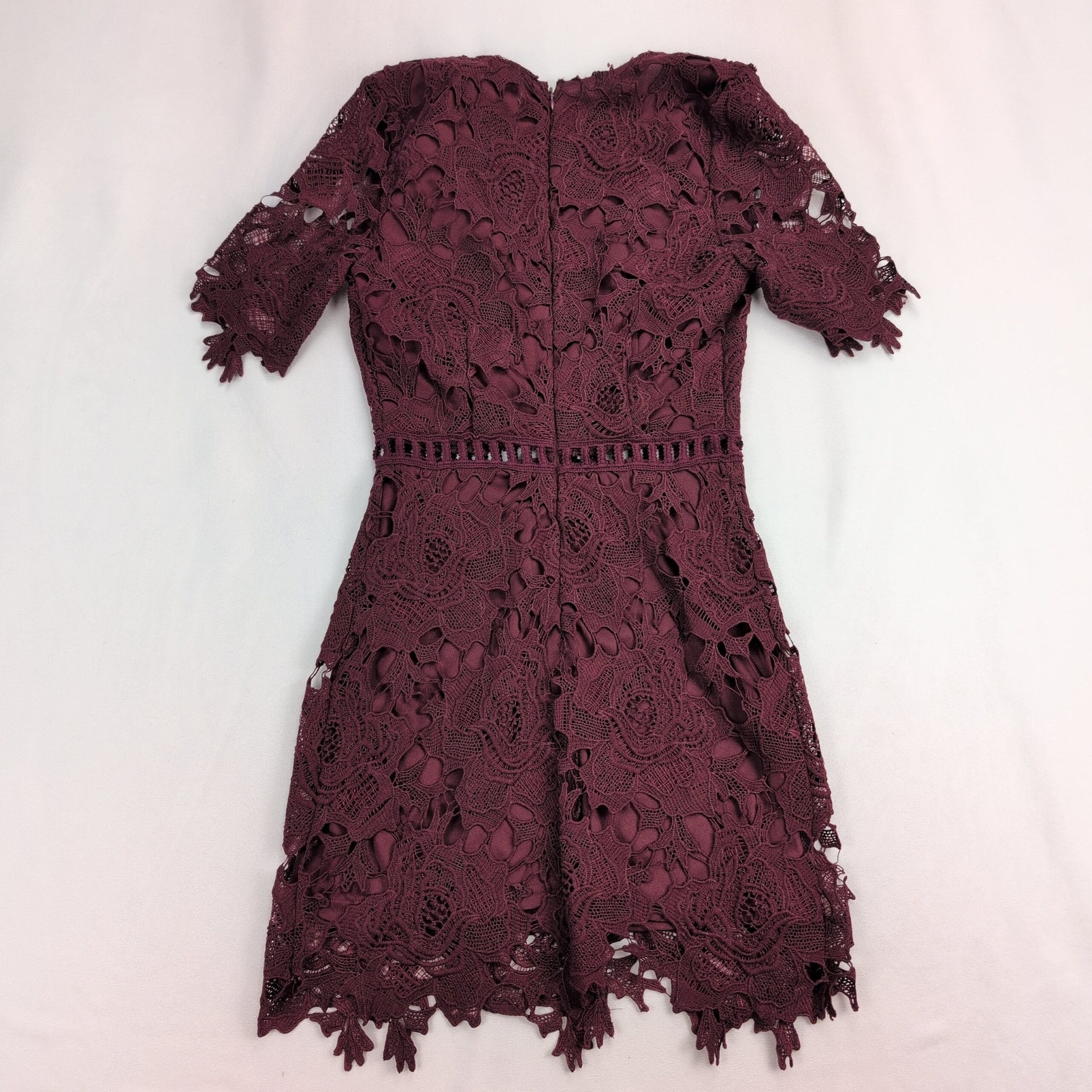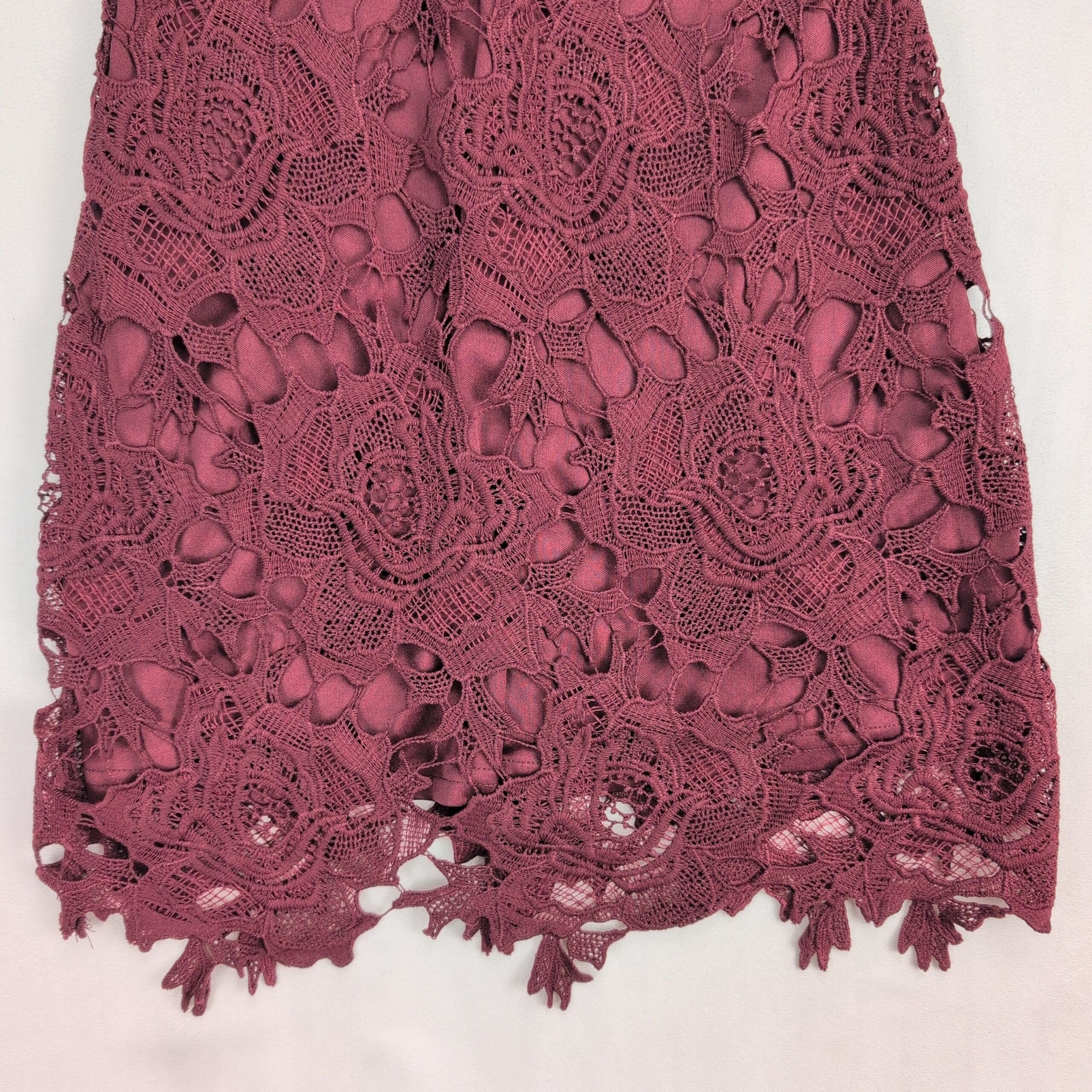Urban Outfitters size XS lace fit-and-flare dress in deep burgundy. New with tags — never worn. Features an intricate floral lace overlay with matching lining, V-neckline, short scalloped sleeves, ladder lace waist detail, back zip closure, and scalloped scalloped hem for a feminine finish. Ideal for parties, date nights, or special occasions. Condition: New with tags. Original MSRP $89.