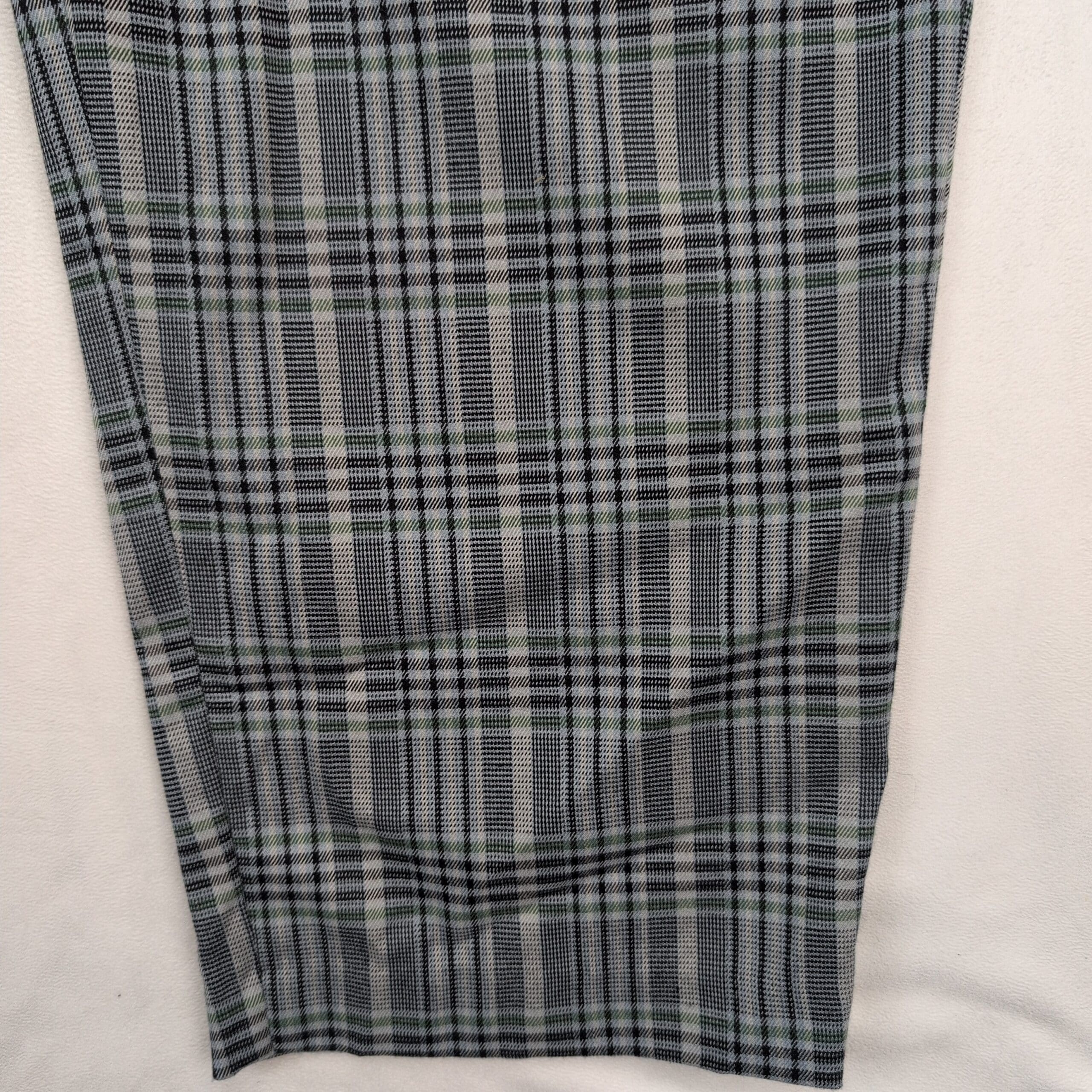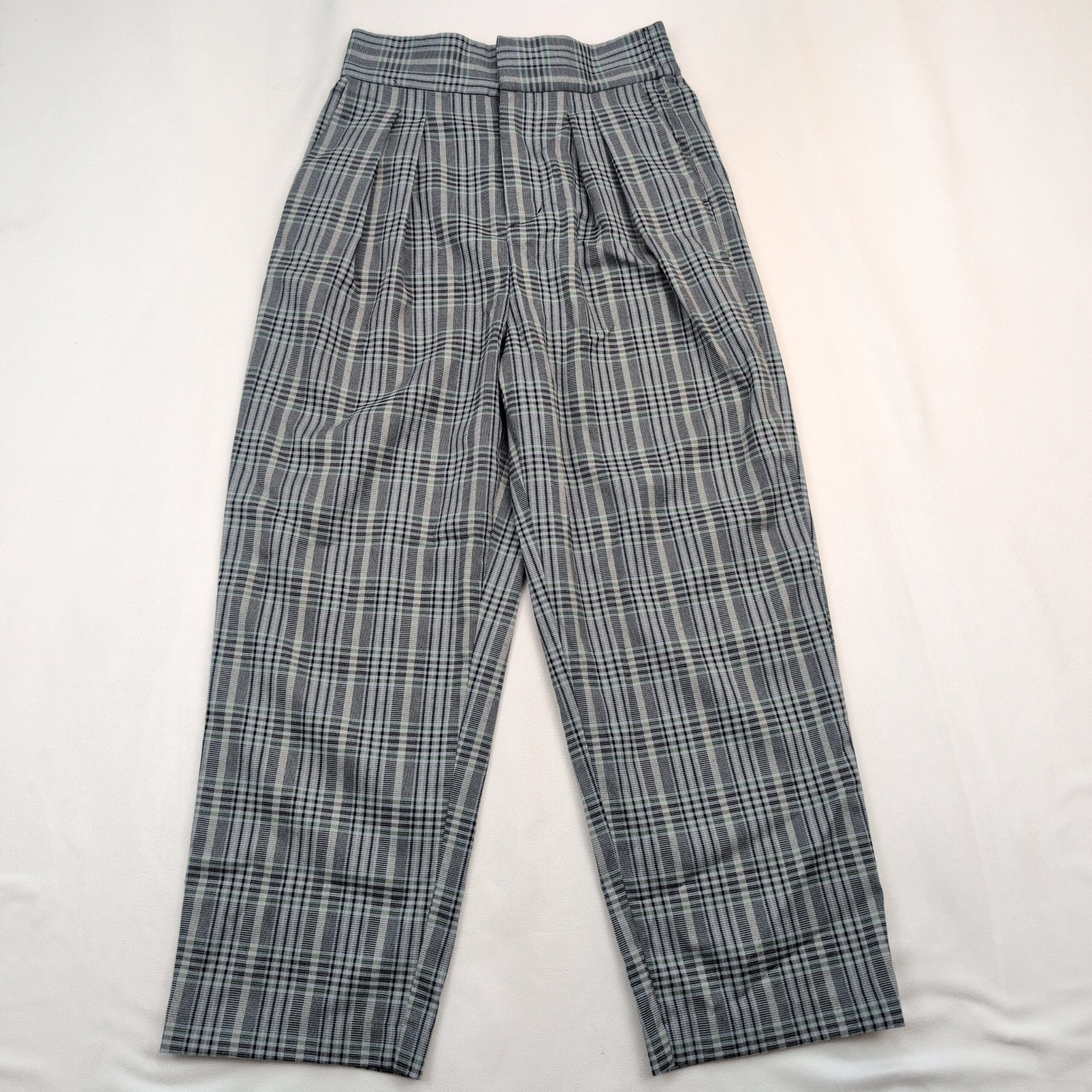 Urban Outfitters women’s plaid pleated pants in size S. High-rise waist with soft front pleats and a tailored tapered leg that hits at the ankle for a polished, modern silhouette. Classic gray/black woven plaid—versatile for workwear or dressed-down looks. Excellent used condition: free of major rips, tears, or stains; normal light wear may be present. Fabric/content not labeled; please review photos for pattern and texture details.