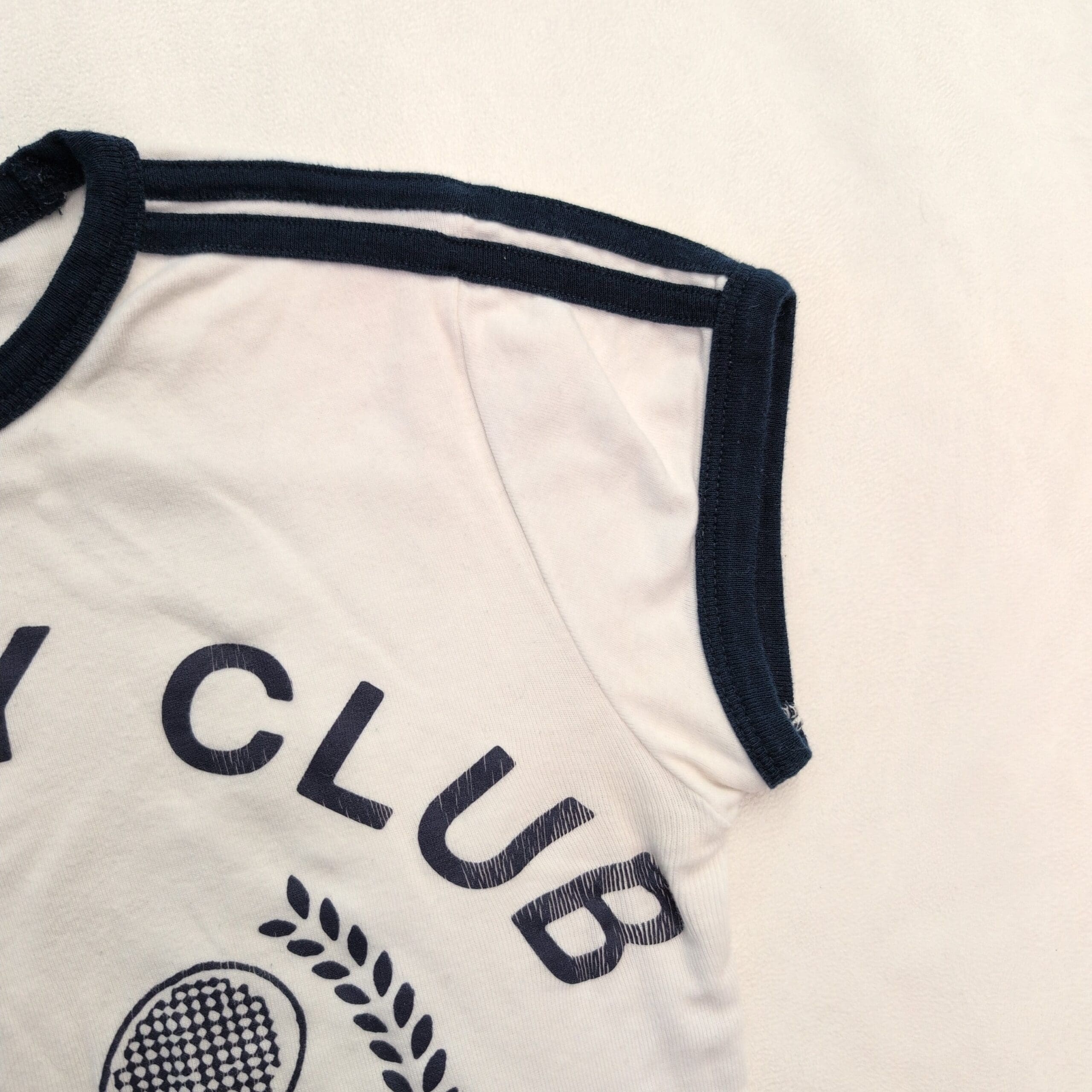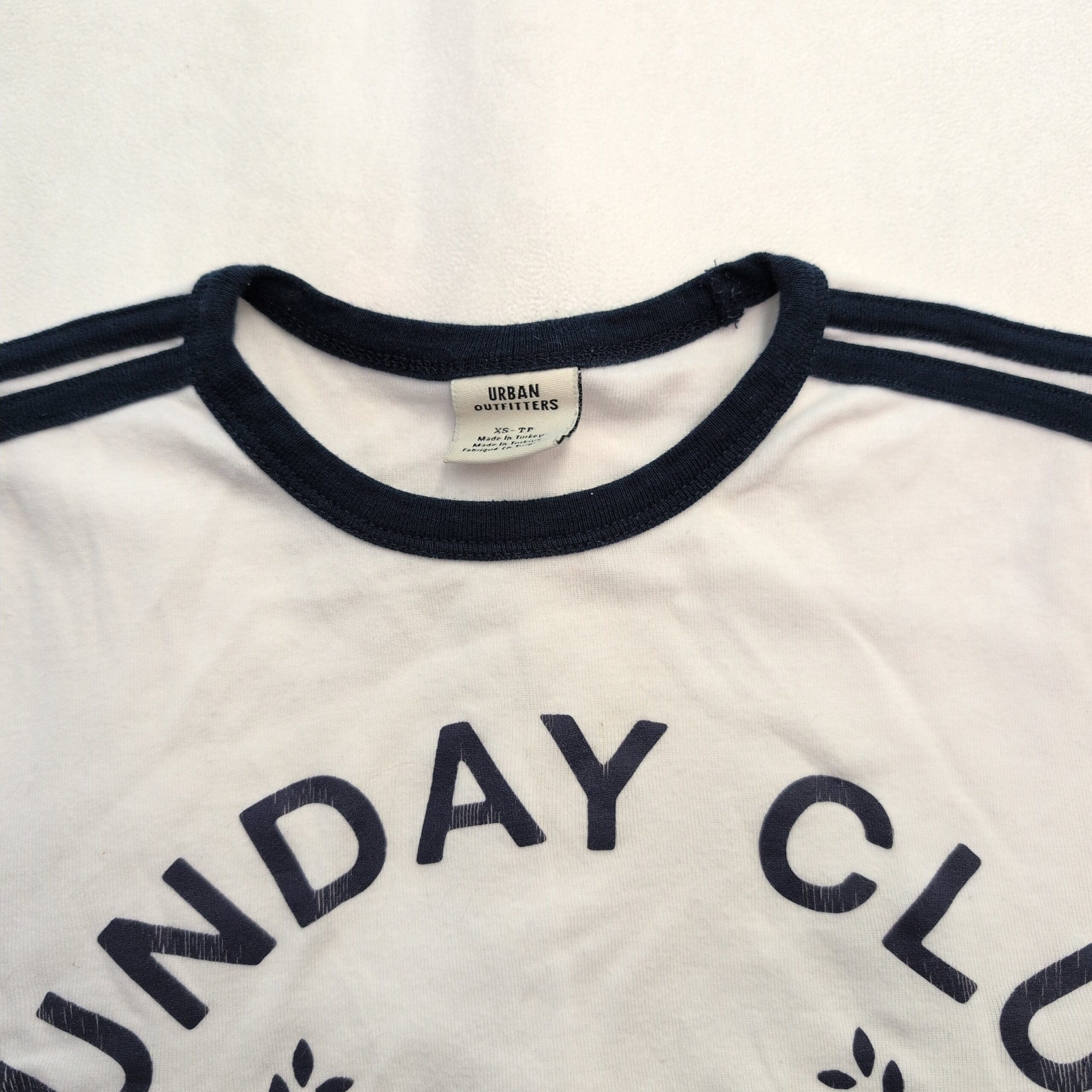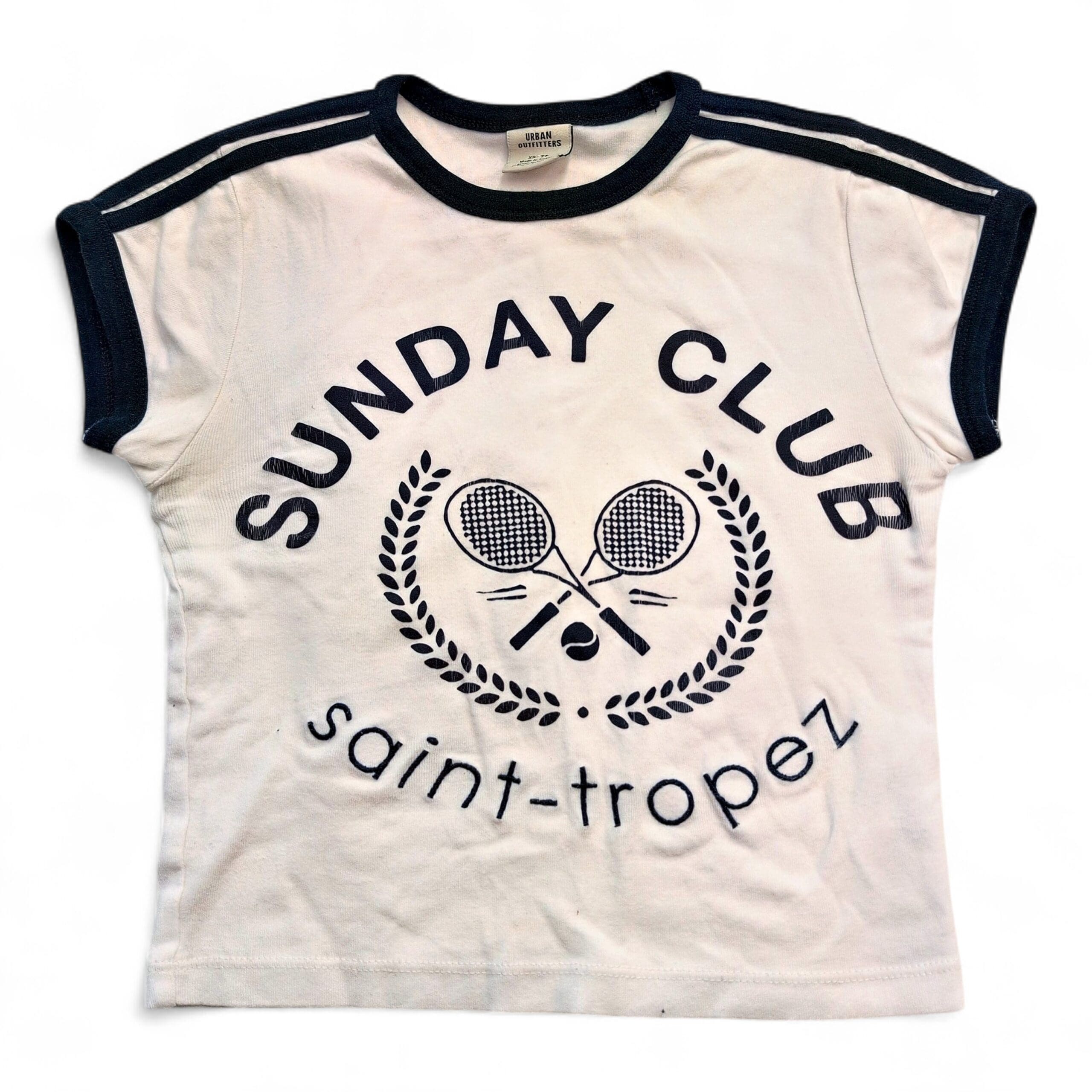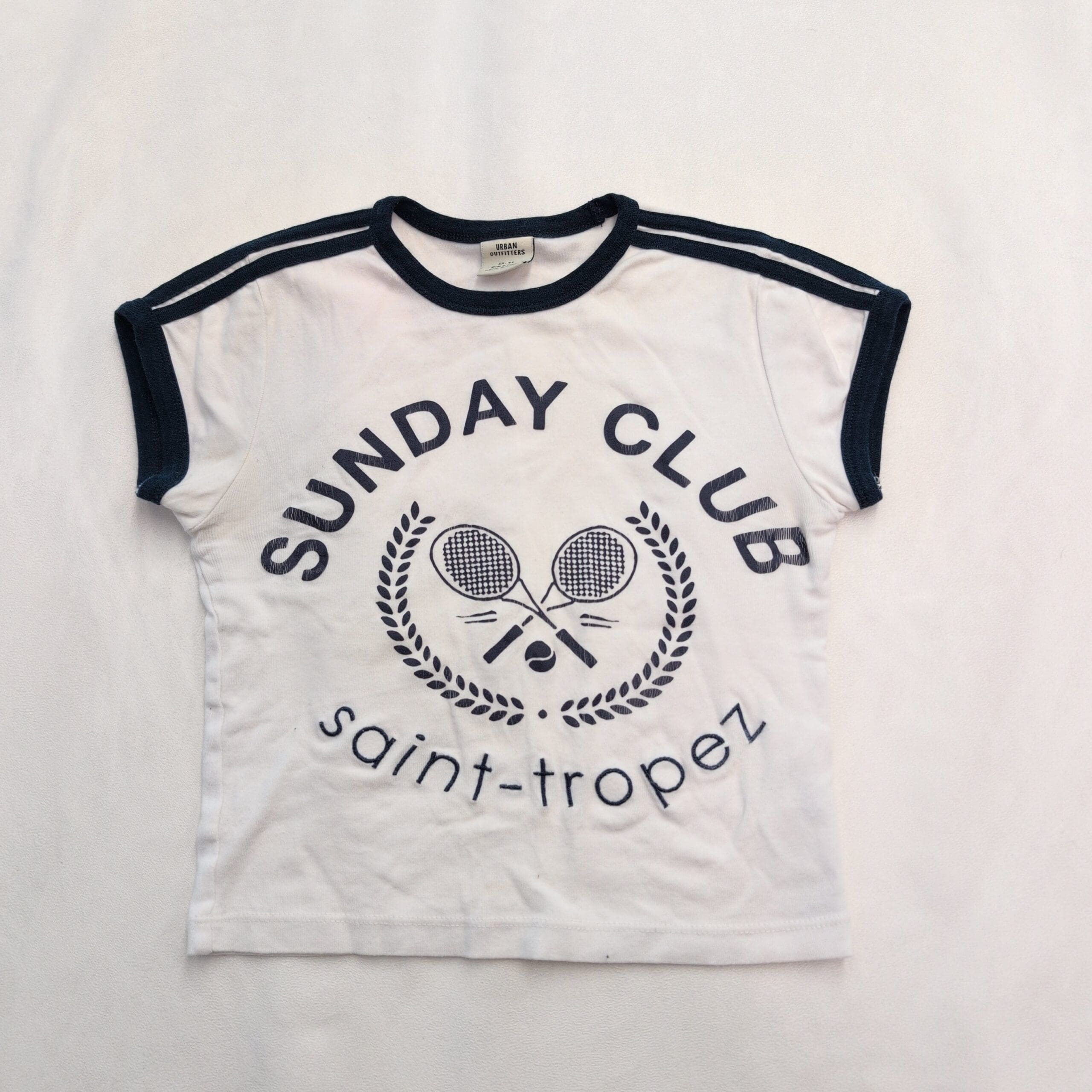 Urban Outfitters short-sleeve ringer tee in size XS. White body with navy contrast trim at the crew neckline, sleeve cuffs and shoulder stripe detail. Features a bold front graphic reading “SUNDAY CLUB” with crossed tennis rackets and “saint-tropez” text — a casual, sporty graphic perfect for everyday wear. Gently used condition; free of major rips, tears, stains, or flaws. Typical wear may be present (softening and slight fading consistent with gentle use).