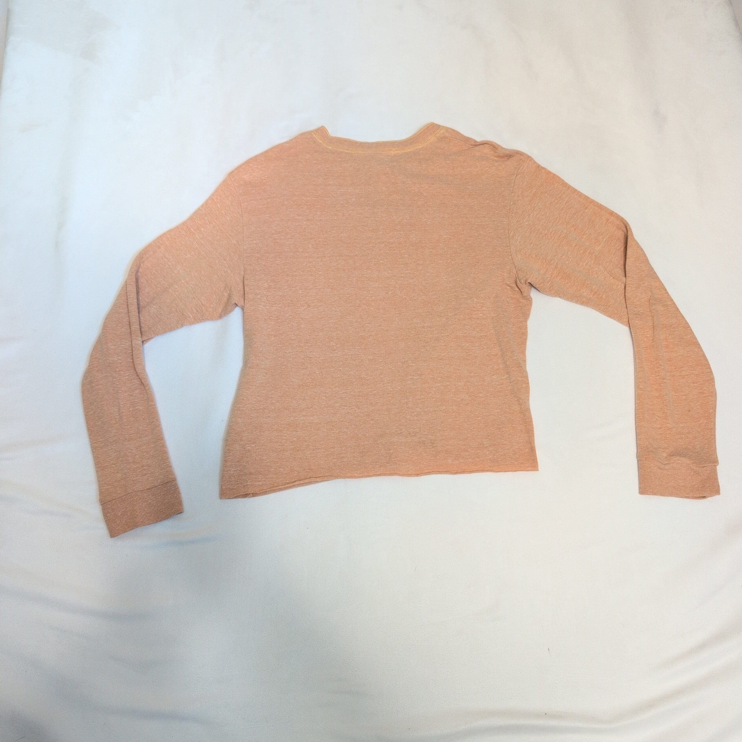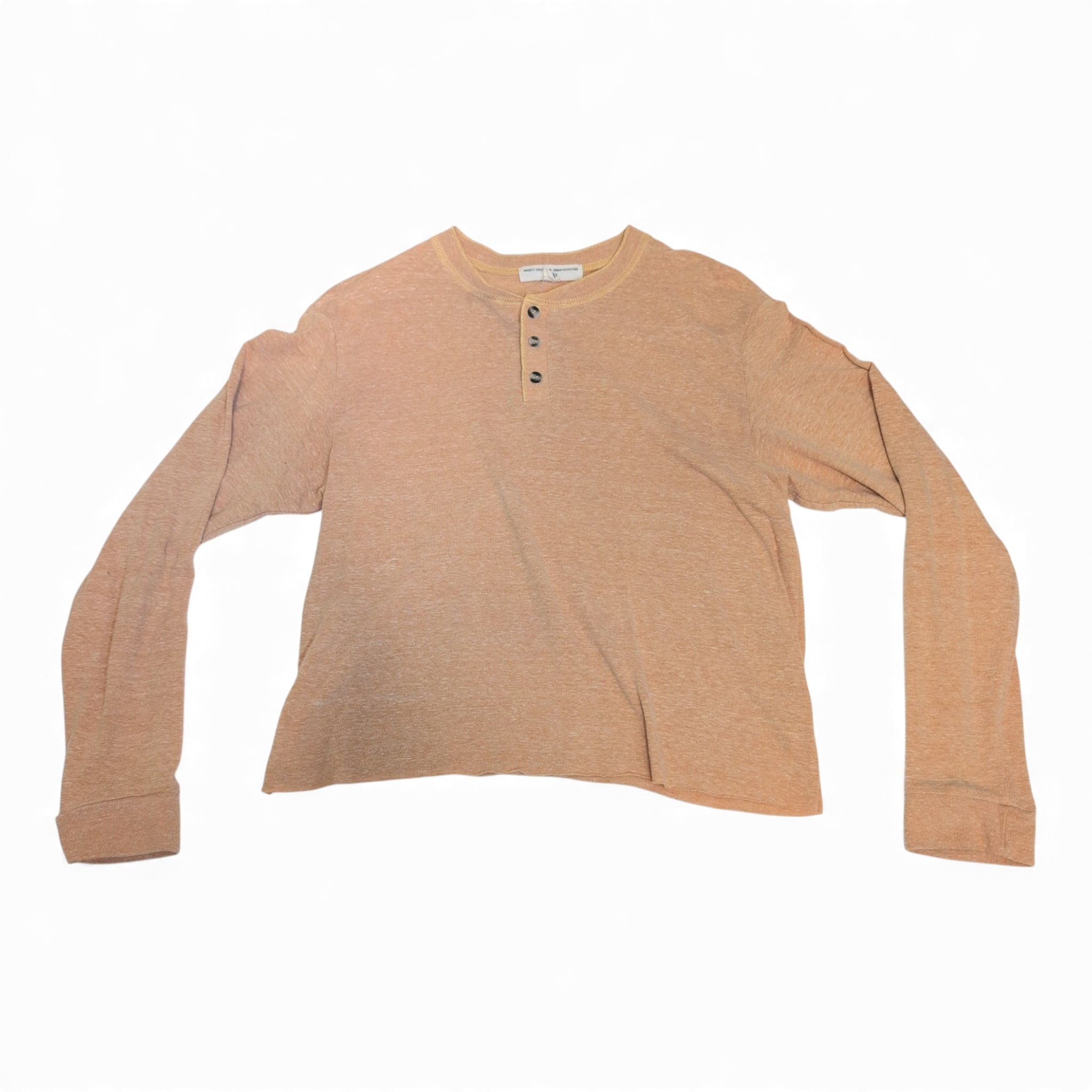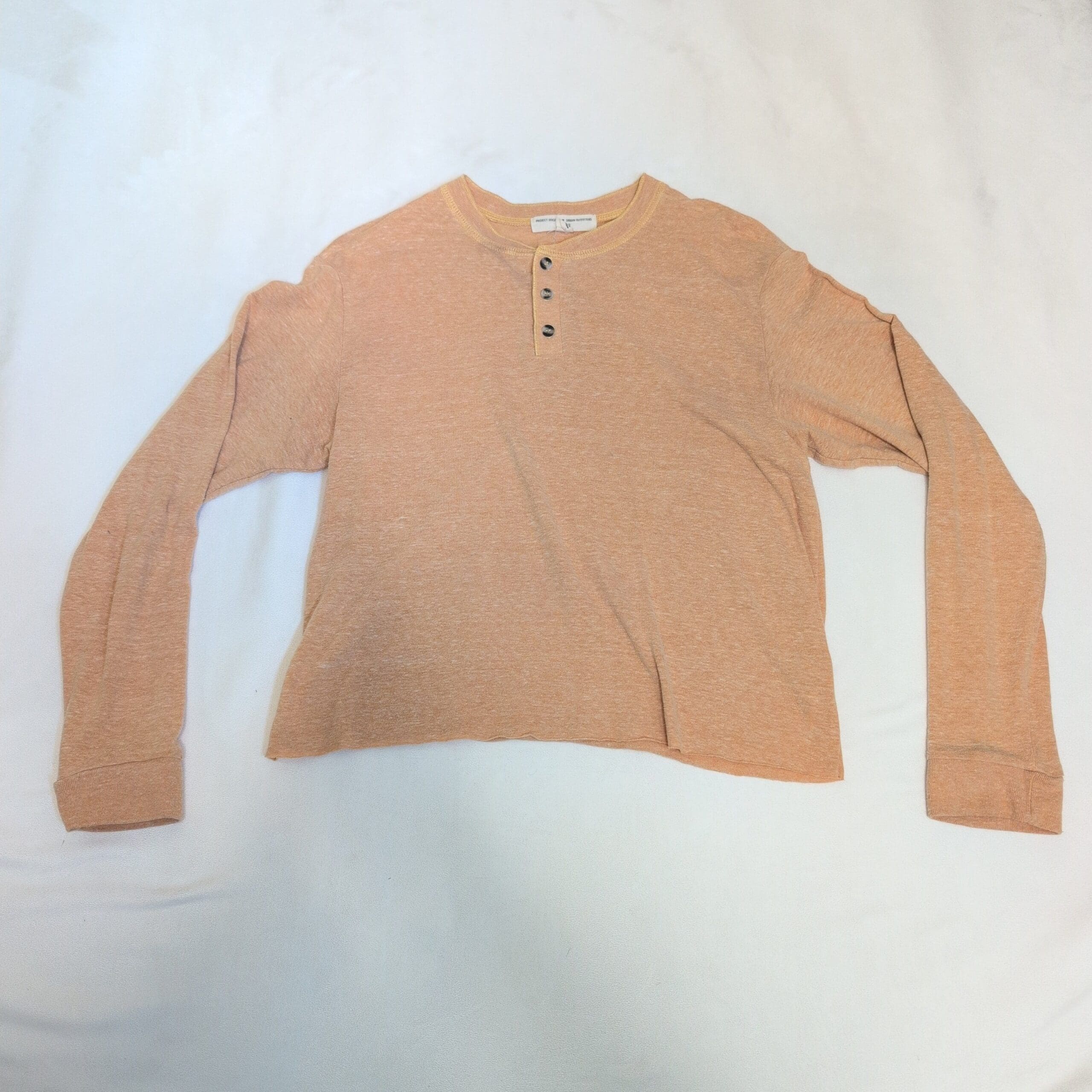 Urban Outfitters long-sleeve henley top in a soft yellow heather. Size S. Features a three-button placket, crew neckline, and a relaxed, slightly cropped silhouette — lightweight and perfect for layering or wearing on its own. Preowned and in good condition with light signs of wear; please review photos for details before purchasing.