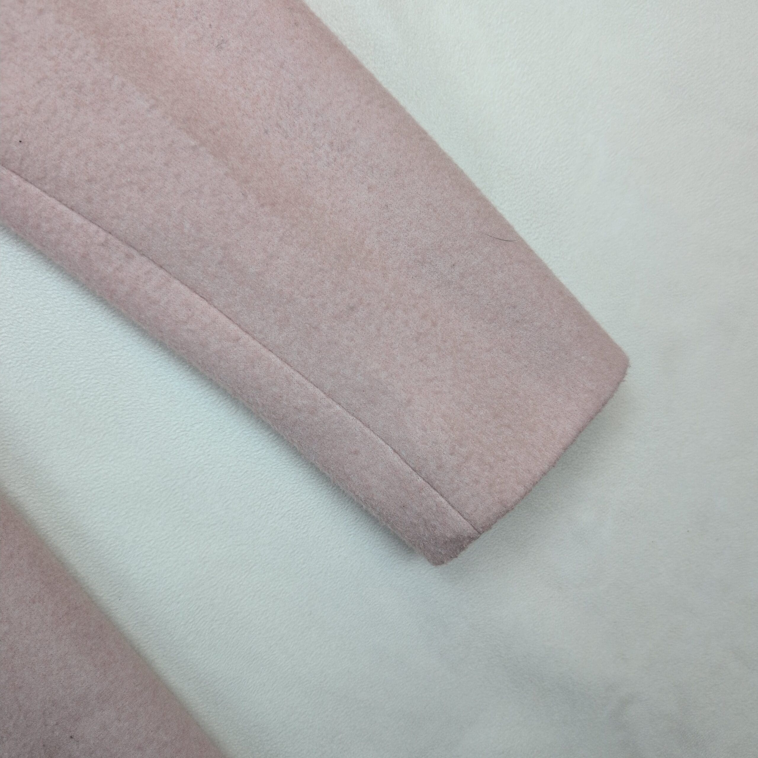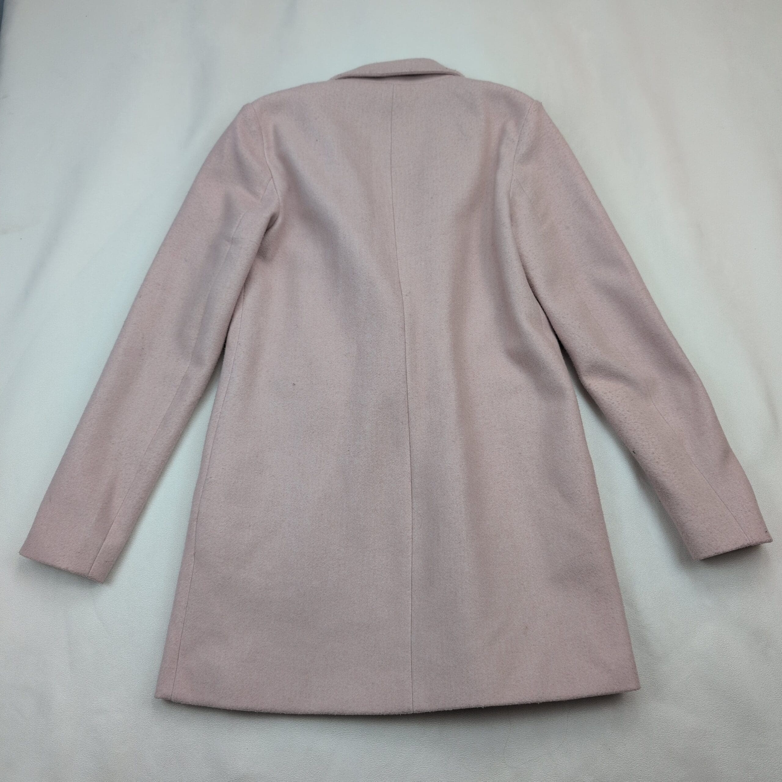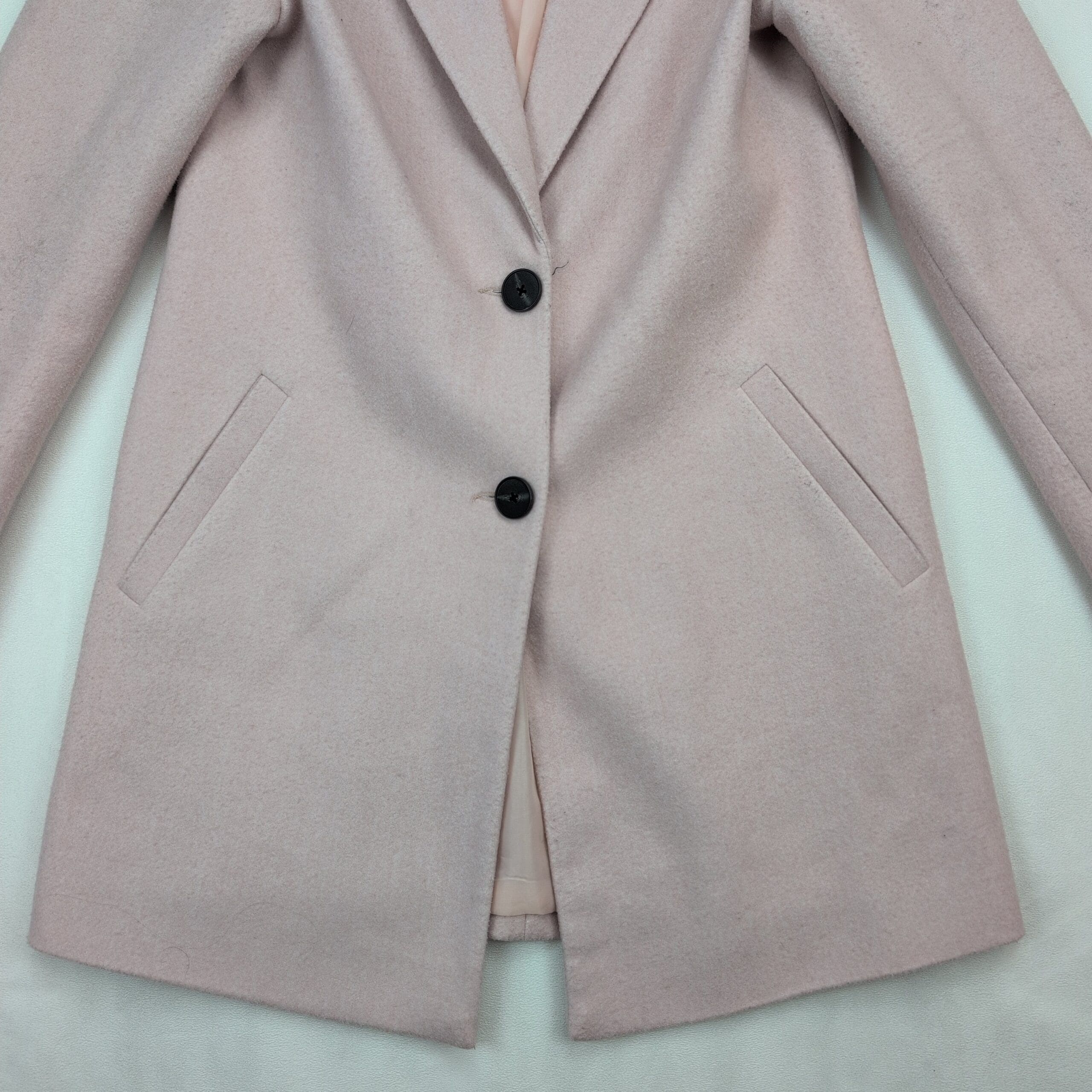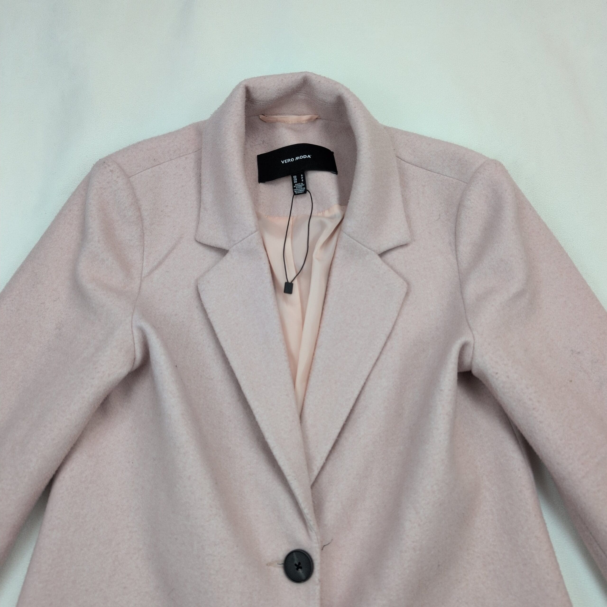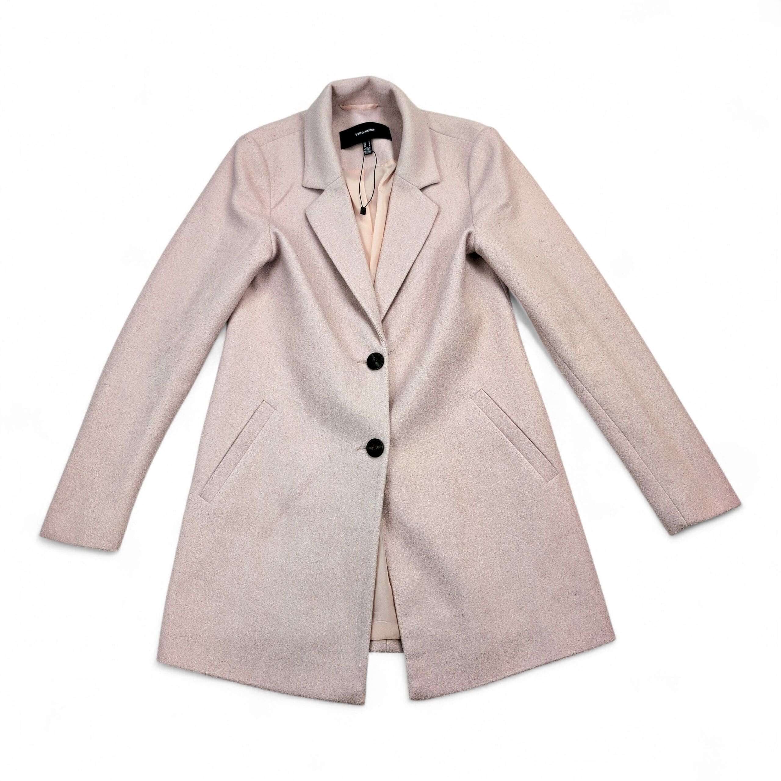 Vero Moda women’s tailored coat in a soft blush/pale pink. Size S. Single-breasted design with two front buttons, notch lapel, and angled welt pockets. Fully lined for a smooth fit and clean silhouette — great for work or dressy casual looks. Excellent used condition with no major rips, tears, or stains; normal light wear consistent with prior use. No measurements provided; please review photos for fit details.