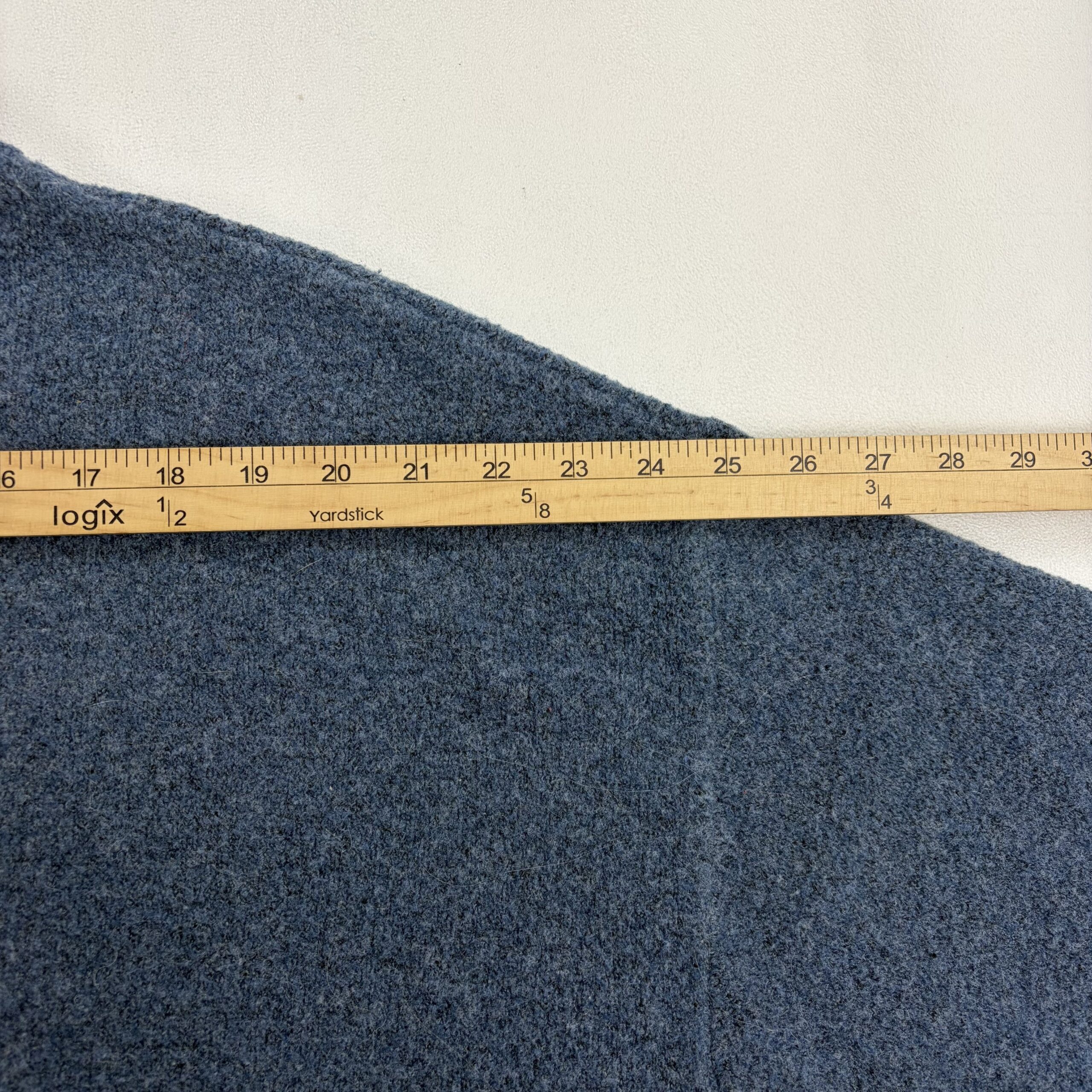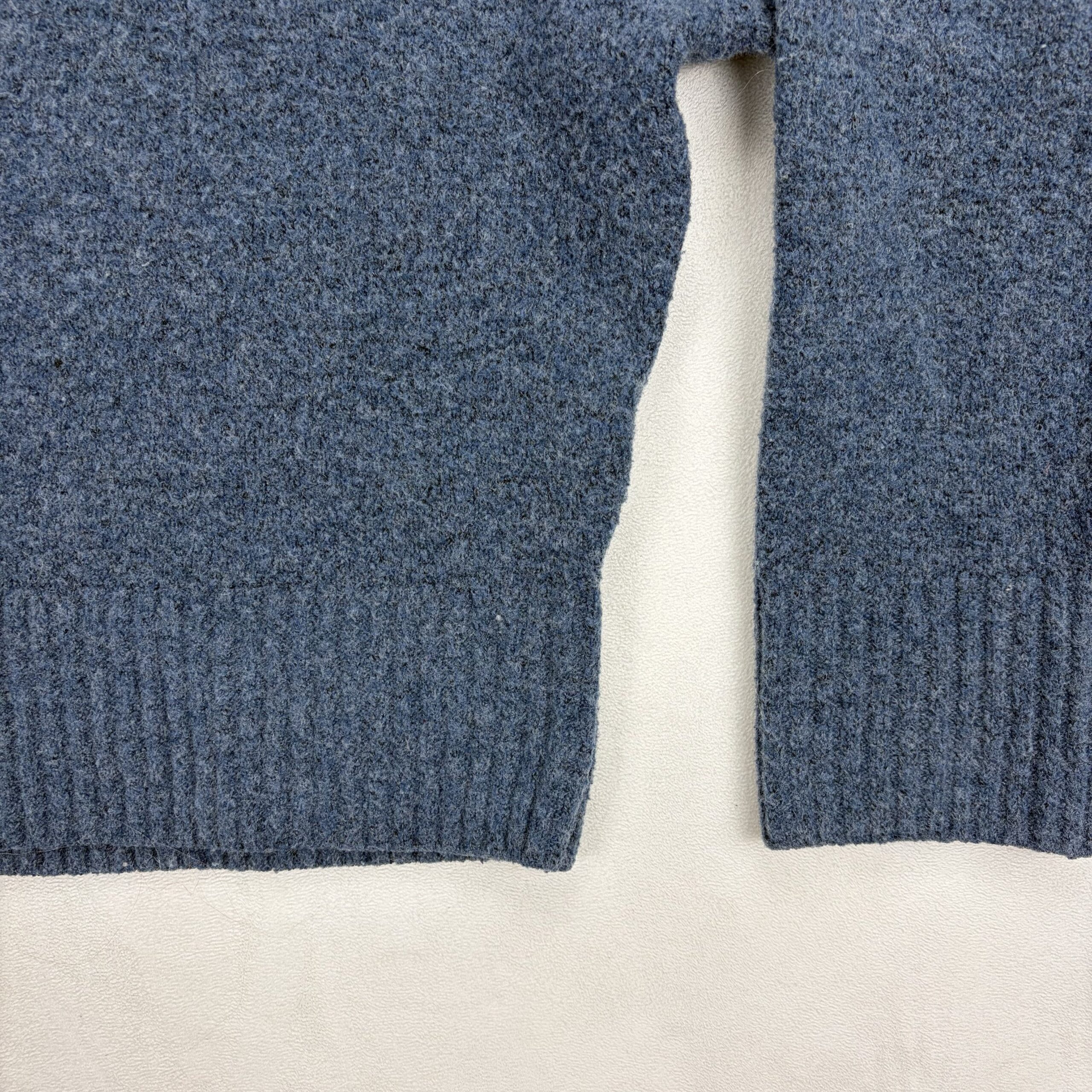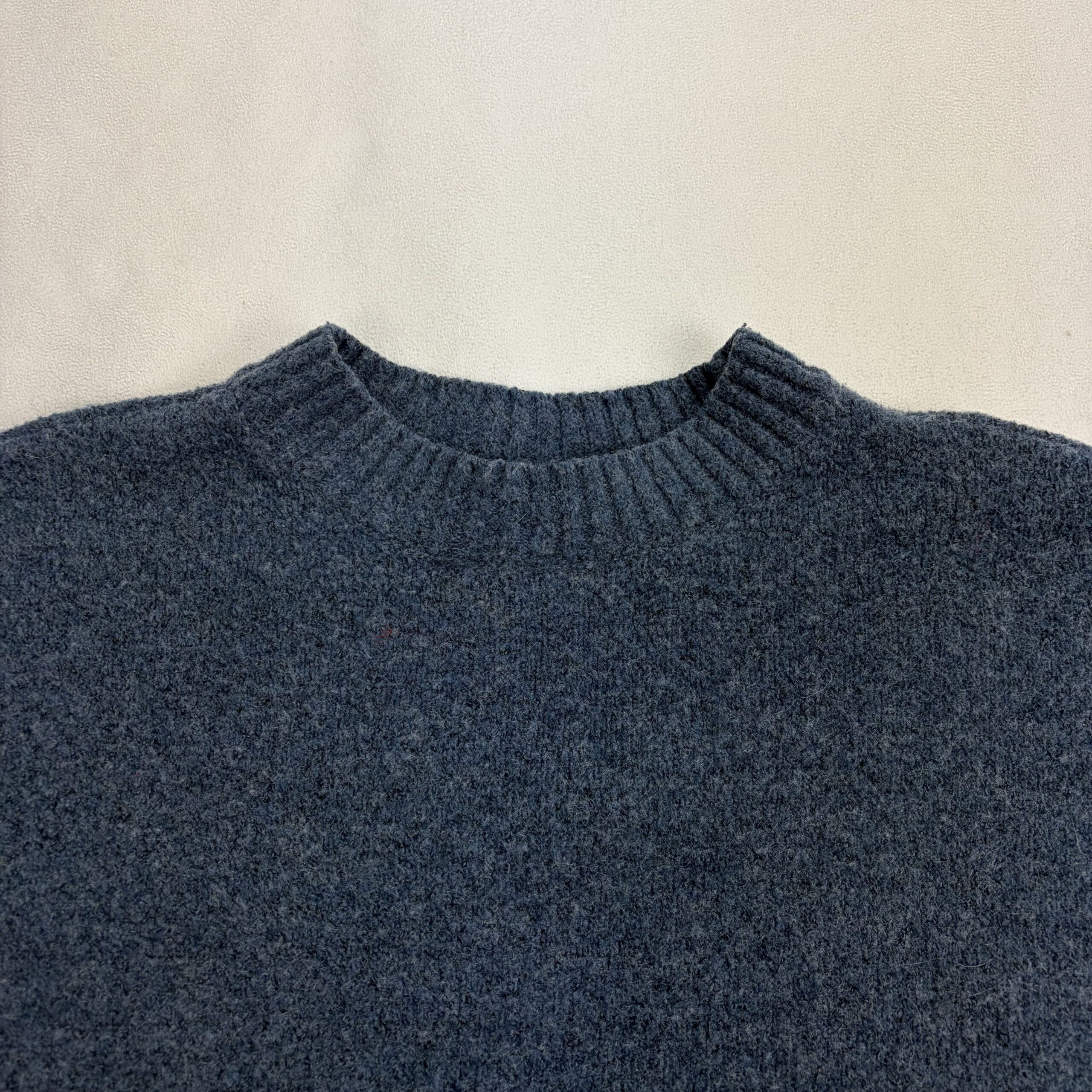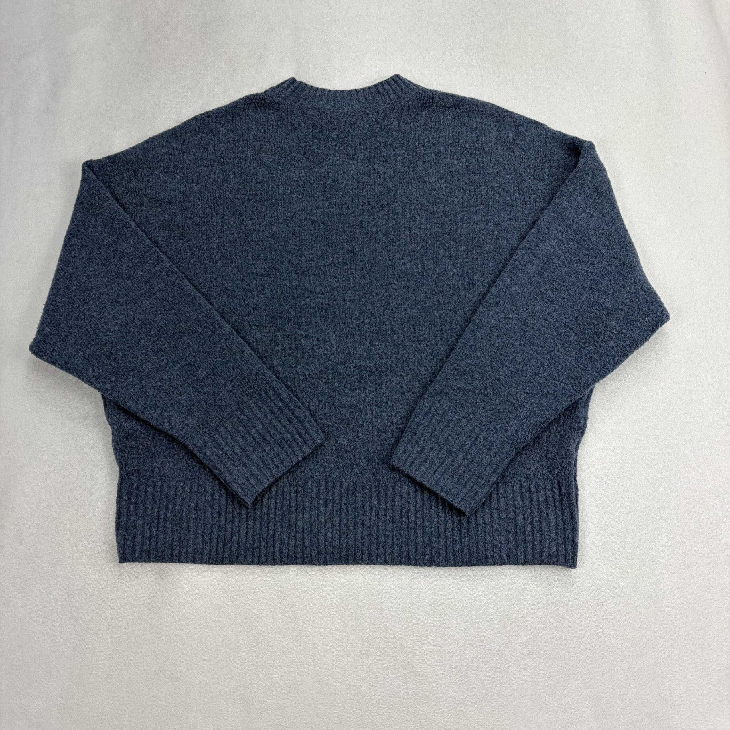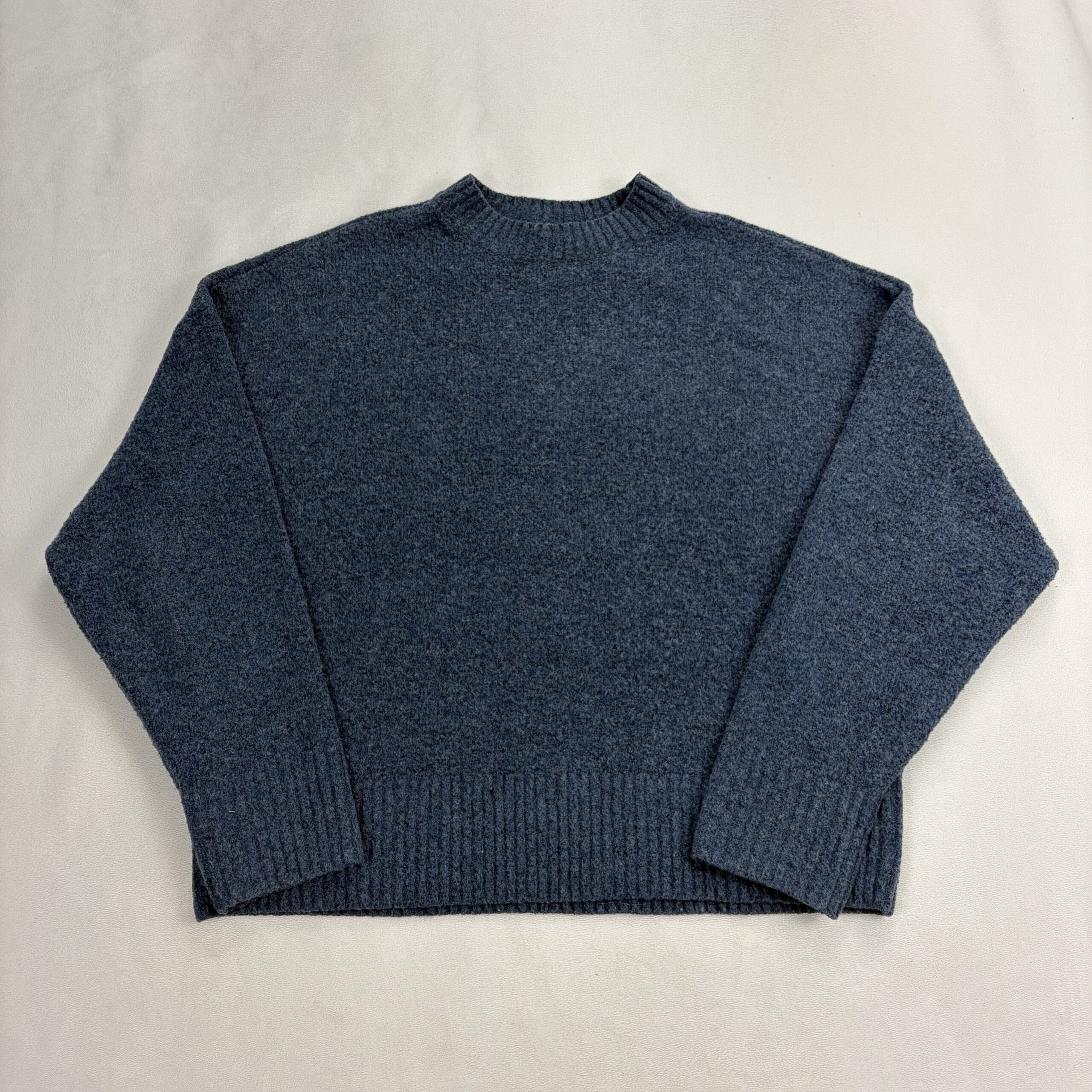 Vero Moda women’s crewneck sweater in size S. Textured heather navy knit with ribbed crew neckline, cuffs, and wide ribbed hem. Relaxed, slightly boxy silhouette with subtle side slits for easy layering — versatile for casual or office looks.