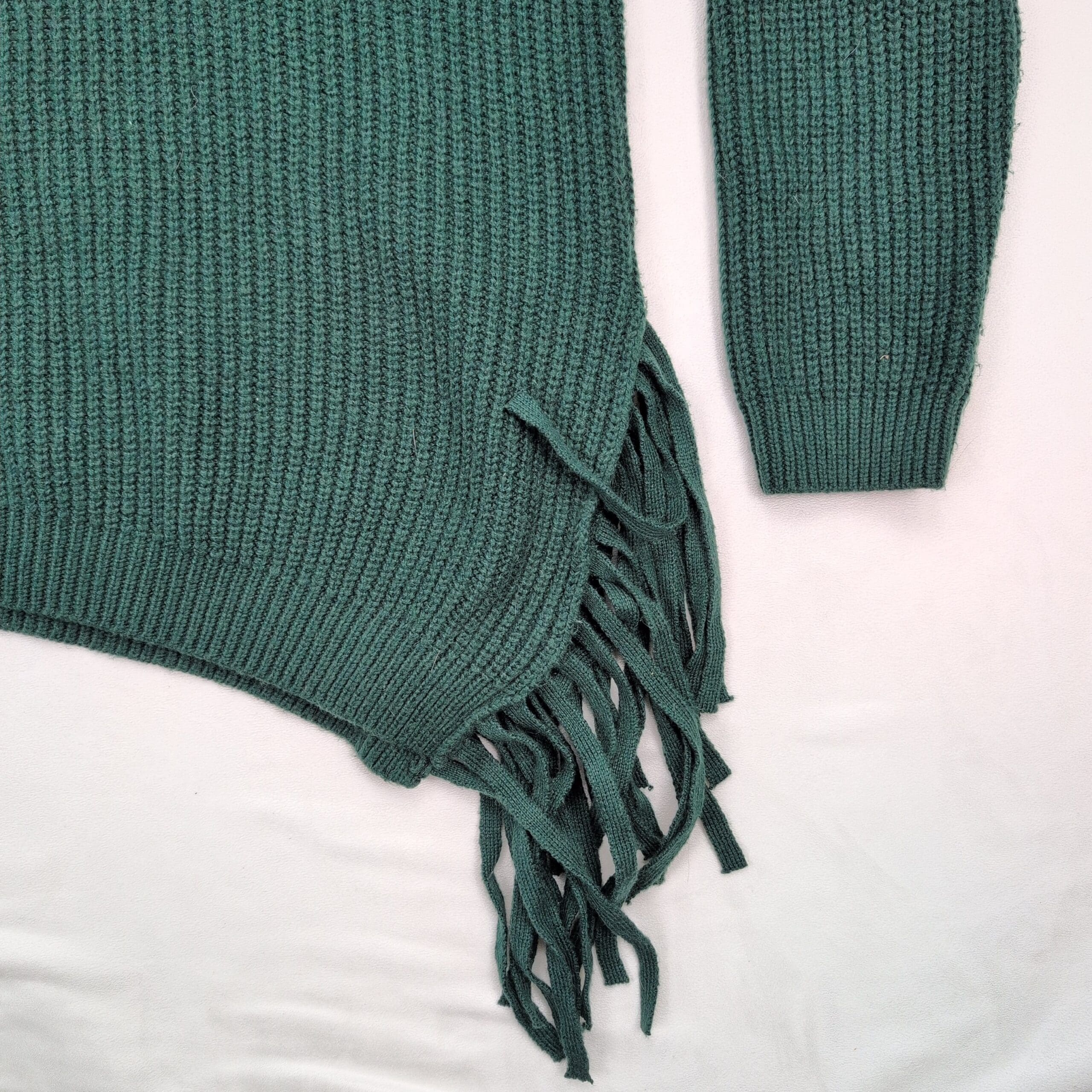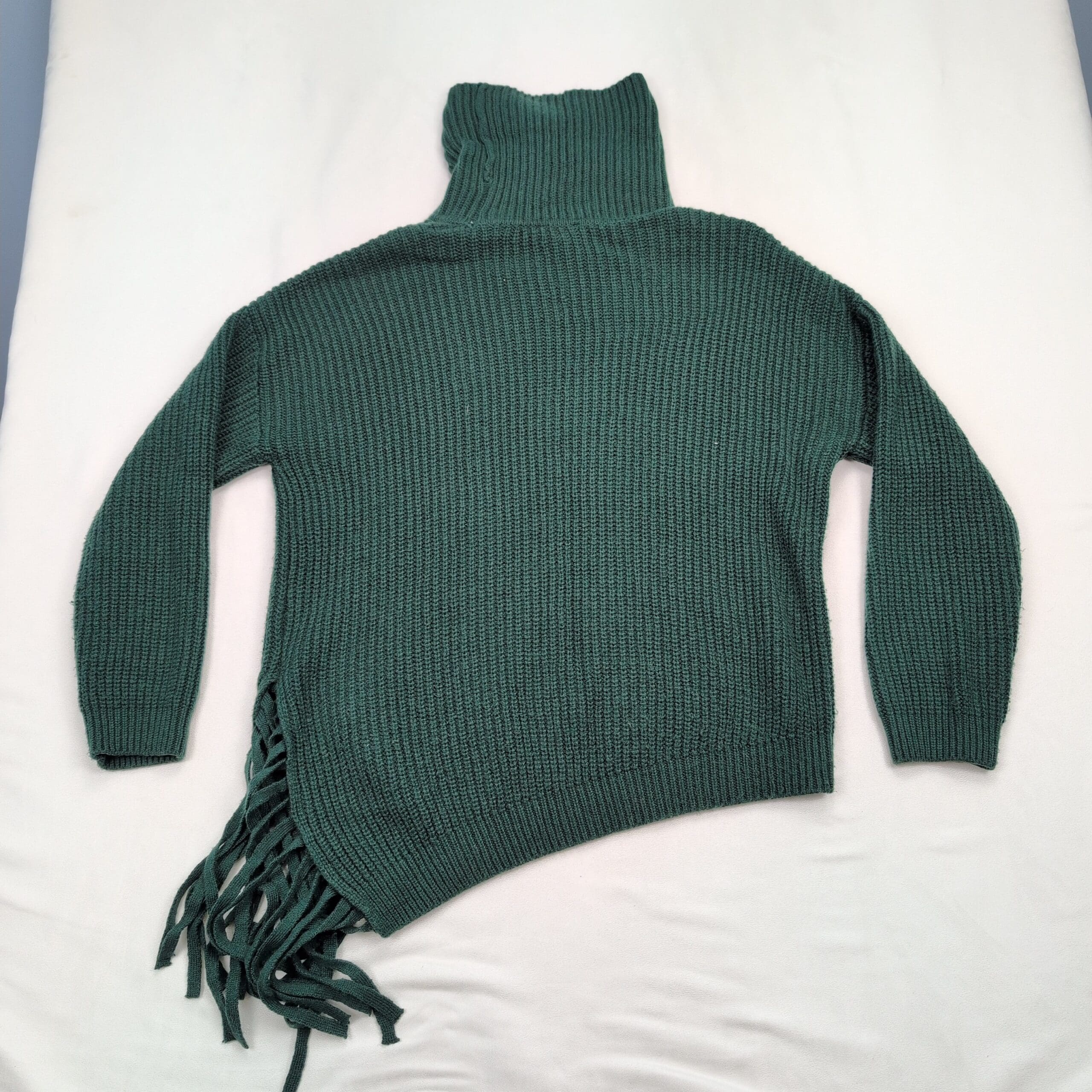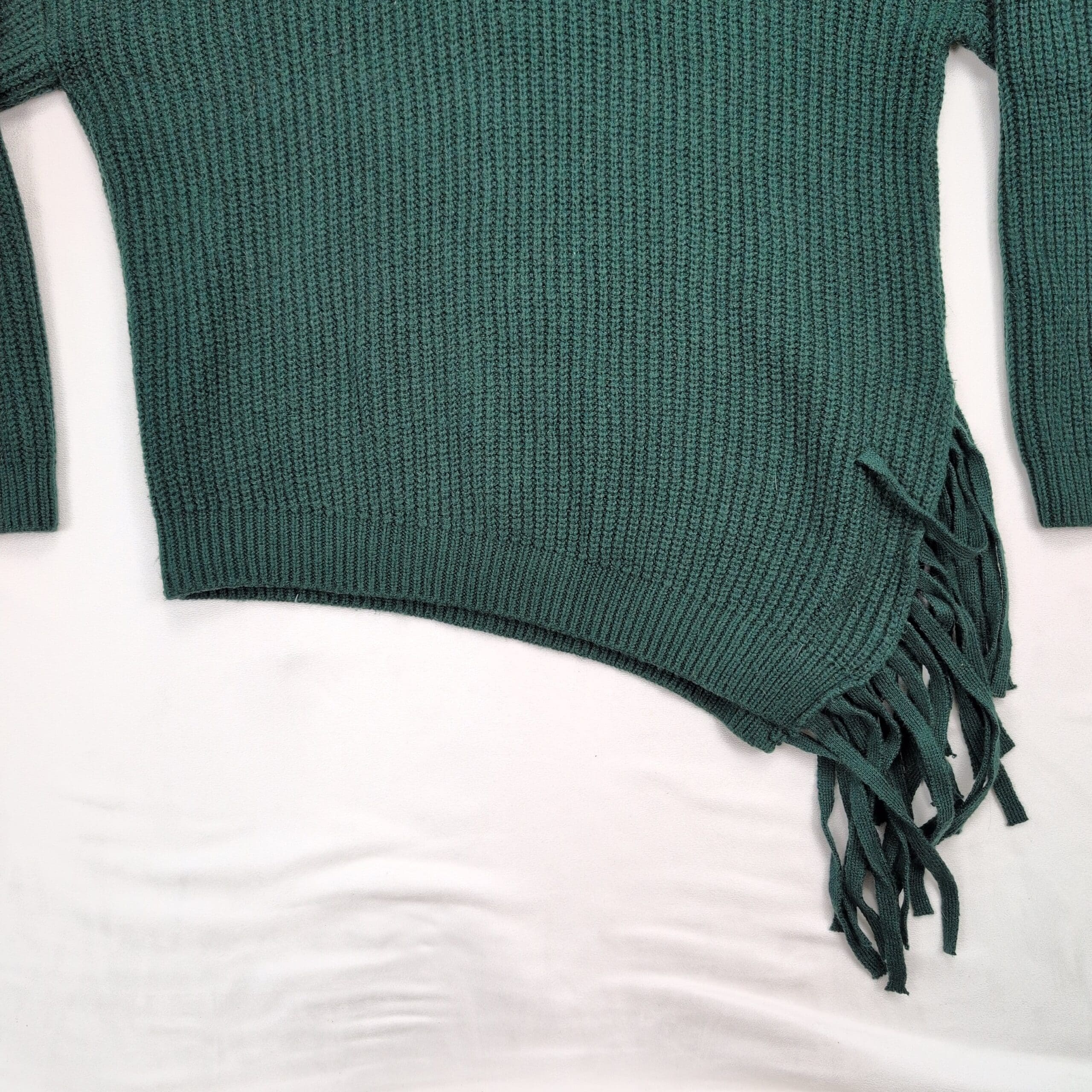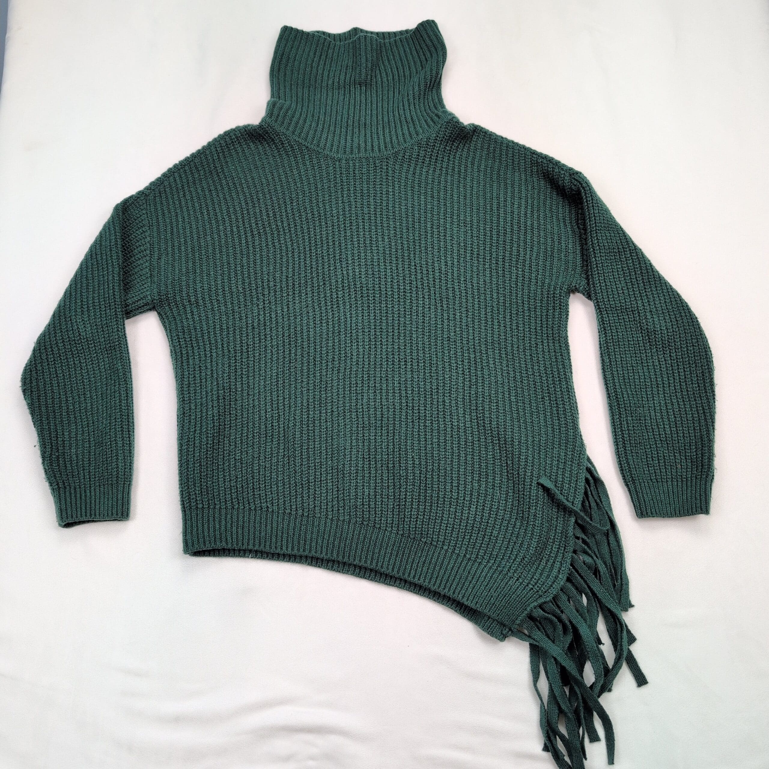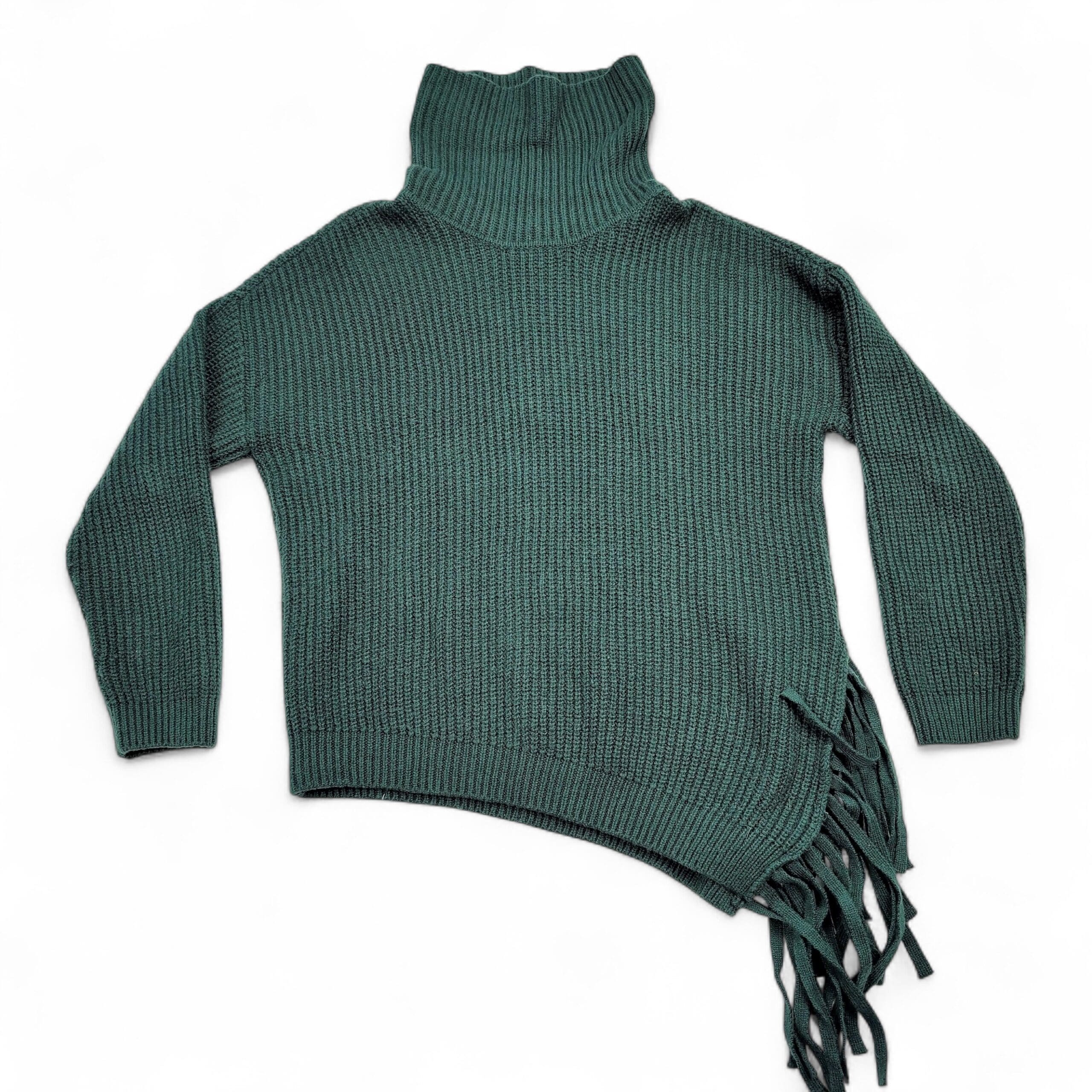 Vince Camuto women’s ribbed knit turtleneck sweater in a deep teal/forest green. Size M (standard). Features a tall funnel turtleneck, relaxed long sleeves, ribbed texture and an asymmetric hem with fringe along one side for a modern, boho-inspired look. Excellent used condition — free of major rips, tears, stains, or flaws; typical light wear may be present. Material/content not specified on label. Versatile for layering with jeans, skirts, or under coats for fall and winter styling.