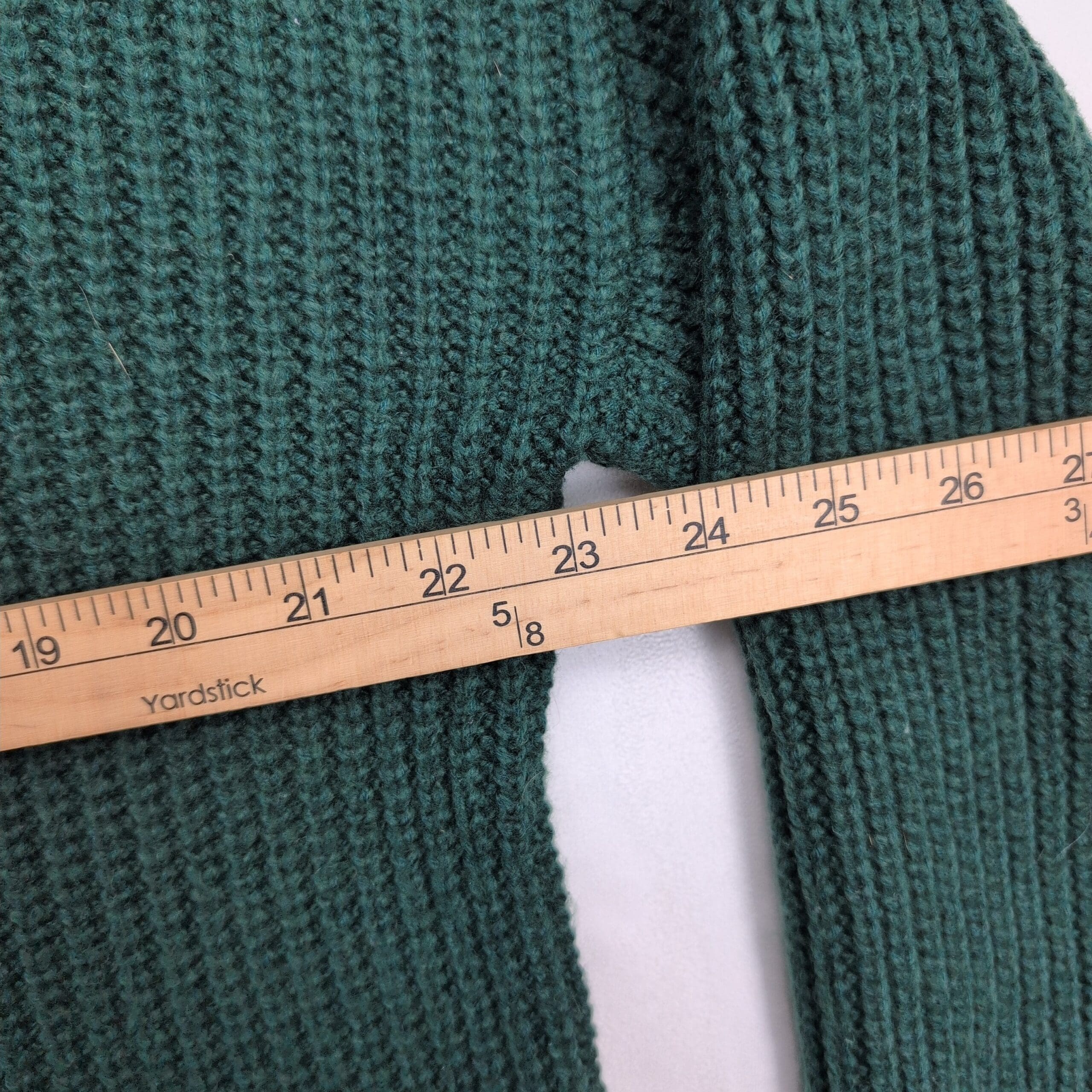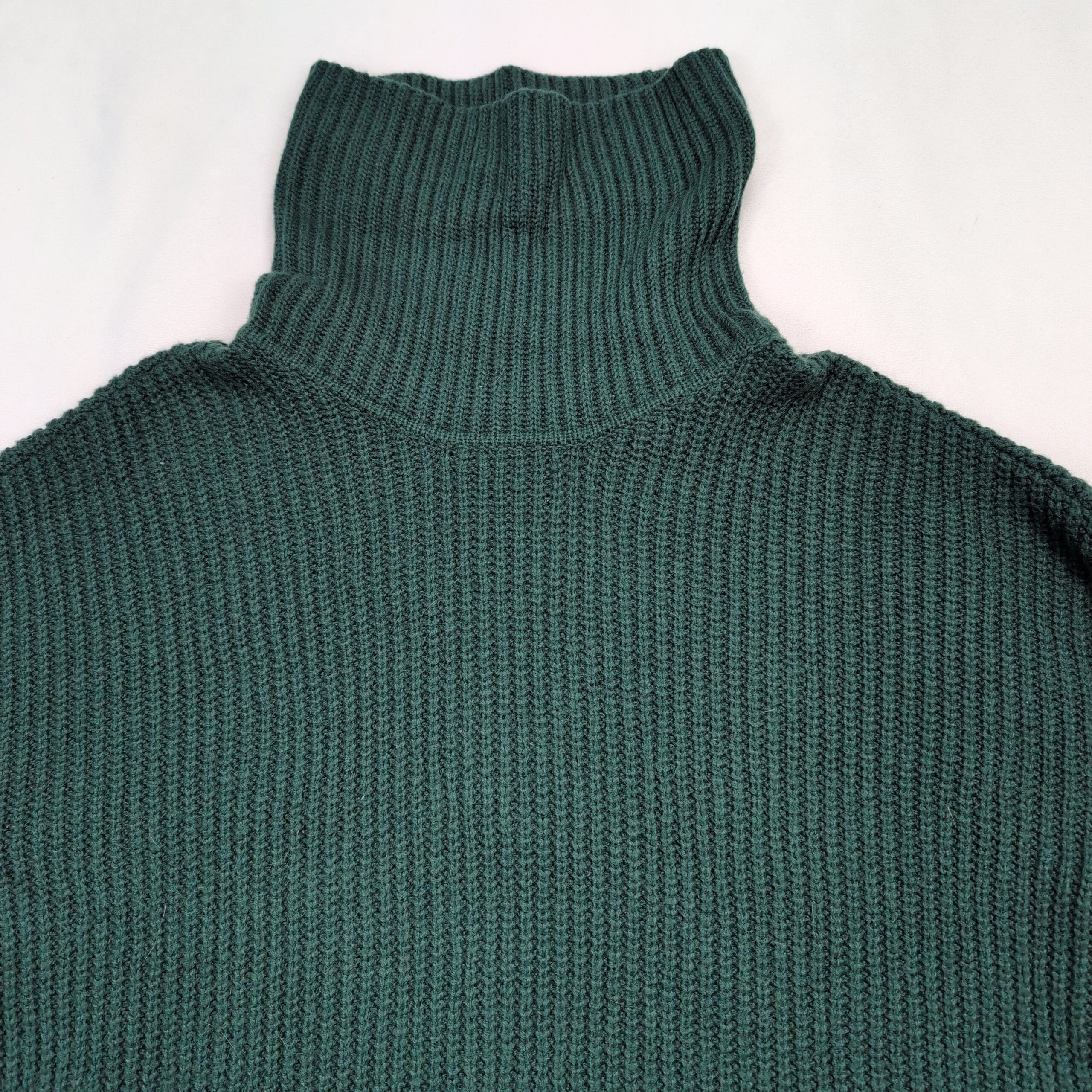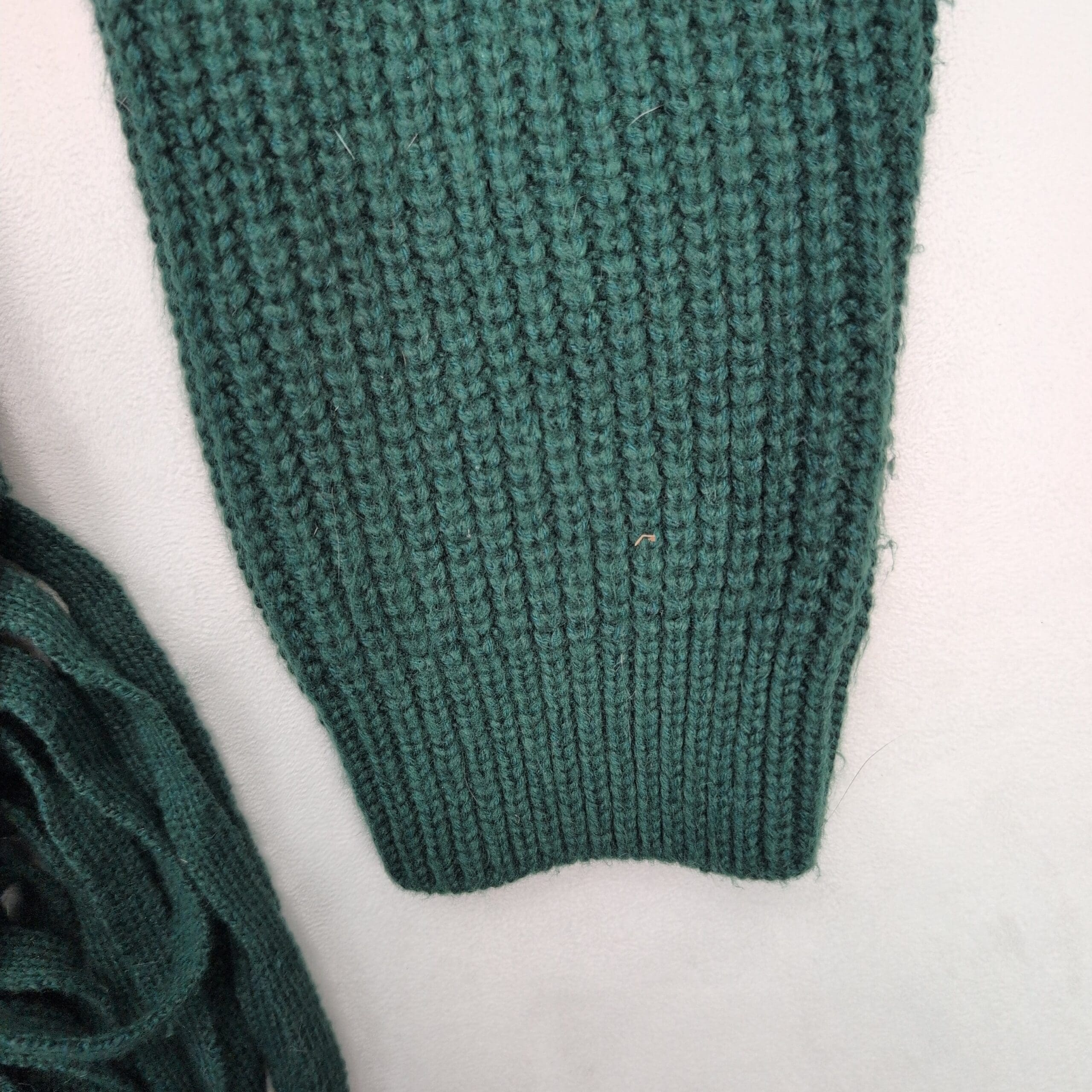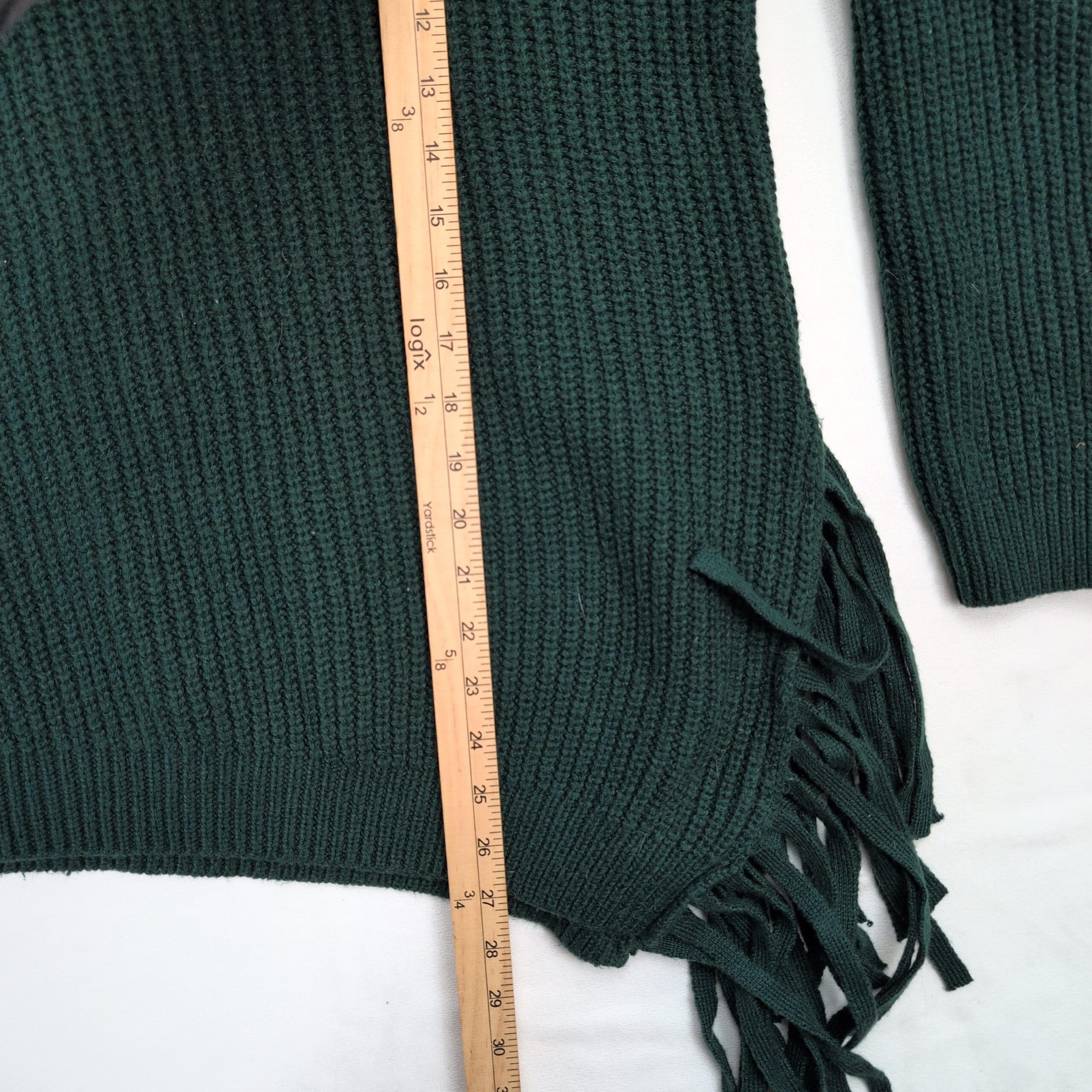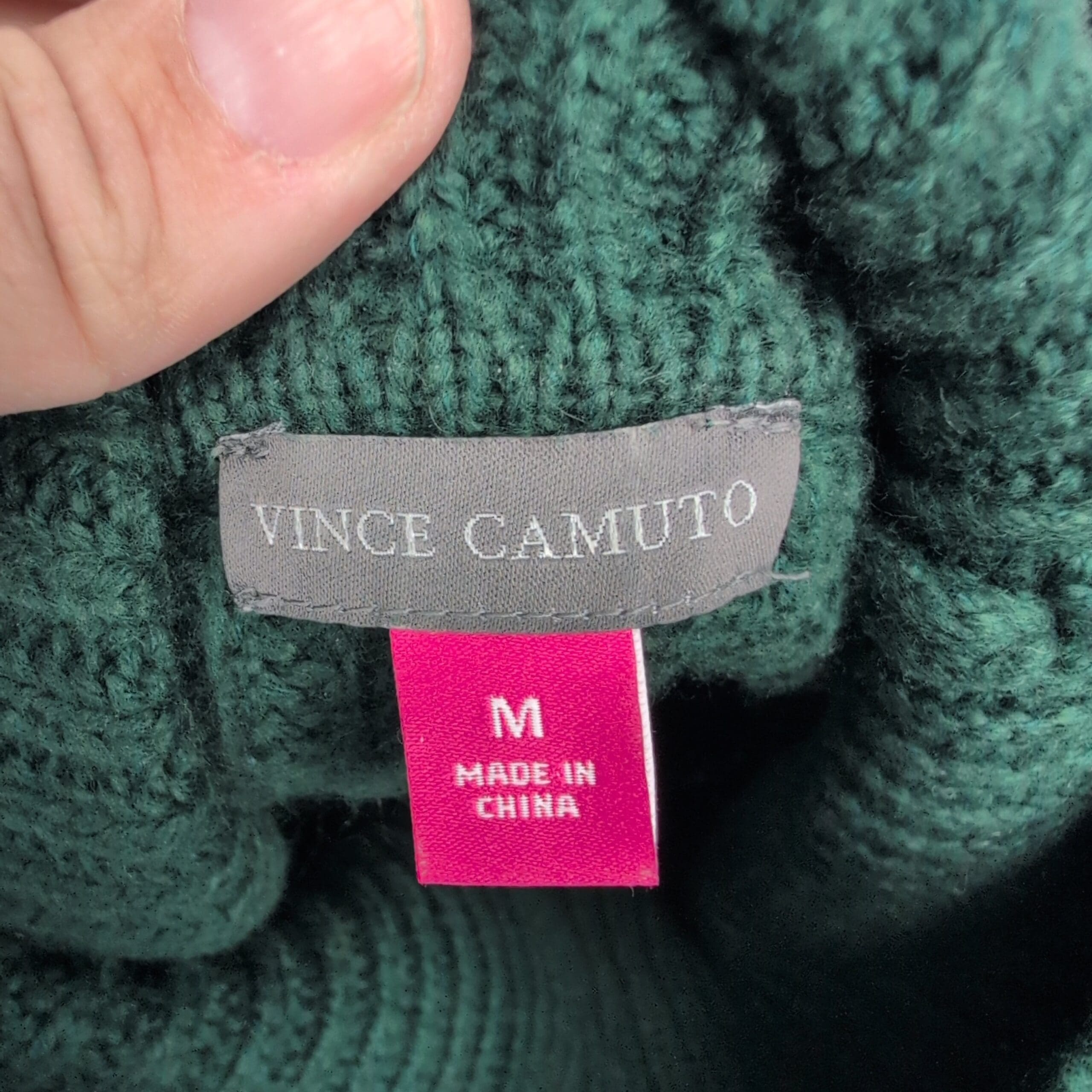 Vince Camuto women’s ribbed knit turtleneck sweater in a deep teal/forest green. Size M (standard). Features a tall funnel turtleneck, relaxed long sleeves, ribbed texture and an asymmetric hem with fringe along one side for a modern, boho-inspired look. Excellent used condition — free of major rips, tears, stains, or flaws; typical light wear may be present. Material/content not specified on label. Versatile for layering with jeans, skirts, or under coats for fall and winter styling.