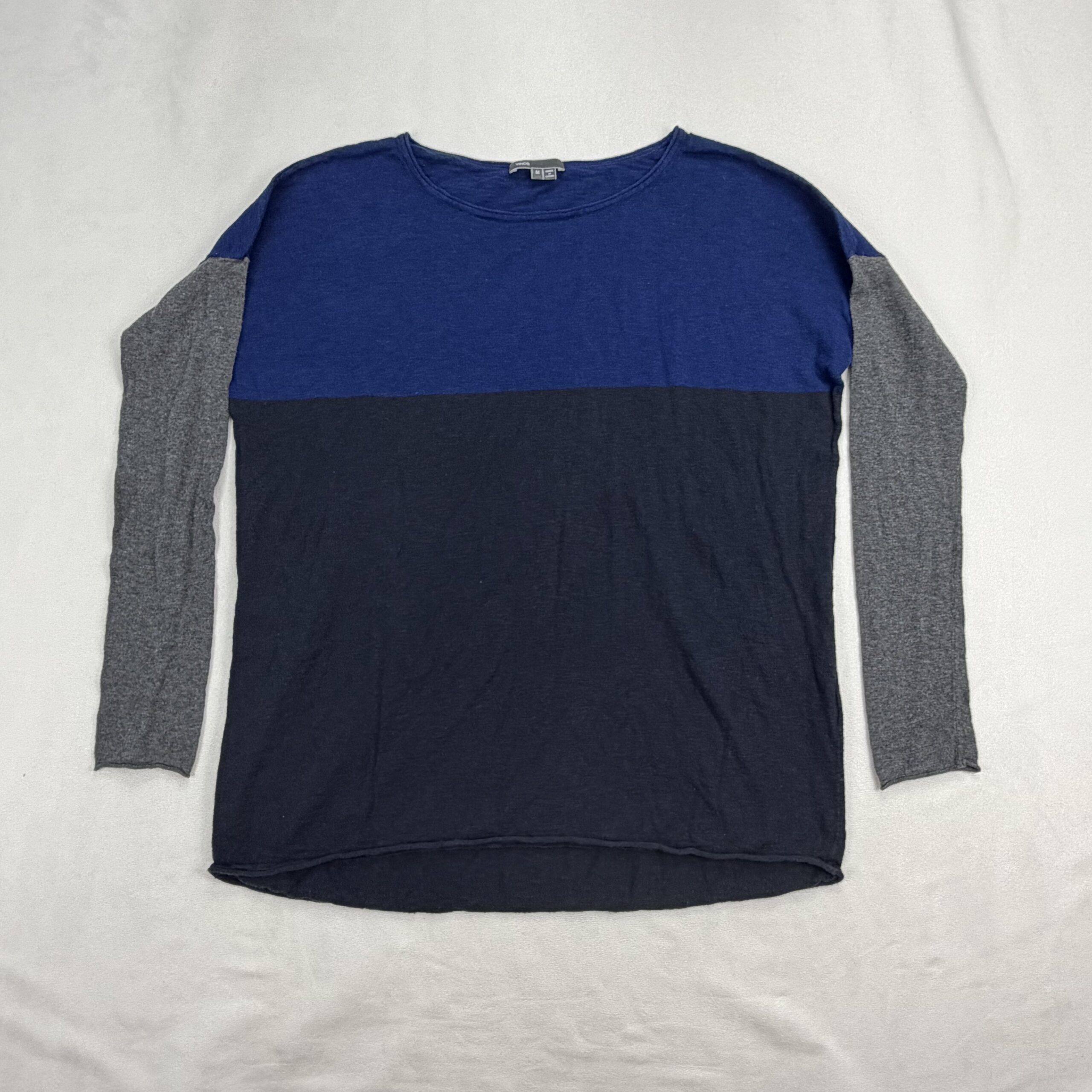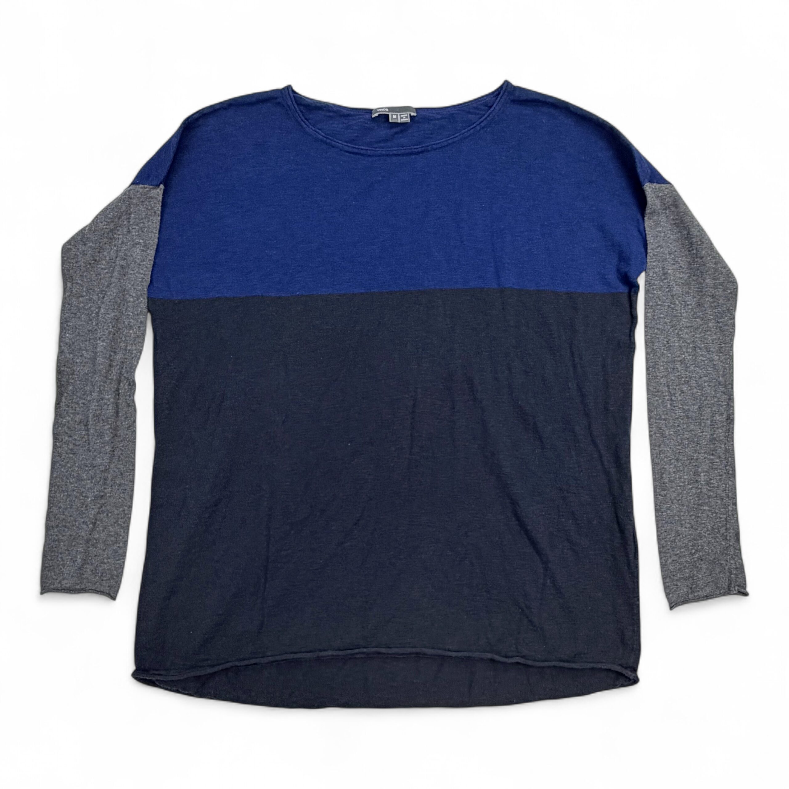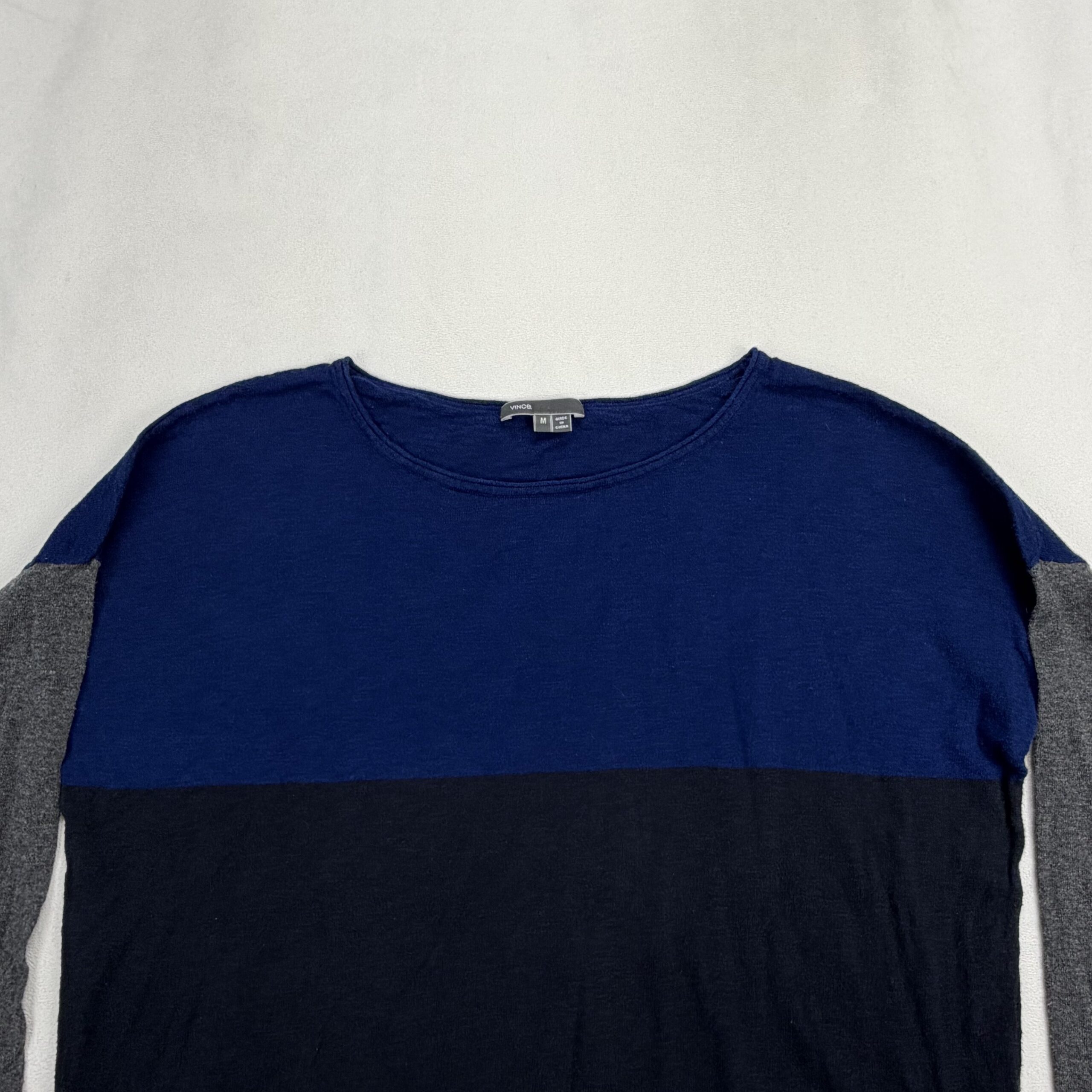 Vince colorblock crewneck sweater in size M. Features a cobalt-blue yoke, navy body and heather gray sleeves for a modern, versatile look. Scoop/crew neckline with long sleeves and a relaxed, lightweight knit ideal for layering. Excellent used condition — free of major rips, stains, or flaws; typical light wear may be present.