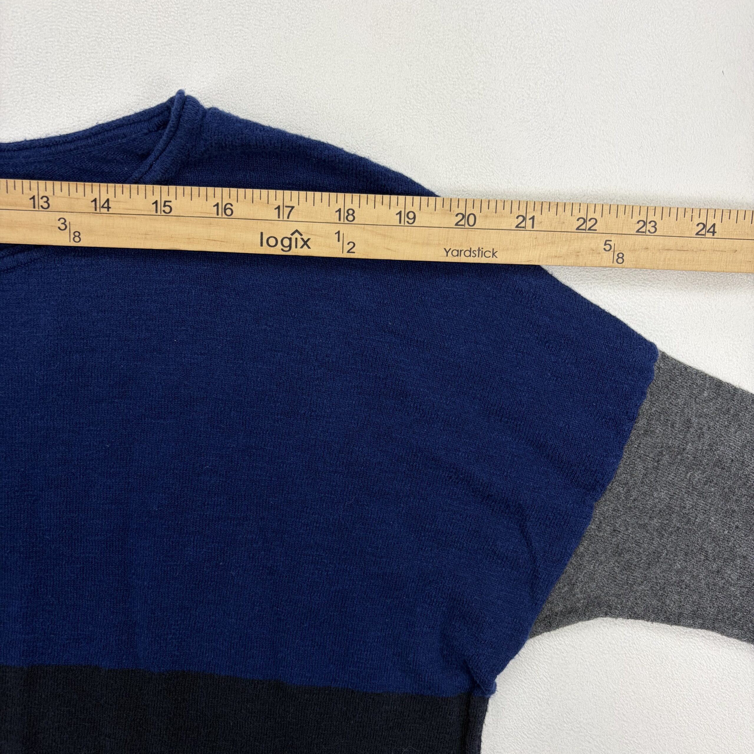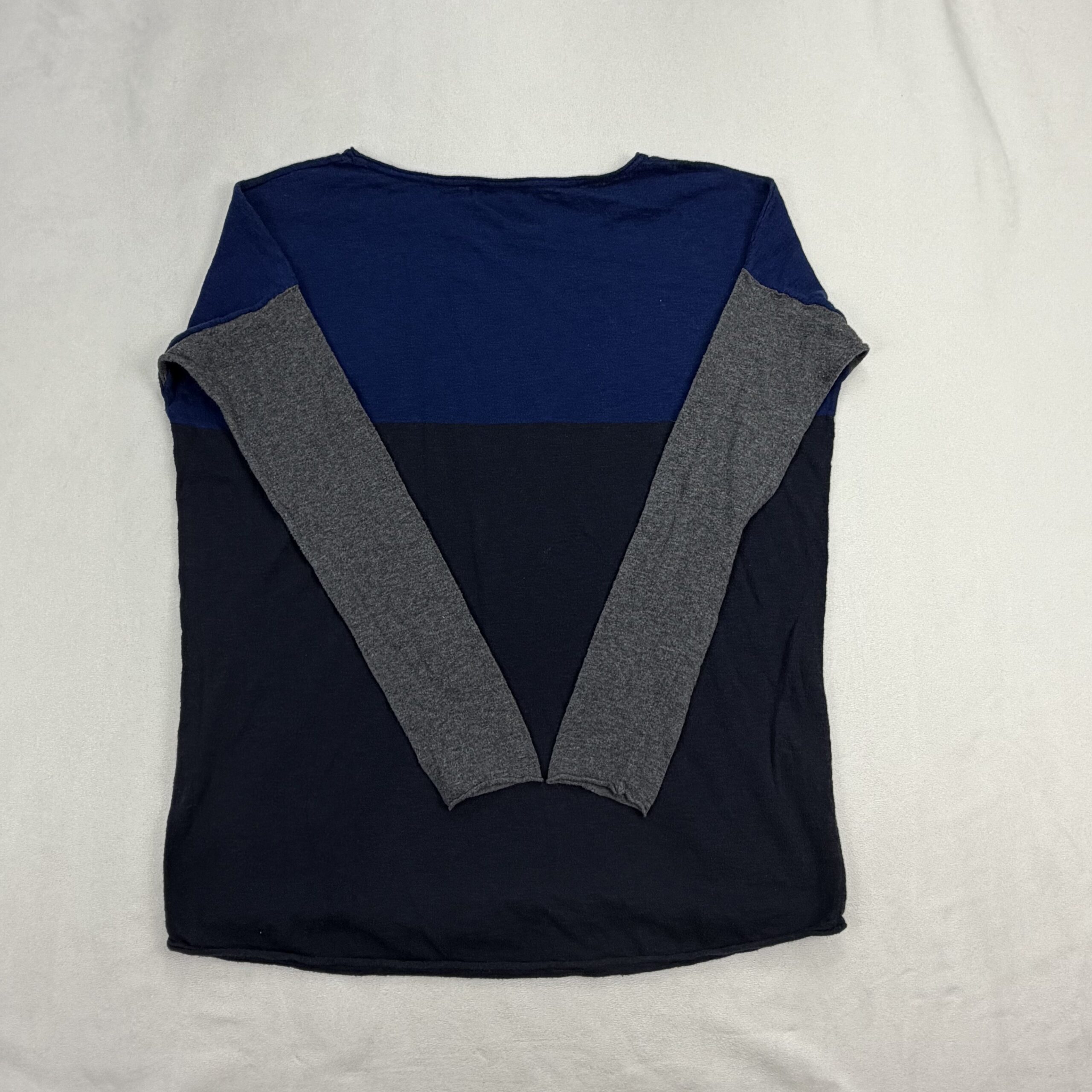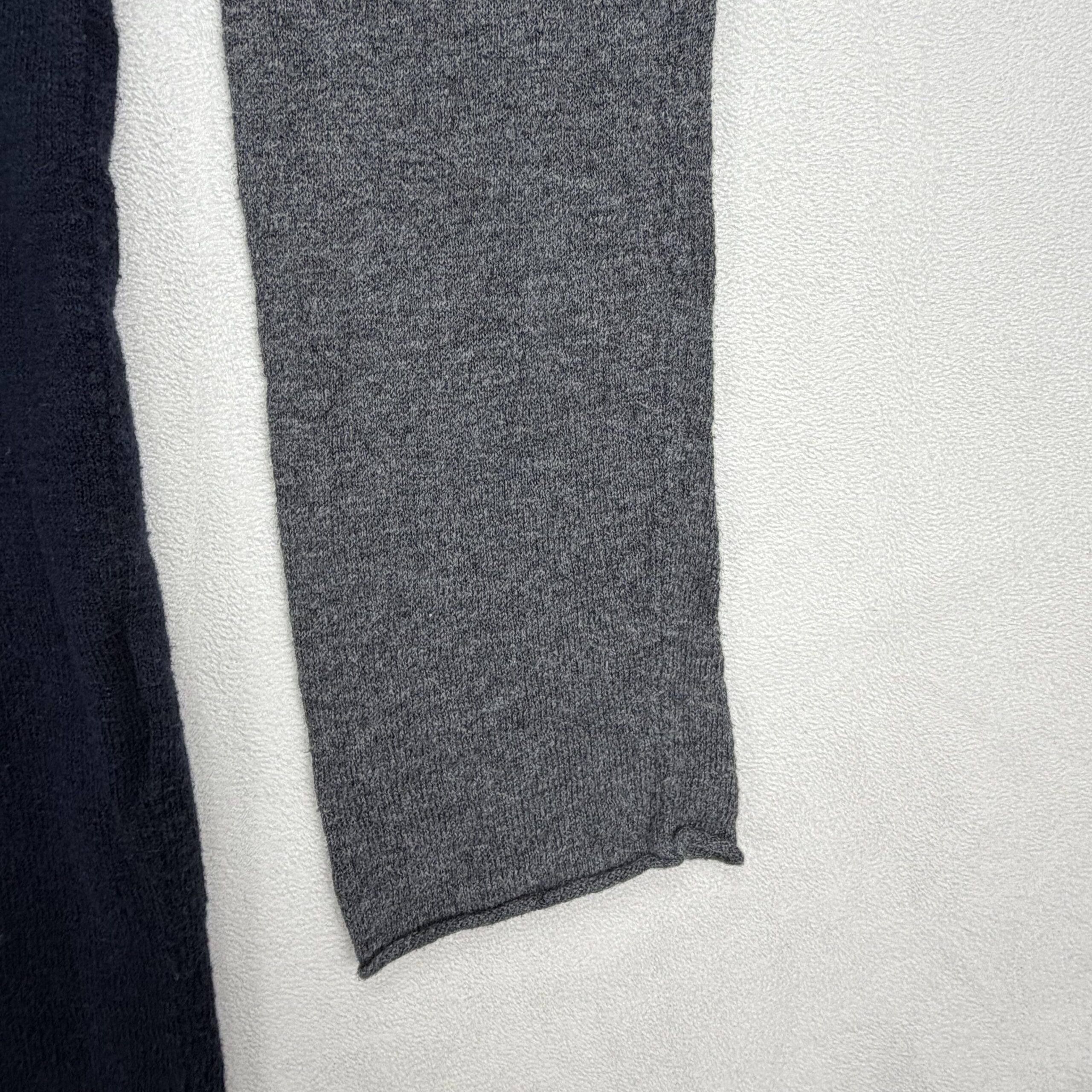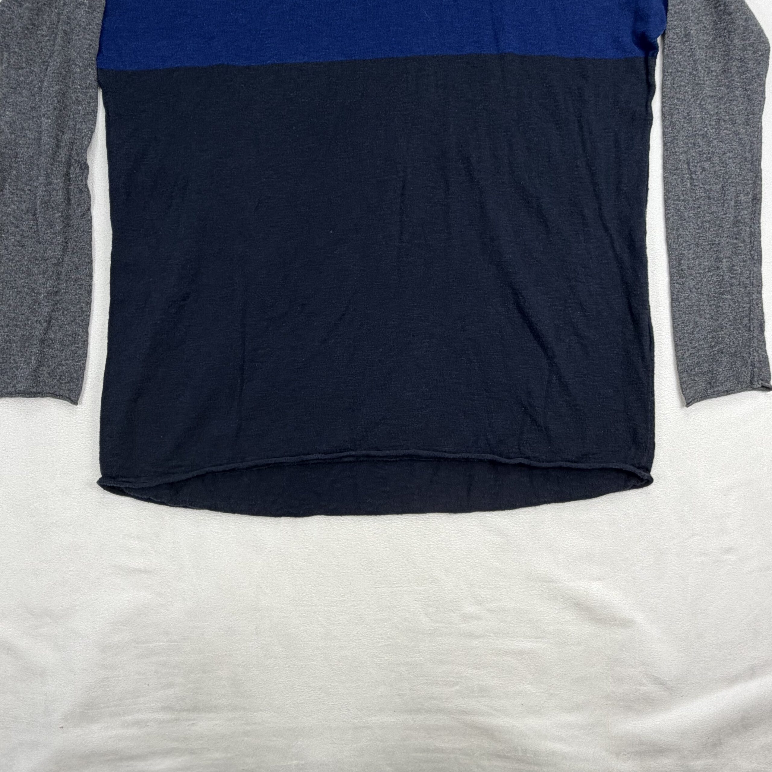 Vince colorblock crewneck sweater in size M. Features a cobalt-blue yoke, navy body and heather gray sleeves for a modern, versatile look. Scoop/crew neckline with long sleeves and a relaxed, lightweight knit ideal for layering. Excellent used condition — free of major rips, stains, or flaws; typical light wear may be present.