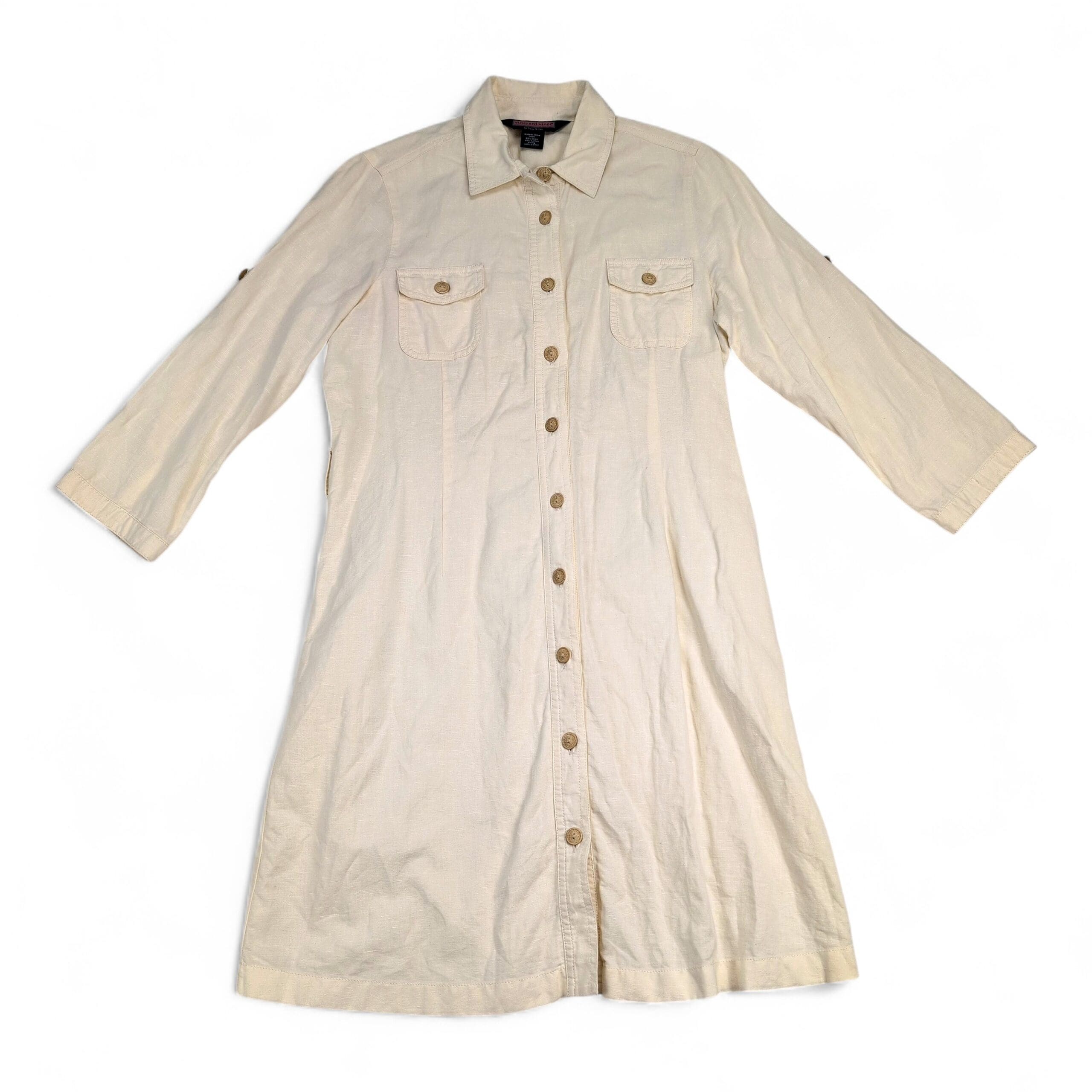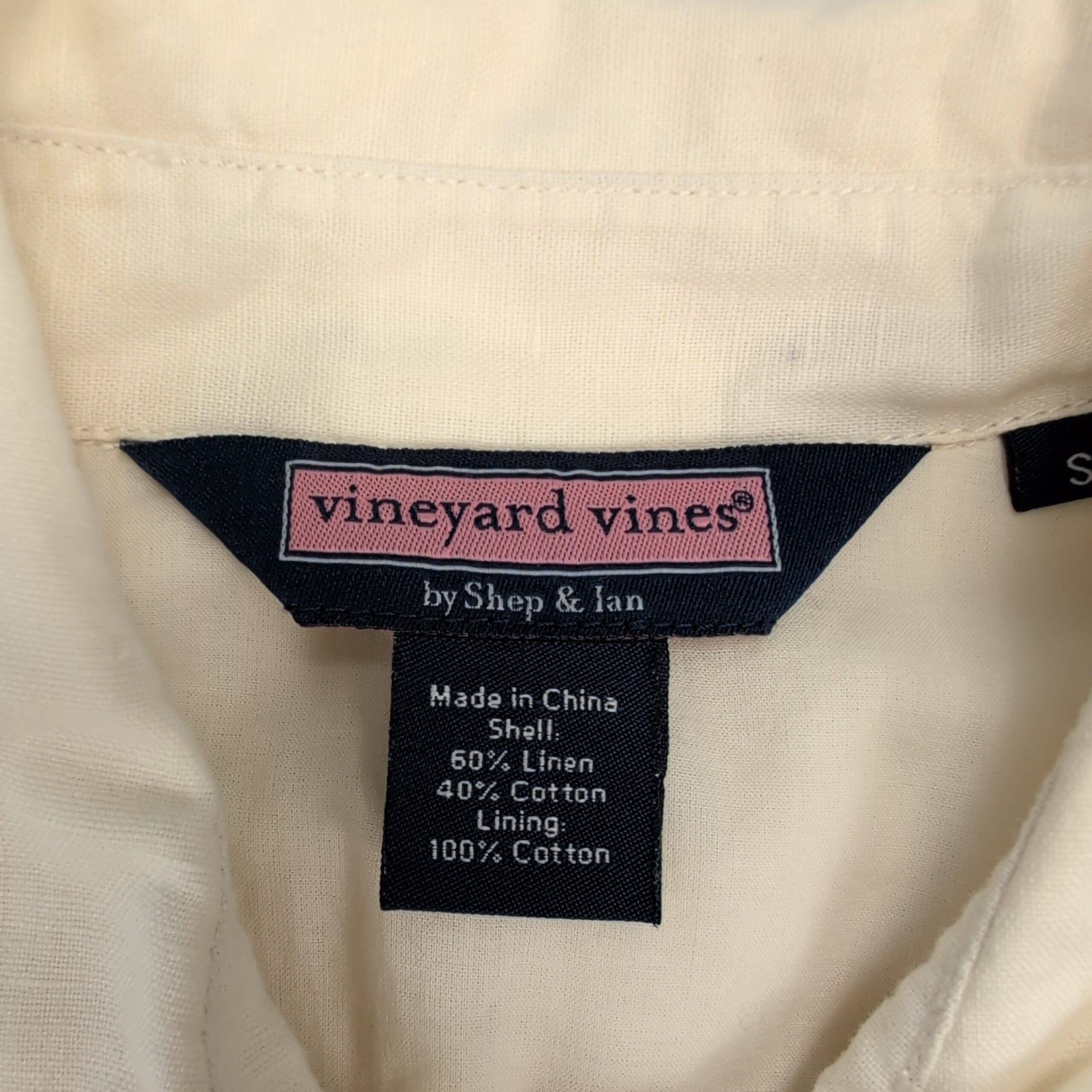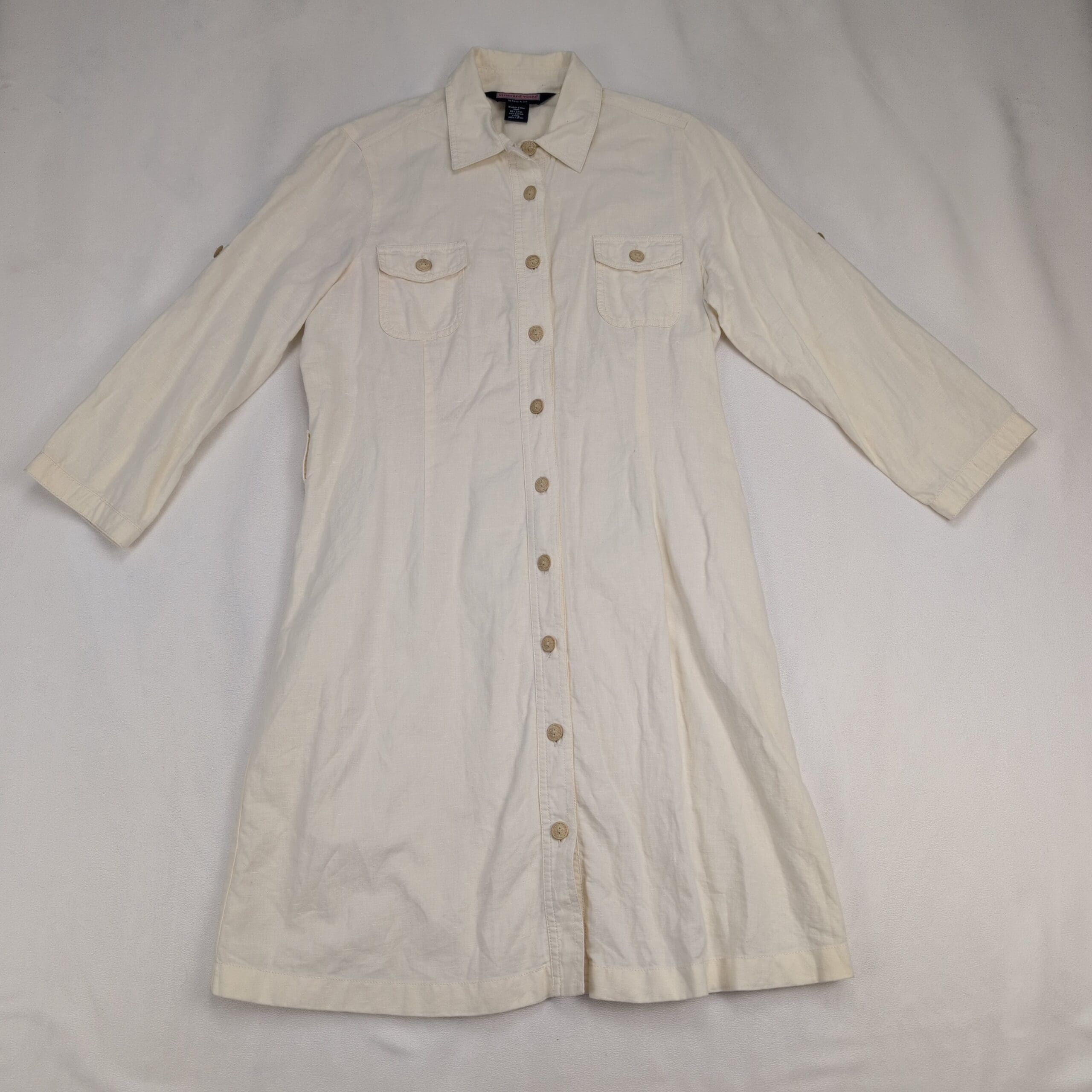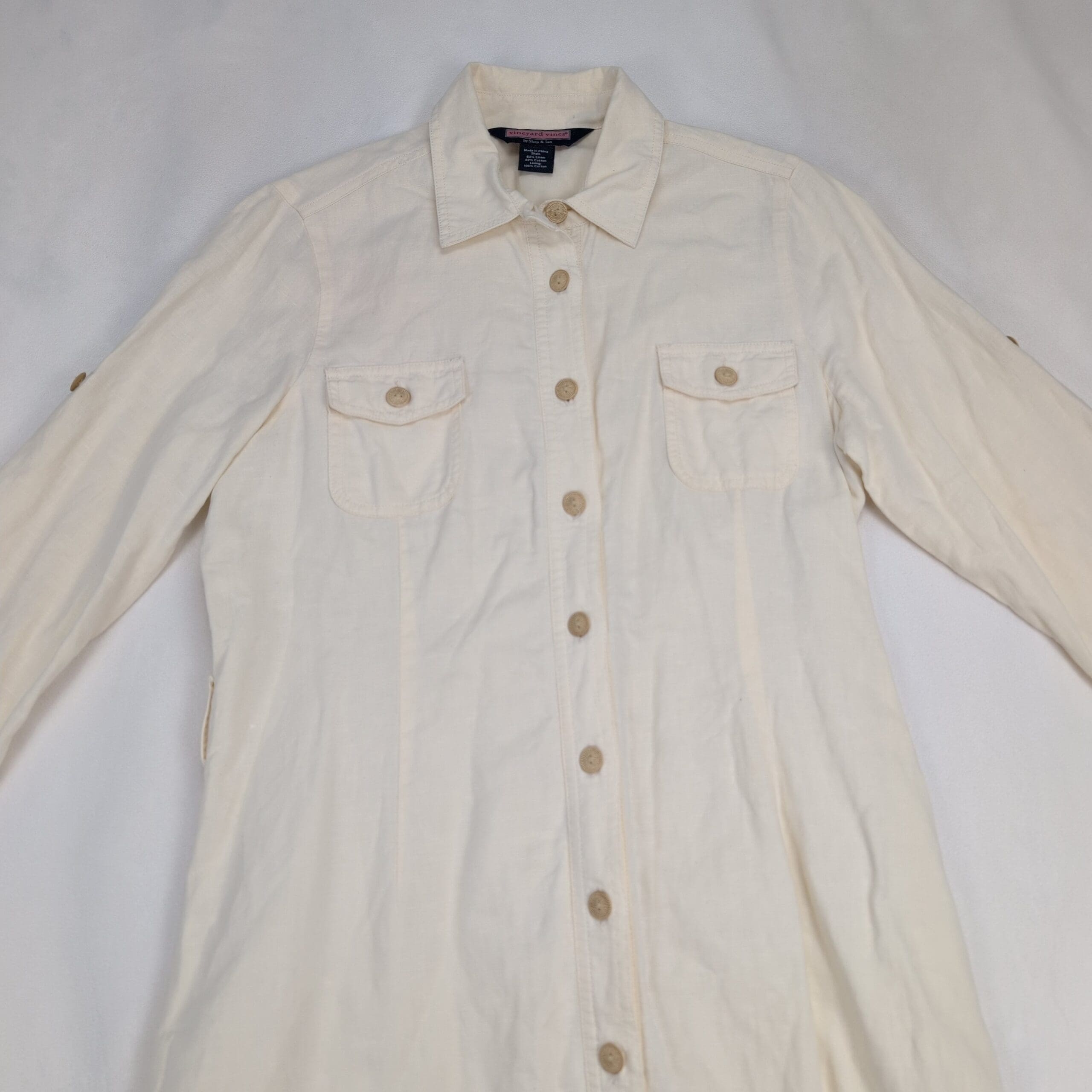 Vineyard Vines women’s button-front shirt dress in a breathable cotton-linen blend. Cream/off-white color with a classic collar, front button closure, two chest flap pockets, and 3/4 roll-tab sleeves. Size S. Missing the original waist belt — sold as shown. Excellent used condition with light, typical wear and no major rips, stains, or odors noted.