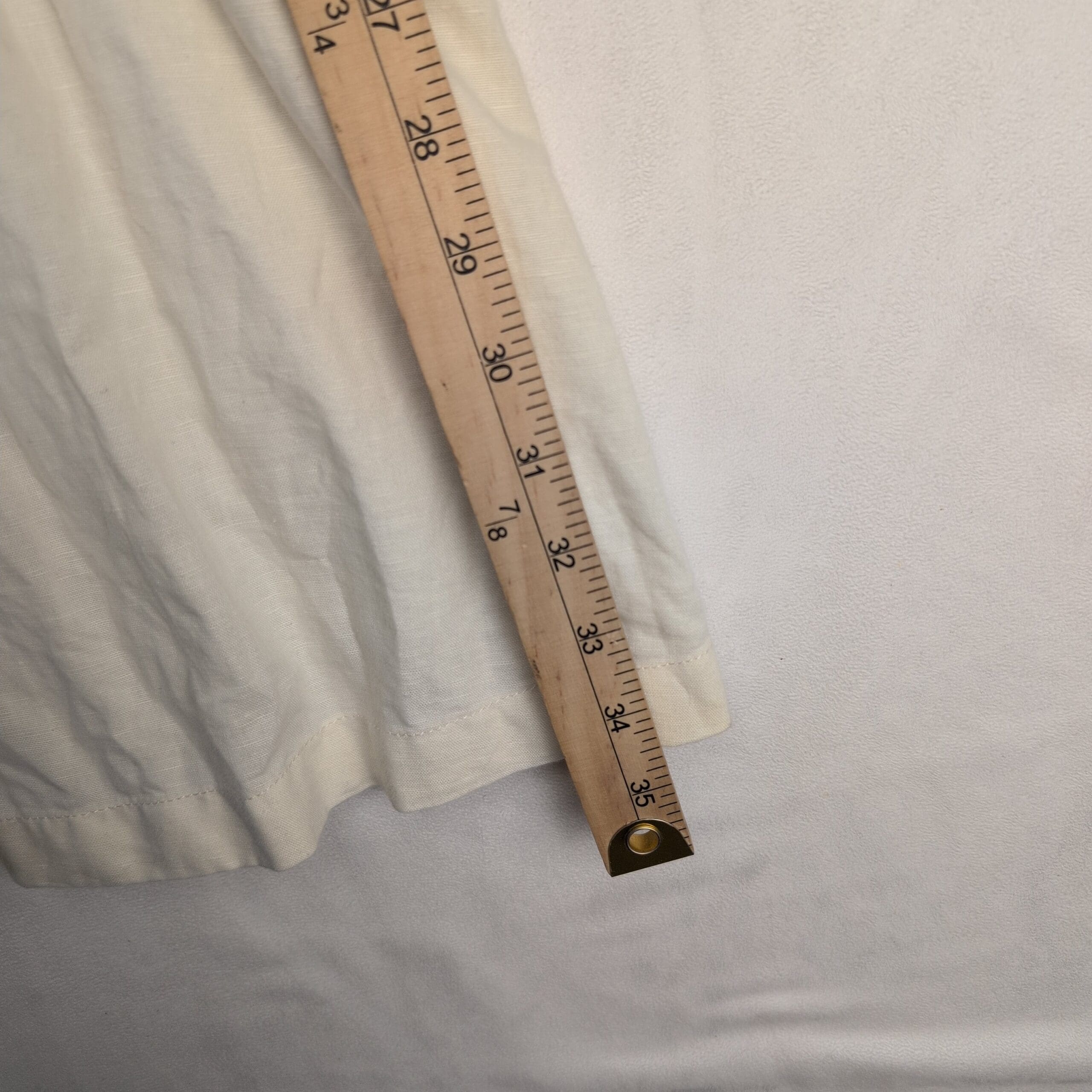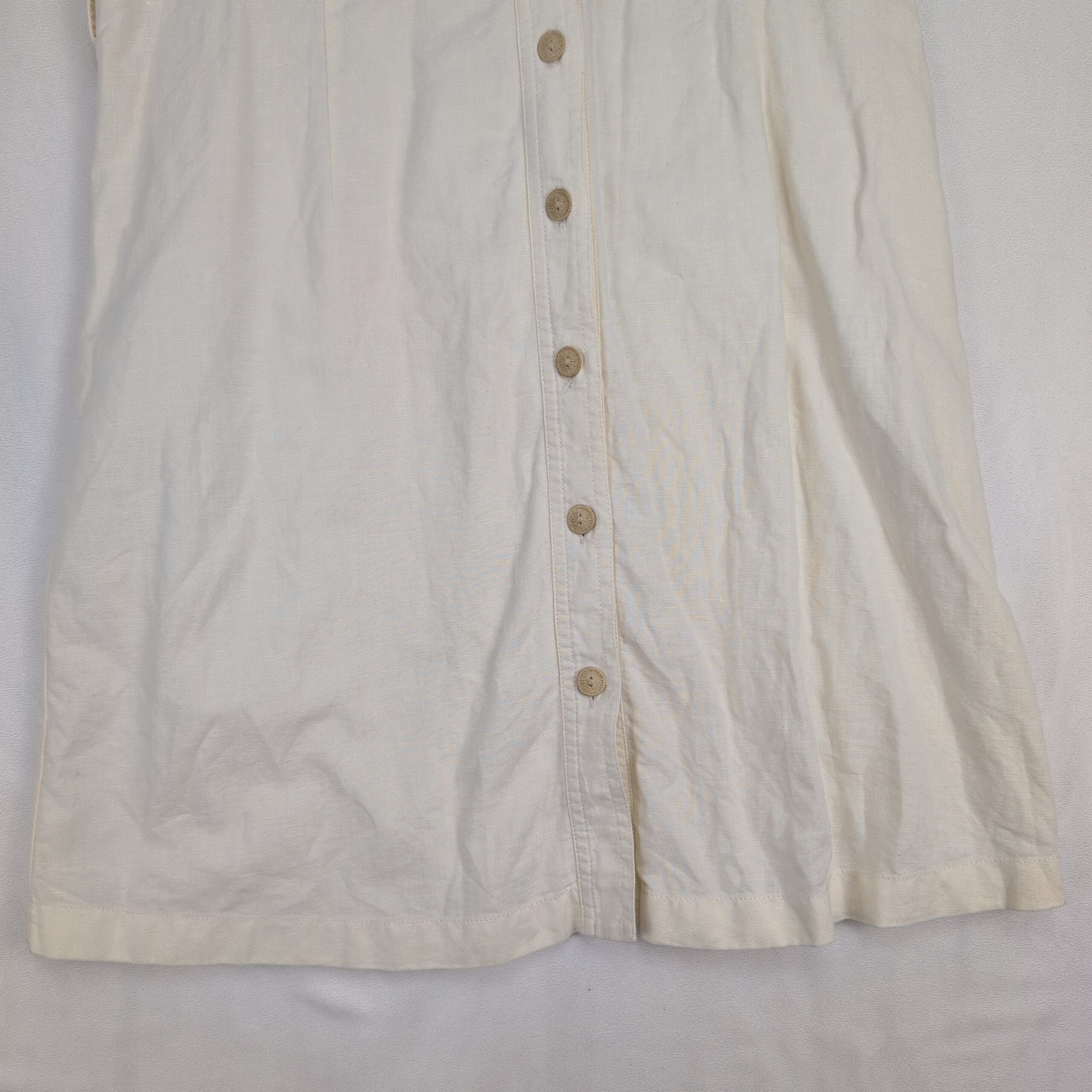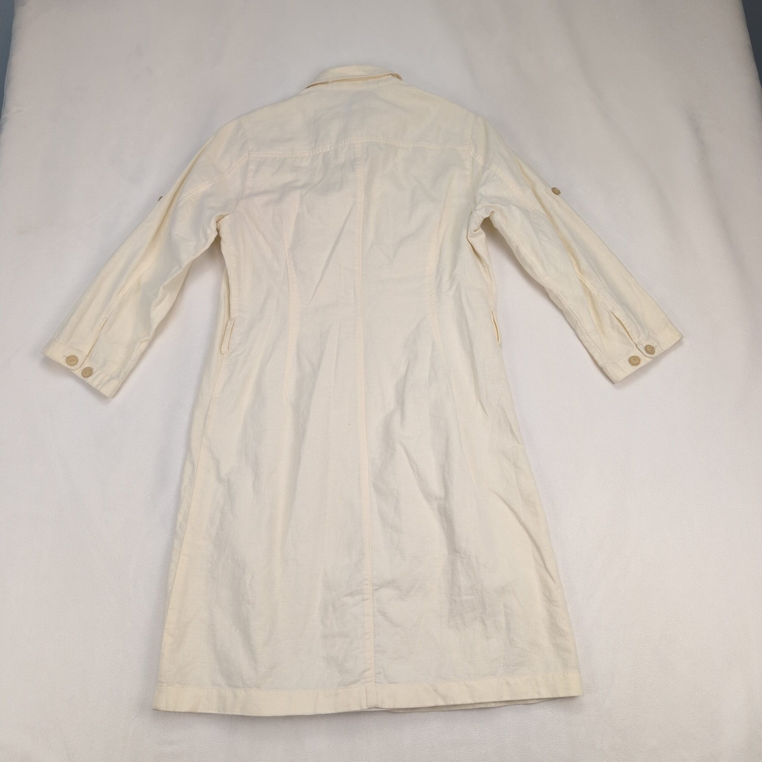 Vineyard Vines women’s button-front shirt dress in a breathable cotton-linen blend. Cream/off-white color with a classic collar, front button closure, two chest flap pockets, and 3/4 roll-tab sleeves. Size S. Missing the original waist belt — sold as shown. Excellent used condition with light, typical wear and no major rips, stains, or odors noted.