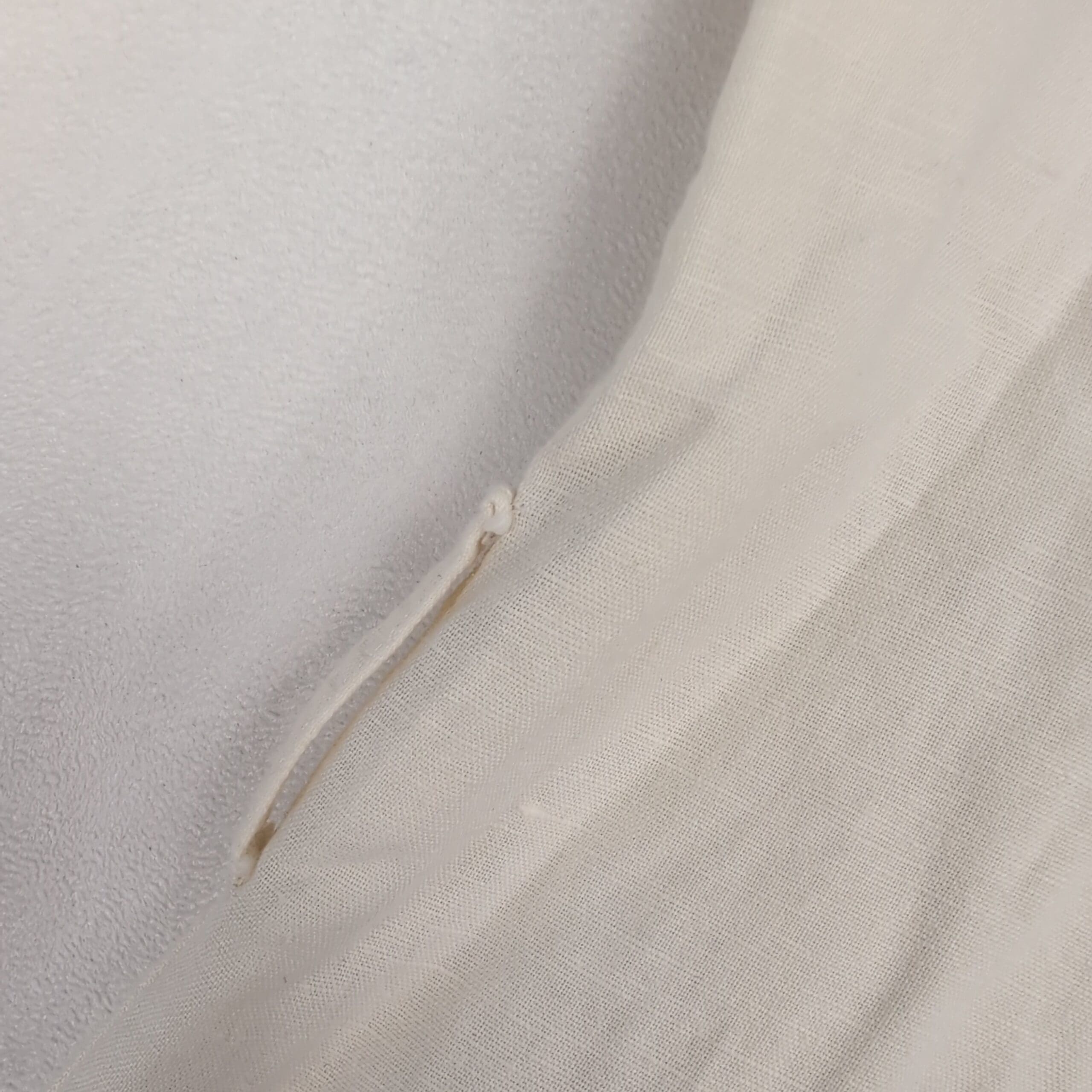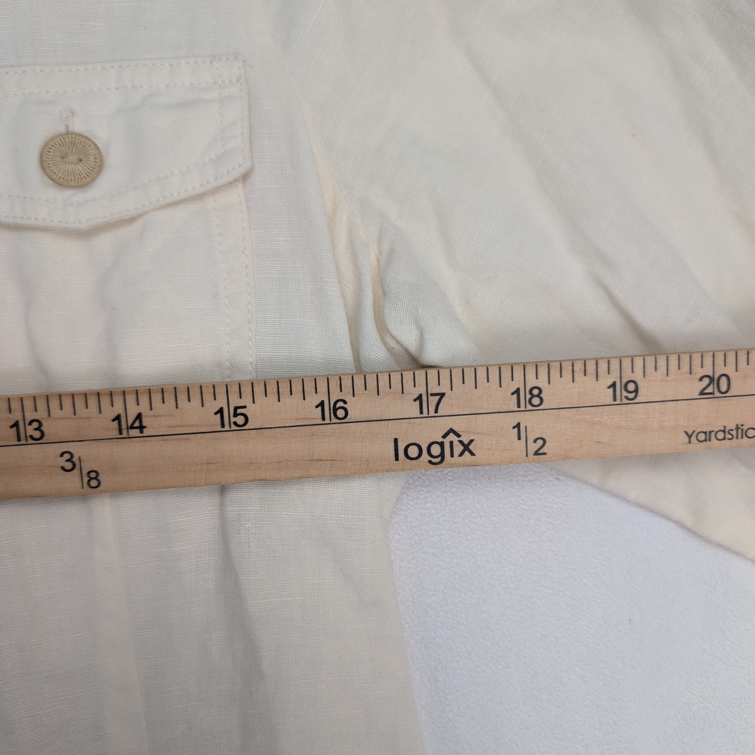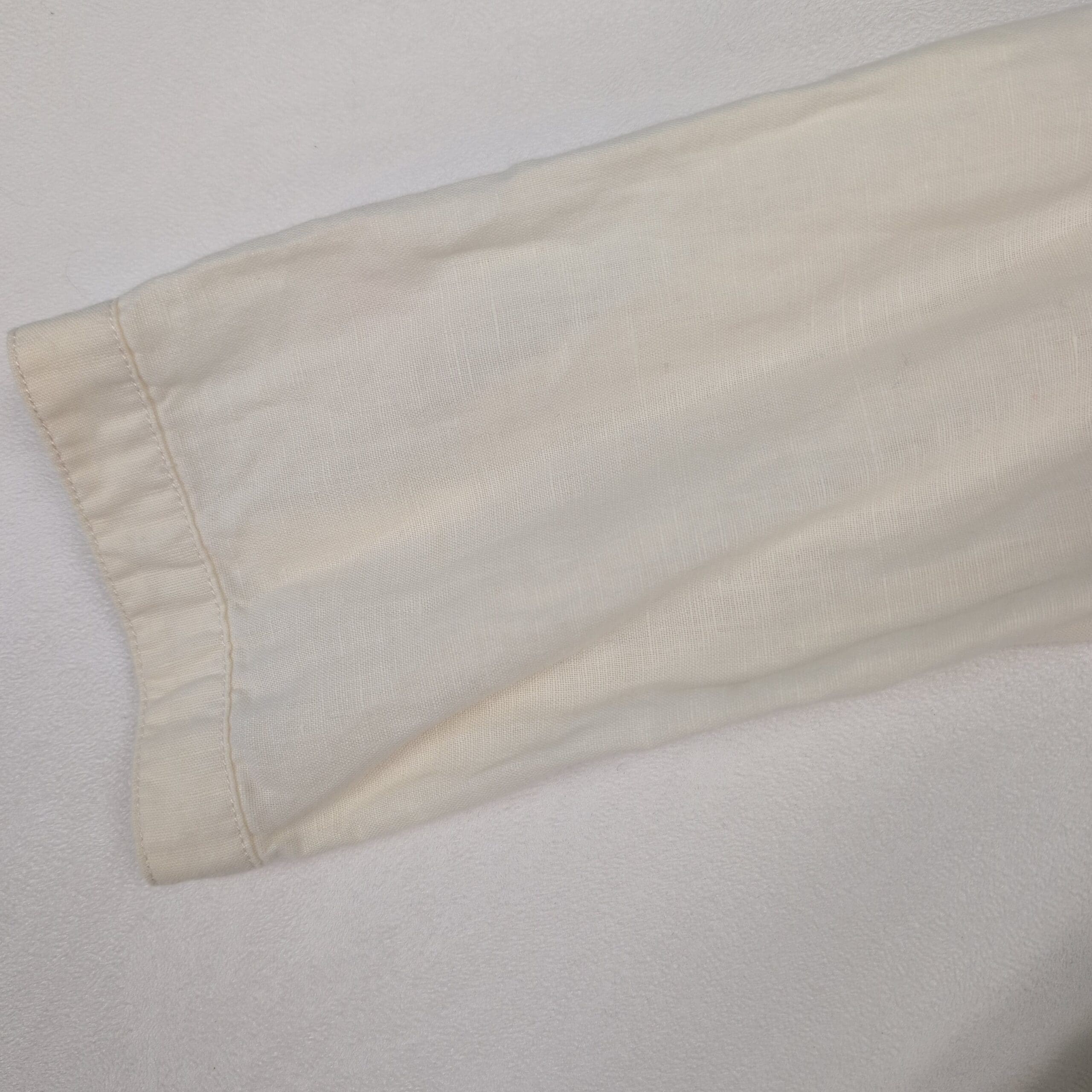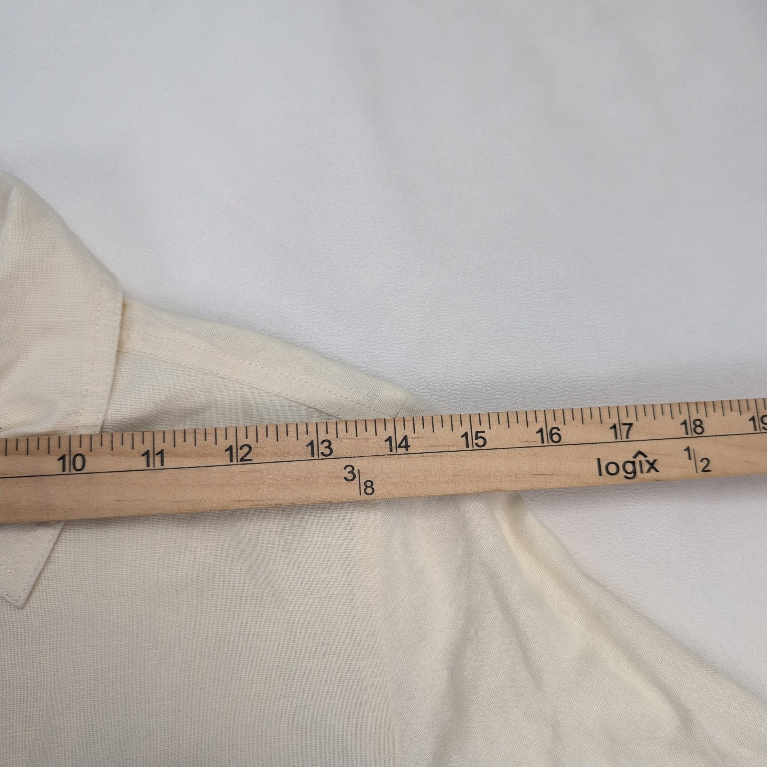 Vineyard Vines women’s button-front shirt dress in a breathable cotton-linen blend. Cream/off-white color with a classic collar, front button closure, two chest flap pockets, and 3/4 roll-tab sleeves. Size S. Missing the original waist belt — sold as shown. Excellent used condition with light, typical wear and no major rips, stains, or odors noted.