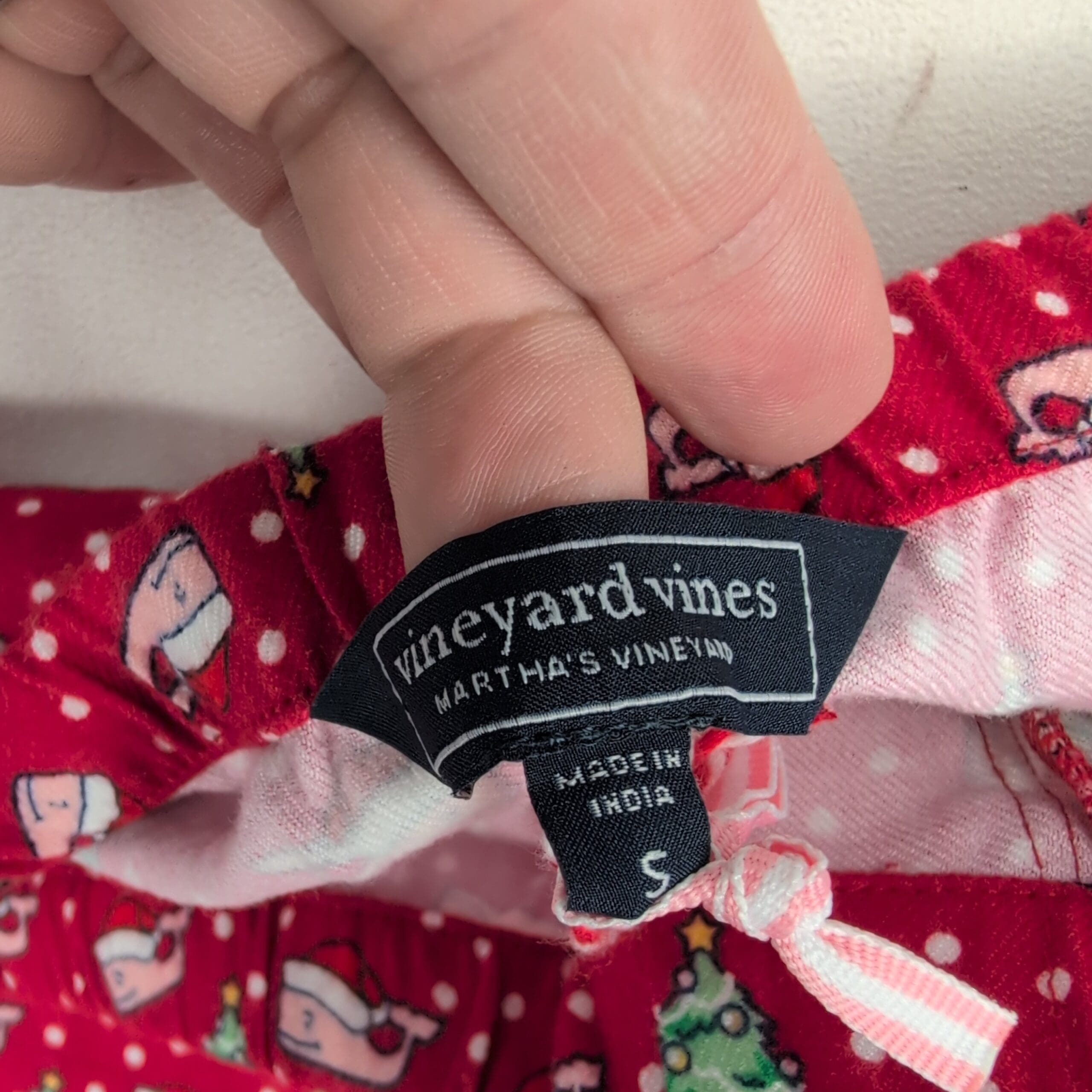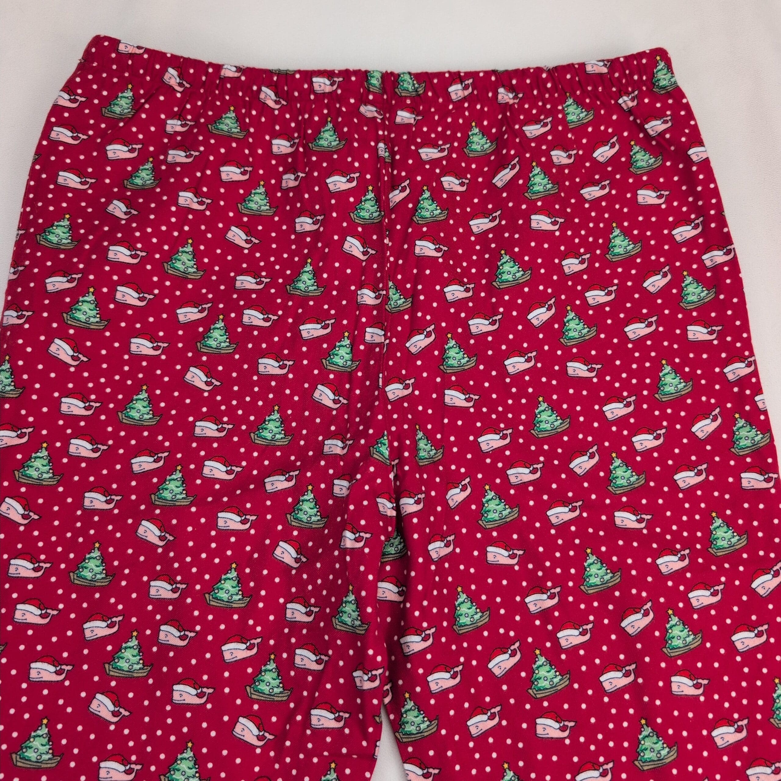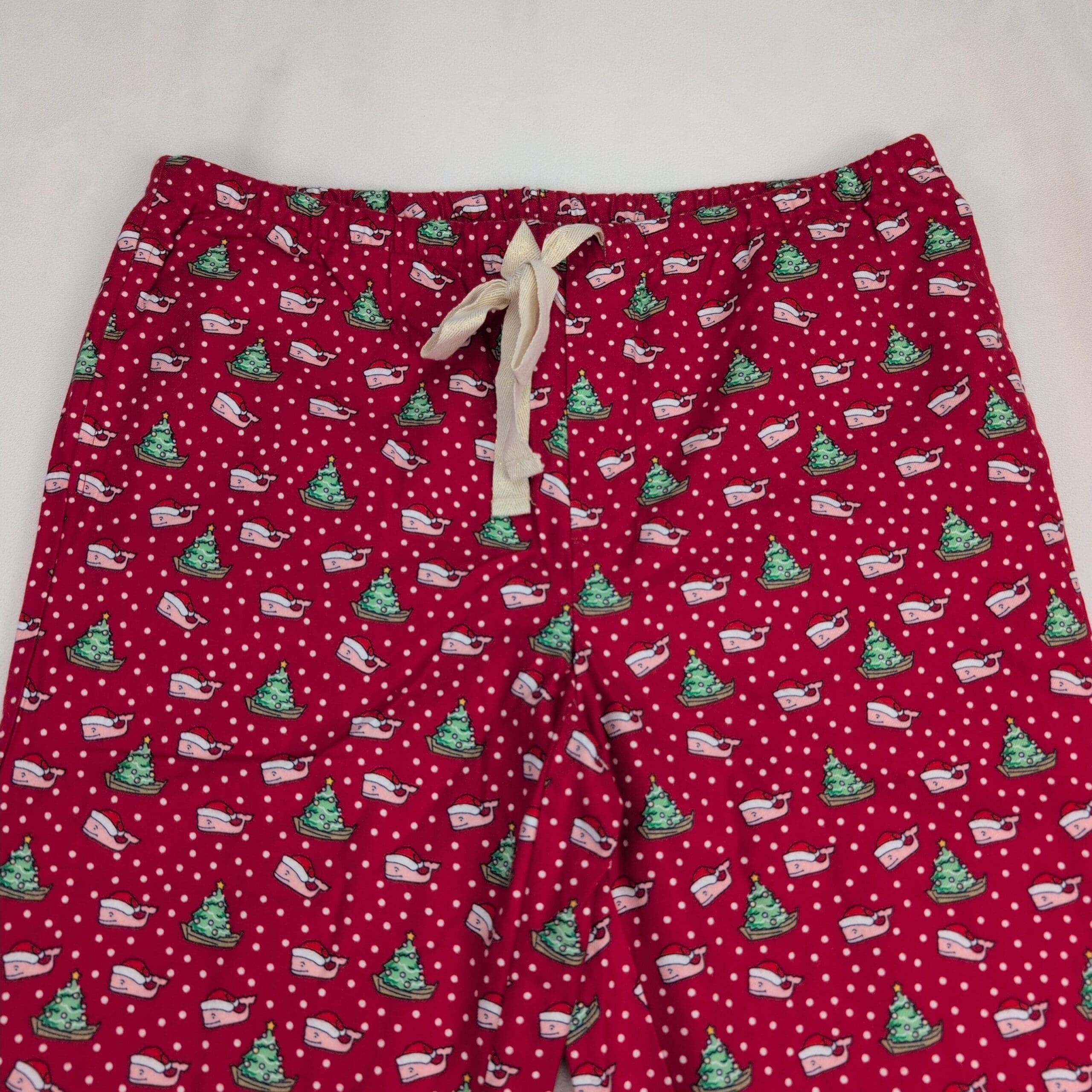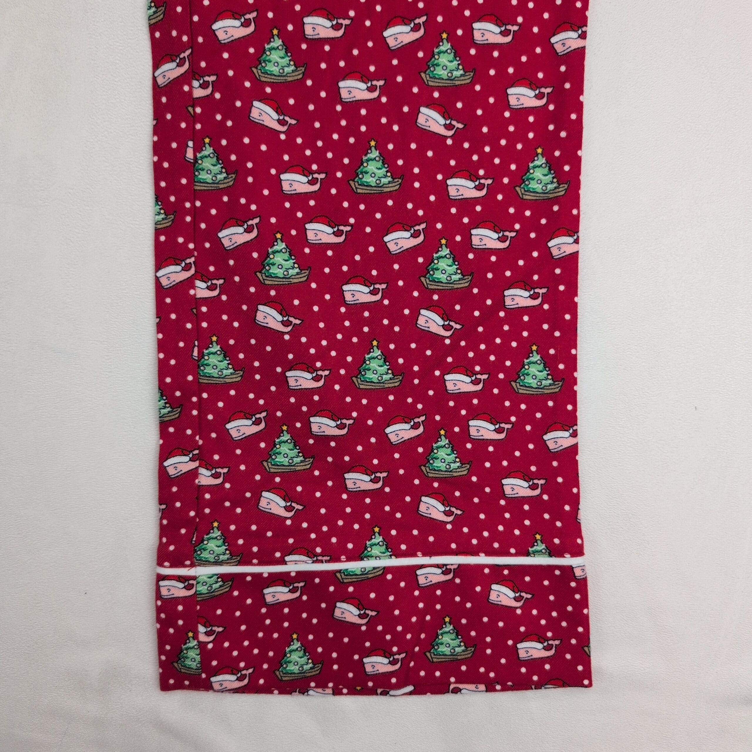 Vineyard Vines women’s flannel pajama pants, Size S. Soft brushed flannel in a festive red with small whale and Christmas tree motifs and scattered polka dots. Elastic waistband with functional drawstring and contrast white piping at the hem. Cozy, lightweight flannel perfect for holiday lounging and winter nights.