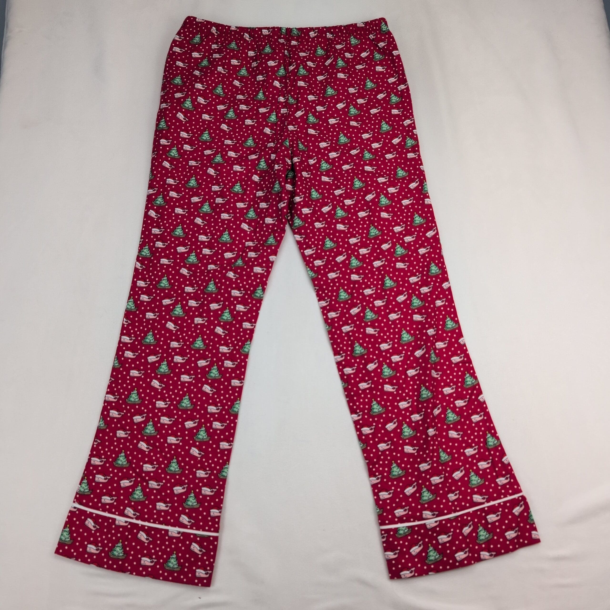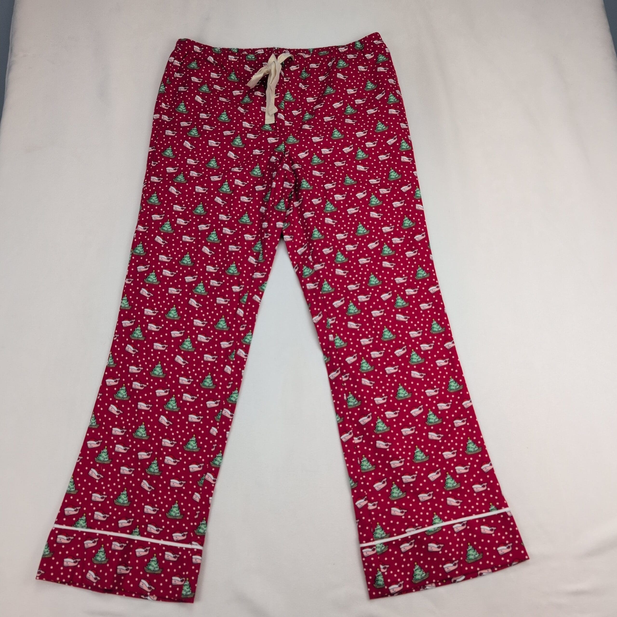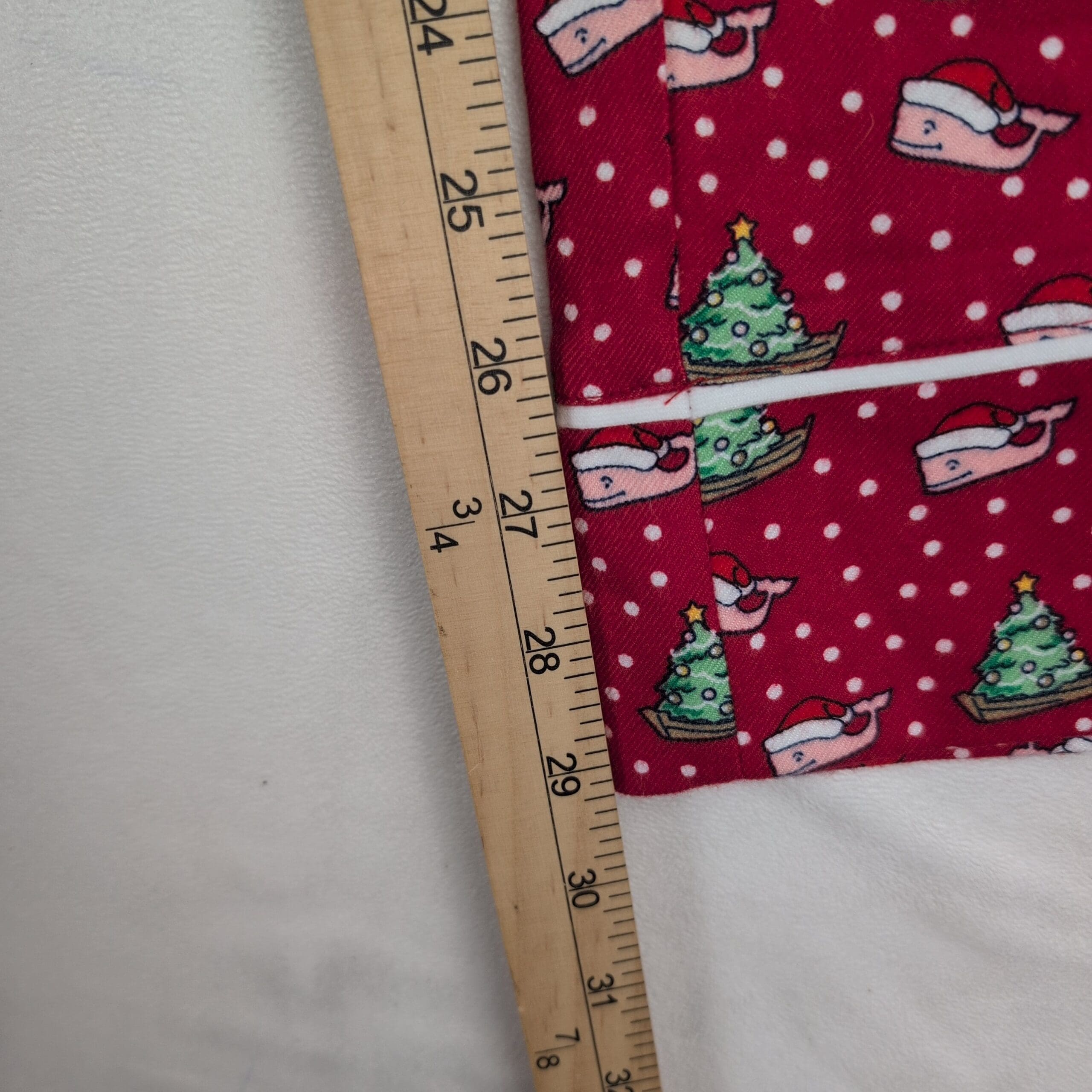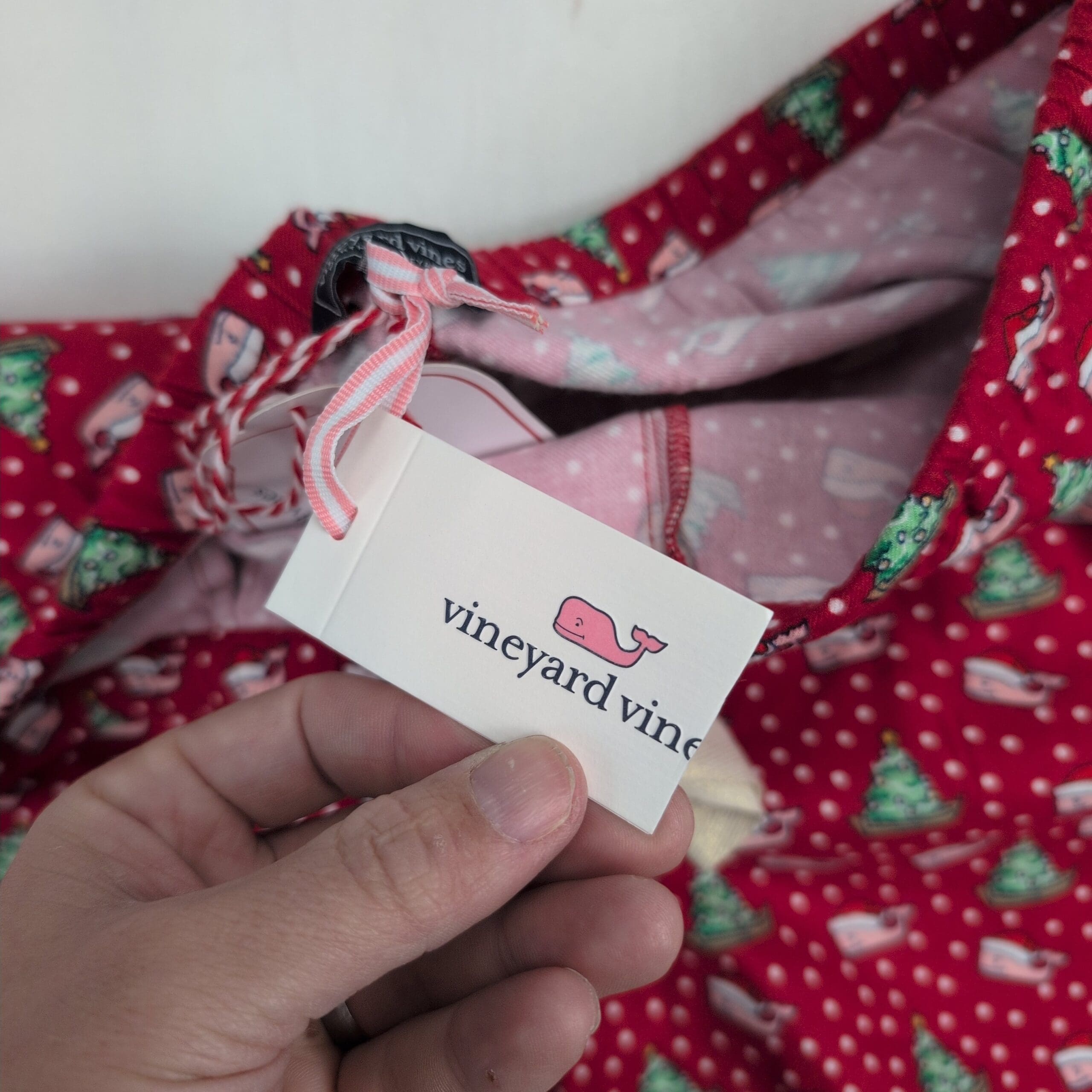 Vineyard Vines women’s flannel pajama pants, Size S. Soft brushed flannel in a festive red with small whale and Christmas tree motifs and scattered polka dots. Elastic waistband with functional drawstring and contrast white piping at the hem. Cozy, lightweight flannel perfect for holiday lounging and winter nights.