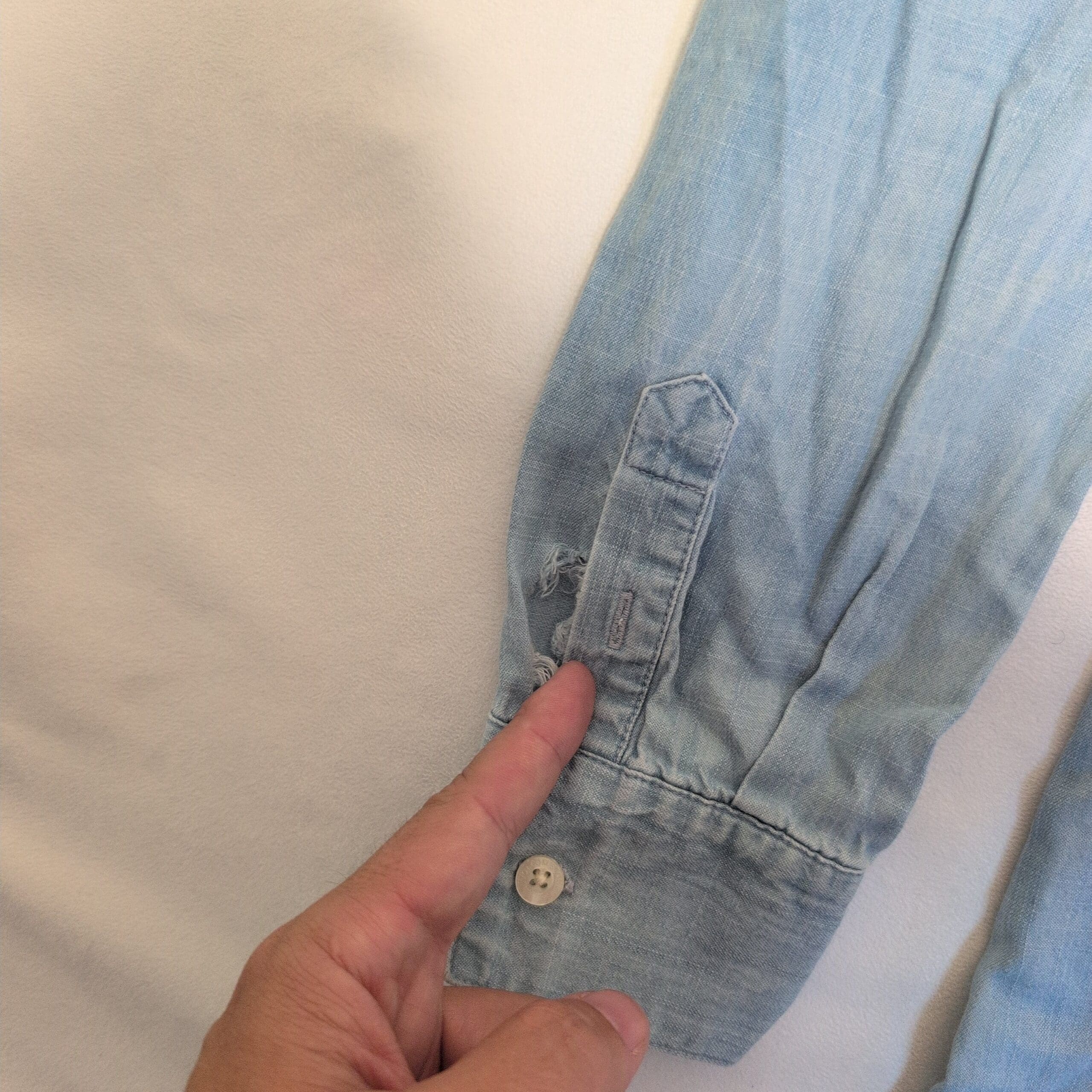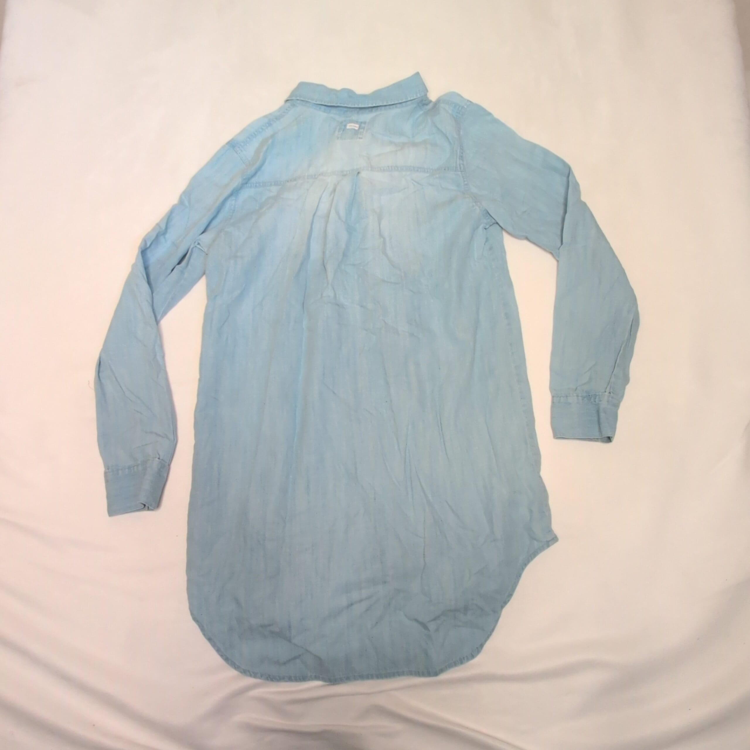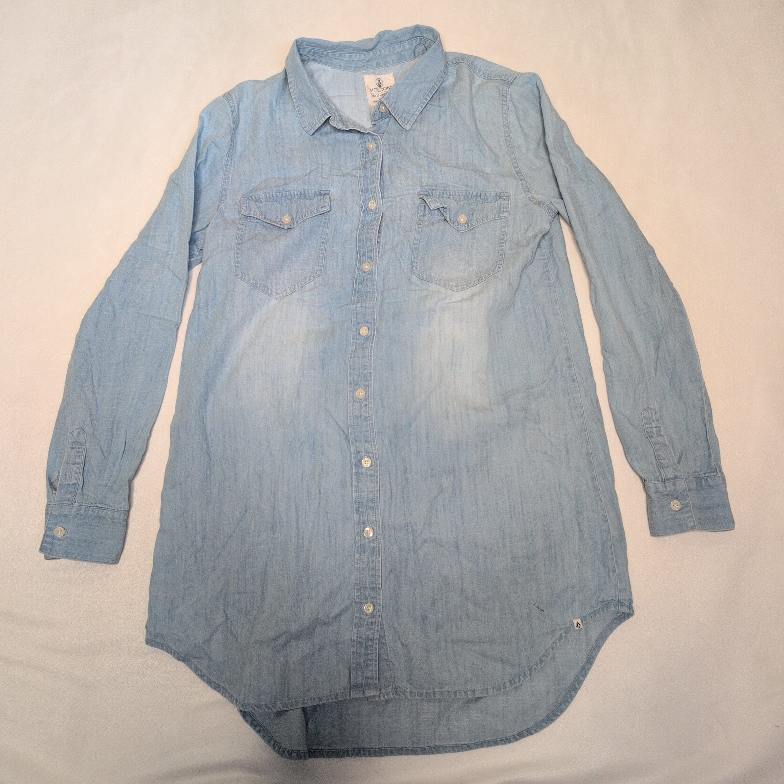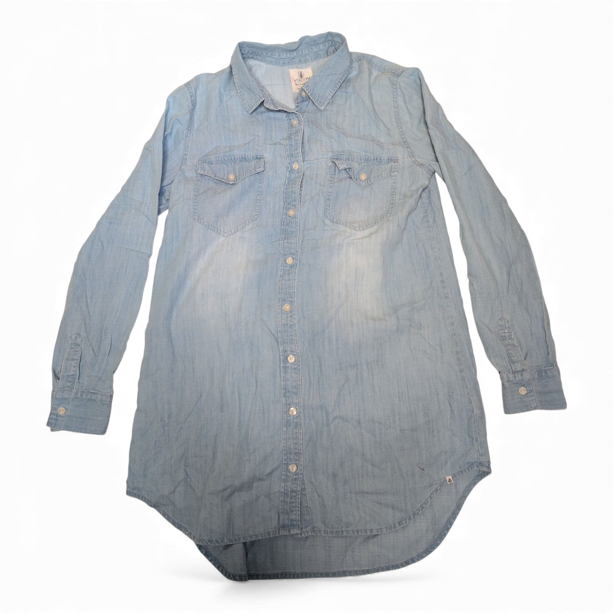 Light blue chambray Volcom shirt dress in women’s size L. Classic collared, full button-front design with two chest flap pockets, long sleeves with button cuffs, and a curved high-low hem for relaxed coverage. Soft, worn-in denim feel — great for casual layering or wearing solo. Condition: gently used; please see photos for a rip at one cuff (pictured).