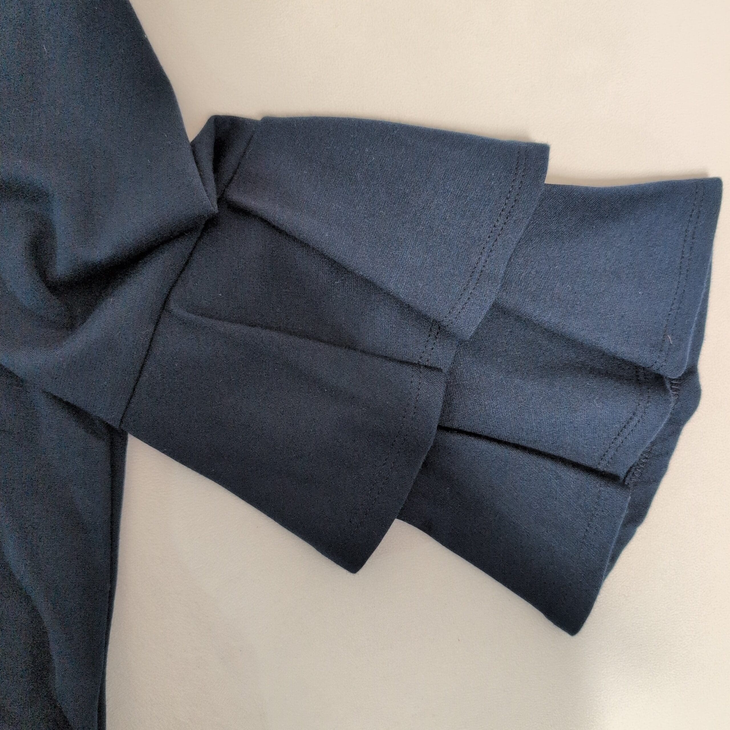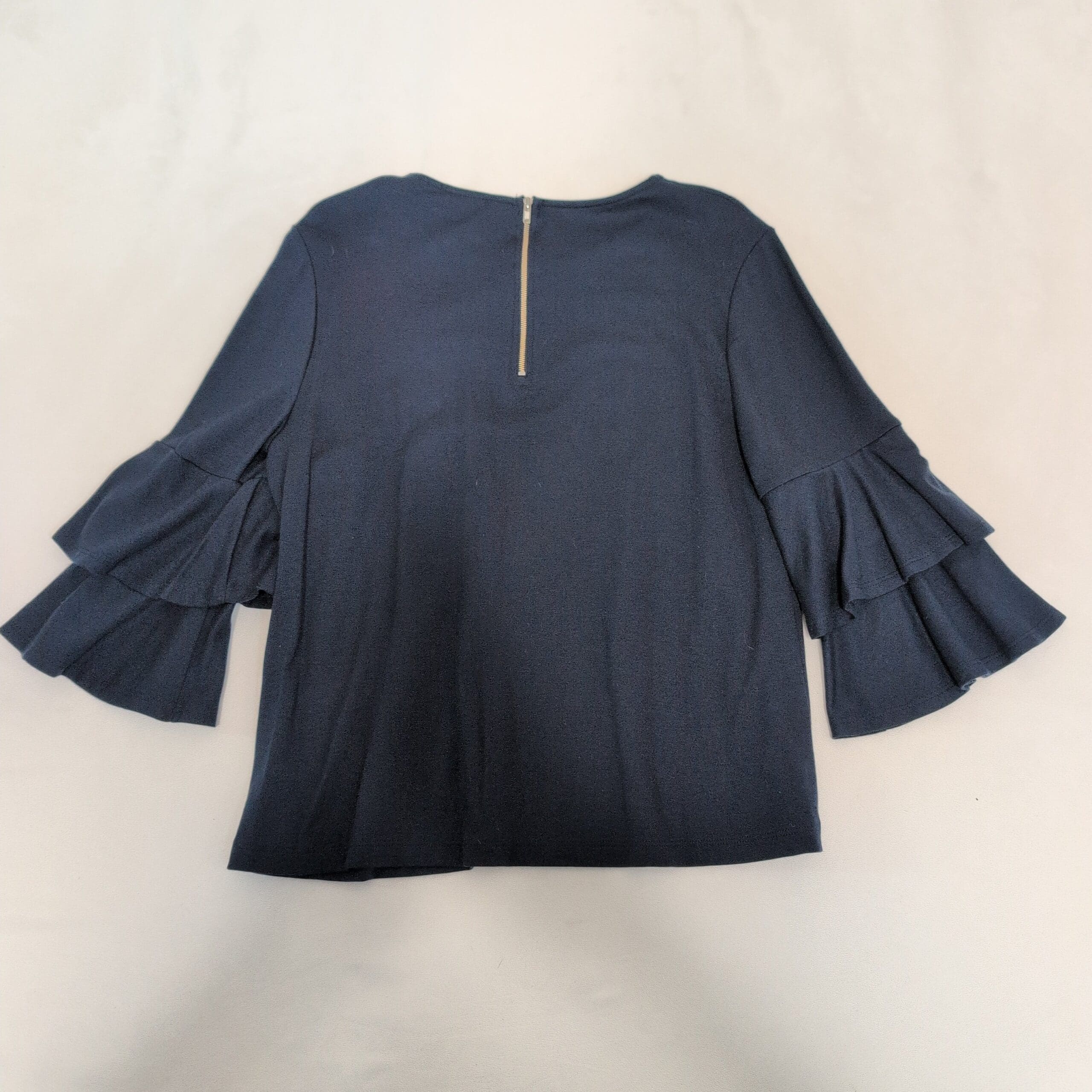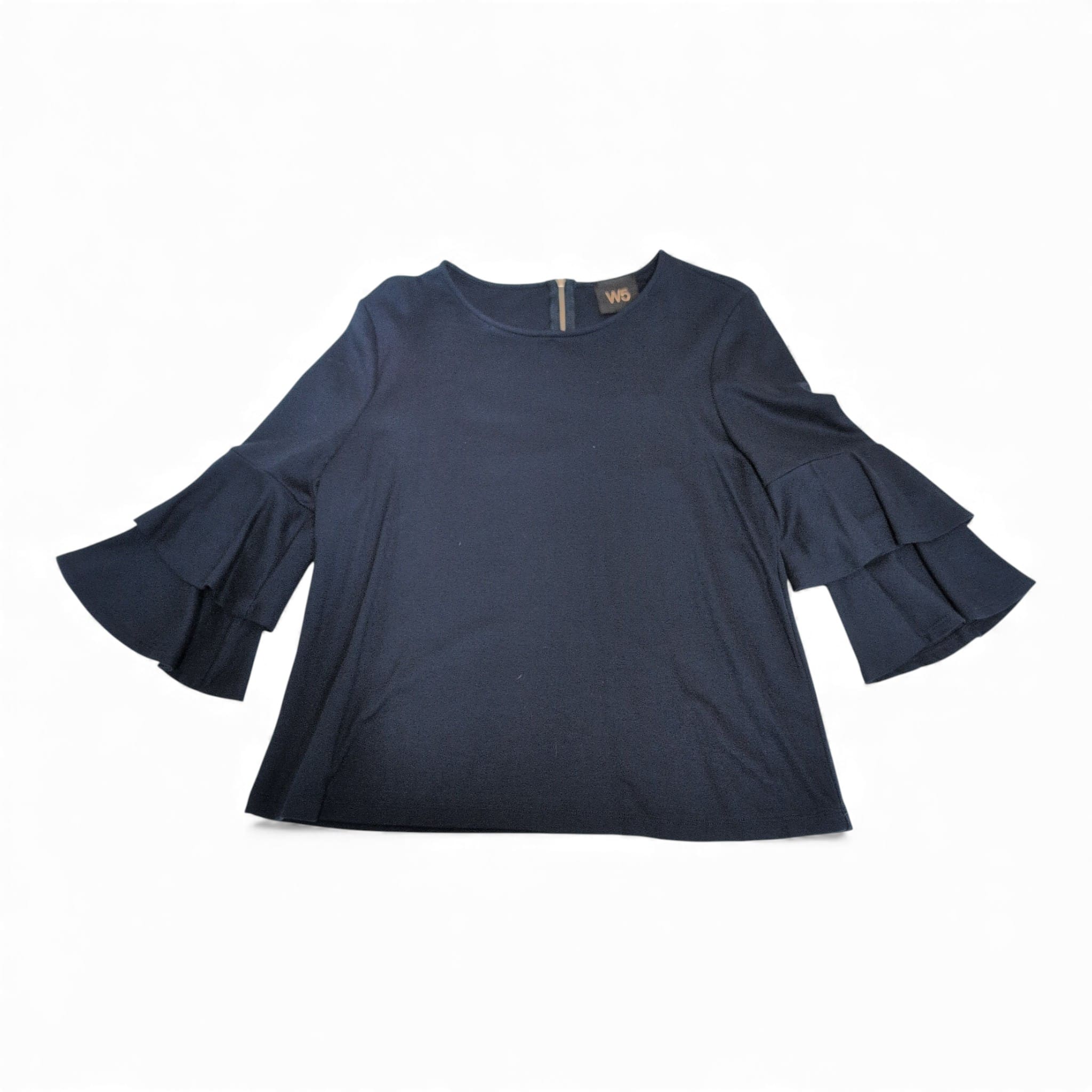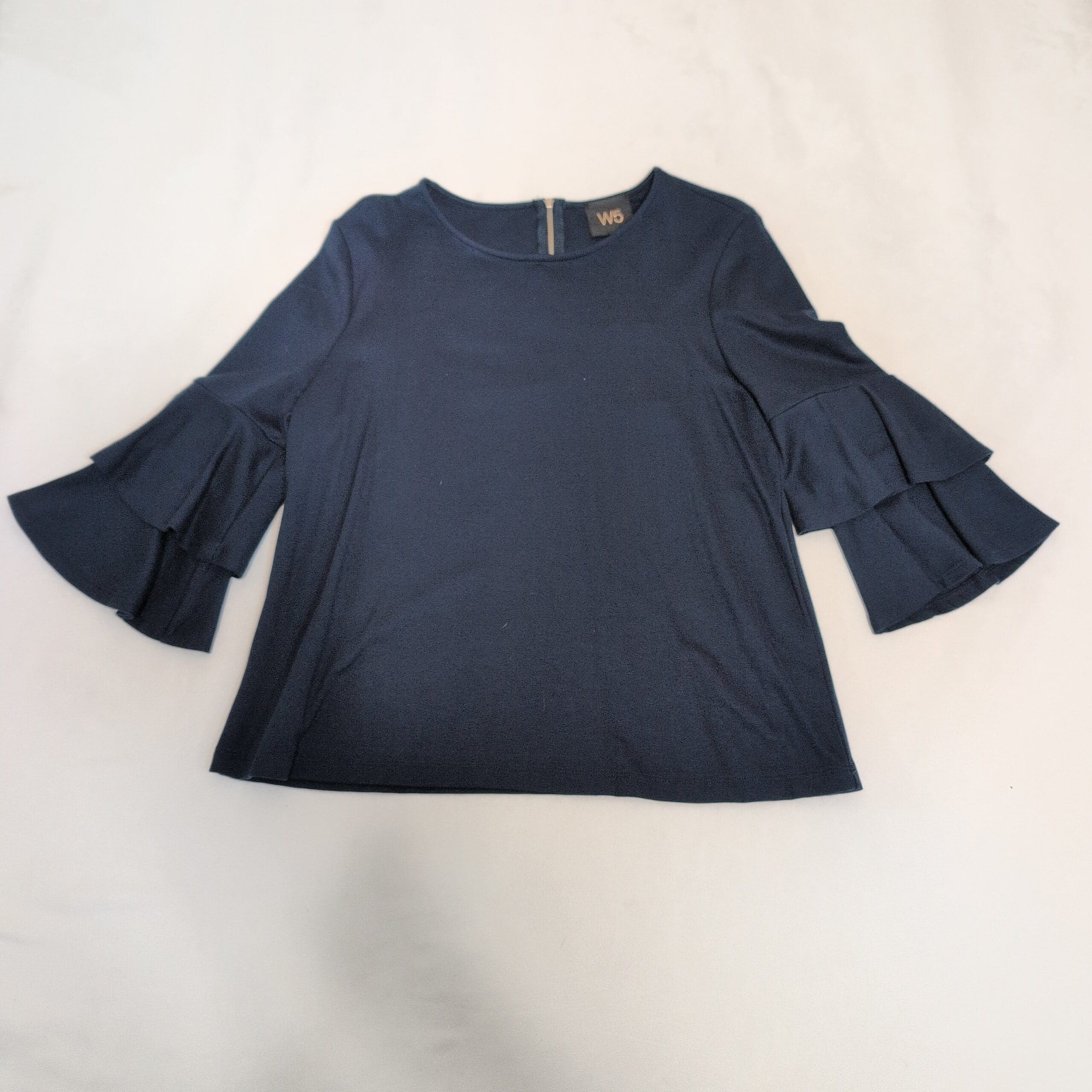 W5 navy blue blouse in size M. Crew neckline with a back zip closure and dramatic tiered ruffle bell sleeves for an elegant, modern look. Soft, lightweight knit with a relaxed, slightly boxy silhouette—easy to dress up for the office or pair with jeans for a weekend outfit. Pre-owned and in great condition with normal light wear; no holes, pulls, or noticeable stains observed.