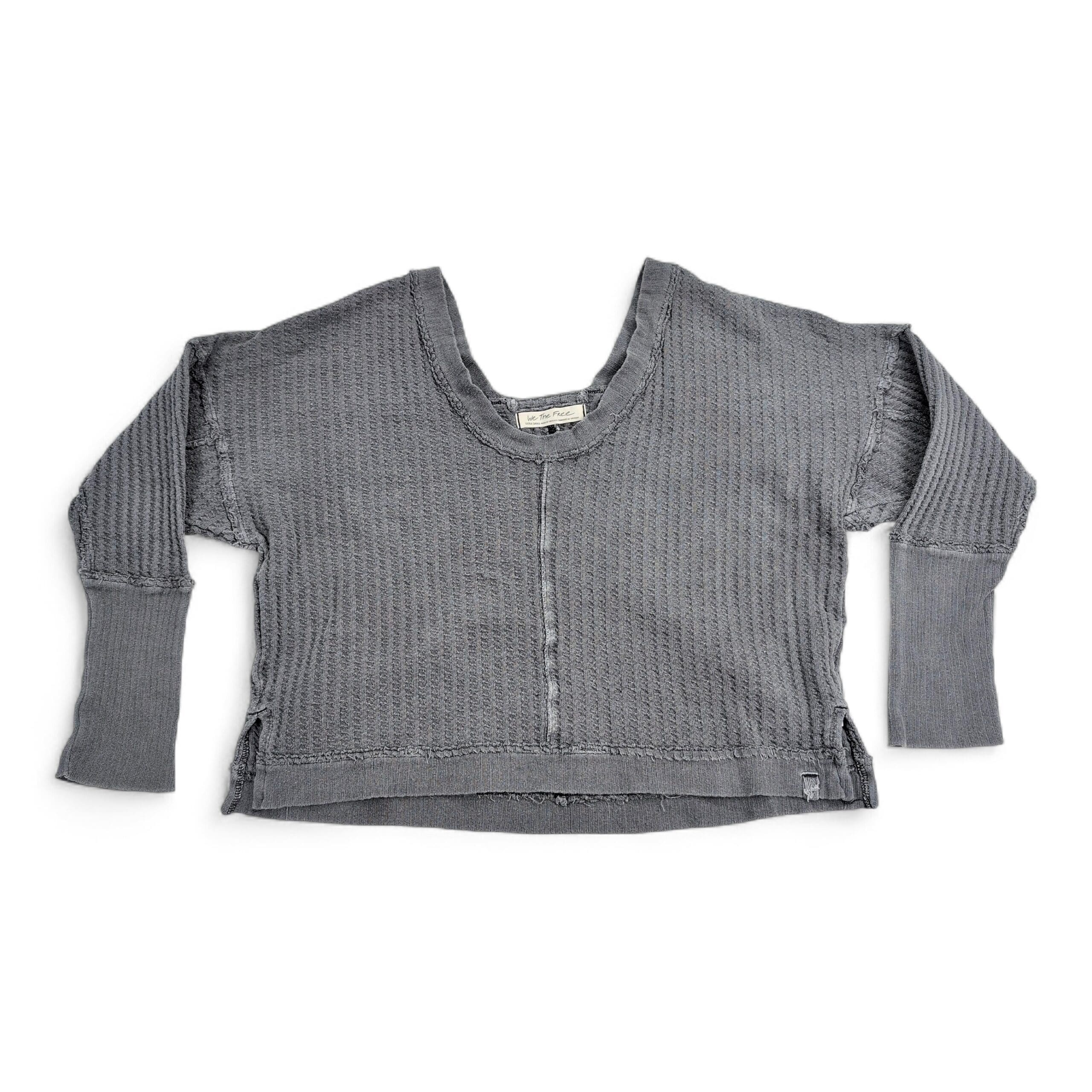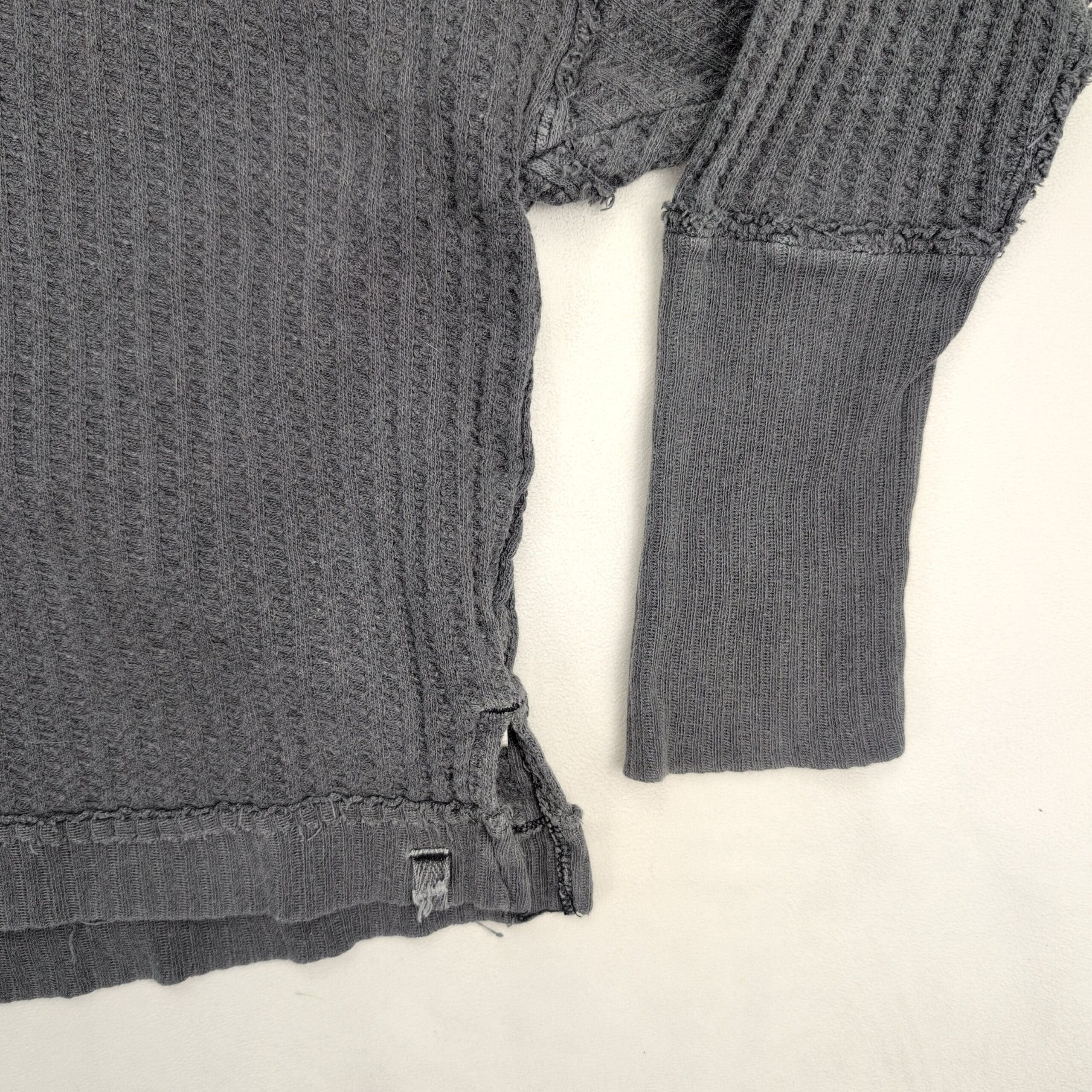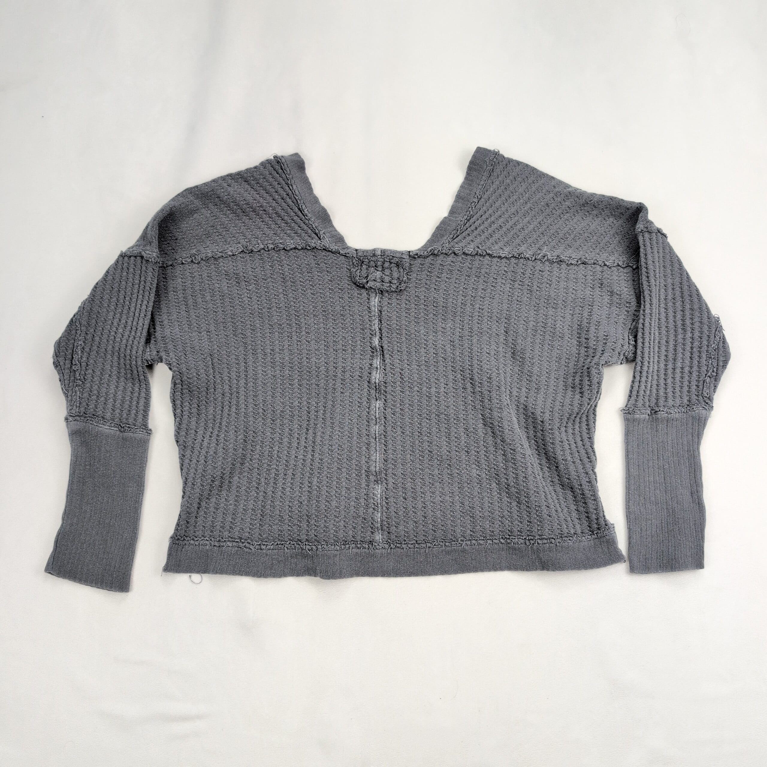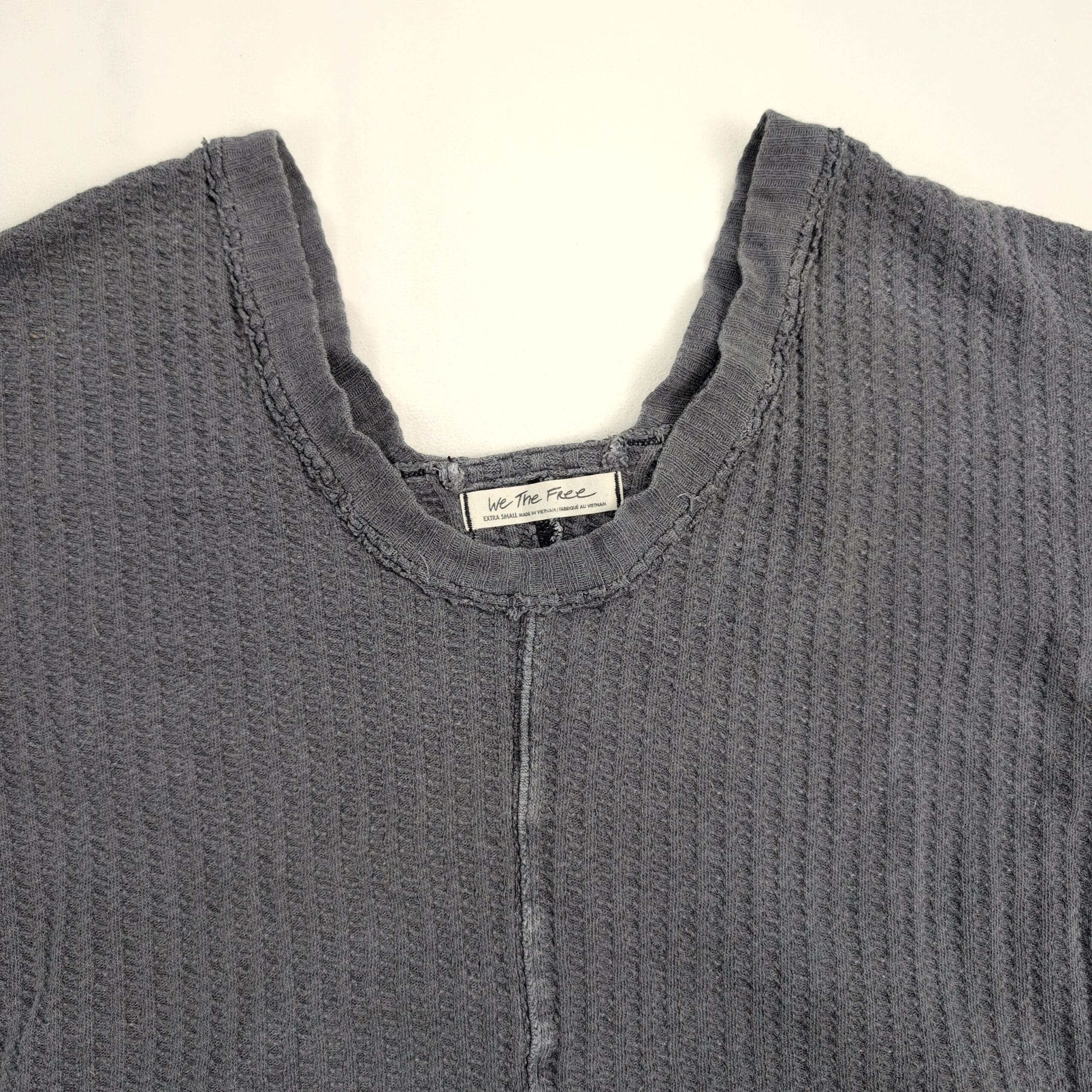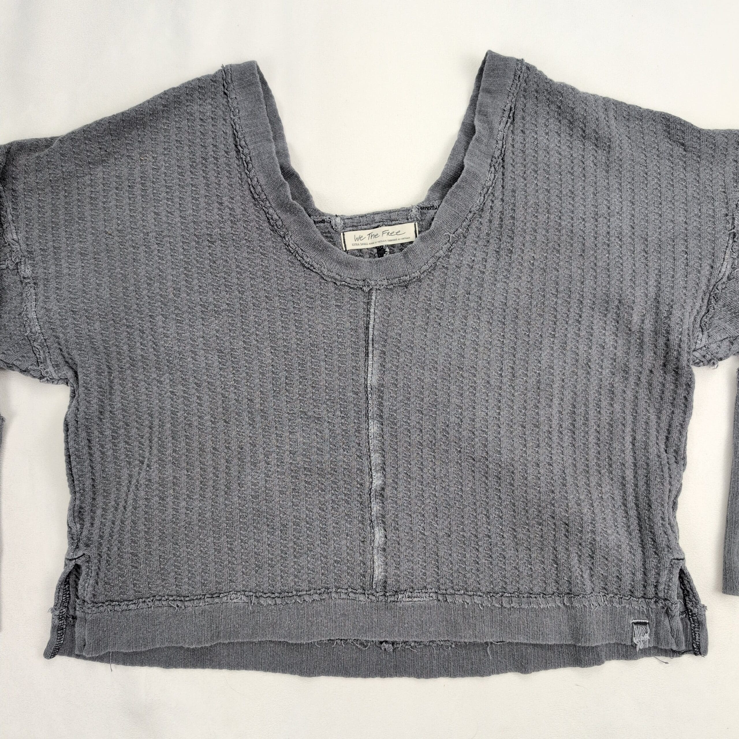 We The Free cropped off-the-shoulder waffle knit sweater in size XS. Dusty gray with a relaxed, slightly boxy silhouette and wide scoop neckline that can be worn on or off the shoulder. Waffle thermal texture with intentional raw-edge detailing at the center seam and hem, ribbed long cuffs, and small side slits for a lived-in layered look. Lightweight and soft—great for styling with high-waist jeans or skirts.