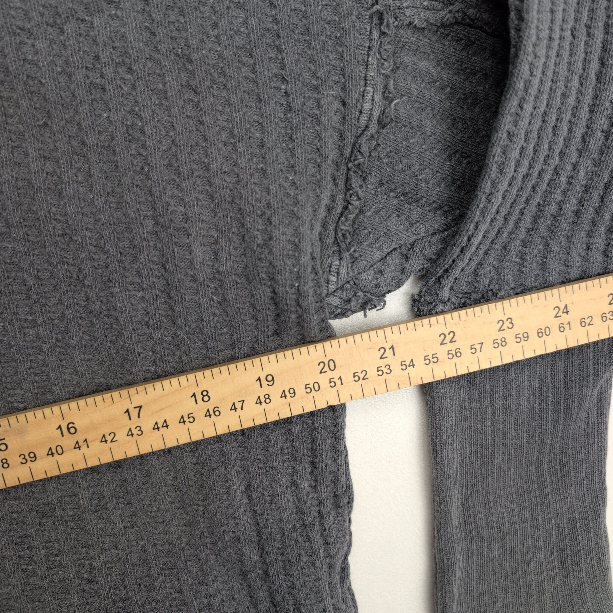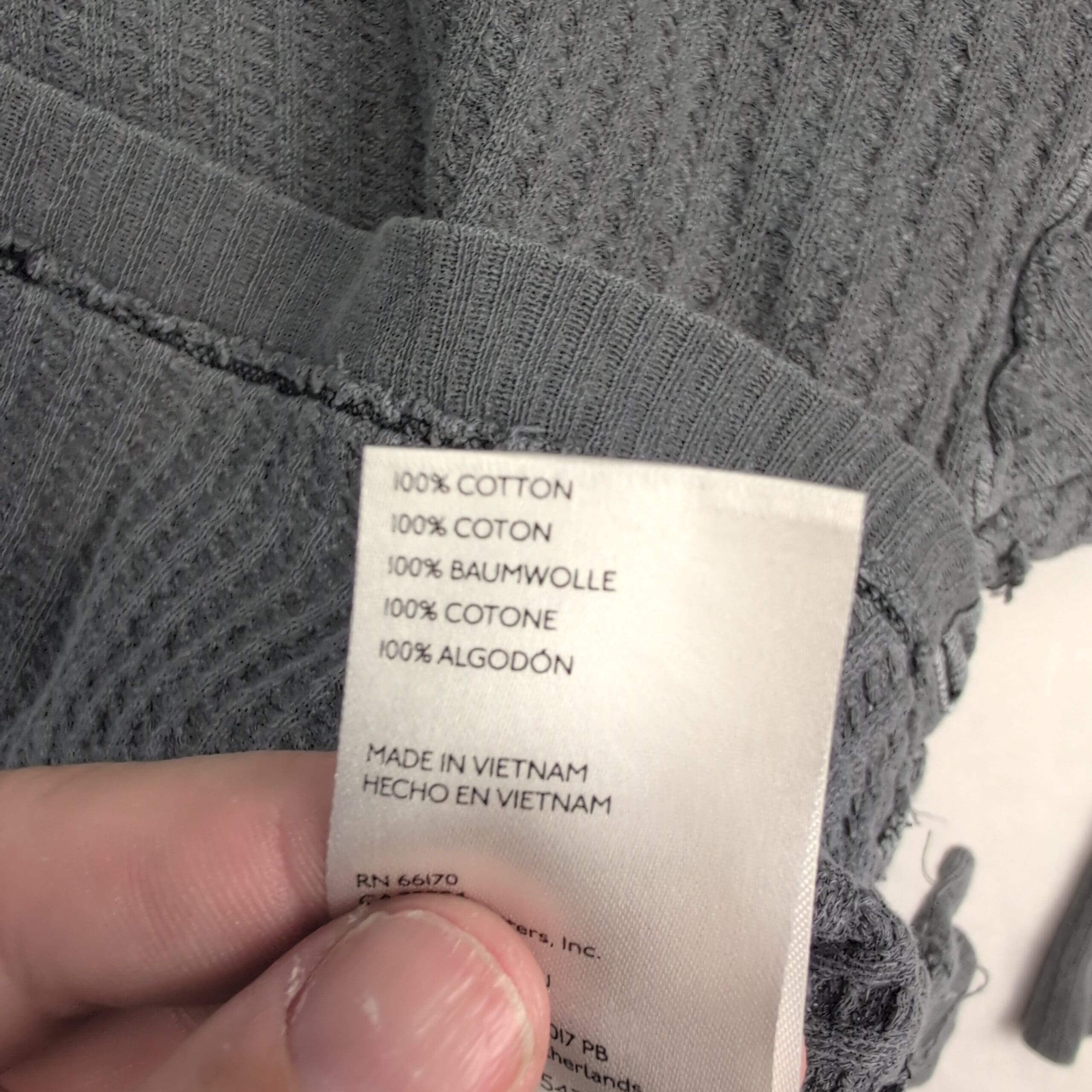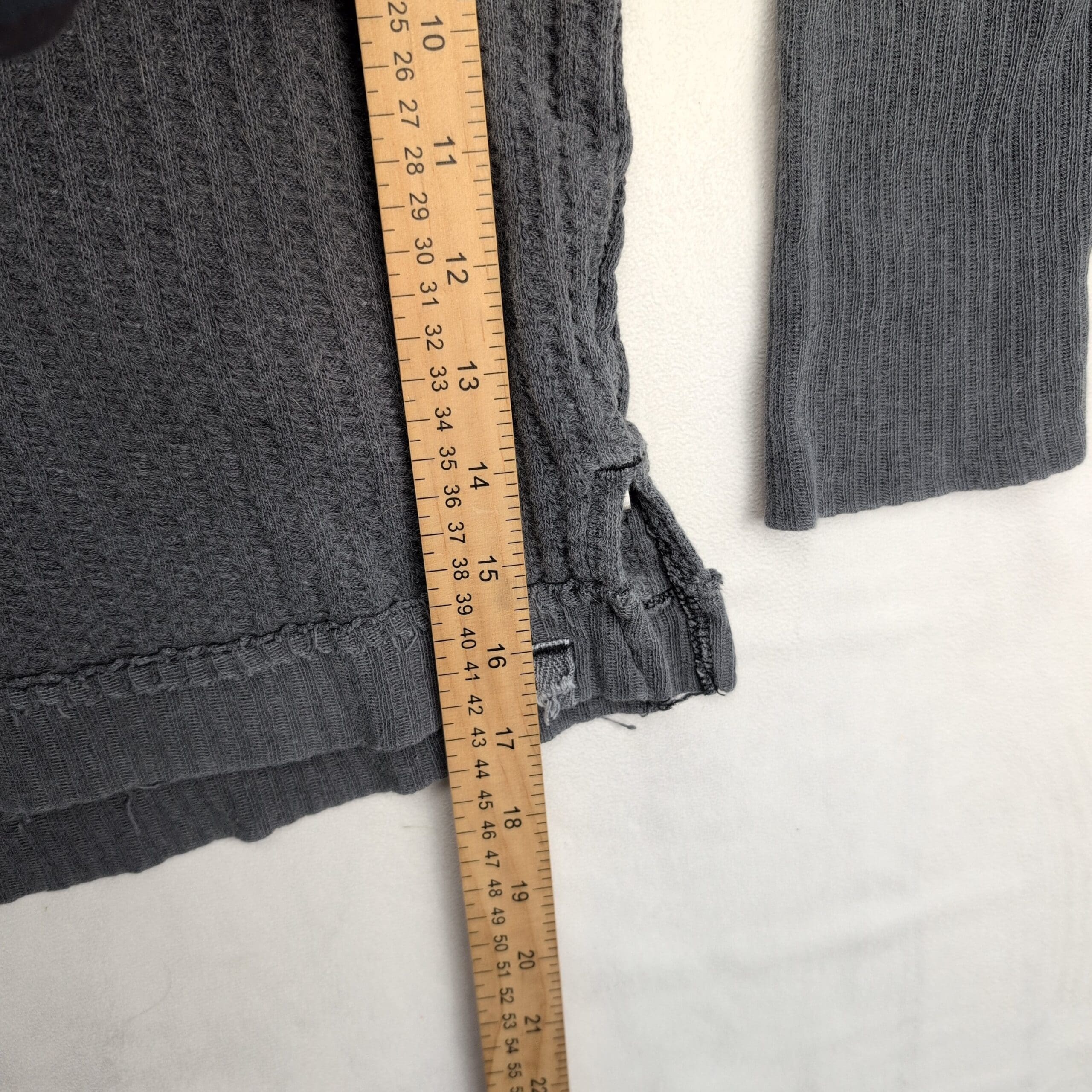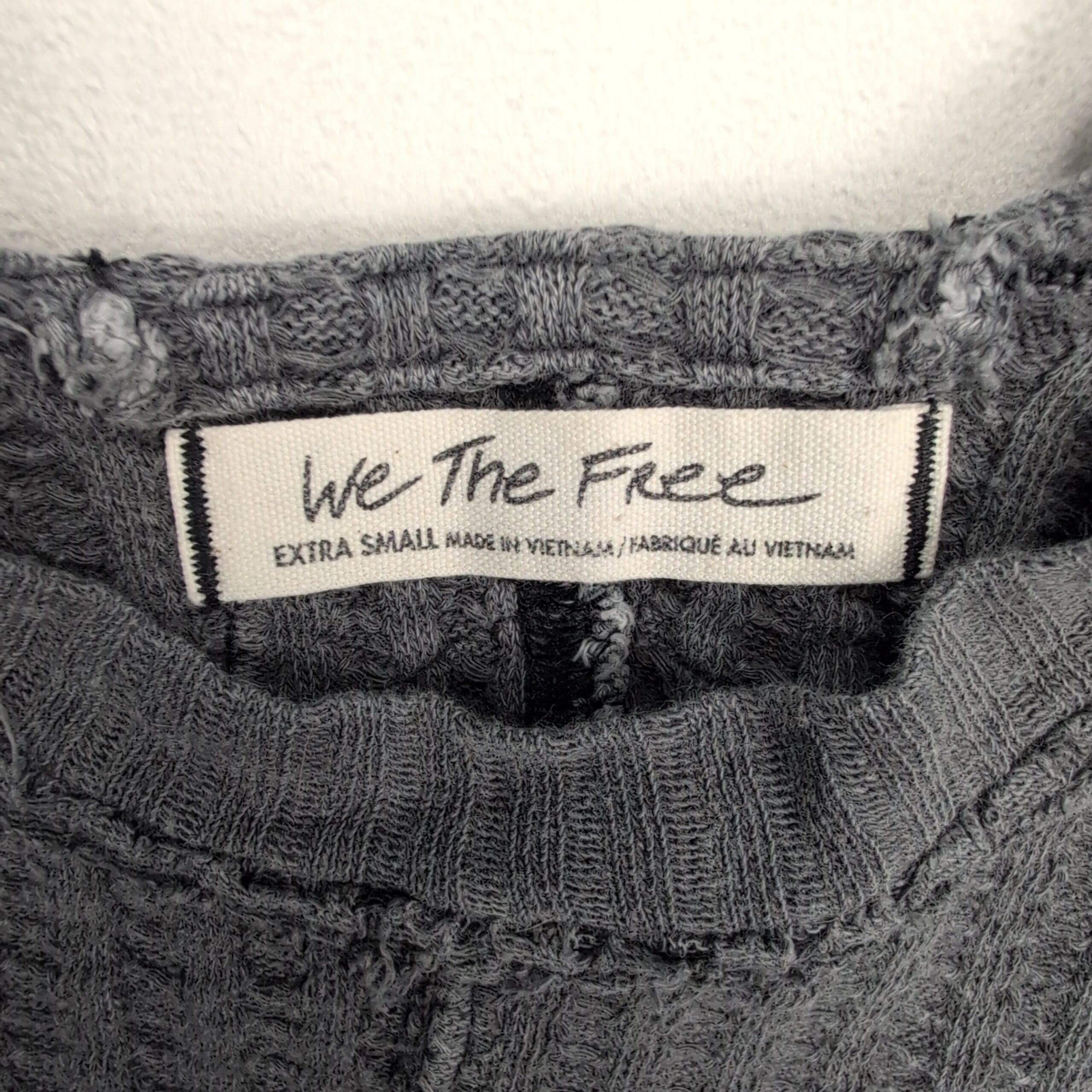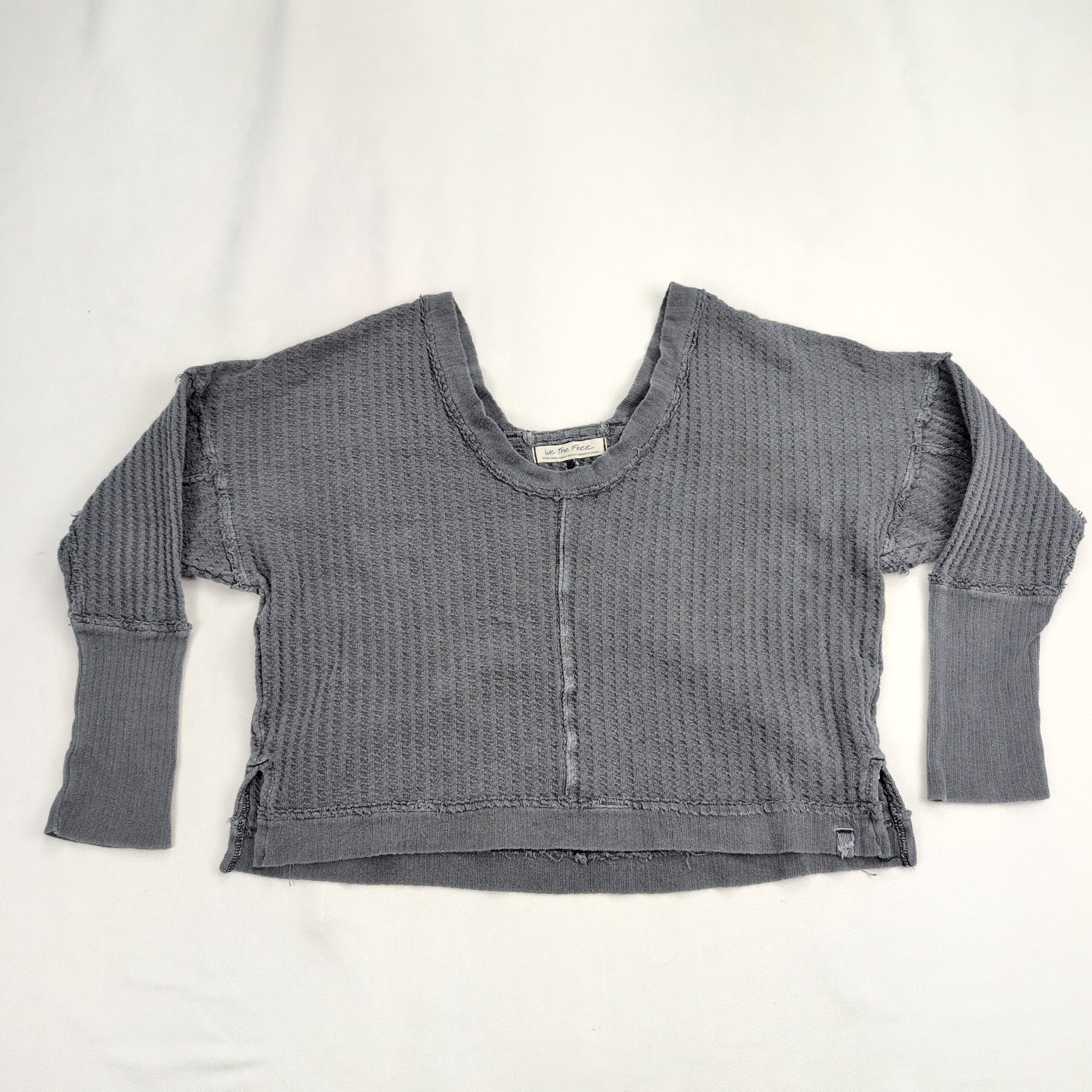 We The Free cropped off-the-shoulder waffle knit sweater in size XS. Dusty gray with a relaxed, slightly boxy silhouette and wide scoop neckline that can be worn on or off the shoulder. Waffle thermal texture with intentional raw-edge detailing at the center seam and hem, ribbed long cuffs, and small side slits for a lived-in layered look. Lightweight and soft—great for styling with high-waist jeans or skirts.